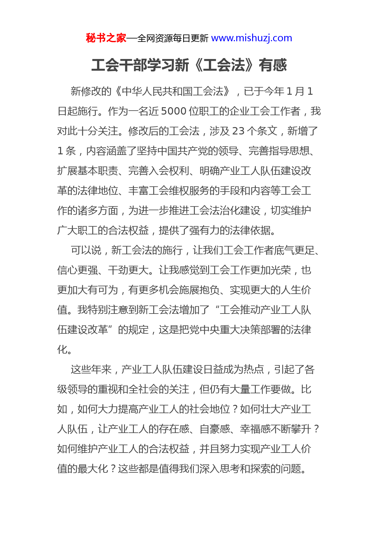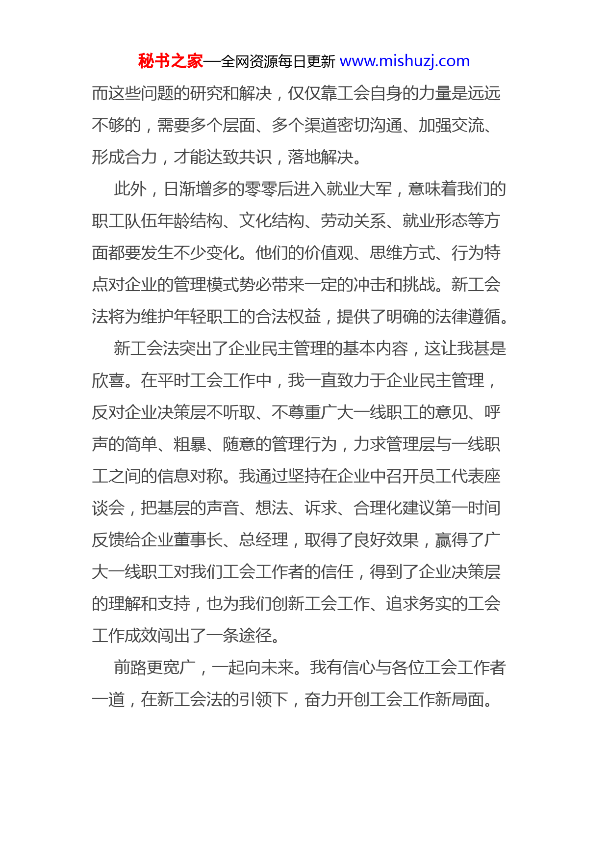 秘书之家—全网资源每日更新www.mishuzj.com工会干部学习新《工会法》有感新修改的《中华人民共和国工会法》,已于今年1月1日起施行。作为一名近5000位职工的企业工会工作者,我对此十分关注。修改后的工会法,涉及23个条文,新增了1条,内容涵盖了坚持中国共产党的领导、完善指导思想、扩展基本职责、完善入会权利、明确产业工人队伍建设改革的法律地位、丰富工会维权服务的手段和内容等工会工作的诸多方面,为进一步推进工会法治化建设,切实维护广大职工的合法权益,提供了强有力的法律依据。可以说,新工会法的施行,让我们工会工作者底气更足、信心更强、干劲更大。让我感觉到工会工作更加光荣,也更加大有可为,有更多机会施展抱负、实现更大的人生价值。我特别注意到新工会法增加了“工会推动产业工人队伍建设改革”的规定,这是把党中央重大决策部署的法律化。这些年来,产业工人队伍建设日益成为热点,引起了各级领导的重视和全社会的关注,但仍有大量工作要做。比如,如何大力提高产业工人的社会地位?如何壮大产业工人队伍,让产业工人的存在感、自豪感、幸福感不断攀升?如何维护产业工人的合法权益,并且努力实现产业工人价值的最大化?这些都是值得我们深入思考和探索的问题。秘书之家—全网资源每日更新www.mishuzj.com而这些问题的研究和解决,仅仅靠工会自身的力量是远远不够的,需要多个层面、多个渠道密切沟通、加强交流、形成合力,才能达致共识,落地解决。此外,日渐增多的零零后进入就业大军,意味着我们的职工队伍年龄结构、文化结构、劳动关系、就业形态等方面都要发生不少变化。他们的价值观、思维方式、行为特点对企业的管理模式势必带来一定的冲击和挑战。新工会法将为维护年轻职工的合法权益,提供了明确的法律遵循。新工会法突出了企业民主管理的基本内容,这让我甚是欣喜。在平时工会工作中,我一直致力于企业民主管理,反对企业决策层不听取、不尊重广大一线职工的意见、呼声的简单、粗暴、随意的管理行为,力求管理层与一线职工之间的信息对称。我通过坚持在企业中召开员工代表座谈会,把基层的声音、想法、诉求、合理化建议第一时间反馈给企业董事长、总经理,取得了良好效果,赢得了广大一线职工对我们工会工作者的信任,得到了企业决策层的理解和支持,也为我们创新工会工作、追求务实的工会工作成效闯出了一条途径。前路更宽广,一起向未来。我有信心与各位工会工作者一道,在新工会法的引领下,奋力开创工会工作新局面。秘书之家—全网资源每日更新www.mishuzj.com学习新《工会法》心得体会2021年12月24日,中华人民共和国第十三届全国人民代表大会常务委员会第三十二次会议通过了《全国人民代表大会常务委员会关于修改<中华人民共和国工会法>的决定》。新修订的《中华人民共和国工会法》自2022年1月1日起施行。在学习了新修改的《工会法》后,我有以下几点心得体会。一是坚持党的领导。新修改的《工会法》明确工会是中国共产党领导的职工自愿结合的工人阶级群众组织,是中国共产党联系职工群众的桥梁和纽带。工会应当坚持党的领导,保持政治性、先进性、群众性,建立联系广泛、服务职工的工作体系。二是保持与时俱进。新修改的《工会法》明确将习近平新时代中国特色社会主义思想同马克思列宁主义、毛泽东思想、邓小平理论、“三个代表”重要思想、科学发展观一道,确立为工会法和工会工作的指导思想。工会要发挥自身优势,加强思想政治引领,把党的意志和主张落实到广大职工群众中去。三是突出服务职工。新修改的《工会法》将工会的基本职责由“维护职工合法权益”扩展为“维护职工合法权益、竭诚服务职工群众”,这表明工会要坚持以职工为中心、秘书之家—全网资源每日更新www.mishuzj.com服务职工群众的工作理念,要努力满足职工多样化的需求,不断增强职工获得感、幸福感、安全感。《工会法》是指导工会工作的“宝典”,让我们共同学好《工会法》,推动相关工作高质量发展,以优异成绩迎接党的二十大胜利召开。