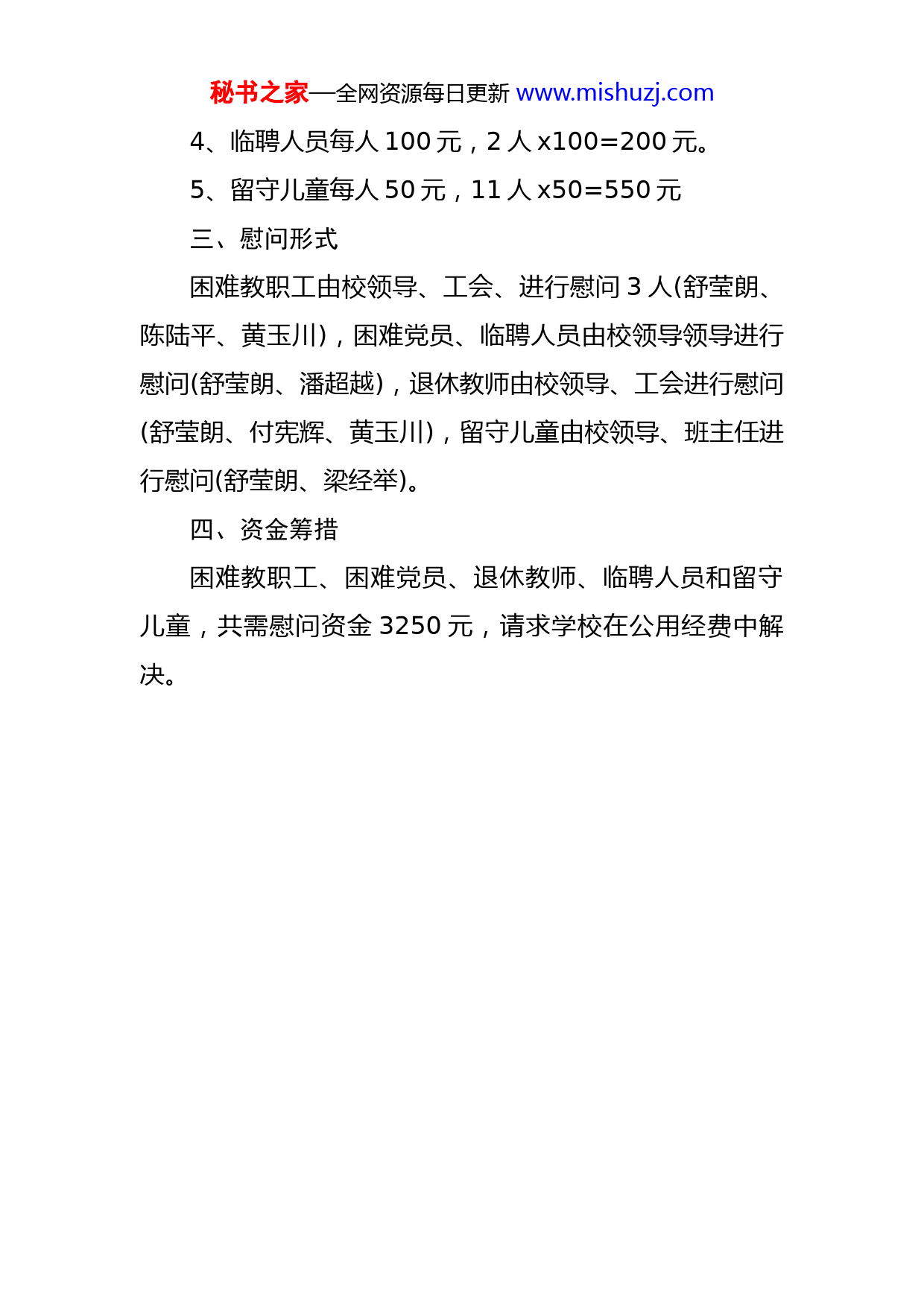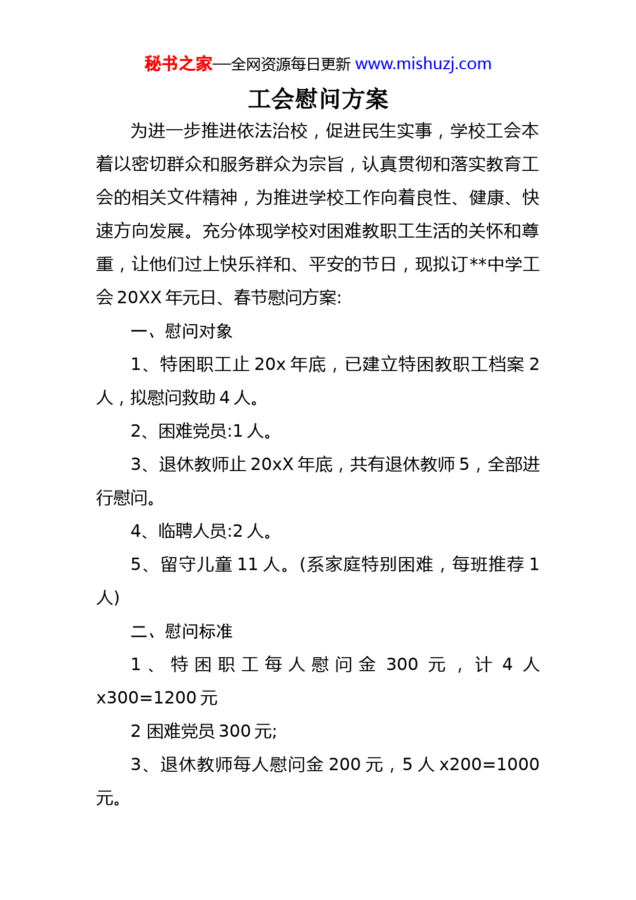 秘书之家—全网资源每日更新www.mishuzj.com工会慰问方案为进一步推进依法治校,促进民生实事,学校工会本着以密切群众和服务群众为宗旨,认真贯彻和落实教育工会的相关文件精神,为推进学校工作向着良性、健康、快速方向发展。充分体现学校对困难教职工生活的关怀和尊重,让他们过上快乐祥和、平安的节日,现拟订中学工会20XX年元日、春节慰问方案:一、慰问对象1、特困职工止20x年底,已建立特困教职工档案2人,拟慰问救助4人。2、困难党员:1人。3、退休教师止20xX年底,共有退休教师5,全部进行慰问。4、临聘人员:2人。5、留守儿童11人。(系家庭特别困难,每班推荐1人)二、慰问标准1、特困职工每人慰问金300元,计4人x300=1200元2困难党员300元;3、退休教师每人慰问金200元,5人x200=1000元。秘书之家—全网资源每日更新www.mishuzj.com4、临聘人员每人100元,2人x100=200元。5、留守儿童每人50元,11人x50=550元三、慰问形式困难教职工由校领导、工会、进行慰问3人(舒莹朗、陈陆平、黄玉川),困难党员、临聘人员由校领导领导进行慰问(舒莹朗、潘超越),退休教师由校领导、工会进行慰问(舒莹朗、付宪辉、黄玉川),留守儿童由校领导、班主任进行慰问(舒莹朗、梁经举)。四、资金筹措困难教职工、困难党员、退休教师、临聘人员和留守儿童,共需慰问资金3250元,请求学校在公用经费中解决。