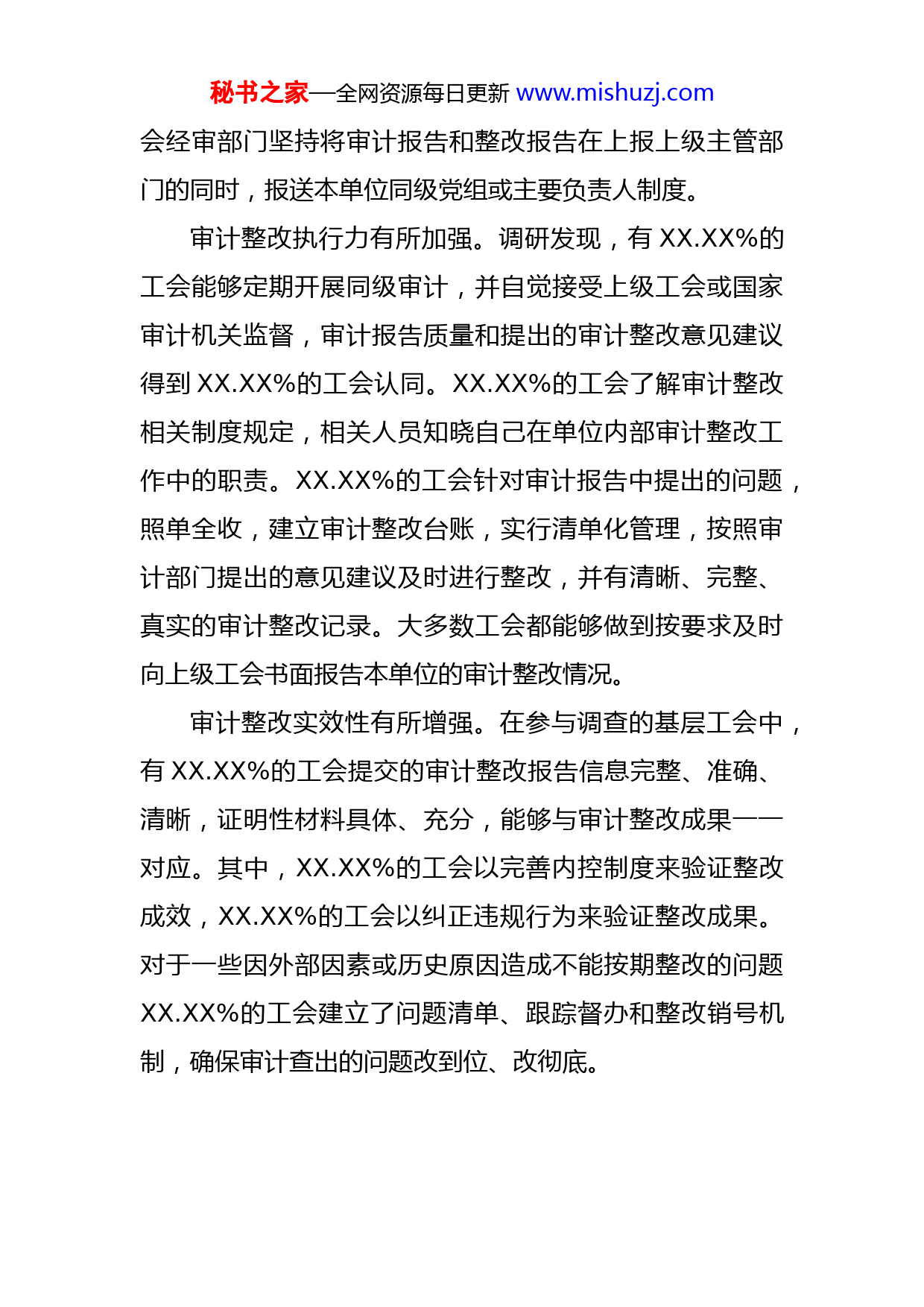 秘书之家—全网资源每日更新www.mishuzj.com工会系统审计整改情况报告近日,XX市总工会采取发放调查问卷、召开座谈会、个别访谈等方式,在全市工会系统开展审计整改情况调研全方位了解和掌握各级工会审计整改实情,深入剖析影响推进审计整改工作的因素和根源,认真研究落实审计整改意见建议的途径和方法,有力推动全市工会经费审计工作提质增效。一、审计整改工作现状市总工会采取线上调研方式,通过互联网向部分党政机关、企事业单位工会发放调查问卷,收到XXX家工会的反馈。其中,党政机关工会XX家,事业单位工会XX家,国有企业工会XX家,其他工会XX家。通过对调查问卷系统分析发现,全市工会经审工作整体水平有所提高,审计整改力度不断加大,主要表现在以下几方面。审计整改重视程度有所提高。各级工会普遍高度重视审计整改工作,从调查结果来看,有XX.XX%的被审计工会针对审计报告中所提出的整改建议,及时开展审计整改工作;XX.XX%的被审计工会审计整改工作由主要负责人牵头,统筹协调各部门开展疑难问题整改;XX.XX%的工秘书之家—全网资源每日更新www.mishuzj.com会经审部门坚持将审计报告和整改报告在上报上级主管部门的同时,报送本单位同级党组或主要负责人制度。审计整改执行力有所加强。调研发现,有XX.XX%的工会能够定期开展同级审计,并自觉接受上级工会或国家审计机关监督,审计报告质量和提出的审计整改意见建议得到XX.XX%的工会认同。XX.XX%的工会了解审计整改相关制度规定,相关人员知晓自己在单位内部审计整改工作中的职责。XX.XX%的工会针对审计报告中提出的问题,照单全收,建立审计整改台账,实行清单化管理,按照审计部门提出的意见建议及时进行整改,并有清晰、完整、真实的审计整改记录。大多数工会都能够做到按要求及时向上级工会书面报告本单位的审计整改情况。审计整改实效性有所增强。在参与调查的基层工会中,有XX.XX%的工会提交的审计整改报告信息完整、准确、清晰,证明性材料具体、充分,能够与审计整改成果一一对应。其中,XX.XX%的工会以完善内控制度来验证整改成效,XX.XX%的工会以纠正违规行为来验证整改成果。对于一些因外部因素或历史原因造成不能按期整改的问题XX.XX%的工会建立了问题清单、跟踪督办和整改销号机制,确保审计查出的问题改到位、改彻底。秘书之家—全网资源每日更新www.mishuzj.com二、审计整改工作中存在的问题虽然XX市各级工会在推动审计整改工作中取得了喜人成效,但调研发现,审计整改仍是工会经审工作中的薄弱环节,在推进审计意见落实和审计整改中还存在亟待解决的问题,主要有以下几方面。审计主体责任落实不到位,职责不清。有的被审计工会领导对落实审计整改主体责任和第一责任人责任的意识不强,没有充分认识到内部审计在促进单位规范管理、完善内控机制、防范风险和提质增效等方面的重要作用,片面地认为审计整改主要责任在财务或经审部门,对审计整改工作推诿扯皮,不能及时安排部署审计整改工作,导致审计查出问题不能有效解决、审计成效不高。调研发现,有XX.XX%的工会审计整改主体责任压得不紧不实,审计整改工作没有由主要负责人牵头,有XX.X%的受访职工所在单位主要由经审或财务部门牵头负责审计整改工作。审计发现问题整改不彻底,屡审屡犯。从调研情况看,虽然有XX.XX%的工会建立了审计整改台账,有明确整改台账记录,并督促按时完成了整改工作,但XXXX年《XX市总工会对各区、局、产业工会审计整改情况汇总表》统计数据显示,被抽查工会审计查出问题整改率仅为XX%。市总工会通过系统分析发现,有的被审计工会领导认为审计查出的问题大多是由客观因素造成的,整改起来有难度秘书之家—全网资源每日更新www.mishuzj.com不愿花时间、精力去协调解决。有的被审计工会虽然虚心接受审计发现的问题,但在整改时却避重就轻,简单的问题整改,复杂的问题不改;上级督办的问题改,压黄线、打“擦边球”的问题不改。个别工会审计整改只是走过场做样子,整改工作只停留在问题表面,应付上级检查,或是找客观原因,推卸责任、拖延整改,导致有些问题屡审屡犯,使审计整改成效大打折扣。管理制度不健全,协作不到位,单打独斗。有的主管工会没有按照XX市政府下发的《关于进一步加强审计整改工作的意见》要求,建立健全审计整改工作制度,没有把审计发现问题的整改情况与被审计单位综合绩效和领导干部工作业绩考核挂钩。有的被审计工会表面上建立了由主要领导牵头,纪检监察、组织、审计、财务等部门共同参与的审计整改协同模式,但实际操作中仅简单地由有关部门内部讨论或主要负责人制定整改措施,审计或财务部门独立开展整改工作。有的被审计工会不注重发挥审计实效没有将是否追究责任作为验证整改成效的方式之一,对审计发现的工会资金使用不规范、内部管理控制存在漏洞、责任追究机制不完善等问题没有制定出切实可行的约谈、问责追责等具体制度措施,使审计整改缺乏硬性约束力,造成审计整改工作雷声大、雨点小。秘书之家—全网资源每日更新www.mishuzj.com三、完善工会审计整改工作的建议和对策对审计发现的问题进行认真整改,着力做好工会经审的“后半篇”文章,是充分发挥审计工作“保驾护航”作用的有效途径和