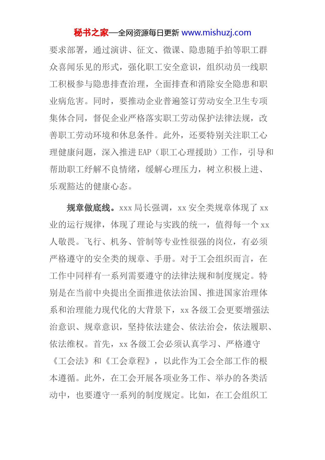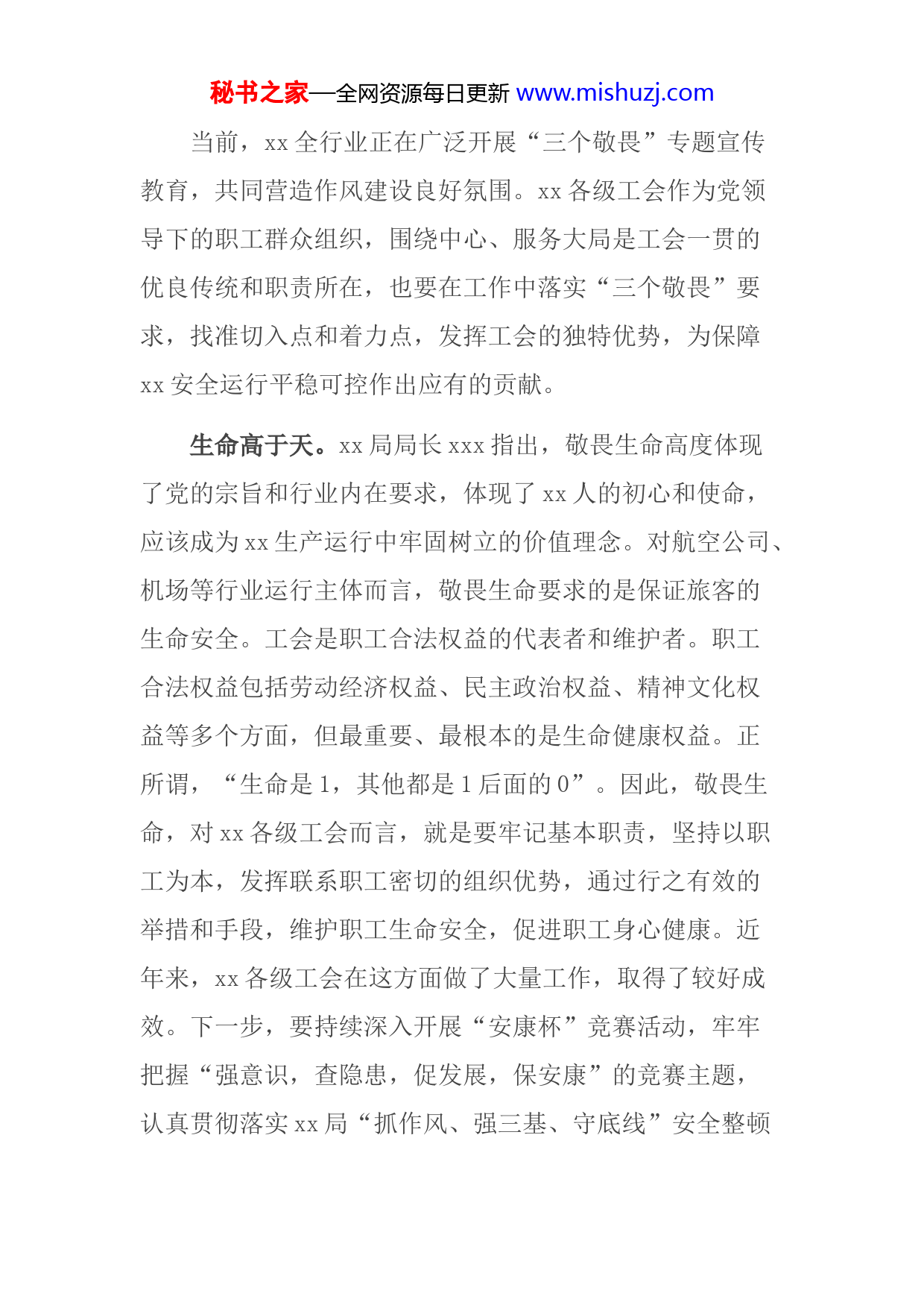 秘书之家—全网资源每日更新www.mishuzj.com当前,xx全行业正在广泛开展“三个敬畏”专题宣传教育,共同营造作风建设良好氛围。xx各级工会作为党领导下的职工群众组织,围绕中心、服务大局是工会一贯的优良传统和职责所在,也要在工作中落实“三个敬畏”要求,找准切入点和着力点,发挥工会的独特优势,为保障xx安全运行平稳可控作出应有的贡献。生命高于天。xx局局长xxx指出,敬畏生命高度体现了党的宗旨和行业内在要求,体现了xx人的初心和使命,应该成为xx生产运行中牢固树立的价值理念。对航空公司、机场等行业运行主体而言,敬畏生命要求的是保证旅客的生命安全。工会是职工合法权益的代表者和维护者。职工合法权益包括劳动经济权益、民主政治权益、精神文化权益等多个方面,但最重要、最根本的是生命健康权益。正所谓,“生命是1,其他都是1后面的0”。因此,敬畏生命,对xx各级工会而言,就是要牢记基本职责,坚持以职工为本,发挥联系职工密切的组织优势,通过行之有效的举措和手段,维护职工生命安全,促进职工身心健康。近年来,xx各级工会在这方面做了大量工作,取得了较好成效。下一步,要持续深入开展“安康杯”竞赛活动,牢牢把握“强意识,查隐患,促发展,保安康”的竞赛主题,认真贯彻落实xx局“抓作风、强三基、守底线”安全整顿秘书之家—全网资源每日更新www.mishuzj.com要求部署,通过演讲、征文、微课、隐患随手拍等职工群众喜闻乐见的形式,强化职工安全意识,组织动员一线职工积极参与隐患排查治理,全面排查和消除安全隐患和职业病危害。同时,要推动企业普遍签订劳动安全卫生专项集体合同,督促企业严格落实职工劳动保护法律法规,改善职工劳动环境和休息条件。此外,还要特别关注职工心理健康问题,深入推进EAP(职工心理援助)工作,引导和帮助职工纾解不良情绪,缓解心理压力,树立积极上进、乐观豁达的健康心态。规章做底线。xxx局长强调,xx安全类规章体现了xx业的运行规律,体现了理论与实践的统一,值得每一个xx人敬畏。飞行、机务、管制等专业性很强的岗位,有必须严格遵守的安全类的规章、手册。对于工会组织而言,在工作中同样有一系列需要遵守的法律法规和制度规定。特别是在当前中央提出全面推进依法治国、推进国家治理体系和治理能力现代化的大背景下,xx各级工会更要增强法治意识、规章意识,坚持依法建会、依法治会,依法履职、依法维权。首先,xx各级工会必须认真学习、严格遵守《工会法》和《工会章程》,以此作为工会全部工作的根本遵循。此外,在工会开展各项业务工作、举办的各类活动中,也要遵守一系列的制度规定。比如,在工会组织工秘书之家—全网资源每日更新www.mishuzj.com作中,要严格落实《基层工会会员代表大会条例》《工会基层组织选举工作条例》,依法依规组建工会,召开会员代表大会,民主选举产生工会委员会、工会主席;在推进民主管理工作中,要严格落实《劳动法》《劳动合同法》《公司法》《企业民主管理规定》等法律法规和规章,加强以职代会为基本形式的企事业单位民主管理制度建设。在经费收支使用方面,要严格落实《xx基层工会经费收支管理实施办法》,严格控制工会经费开支范围和开支标准,确保工会经费来之于职工、用之于职工。总之,各级工会干部要在工会工作中牢固树立遵章守纪、依法办事的法治意识、规章意识,加强对工会工作相关法律法规和政策制度的学习理解,不断促进工会工作法治化、规范化。职责是根本。xxx局长指出,敬畏职责体现了xx人的职业操守,是岗位责任和专业能力的高度统一。任何一个组织的存在,必然有其需要履行的职能或使命,具体而言,职责就是一个组织及其成员完成其承担的工作任务,以及完成这些工作所需承担的责任。对于工会组织来说,其职责是清晰和明确的。《中国工会章程》明确规定,“中国工会的基本职责是维护职工合法权益、竭诚服务职工群众”。对于这一基本职责,xx各级工会和广大工会干部应始终铭记在心,做到守土有责、守土负责、守土尽责。在秘书之家—全网资源每日更新www.mishuzj.com“xx”事件中,以刘传健机长为代表的英雄机组能够在生死关头化险为夷,除了强烈的责任意识、严谨的工作作风,更重要的是靠着日复一日、年复一年的学习、训练所养成的精湛专业技能。进入新时代,随着xx事业持续快速发展,改革日益深化,工会工作面临着新形势、新任务。xx职工队伍不断壮大的同时,职工利益诉求多元、思想观念多元,劳动关系复杂多样。这些都要求工会干部要有“本领恐慌”意识,持续加强学习,熟练掌握做好工作必备的理论政策和业务知识。xx各级工会干部要深入学习、践行工匠精神、英雄机组精神,干一行、爱一行、专一行。深入学习贯彻习近平总书记关于工人阶级和工会工作的重要论述,牢牢把握工会工作的正确政治方向。结合岗位职责和形势任务的变化,加强业务知识学习,努力提高履职尽责的本领,使自己成为工会工作的行家里手,成为职工群众信赖的贴心人、娘家人。
