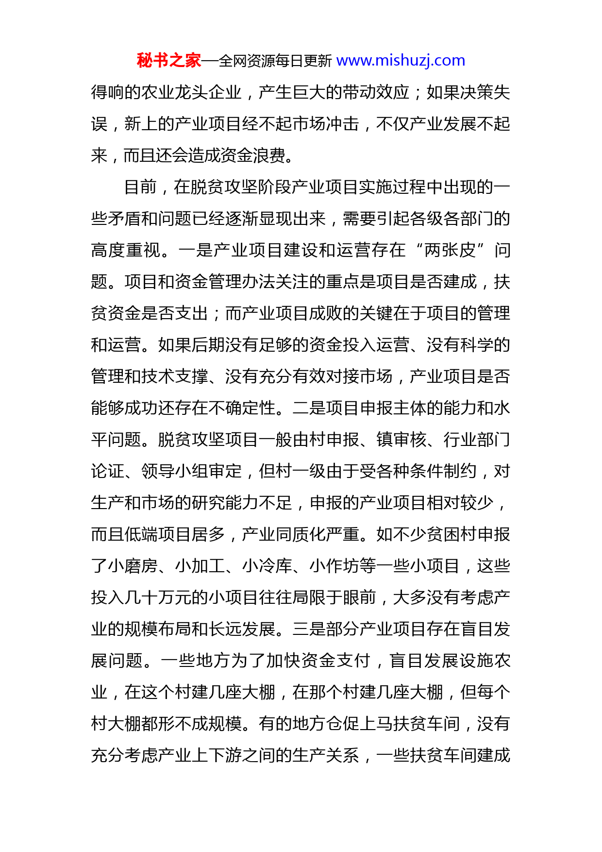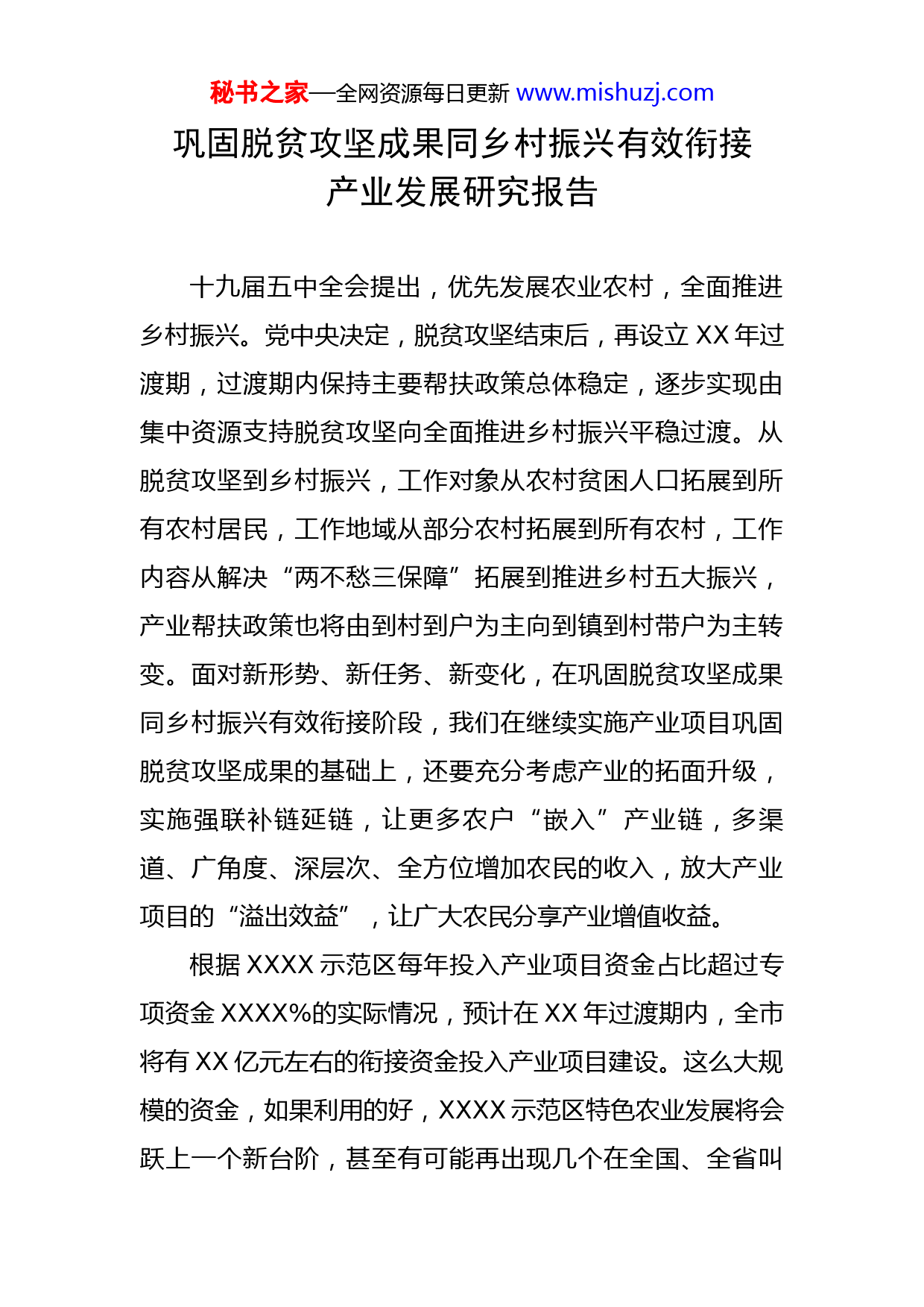 秘书之家—全网资源每日更新www.mishuzj.com巩固脱贫攻坚成果同乡村振兴有效衔接产业发展研究报告十九届五中全会提出,优先发展农业农村,全面推进乡村振兴。党中央决定,脱贫攻坚结束后,再设立XX年过渡期,过渡期内保持主要帮扶政策总体稳定,逐步实现由集中资源支持脱贫攻坚向全面推进乡村振兴平稳过渡。从脱贫攻坚到乡村振兴,工作对象从农村贫困人口拓展到所有农村居民,工作地域从部分农村拓展到所有农村,工作内容从解决“两不愁三保障”拓展到推进乡村五大振兴,产业帮扶政策也将由到村到户为主向到镇到村带户为主转变。面对新形势、新任务、新变化,在巩固脱贫攻坚成果同乡村振兴有效衔接阶段,我们在继续实施产业项目巩固脱贫攻坚成果的基础上,还要充分考虑产业的拓面升级,实施强联补链延链,让更多农户“嵌入”产业链,多渠道、广角度、深层次、全方位增加农民的收入,放大产业项目的“溢出效益”,让广大农民分享产业增值收益。根据XXXX示范区每年投入产业项目资金占比超过专项资金XXXX%的实际情况,预计在XX年过渡期内,全市将有XX亿元左右的衔接资金投入产业项目建设。这么大规模的资金,如果利用的好,XXXX示范区特色农业发展将会跃上一个新台阶,甚至有可能再出现几个在全国、全省叫秘书之家—全网资源每日更新www.mishuzj.com得响的农业龙头企业,产生巨大的带动效应;如果决策失误,新上的产业项目经不起市场冲击,不仅产业发展不起来,而且还会造成资金浪费。目前,在脱贫攻坚阶段产业项目实施过程中出现的一些矛盾和问题已经逐渐显现出来,需要引起各级各部门的高度重视。一是产业项目建设和运营存在“两张皮”问题。项目和资金管理办法关注的重点是项目是否建成,扶贫资金是否支出;而产业项目成败的关键在于项目的管理和运营。如果后期没有足够的资金投入运营、没有科学的管理和技术支撑、没有充分有效对接市场,产业项目是否能够成功还存在不确定性。二是项目申报主体的能力和水平问题。脱贫攻坚项目一般由村申报、镇审核、行业部门论证、领导小组审定,但村一级由于受各种条件制约,对生产和市场的研究能力不足,申报的产业项目相对较少,而且低端项目居多,产业同质化严重。如不少贫困村申报了小磨房、小加工、小冷库、小作坊等一些小项目,这些投入几十万元的小项目往往局限于眼前,大多没有考虑产业的规模布局和长远发展。三是部分产业项目存在盲目发展问题。一些地方为了加快资金支付,盲目发展设施农业,在这个村建几座大棚,在那个村建几座大棚,但每个村大棚都形不成规模。有的地方仓促上马扶贫车间,没有充分考虑产业上下游之间的生产关系,一些扶贫车间建成秘书之家—全网资源每日更新www.mishuzj.com后运行情况不佳,存在闲置和半闲置现象。一些村新上的生产加工项目,对产业的生产能力和市场调研不够,经济作物长期形不成产量,新建成的加工和仓储设施长期闲置。一些村集体经济组织和合作社权责不分,村集体经济组织长期拿不到产业项目收益。这些不切实际的做法,表面上看是增加了村集体经济组织的固定资产,但实际上违背了产业发展规律,不利于产业的做大做强。做好巩固脱贫攻坚成果同乡村振兴有效衔接产业发展研究,对实现从脱贫攻坚到乡村振兴的平稳过渡至关重要。围绕资产管理、产业谋划、产销衔接等,提出如下思考与建议:一、搞好资产管理,确保资产保值增值全面推进乡村振兴,首先要把巩固拓展脱贫攻坚成果摆在头等重要位置来抓。党的十八大以来,国家、省、市、县、乡五级政府调动社会力量,实施了大量扶贫项目,形成了较大规模的扶贫资产。据统计,目前XXXX示范区累计形成的扶贫资产达到XX.XXXX亿元,其中经营性资产XX.XX亿元,占比XXXX.XX%,远超全省经营性资产占比XXXX.XX%。稳固好基本盘,把已经形成的存量资产管好用好,特别是搞好经营性资产的后期运营,实现扶贫资产的保值增值,对巩固拓展脱贫攻坚成果意义重大。一是要搞好确权登记。将经营性扶贫资产纳入正规的管理体系,做到谁的资产谁负责,谁的孩子谁抱走,明确资产秘书之家—全网资源每日更新www.mishuzj.com权属,依法进行确权登记,确保资产不流失。二是要加强后续管理。明确管理权限和职责分工,对确权到村集体经济组织的经营性扶贫项目资产,在搞好风险防控的基础上,进一步完善运营方案,加强后续管理,确保资产良性运转并持续发挥效益。三是要规范收益分配使用管理。不断完善资产收益分配使用管理办法,产业项目收益要全部落实到村、到户、到人。鼓励有一定劳动能力的脱贫户、监测户等通过参与生产经营活动增加收入;对不能直接参与生产经营活动的群体,可通过提供公益性岗位等形式,采取二次分配的方式增加其收入。二、抓好顶层设计,突出龙头带动作用在巩固拓展脱贫攻坚成果与乡村振兴有效衔接阶段,不宜再大规模实施“村村点火、处处冒烟”的小产业、小项目,而是要统筹推进产业的市场化、规模化、集约化发展。从XXXXXXXX年底开始,XXXX示范区每年将XXXX%以上的财政专项扶贫资金投入产业项目,把产业项目建设、带贫企业发展、集体经济壮大、脱贫户持续增收“捆绑”到一起,推进“四位一体”协同发展,取得了较好的经济效益和社会效益。XXXXXXXX-XXXXXXXX年,XXXX示