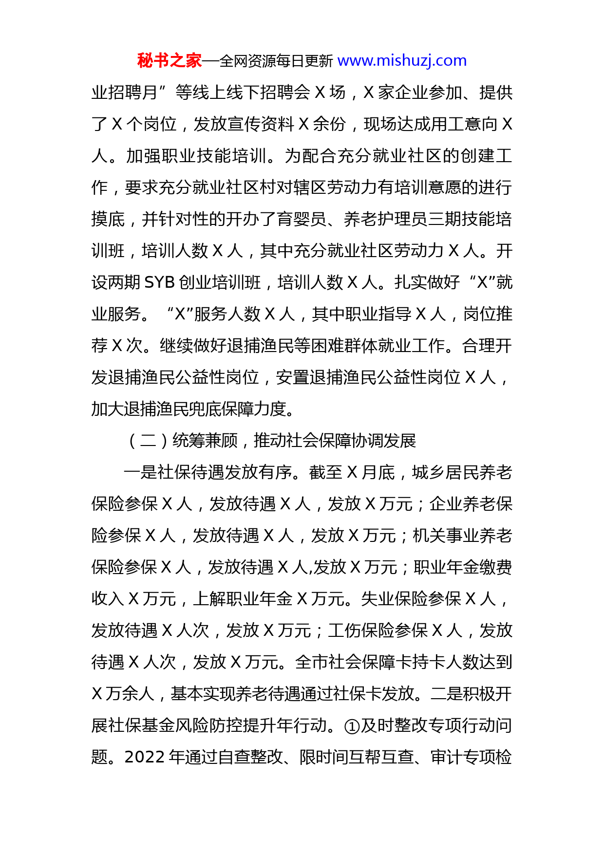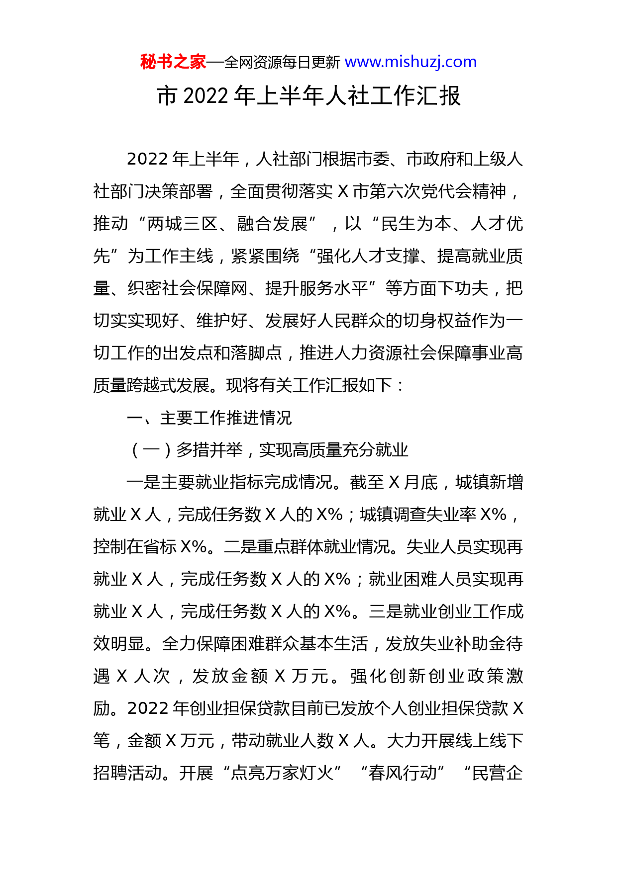 秘书之家—全网资源每日更新www.mishuzj.com市2022年上半年人社工作汇报2022年上半年,人社部门根据市委、市政府和上级人社部门决策部署,全面贯彻落实X市第六次党代会精神,推动“两城三区、融合发展”,以“民生为本、人才优先”为工作主线,紧紧围绕“强化人才支撑、提高就业质量、织密社会保障网、提升服务水平”等方面下功夫,把切实实现好、维护好、发展好人民群众的切身权益作为一切工作的出发点和落脚点,推进人力资源社会保障事业高质量跨越式发展。现将有关工作汇报如下:一、主要工作推进情况(一)多措并举,实现高质量充分就业一是主要就业指标完成情况。截至X月底,城镇新增就业X人,完成任务数X人的X%;城镇调查失业率X%,控制在省标X%。二是重点群体就业情况。失业人员实现再就业X人,完成任务数X人的X%;就业困难人员实现再就业X人,完成任务数X人的X%。三是就业创业工作成效明显。全力保障困难群众基本生活,发放失业补助金待遇X人次,发放金额X万元。强化创新创业政策激励。2022年创业担保贷款目前已发放个人创业担保贷款X笔,金额X万元,带动就业人数X人。大力开展线上线下招聘活动。开展“点亮万家灯火”“春风行动”“民营企秘书之家—全网资源每日更新www.mishuzj.com业招聘月”等线上线下招聘会X场,X家企业参加、提供了X个岗位,发放宣传资料X余份,现场达成用工意向X人。加强职业技能培训。为配合充分就业社区的创建工作,要求充分就业社区村对辖区劳动力有培训意愿的进行摸底,并针对性的开办了育婴员、养老护理员三期技能培训班,培训人数X人,其中充分就业社区劳动力X人。开设两期SYB创业培训班,培训人数X人。扎实做好“X”就业服务。“X”服务人数X人,其中职业指导X人,岗位推荐X次。继续做好退捕渔民等困难群体就业工作。合理开发退捕渔民公益性岗位,安置退捕渔民公益性岗位X人,加大退捕渔民兜底保障力度。(二)统筹兼顾,推动社会保障协调发展一是社保待遇发放有序。截至X月底,城乡居民养老保险参保X人,发放待遇X人,发放X万元;企业养老保险参保X人,发放待遇X人,发放X万元;机关事业养老保险参保X人,发放待遇X人,发放X万元;职业年金缴费收入X万元,上解职业年金X万元。失业保险参保X人,发放待遇X人次,发放X万元;工伤保险参保X人,发放待遇X人次,发放X万元。全市社会保障卡持卡人数达到X万余人,基本实现养老待遇通过社保卡发放。二是积极开展社保基金风险防控提升年行动。①及时整改专项行动问题。2022年通过自查整改、限时间互帮互查、审计专项检秘书之家—全网资源每日更新www.mishuzj.com查、推磨式交叉检查、疑点信息排查、X专项检查、省第十二督导组督查等,对所有问题分类建立清单,实行销号管理。目前我市共查出的风险问题X个、疑点数据核查(X条)、人社部调研检查组反馈问题(我市X个),均已全部整改落实到位。②认真落实湘办〔X〕X号文件精神。X月X日、X日在市委常委会、政府常务会上,认真传达学习了湘办〔X〕X号文件精神,切实增强学习宣传贯彻的自觉性。制定出台《X市贯彻落实湘办﹝X〕X号文件任务清单》《X市社会保险基金管理提升年行动方案》,建立社保基金监管联席会议制度,适时成立社保基金监督委员会,进一步加强社保基金监管工作。(三)加强监察仲裁,构建和谐劳动关系一是加强劳动保障法律法规宣传,发放资料X余份,对各类用人单位的日常巡查达X余次。二是率先推出了“一长两员两代表”维权新机制保障农民工工资支付,构建共同宣传、信息共享、集体会商、部门配合、法律援助的“五位一体”维权工作新格局,整合保障农民工工资支付工作力量,开创保障农民工工资支付工作的“X模式”。同时,对我市建设领域在建项目和保障农民工工资支付工作实行动态化管理、星级管理。三是为农民工追回工资X万元,涉及农民工X人,共接待来人来访反应欠薪问题X起,符合受理立案X起。四是提高劳动争议仲裁水平。截秘书之家—全网资源每日更新www.mishuzj.com止到X月底,受理案件X起,结案X起;来信X起,接待来访群众X余人,最大程度地维护了农民工的合法权益。(四)政策护航,强化人事人才工作一是根据2022年我市部分事业单位招聘工作安徘,已于X月X日在X人事考试网发布《X市2022年公开招聘部分事业单位工作人员公告》,计划招聘全额拨款事业编制人员X名。X月X日事业单位工作人员公开招聘工作现已完成面试阶段。二是深入推进“X市人才行动计划”,努力探索“政府+高校+猎才公司”引才模式和建立人才培养选拔激励机制,吸引集聚更多优秀人才助推X市经济社会高质量发展。目前,上一轮人才引进已进入考察阶段,第三轮人才引进公示已挂网。三是稳步推进工资福利工作。认真做好2022年度事业单位新进人员的工资手续,开展事业单位薪级工资普调晋级工作及工资年报统计工作,及时落实乡镇事业单位工作人员乡镇补贴和有关津补贴政策,到龄退休办理进行审批和在职、离退休死亡人员丧葬费、一次性抚恤金及遗属生活困难补助费审核。(五)全力保障,推进重点民生实事工作今年我市共承担省、市重点民生实事项目X件X项,其中:省级X件X小项,X市级X件。构建了“分管市级领导牵头抓总,责任单位主要负责人亲自抓、分管负责人具体抓、专人力量直接抓”的责任落实体系,及时印发