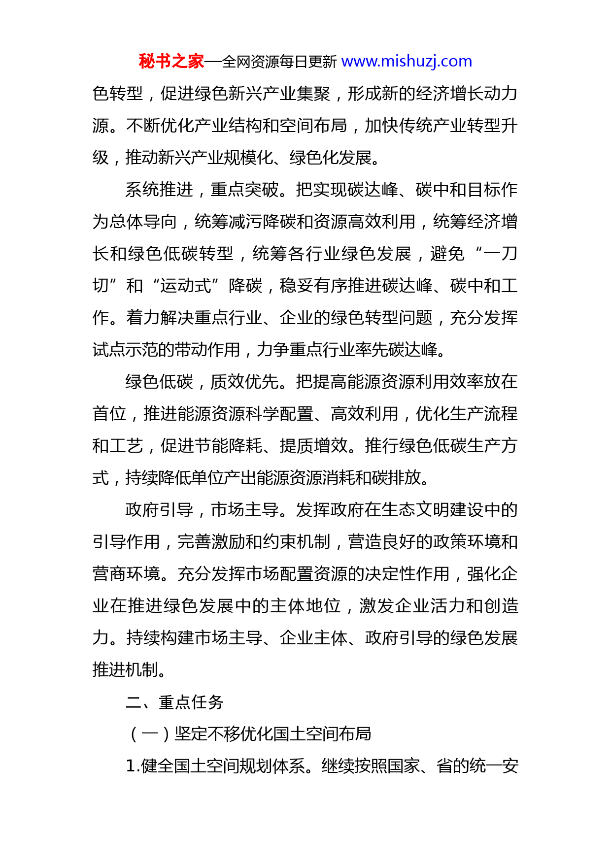 秘书之家—全网资源每日更新www.mishuzj.com市2022年生态文明建设工作要点2022年是党的二十大召开之年,为深入贯彻XXX生态文明思想,坚决贯彻党中央决策部署和省市工作安排,加快提升全市生态文明建设和绿色发展水平,结合我市实际,制定XX市2022年生态文明建设工作要点。一、总体要求(一)指导思想以XXX生态文明思想为指导,全面贯彻党的十九大和十九届二中、三中、四中、五中、六中全会和省党代会精神,坚持绿水青山就是金山银山,把发展摆在一切工作的首要位置。完整准确全面贯彻新发展理念,以深化供给侧结构性改革为主线,以碳达峰、碳中和目标为导向,以绿色技术创新为动力,着力优化产业结构,推动企业低碳转型,提高能源资源利用效率和清洁生产水平,推进产业生态化和生态产业化,加快补齐生态环境短板,以更大力度推动全市经济和生态文明高质量发展,不断增强全市人民群众的生态环境获得感、幸福感和安全感。(二)基本原则创新驱动,转型发展。把创新作为第一驱动力,完善以企业为主体的技术创新体系,打好关键核心技术攻坚战,加速科技成果转化应用。以创新驱动加快传统产业绿秘书之家—全网资源每日更新www.mishuzj.com色转型,促进绿色新兴产业集聚,形成新的经济增长动力源。不断优化产业结构和空间布局,加快传统产业转型升级,推动新兴产业规模化、绿色化发展。系统推进,重点突破。把实现碳达峰、碳中和目标作为总体导向,统筹减污降碳和资源高效利用,统筹经济增长和绿色低碳转型,统筹各行业绿色发展,避免“一刀切”和“运动式”降碳,稳妥有序推进碳达峰、碳中和工作。着力解决重点行业、企业的绿色转型问题,充分发挥试点示范的带动作用,力争重点行业率先碳达峰。绿色低碳,质效优先。把提高能源资源利用效率放在首位,推进能源资源科学配置、高效利用,优化生产流程和工艺,促进节能降耗、提质增效。推行绿色低碳生产方式,持续降低单位产出能源资源消耗和碳排放。政府引导,市场主导。发挥政府在生态文明建设中的引导作用,完善激励和约束机制,营造良好的政策环境和营商环境。充分发挥市场配置资源的决定性作用,强化企业在推进绿色发展中的主体地位,激发企业活力和创造力。持续构建市场主导、企业主体、政府引导的绿色发展推进机制。二、重点任务(一)坚定不移优化国土空间布局1.健全国土空间规划体系。继续按照国家、省的统一安秘书之家—全网资源每日更新www.mishuzj.com排部署,持续推进我市国土空间总体规划深化完善工作,统筹科学划定三条控制线,严守耕地保护红线。指导各县(市、区)积极推进县级总规和村庄规划编制工作,加强与上位规划的衔接,高质量完成规划编制工作。强化规划监督实施,严格审批和监管,确保“一张蓝图干到底”。全面落实主体功能区布局,开展批而未供和闲置土地盘活利用工作,严格执行国家重点生态功能区产业准入负面清单,严禁新上不符合功能定位的产业项目。〔责任单位:市自然资源局、市行政审批局、市生态环境局、市农业农村局、市发展改革委,各县(市、区)政府,循环化工园区、高新区管委会,下同〕(二)持之以恒打好污染防治攻坚战2.持续开展蓝天保卫战。巩固大气污染“退后十”成果,深入开展重点行业治理,做好工业炉窑、涉VOCs企业整治工作。扩展“双在线”监控平台建设,加强污染源自动监控管理。做好重型柴油货车深度治理工作,开展冒黑烟非道路移动机械专项整治。加强道路、工地扬尘和建筑垃圾运输管控,扎实开展黄土裸露地面整治、农村“双代”等工作。坚持分类分级管控,按照差异化减排、降尘标准,深入开展重点行业差异化精准治理,实行生态环境监管正面清单制度,争取更多企业进入正面清单,严禁“一刀切”式停限产。强化扬尘精细化管控,全市建筑工秘书之家—全网资源每日更新www.mishuzj.com地全面落实“六个百分之百”“两个全覆盖”,推动具备条件的城市道路“水洗机扫”全覆盖,强化线性工程扬尘治理,抓好矿山、砂场、工业企业堆料场扬尘防治,严防“散乱污”企业死灰复燃,严禁秸秆垃圾露天焚烧。(责任单位:市生态环境局、市发展改革委、市工业和信息化局、市住房城乡建设局、市城管局、市交通运输局、市自然资源局)3.坚决遏制“两高”项目盲目发展。坚决贯彻落实党中央、国务院决策部署,按照省委、省政府《关于坚决遏制“两高”项目盲目发展的若干措施》,严格执行产能置换、污染物区域削减等政策,严格环境准入,坚决遏制“两高”项目盲目发展。全面梳理排查拟建、在建和存量“两高”项目,实行分类、动态管理,对不符合政策要求的,进行全面整改。对违规上马、未批先建的,严格依法依规查处。对标先进,推动在建和拟建“两高”项目提升能效和环保水平,推进存量“两高”项目改造升级。对确需民生需求、产业链延伸、影响国家战略部署等项目,要区别对待,加强项目节能审查,新上高耗能项目能效应达到行业或国际先进水平,必须选用Ⅰ级能效的主要耗能设备。加强事中事后监管,严厉打击无证排污、不按证排污等各类违法行为,及时曝光典型案例。采取强有力措施,坚决去、主动调、加快转,有效推动全市经济高质量发秘书之家—全网资源每日更新www.mishuzj.com展。(责任单位:市行政审批局、市工业和信
