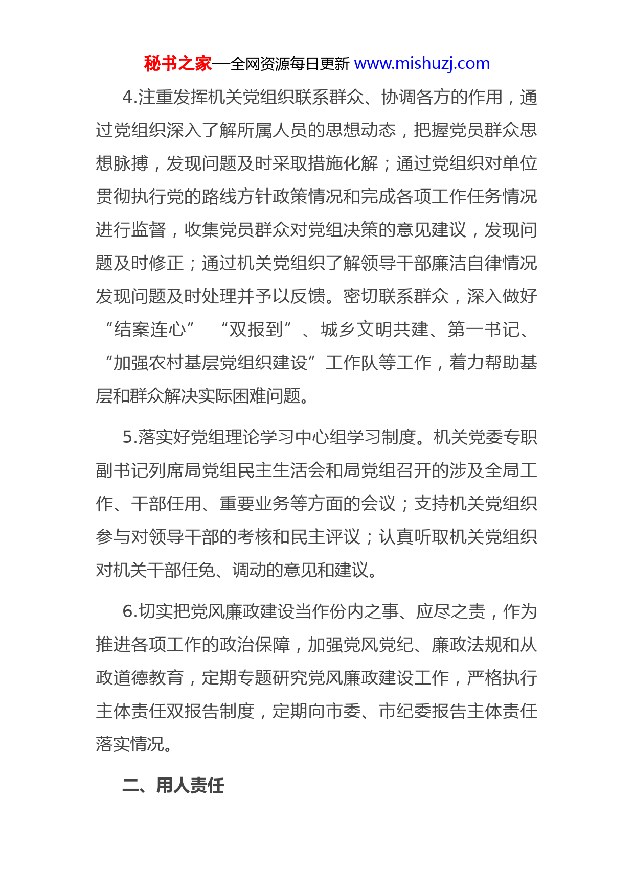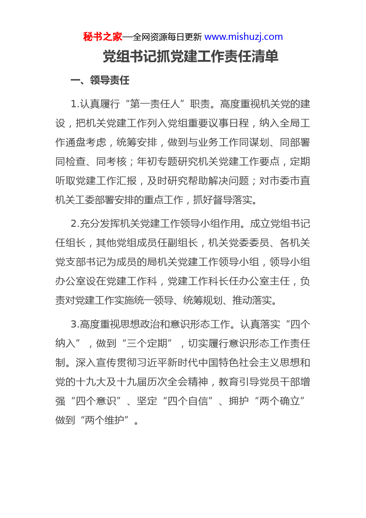秘书之家—全网资源每日更新www.mishuzj.com党组书记抓党建工作责任清单一、领导责任1.认真履行“第一责任人”职责。高度重视机关党的建设,把机关党建工作列入党组重要议事日程,纳入全局工作通盘考虑,统筹安排,做到与业务工作同谋划、同部署同检查、同考核;年初专题研究机关党建工作要点,定期听取党建工作汇报,及时研究帮助解决问题;对市委市直机关工委部署安排的重点工作,抓好督导落实。2.充分发挥机关党建工作领导小组作用。成立党组书记任组长,其他党组成员任副组长,机关党委委员、各机关党支部书记为成员的局机关党建工作领导小组,领导小组办公室设在党建工作科,党建工作科长任办公室主任,负责对党建工作实施统一领导、统筹规划、推动落实。3.高度重视思想政治和意识形态工作。认真落实“四个纳入”,做到“三个定期”,切实履行意识形态工作责任制。深入宣传贯彻习近平新时代中国特色社会主义思想和党的十九大及十九届历次全会精神,教育引导党员干部增强“四个意识”、坚定“四个自信”、拥护“两个确立”做到“两个维护”。秘书之家—全网资源每日更新www.mishuzj.com4.注重发挥机关党组织联系群众、协调各方的作用,通过党组织深入了解所属人员的思想动态,把握党员群众思想脉搏,发现问题及时采取措施化解;通过党组织对单位贯彻执行党的路线方针政策情况和完成各项工作任务情况进行监督,收集党员群众对党组决策的意见建议,发现问题及时修正;通过机关党组织了解领导干部廉洁自律情况发现问题及时处理并予以反馈。密切联系群众,深入做好“结案连心”“双报到”、城乡文明共建、第一书记、“加强农村基层党组织建设”工作队等工作,着力帮助基层和群众解决实际困难问题。5.落实好党组理论学习中心组学习制度。机关党委专职副书记列席局党组民主生活会和局党组召开的涉及全局工作、干部任用、重要业务等方面的会议;支持机关党组织参与对领导干部的考核和民主评议;认真听取机关党组织对机关干部任免、调动的意见和建议。6.切实把党风廉政建设当作份内之事、应尽之责,作为推进各项工作的政治保障,加强党风党纪、廉政法规和从政道德教育,定期专题研究党风廉政建设工作,严格执行主体责任双报告制度,定期向市委、市纪委报告主体责任落实情况。二、用人责任秘书之家—全网资源每日更新www.mishuzj.com7.按照德才兼备、以德为先的原则选拔任用干部,坚持事业为上、公道正派,反对任人为亲的用人原则。突出政治首位、重视任用担当干事和作风扎实的干部到重要岗位坚持重在历练,重视任用年轻优秀同志,弘扬专业精神,注重培养又红又专的专业人才。8.高度重视机关党组织建设,选好配强党组织负责人,保证党务干部质量,坚决防止和克服把党务岗位作为安置性、照顾性岗位的倾向。对年龄大、能力弱、奉献意识差责任心进取心不强的干部及时进行调整。9.重视机关专职党务人员的培养和交流,注重把优秀的行政、业务人员放到党务岗位锻炼培养,注重从党务人员中调整使用干部;建立党务干部定期交流机制,促进党务人员与行政、业务人员有计划地调整交流;关心党务干部生活和成长进步,树立党务干部大有作为、党务工作大有可为的良好导向。三、保障责任10.按照市委《关于加强和改进市直机关党建工作的意见》要求,解决好机关党组织机构设置、人员配备等问题切实配齐配强专兼职党务干部。秘书之家—全网资源每日更新www.mishuzj.com11.把机关基层党组织活动经费列入行政经费预算,努力在经费、场所等各方面为开展党的活动提供必要条件。四、管理责任12.从严管好党员干部,制定加强班子自身建设意见,坚持民主集中制原则,抓好班子自身建设。带头贯彻执行党组决议,建立领导干部带头讲党课制度,落实党员领导干部“双重组织生活”制度,自觉参加所在党支部的组织生活,接受所在支部党员的监督,以实际行动影响和带动整个机关党建工作的开展。13.督促党组成员落实“一岗双责”,建立局党组成员和局领导联系党支部制度。党组成员要以身作则,支持并积极参加支部开展的组织生活,认真完成机关党组织分配的工作任务,主动接受党组织和党员群众的监督。14.健全机关党的工作责任制,建立目标明确、责任具体、操作性强、体系完善的目标责任体系,建立坚强有力的督查考评机制和奖惩激励机制、责任追究机制;督促机关党组织落实党建工作责任制,抓好所属基层党组织建设和党员队伍建设。15.督促带领党员干部认真落实从严治党要求,遵守政治纪律和政治规矩,严格执行党的路线、方针、政策;聚秘书之家—全网资源每日更新www.mishuzj.com焦整治“四风”等作风问题,建立基层党组织和党员干部作风建设状况定期分析制度,每年组织对作风建设情况特别是“四风”问题进行排查分析,对突出问题发现一起、整改一起。16.注重加强对机关工会、团支部、妇委会等群团组织的领导,选齐配强组成人员,支持独立负责地开展工作。定期听取群团组织工作汇报,专题研究和解决实际问题。积极推进文明创建工作,积极开展志愿服务、社会公益等活动,树立XX机关良好形象。17.督促抓好对所属基层党组织的日常监督管理和检查考核,指导机关党组织落实好推进党建工作责任清单,组织开