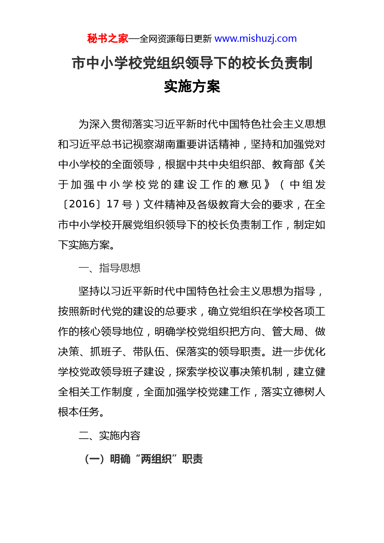 秘书之家—全网资源每日更新www.mishuzj.com市中小学校党组织领导下的校长负责制实施方案为深入贯彻落实习近平新时代中国特色社会主义思想和习近平总书记视察湖南重要讲话精神,坚持和加强党对中小学校的全面领导,根据中共中央组织部、教育部《关于加强中小学校党的建设工作的意见》(中组发〔2016〕17号)文件精神及各级教育大会的要求,在全市中小学校开展党组织领导下的校长负责制工作,制定如下实施方案。一、指导思想坚持以习近平新时代中国特色社会主义思想为指导,按照新时代党的建设的总要求,确立党组织在学校各项工作的核心领导地位,明确学校党组织把方向、管大局、做决策、抓班子、带队伍、保落实的领导职责。进一步优化学校党政领导班子建设,探索学校议事决策机制,建立健全相关工作制度,全面加强学校党建工作,落实立德树人根本任务。二、实施内容(一)明确“两组织”职责秘书之家—全网资源每日更新www.mishuzj.com1.学校党组织主要职责全面贯彻执行党的路线方针政策,坚持社会主义办学方向,坚持立德树人、依法治校,坚持为党育人、为国育才,把德育和思想政治工作牢牢抓在手上,掌握学校意识形态工作的领导权、管理权、话语权;坚持党管干部原则在选人用人中发挥主导作用,负责干部的选拔、教育、培训、考核和监督;坚持党管人才原则,统筹推进学校各类人才队伍建设,抓好专业技术职务评聘工作;讨论决定事关学校改革发展稳定及“三重一大”等问题;领导学校工会、共青团、少先队等群团组织;抓好发展党员和党员教育、管理、服务工作,加强学校党组织自身建设;领导学校党的纪律检查工作,落实党风廉政建设主体责任,抓实师德师风建设,打造清廉教育和清廉学校;讨论决定其他事关师生员工切身利益的重要事项。2.学校行政组织主要职责在学校党组织的领导下,实行校长负责制,全面贯彻执行党的教育方针,坚持社会主义办学方向,制订学校发展规划;坚持依法治校,完善管理制度,实施校务公开,维护师生权益,建设平安和谐校园;关注学生发展,加强教学研究,改进教育教学方法,全面提高综合质量;负责抓好学校德育工作,加强校风建设,培育校园文化;加强秘书之家—全网资源每日更新www.mishuzj.com师资队伍建设,负责教师专业成长发展等工作;严格遵守国家财经纪律,严格执行教育收费制度;发挥学校教育的主导作用,促进学校、家庭、社会教育的协调一致;完成上级下达的其他工作任务。(二)落实四项工作机制1.规范选人用人机制理顺管理体系。不断完善党的组织建设,选优配强基层党组织班子,增强凝聚力和战斗力。建立党组织的学校原则上实行书记、校长“一肩挑”,按要求配备副书记,协助抓好党组织日常工作;书记、校长分设的,书记一般应兼任副校长,党员校长一般应兼任副书记,学校没有党组织书记合适人选的,可由上级党组织选派;对不胜任工作的党组织书记,要按有关规定及时进行调整。行政班子成员中党员比例一般不低于80%。团队负责人一般由党员教师担任。有条件的学校可设立党建办。加强骨干培养。建设一支思想政治可靠、师德师风过硬、能力素质精良、模范作用明显的党员教师队伍,推行把教学骨干培养成党员、把党员培养成教学骨干、把党员骨干培养成教学管理人员“三培养”模式。组织党员亮身份、亮承诺、亮职责,开展岗位建功、教学竞赛、建言献策等活动。秘书之家—全网资源每日更新www.mishuzj.com2.构建立德树人机制党组织领导学校思想政治工作和德育工作,坚持社会主义办学方向,培育和践行社会主义核心价值观,牢牢掌握学校意识形态工作的领导权、管理权、话语权。大力推进师德师风建设,推动师德师风建设常态化、长效化。探索实行涉及教师职称评聘、课题申报、评奖评优等问题征求党组织意见机制,实行师德“一票否决制”建立常态化的政治理论学习制度,每月至少组织1次教职工政治学习。落实谈心谈话、走访慰问、帮扶救助等制度注重帮助生活困难师生解决实际问题。探索建立党组织领导、校长负责、群团组织参与、家庭社会多方协同的德育工作机制,着力加强新时代爱国主义教育,把习近平新时代中国特色社会主义思想和社会主义核心价值观融入教育教学全过程。将党建带团建、队建工作纳入学校党建总体规划,学校团委书记、少先队大队辅导员出席或列席党组织会议,充分发挥共青团、少先队组织在立德树人中的独特作用。全面加强中小学思政课建设,整体推进课程思政和学科德育。抓好思想文化阵地建设与管理,抓好德育活动的政治引领和价值观塑造,关爱学生、关注苗头性倾向性问题,使德育工作融入学生日常学习生活,促进全员、全过程、全方位育人。秘书之家—全网资源每日更新www.mishuzj.com3.健全议事决策机制完善沟通协商制度,建立书记、校长常态沟通机制;建立党组织书记、校长与班子成员沟通机制。重大问题,要以多种方式广泛听取教职工意见建议,书记、校长和班子成员进行协商论证,形成统一意见后实施。党组织委员会是学校最高决策机构,按照民主集中制原则研究和决定学校重大事项;校务委员会是学校最高行政机构,负责学校日常管理,全面落实党组织会议的各项决议。4.完善监督考核机制严格落实日常督查制度,各学校党组织切实担负起党要