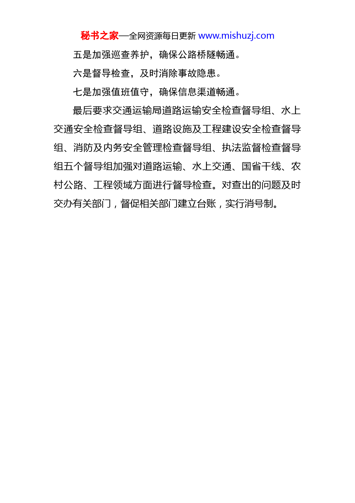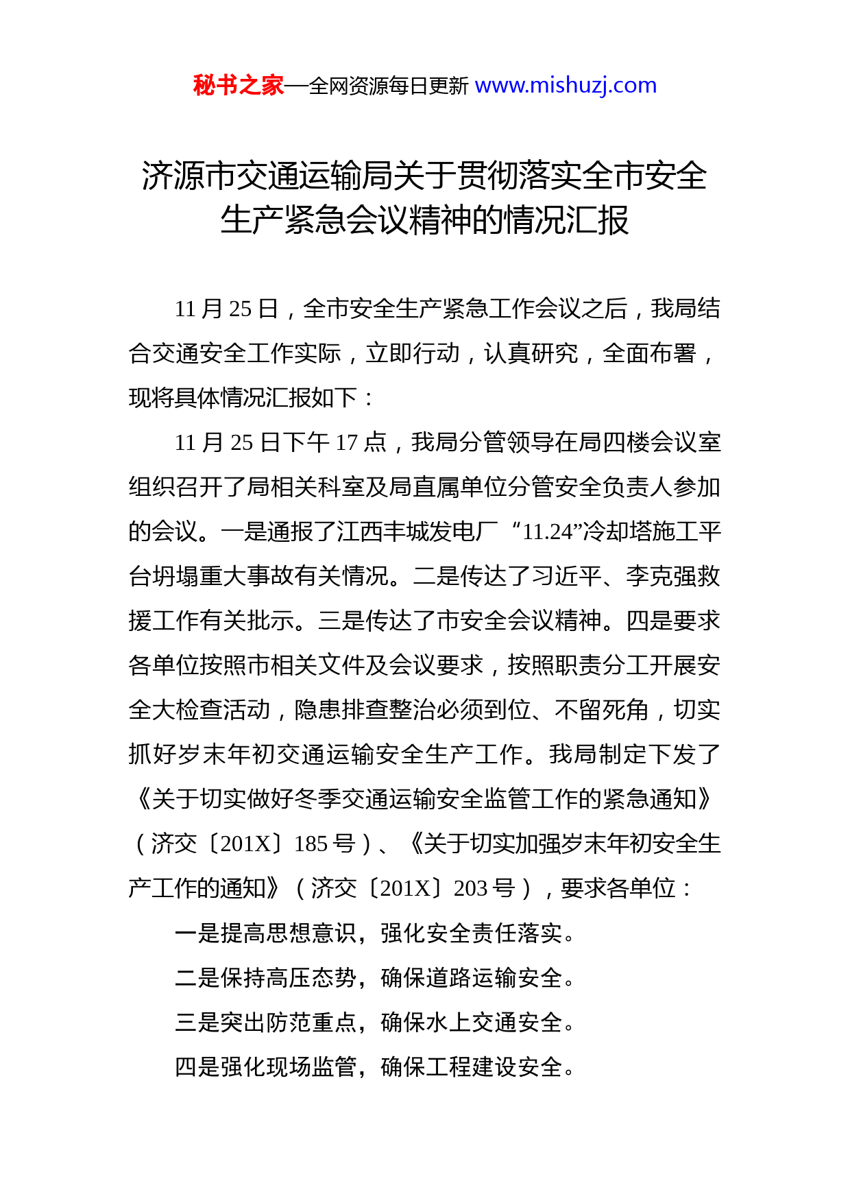 秘书之家—全网资源每日更新www.mishuzj.com济源市交通运输局关于贯彻落实全市安全生产紧急会议精神的情况汇报11月25日,全市安全生产紧急工作会议之后,我局结合交通安全工作实际,立即行动,认真研究,全面布署,现将具体情况汇报如下:11月25日下午17点,我局分管领导在局四楼会议室组织召开了局相关科室及局直属单位分管安全负责人参加的会议。一是通报了江西丰城发电厂“11.24”冷却塔施工平台坍塌重大事故有关情况。二是传达了习近平、李克强救援工作有关批示。三是传达了市安全会议精神。四是要求各单位按照市相关文件及会议要求,按照职责分工开展安全大检查活动,隐患排查整治必须到位、不留死角,切实抓好岁末年初交通运输安全生产工作。我局制定下发了《关于切实做好冬季交通运输安全监管工作的紧急通知》(济交〔201X〕185号)、《关于切实加强岁末年初安全生产工作的通知》(济交〔201X〕203号),要求各单位:一是提高思想意识,强化安全责任落实。二是保持高压态势,确保道路运输安全。三是突出防范重点,确保水上交通安全。四是强化现场监管,确保工程建设安全。秘书之家—全网资源每日更新www.mishuzj.com五是加强巡查养护,确保公路桥隧畅通。六是督导检查,及时消除事故隐患。七是加强值班值守,确保信息渠道畅通。最后要求交通运输局道路运输安全检查督导组、水上交通安全检查督导组、道路设施及工程建设安全检查督导组、消防及内务安全管理检查督导组、执法监督检查督导组五个督导组加强对道路运输、水上交通、国省干线、农村公路、工程领域方面进行督导检查。对查出的问题及时交办有关部门,督促相关部门建立台账,实行消号制。
