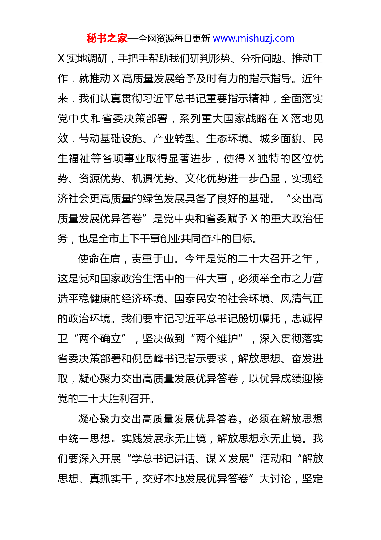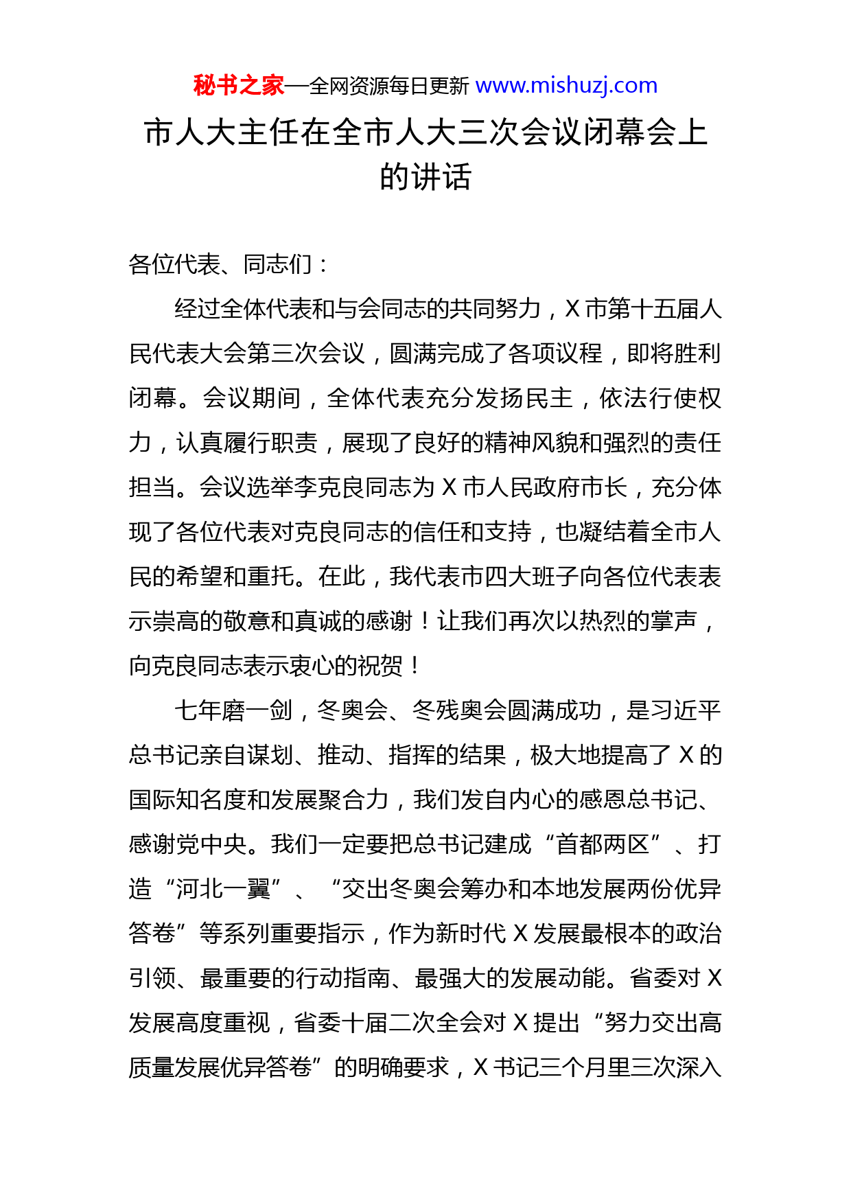 秘书之家—全网资源每日更新www.mishuzj.com市人大主任在全市人大三次会议闭幕会上的讲话各位代表、同志们:经过全体代表和与会同志的共同努力,X市第十五届人民代表大会第三次会议,圆满完成了各项议程,即将胜利闭幕。会议期间,全体代表充分发扬民主,依法行使权力,认真履行职责,展现了良好的精神风貌和强烈的责任担当。会议选举李克良同志为X市人民政府市长,充分体现了各位代表对克良同志的信任和支持,也凝结着全市人民的希望和重托。在此,我代表市四大班子向各位代表表示崇高的敬意和真诚的感谢!让我们再次以热烈的掌声,向克良同志表示衷心的祝贺!七年磨一剑,冬奥会、冬残奥会圆满成功,是习近平总书记亲自谋划、推动、指挥的结果,极大地提高了X的国际知名度和发展聚合力,我们发自内心的感恩总书记、感谢党中央。我们一定要把总书记建成“首都两区”、打造“河北一翼”、“交出冬奥会筹办和本地发展两份优异答卷”等系列重要指示,作为新时代X发展最根本的政治引领、最重要的行动指南、最强大的发展动能。省委对X发展高度重视,省委十届二次全会对X提出“努力交出高质量发展优异答卷”的明确要求,X书记三个月里三次深入秘书之家—全网资源每日更新www.mishuzj.comX实地调研,手把手帮助我们研判形势、分析问题、推动工作,就推动X高质量发展给予及时有力的指示指导。近年来,我们认真贯彻习近平总书记重要指示精神,全面落实党中央和省委决策部署,系列重大国家战略在X落地见效,带动基础设施、产业转型、生态环境、城乡面貌、民生福祉等各项事业取得显著进步,使得X独特的区位优势、资源优势、机遇优势、文化优势进一步凸显,实现经济社会更高质量的绿色发展具备了良好的基础。“交出高质量发展优异答卷”是党中央和省委赋予X的重大政治任务,也是全市上下干事创业共同奋斗的目标。使命在肩,责重于山。今年是党的二十大召开之年,这是党和国家政治生活中的一件大事,必须举全市之力营造平稳健康的经济环境、国泰民安的社会环境、风清气正的政治环境。我们要牢记习近平总书记殷切嘱托,忠诚捍卫“两个确立”,坚决做到“两个维护”,深入贯彻落实省委决策部署和倪岳峰书记指示要求,解放思想、奋发进取,凝心聚力交出高质量发展优异答卷,以优异成绩迎接党的二十大胜利召开。凝心聚力交出高质量发展优异答卷,必须在解放思想中统一思想。实践发展永无止境,解放思想永无止境。我们要深入开展“学总书记讲话、谋X发展”活动和“解放思想、真抓实干,交好本地发展优异答卷”大讨论,坚定秘书之家—全网资源每日更新www.mishuzj.com自觉地把思想和行动统一到习近平总书记重要指示精神和党中央决策、省委部署上来,准确把握新的历史方位下X面临的形势任务、存在的差距短板、发展的思路方向,确保各项事业始终沿着正确的方向前进。要加强学习研究。把勤于学习、善于思考作为习惯,向习近平总书记学习,向书本学习,向实践学习,向人民学习,深化形势和任务把握,吃透政策、摸准下情、精通业务,不断提高干事创业的能力和水平。要树立问题导向。坚持跟着问题走、奔着问题去、盯着问题抓,切实把自己摆进去、把工作摆进去、把职责摆进去,善于发现问题,深入分析问题,真刀真枪解决问题,求甚解、钉钉子,不断补齐短板弱项、提升发展质效。要狠抓执行落地。坚持以“四个清单”(任务清单、措施清单、责任清单、时限清单)为抓手,把各项工作具体化、项目化、责任化、时限化,强化末梢管理,打通“最后一米”,敢于较真碰硬,确保习近平总书记重要指示精神和党中央、省委、市委决策部署不折不扣落到实处、见到实效。凝心聚力交出高质量发展优异答卷,必须在笃定发展中争先进位。发展是第一要务,发展速度不快、质量不高、不够充分是X的基本市情。交出高质量发展优异答卷,必须紧紧扭住第一要务不放松,保持“人一我十、人十我百”的奋进姿态,撸起袖子加油干,奋力填写成绩秘书之家—全网资源每日更新www.mishuzj.com单。要稳住经济基本盘。全面落实国家、省、市稳经济一揽子政策措施,深入排查化解企业运行、保产业链供应链等领域风险和问题,全力帮助市场主体渡过难关,用足用好地方政府专项债券资金,扩大有效投资,深挖消费潜力,确保经济平稳健康发展。要跑出发展加速度。强攻项目、狠抓招商,做大产业、做强园区,推动后奥运经济发展、“首都两区”建设、京张体育文化旅游带建设、可再生能源示范区建设等国家战略落地见效,力争经济总量在全省占比逐步提高、主要指标增速保持全省前列。要增强核心竞争力。落实“迈开两条腿、对接各部委”要求,积极承接央企总部二三级机构,大力引进优质项目,加快培育一批本土高新技术企业,全力汇聚“高精尖缺”战略科技人才,持续注入发展动能。要创优服务软环境。坚决铲除官本位,坚决查处不作为、慢作为、乱作为,坚决破除束缚市场主体活力的体制机制弊端,推动行政审批权力“能放尽放”、流程“能优则优”、效率“能快则快”,着力打造市场化、国际化、法治化营商环境,让一切创造源泉充分涌流。凝心聚力交出高质量发展优异答卷,必须在保障民生中造福人民。千头万绪的事,说到底是千家万户的事。要坚持