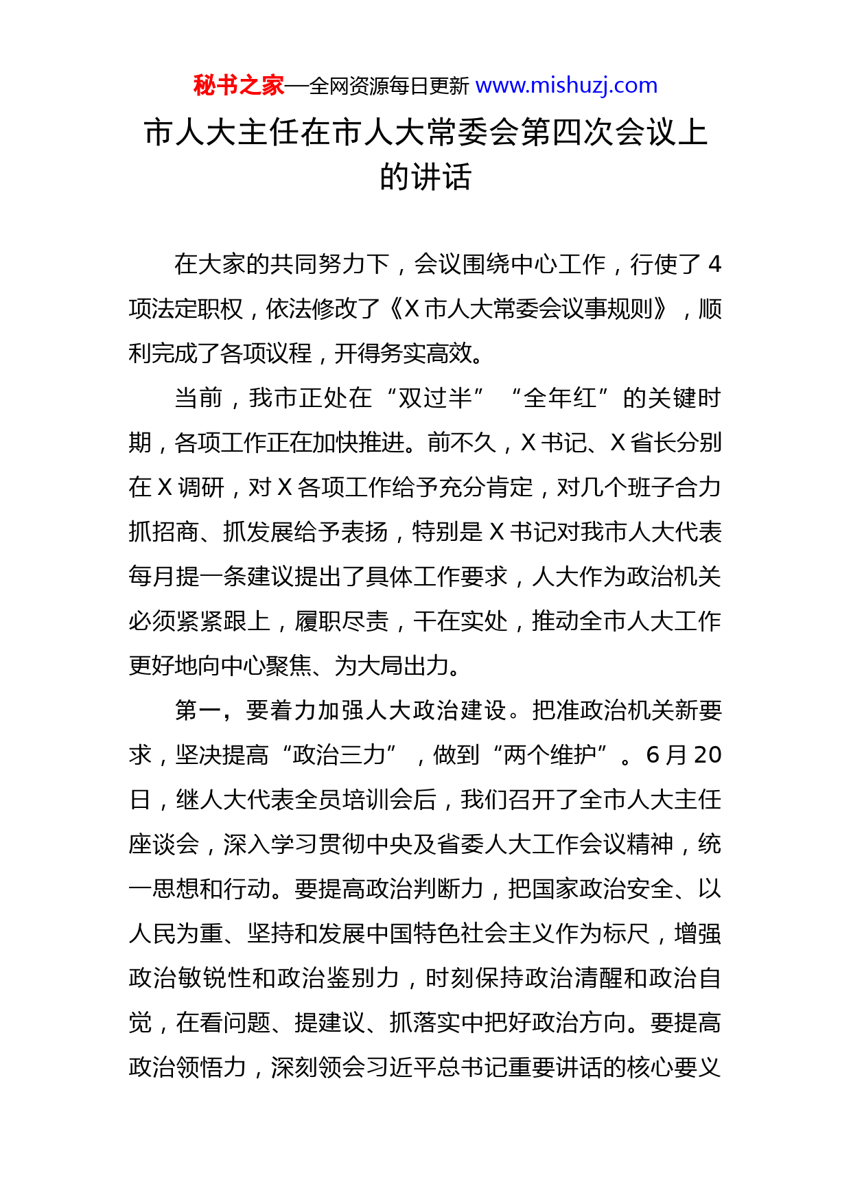 秘书之家—全网资源每日更新www.mishuzj.com市人大主任在市人大常委会第四次会议上的讲话在大家的共同努力下,会议围绕中心工作,行使了4项法定职权,依法修改了《X市人大常委会议事规则》,顺利完成了各项议程,开得务实高效。当前,我市正处在“双过半”“全年红”的关键时期,各项工作正在加快推进。前不久,X书记、X省长分别在X调研,对X各项工作给予充分肯定,对几个班子合力抓招商、抓发展给予表扬,特别是X书记对我市人大代表每月提一条建议提出了具体工作要求,人大作为政治机关必须紧紧跟上,履职尽责,干在实处,推动全市人大工作更好地向中心聚焦、为大局出力。第一,要着力加强人大政治建设。把准政治机关新要求,坚决提高“政治三力”,做到“两个维护”。6月20日,继人大代表全员培训会后,我们召开了全市人大主任座谈会,深入学习贯彻中央及省委人大工作会议精神,统一思想和行动。要提高政治判断力,把国家政治安全、以人民为重、坚持和发展中国特色社会主义作为标尺,增强政治敏锐性和政治鉴别力,时刻保持政治清醒和政治自觉,在看问题、提建议、抓落实中把好政治方向。要提高政治领悟力,深刻领会习近平总书记重要讲话的核心要义秘书之家—全网资源每日更新www.mishuzj.com和实践要求,把贯彻中央及省委人大工作会议精神体现到谋划人大工作的实践中去。要提高政治执行力,自觉对标对表,做到中央要求的坚决执行、中央禁止的坚决不做,在落实市委工作部署上坚决不打折扣。本次会议修订的议事规则,是贯彻中央及省委人大工作会议精神的制度举措。大家要结合执行议事规则,用心学习,以实际行动践行人民代表大会制度,履职尽责,共同努力把政治机关建设得更加坚强有力。第二,要倾力全年“进”。坚持把“优环境、稳经济”作为人大的一项重要工作,办好半年经济形势分析会,“年中问进度”,为半年“稳”、全年“进”出实招。要落实点对点精准帮扶,贯彻中央“疫情要防住、经济要稳住、发展要安全”重大要求、省“优环境、稳经济”和我市“深入联企、深度助企”工作安排,实打实解决具体问题,推动稳经济各项措施落地落实,助力市场主体增活力。要突出分析研判,以疫情形势下的产业链视角,深入调查研究,努力寻求规律性、趋势性的发展新路径,力求提出有前瞻性、可操作的意见建议。要发挥“监督之力”,围绕“十四五”规划实施、长三角一体化发展、“双招双引”、优化营商环境等重点工作加强监督,在指标争先进位上、人才竞相入户上、招商项目不断结果上、发展要素持续充足上齐心协力,确保我市在新一轮竞秘书之家—全网资源每日更新www.mishuzj.com争中继续领先。第三,要持续推进污染防治攻坚战。本次会议专门邀请专家为大家辅导学习习近平生态文明思想,听取审议环境保护“一法一条例”执法检查情况的报告,首次审议市监委关于突出生态环境问题整治专项监督工作报告,用法治力量保障美丽X建设。市监委扛起专项监督责任,运用“四个一批”等方式传导压力,推动中央及省交办的问题解决率达96.5%。在城西水库、沙河集水库有关问题整改中,属地政府、职能部门等共同用力,解决了一批“老大难”问题,清除了106个“库中库”,拆迁力度之大、工作成效之明显前所未有,保护了滁城的“大水缸”,增进了群众的幸福感。下一步,要贯通人大监督与监察监督,探索建立联动机制。监司工委要认真总结首次听取和审议监委专项工作报告的经验,加强对县市区人大工作指导,推动县市区人大同步听取和审议同级监委专项工作报告。要增强监督实效性,对“一法一条例”监督建议办理情况进行梳理,适时对审议意见“回头看”,加强对部门“问结果”,确保督察整改要求、监督发现问题和群众反映突出的问题进一步得到有效解决。第四,要扎实开展暖民心行动。省委X书记在暖民心行动部署会上要求各级人大要及时反映社情民意,加大监督推进力度,真正把好事实事做到群众心坎上。我们要坚秘书之家—全网资源每日更新www.mishuzj.com决落实,组织好代表集中走访调研、反映社情民意,完善收集、交办、反馈闭环工作机制,要动员各级人大协调相关部门做到快交快办、办好办实,确保“惠民生”有数量、有质量,把为民办实事落到实处、推动矛盾化解在基层。在座各位常委会组成人员要带头,一定要起到榜样作用。各工委要把暖民心行动融入到“五位”监督中,找准切入点、着力点,奔着问题去,干一件成一件,要做出经得起代表和群众检验的成果成效。第五,要聚力打好乡村振兴组合拳。要把准乡村旅游促进立法的价值导向,以“小切口”解决“大问题”。要抓好《关于推进机械强农助力乡村振兴的决定》贯彻实施,推动政府及部门完善规划,完善可预期、可量化、可支撑的目标体系,力推我市农业机械化与智能信息技术、农田“宜机化”建设相融合,做大做强农业机械化产业链,助力我市“两强一增”行动走在全省前列。乡村振兴主题活动要推深做实,切实把“同心合力”转化为发展动力,形成更多实物工作量。近期我们将在94个乡镇同一主题、同一时间、同步启动“万名人大代表集中履职”活动,推动乡镇党委宣讲乡村振兴的政策要求,督促政府宣布乡村振兴的目标任务,组织代表开展“田头问需”“入户问计”