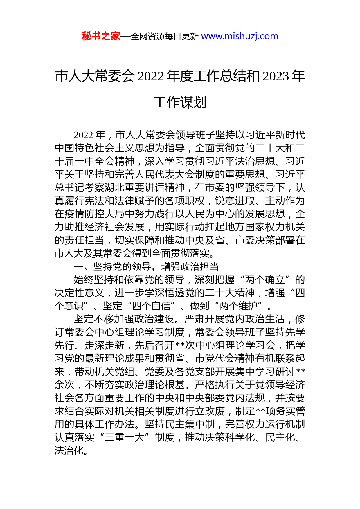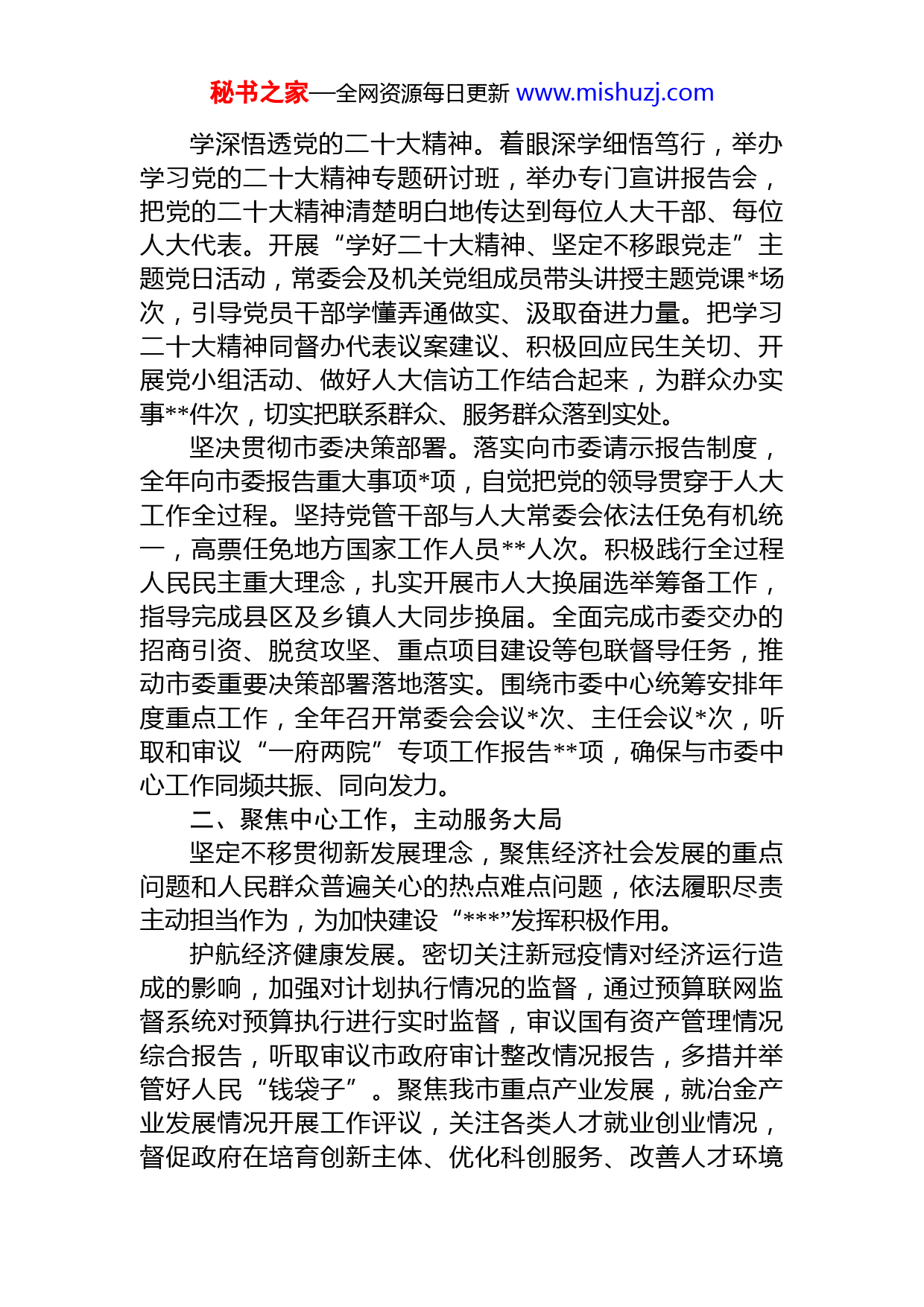 秘书之家—全网资源每日更新www.mishuzj.com市人大常委会2022年度工作总结和2023年工作谋划2022年,市人大常委会领导班子坚持以习近平新时代中国特色社会主义思想为指导,全面贯彻党的二十大和二十届一中全会精神,深入学习贯彻习近平法治思想、习近平关于坚持和完善人民代表大会制度的重要思想、习近平总书记考察湖北重要讲话精神,在市委的坚强领导下,认真履行宪法和法律赋予的各项职权,锐意进取、主动作为在疫情防控大局中努力践行以人民为中心的发展思想,全力助推经济社会发展,用实际行动扛起地方国家权力机关的责任担当,切实保障和推动中央及省、市委决策部署在市人大及其常委会得到全面贯彻落实。一、坚持党的领导,增强政治担当始终坚持和依靠党的领导,深刻把握“两个确立”的决定性意义,进一步学深悟透党的二十大精神,增强“四个意识”、坚定“四个自信”、做到“两个维护”。坚定不移加强政治建设。严肃开展党内政治生活,修订常委会中心组理论学习制度,常委会领导班子坚持先学先行、走深走新,先后召开次中心组理论学习会,把学习党的最新理论成果和贯彻省、市党代会精神有机联系起来,带动机关党组、党委及各党支部开展集中学习研讨余次,不断夯实政治理论根基。严格执行关于党领导经济社会各方面重要工作的中央和中央部委党内法规,并按要求结合实际对机关相关制度进行立改废,制定项务实管用的具体工作办法。坚持民主集中制,完善权力运行机制认真落实“三重一大”制度,推动决策科学化、民主化、法治化。秘书之家—全网资源每日更新www.mishuzj.com学深悟透党的二十大精神。着眼深学细悟笃行,举办学习党的二十大精神专题研讨班,举办专门宣讲报告会,把党的二十大精神清楚明白地传达到每位人大干部、每位人大代表。开展“学好二十大精神、坚定不移跟党走”主题党日活动,常委会及机关党组成员带头讲授主题党课场次,引导党员干部学懂弄通做实、汲取奋进力量。把学习二十大精神同督办代表议案建议、积极回应民生关切、开展党小组活动、做好人大信访工作结合起来,为群众办实事件次,切实把联系群众、服务群众落到实处。坚决贯彻市委决策部署。落实向市委请示报告制度,全年向市委报告重大事项项,自觉把党的领导贯穿于人大工作全过程。坚持党管干部与人大常委会依法任免有机统一,高票任免地方国家工作人员人次。积极践行全过程人民民主重大理念,扎实开展市人大换届选举筹备工作,指导完成县区及乡镇人大同步换届。全面完成市委交办的招商引资、脱贫攻坚、重点项目建设等包联督导任务,推动市委重要决策部署落地落实。围绕市委中心统筹安排年度重点工作,全年召开常委会会议次、主任会议次,听取和审议“一府两院”专项工作报告项,确保与市委中心工作同频共振、同向发力。二、聚焦中心工作,主动服务大局坚定不移贯彻新发展理念,聚焦经济社会发展的重点问题和人民群众普遍关心的热点难点问题,依法履职尽责主动担当作为,为加快建设“”发挥积极作用。护航经济健康发展。密切关注新冠疫情对经济运行造成的影响,加强对计划执行情况的监督,通过预算联网监督系统对预算执行进行实时监督,审议国有资产管理情况综合报告,听取审议市政府审计整改情况报告,多措并举管好人民“钱袋子”。聚焦我市重点产业发展,就冶金产业发展情况开展工作评议,关注各类人才就业创业情况,督促政府在培育创新主体、优化科创服务、改善人才环境秘书之家—全网资源每日更新www.mishuzj.com推动惠企政策落地上精准发力。支持推动工业园区提档升级,听取审议工业园区建设情况报告,深入全市个开发区开展调研,围绕完善配套、土地指标、政策落地、借力发展、环境优化等五个方面提出审议意见,助力破解要素制约。调研政府性融资担保体系建设工作,提出深化新型政银担合作等建议,着力化解中小微企业和“三农”主体融资难、融资贵问题;调研电子商务发展情况,促进政府优化政务服务,加速释放惠企政策效应。持续增进民生福祉。专题询问水资源管理工作,大力支持水利工程建设与利用,督促关闭自备井、加快筹建地表水厂,推动水资源可持续利用。紧盯“双减”工作开展课后服务视察检查,督促相关部门标本兼治、系统治理,推动落实相关政策。听取审议黑臭水体治理工作情况报告开展固体废物污染环境防治法执法调研,回应人民群众对优美生态环境新期待。结合审议养老服务业发展情况报告推动实施适老化改造工程,促进老龄事业和产业协同发展推进巩固拓展脱贫攻坚成果同乡村振兴有效衔接,督促落实防范返贫监测预警和动态帮扶机制,审议乡村产业振兴情况报告,推动乡村产业兴旺、农民持续增收。通过12345市长热线等平台广泛收集群众意见,适时开展既有住宅加装电梯、老旧小区改造、关爱残疾人等工作监督,做到民有所呼、我有所应。大力推进依法治市。落实年度立法计划,突出以“小切口”立法解决实际问题,制定出台非机动车管理条例,建筑装饰装修管理条例,以法治方式助力城市精细化管理强化对法律实施的监督,在安全生产法执法检查中,组织十余位安全生产领域专家和相关专业市人大代表开展指定检查、随机暗访,交办项整改任务,法律监督实效不