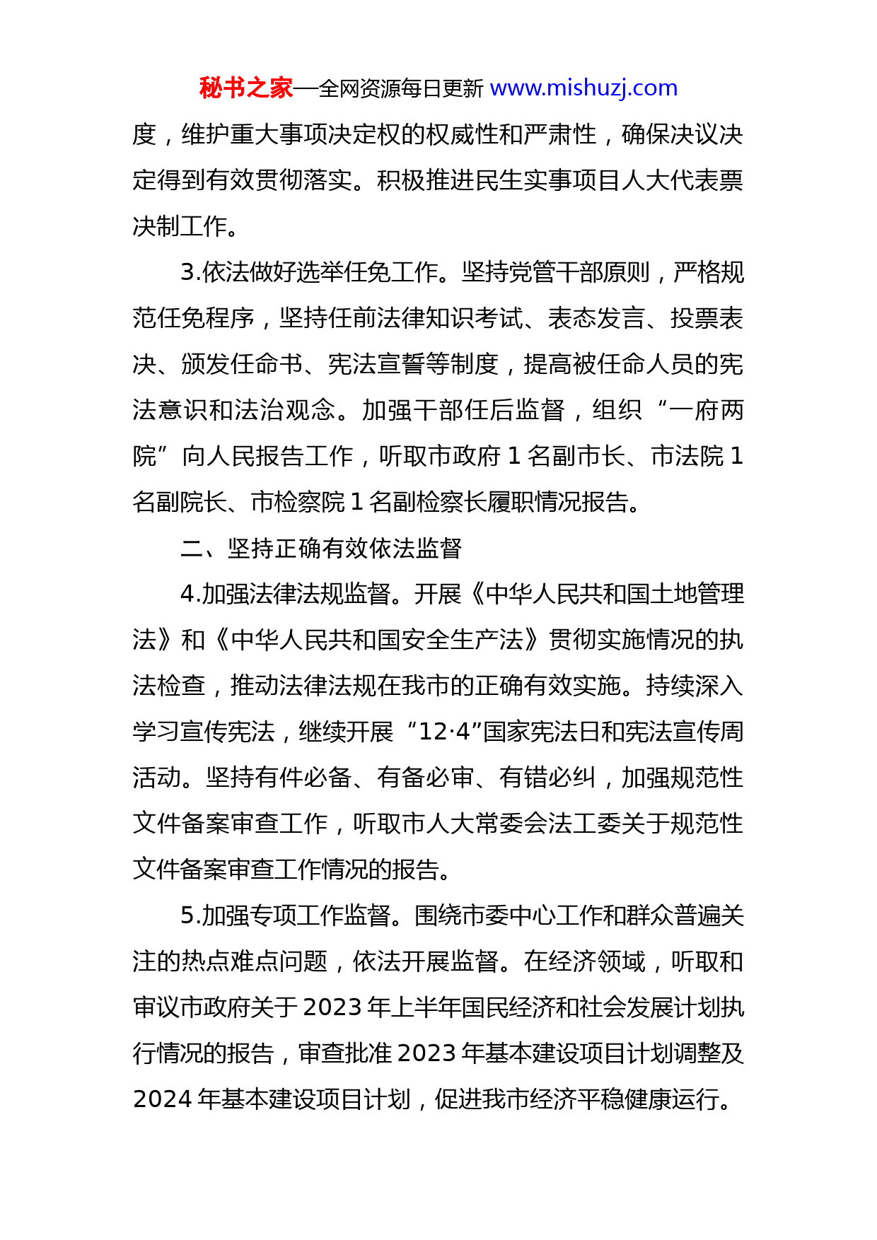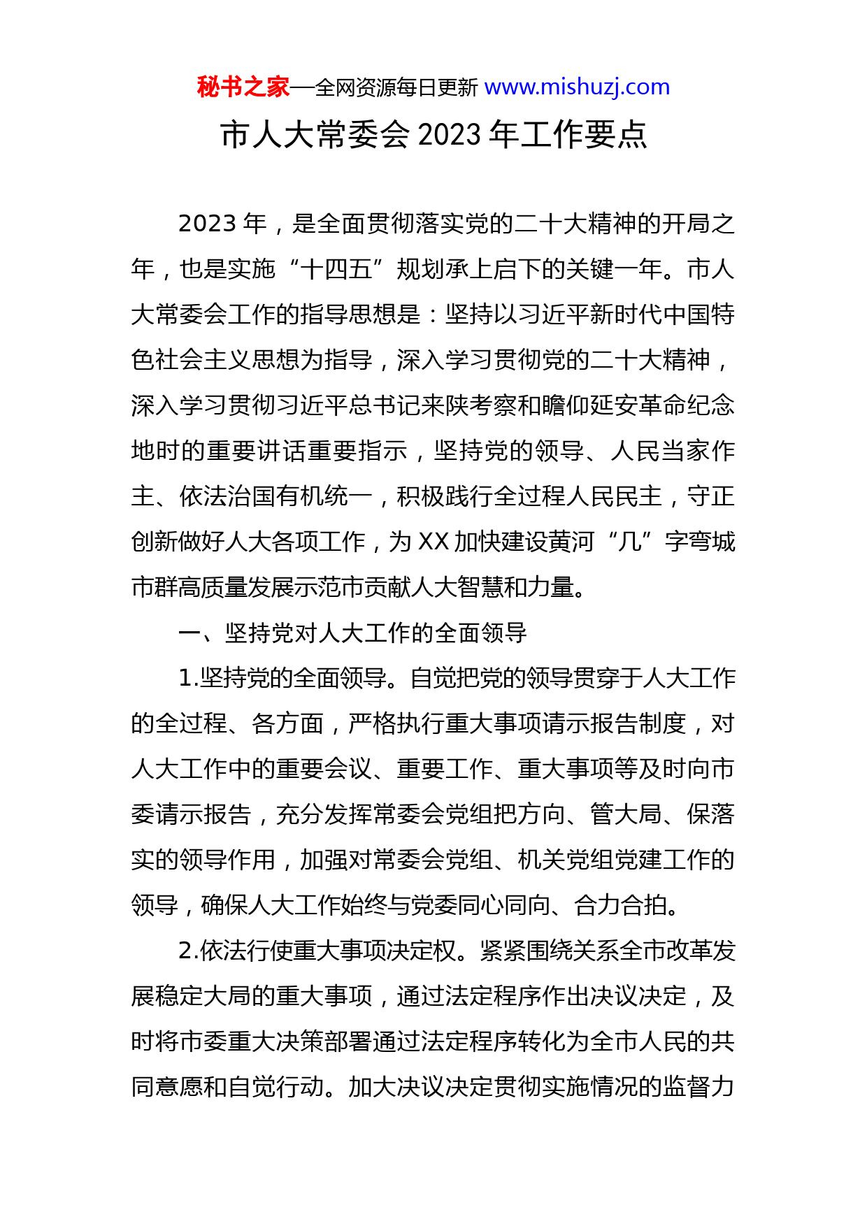 秘书之家—全网资源每日更新www.mishuzj.com市人大常委会2023年工作要点2023年,是全面贯彻落实党的二十大精神的开局之年,也是实施“十四五”规划承上启下的关键一年。市人大常委会工作的指导思想是:坚持以习近平新时代中国特色社会主义思想为指导,深入学习贯彻党的二十大精神,深入学习贯彻习近平总书记来陕考察和瞻仰延安革命纪念地时的重要讲话重要指示,坚持党的领导、人民当家作主、依法治国有机统一,积极践行全过程人民民主,守正创新做好人大各项工作,为XX加快建设黄河“几”字弯城市群高质量发展示范市贡献人大智慧和力量。一、坚持党对人大工作的全面领导1.坚持党的全面领导。自觉把党的领导贯穿于人大工作的全过程、各方面,严格执行重大事项请示报告制度,对人大工作中的重要会议、重要工作、重大事项等及时向市委请示报告,充分发挥常委会党组把方向、管大局、保落实的领导作用,加强对常委会党组、机关党组党建工作的领导,确保人大工作始终与党委同心同向、合力合拍。2.依法行使重大事项决定权。紧紧围绕关系全市改革发展稳定大局的重大事项,通过法定程序作出决议决定,及时将市委重大决策部署通过法定程序转化为全市人民的共同意愿和自觉行动。加大决议决定贯彻实施情况的监督力秘书之家—全网资源每日更新www.mishuzj.com度,维护重大事项决定权的权威性和严肃性,确保决议决定得到有效贯彻落实。积极推进民生实事项目人大代表票决制工作。3.依法做好选举任免工作。坚持党管干部原则,严格规范任免程序,坚持任前法律知识考试、表态发言、投票表决、颁发任命书、宪法宣誓等制度,提高被任命人员的宪法意识和法治观念。加强干部任后监督,组织“一府两院”向人民报告工作,听取市政府1名副市长、市法院1名副院长、市检察院1名副检察长履职情况报告。二、坚持正确有效依法监督4.加强法律法规监督。开展《中华人民共和国土地管理法》和《中华人民共和国安全生产法》贯彻实施情况的执法检查,推动法律法规在我市的正确有效实施。持续深入学习宣传宪法,继续开展“12·4”国家宪法日和宪法宣传周活动。坚持有件必备、有备必审、有错必纠,加强规范性文件备案审查工作,听取市人大常委会法工委关于规范性文件备案审查工作情况的报告。5.加强专项工作监督。围绕市委中心工作和群众普遍关注的热点难点问题,依法开展监督。在经济领域,听取和审议市政府关于2023年上半年国民经济和社会发展计划执行情况的报告,审查批准2023年基本建设项目计划调整及2024年基本建设项目计划,促进我市经济平稳健康运行。秘书之家—全网资源每日更新www.mishuzj.com在民生领域,听取和审议市政府关于全市学前教育事业、农业产业化发展情况的报告,提升人民群众对美好生活的幸福感、获得感。在环保领域,听取和审议2023年全市环境状况和环境保护目标完成情况的报告,推进全市生态建设及环境保护工作。在司法领域,听取和审议全市社区矫正工作,继续听取和审议市监委专项工作报告,确保司法机关公正司法、监察机关依法履职。6.加强预决算审查监督。充分发挥预算联网监督平台作用,听取和审议市政府关于2023年上半年财政预算执行情况、关于2022年财政收支预算执行及其他财政收支情况的审计工作报告,审查批准2022年财政决算、2023年财政收支预算及预算调整,促进市政府及有关部门全面落实积极财政政策,提高财政资金使用绩效和政策落实效果。7.加强审议意见跟踪督办。对市政府贯彻落实《乡村振兴促进法》执法检查报告审议意见、医保工作审议意见和2021年审计查出问题整改落实情况进行追踪问效,并开展满意度测评,增强监督工作的针对性和实效性。8.加强专题调研视察。对全市全域旅游、湿地保护建设、国资国企管理和改革发展、矿区生态修复治理、未成年人司法保护和预防未成年人犯罪等工作情况开展专题调研,形成调研成果,为市委市政府做好相关工作提供有益借鉴。组织好2023年重点项目建设集中视察,促进重点项秘书之家—全网资源每日更新www.mishuzj.com目建设,助推经济社会发展。积极配合好全国人大和陕西省、榆林市人大来神开展的调研、视察、执法检查等工作。9.加强和改进人大信访工作。坚持将人大信访工作作为密切联系群众和监督“一府一委两院”的重要载体,完善信访工作机制,及时转办督办群众反映的信访事项,确保依法行政,维护人民群众合法权益。三、更好发挥代表主体作用10.提升代表依法履职能力。抓好人大代表履职学习培训,举办市镇人大代表培训会,做好代表外出学习培训工作,提升代表履职能力。继续坚持公民旁听、代表列席常委会会议制度,邀请代表参加常委会组织的视察调研、执法检查、专题询问等监督活动,适时安排代表观摩市法院重大案件庭审情况,使代表的履职能力在实践中不断提升。11.提升代表履职服务水平。畅通代表知情知政渠道,继续为代表订阅《法治与社会》《民声报》等报刊,及时寄送《XX人大》杂志,通报常委会工作情况,积极宣传展示人大代表履职风采,讲好代表履职故事,营造代表工作良好氛围。主动关心代表的工作和生活,落实代表活动经费,保障代表依法执行代表职务。做好在神的陕西省、榆林市人大代表联络服务等保障工