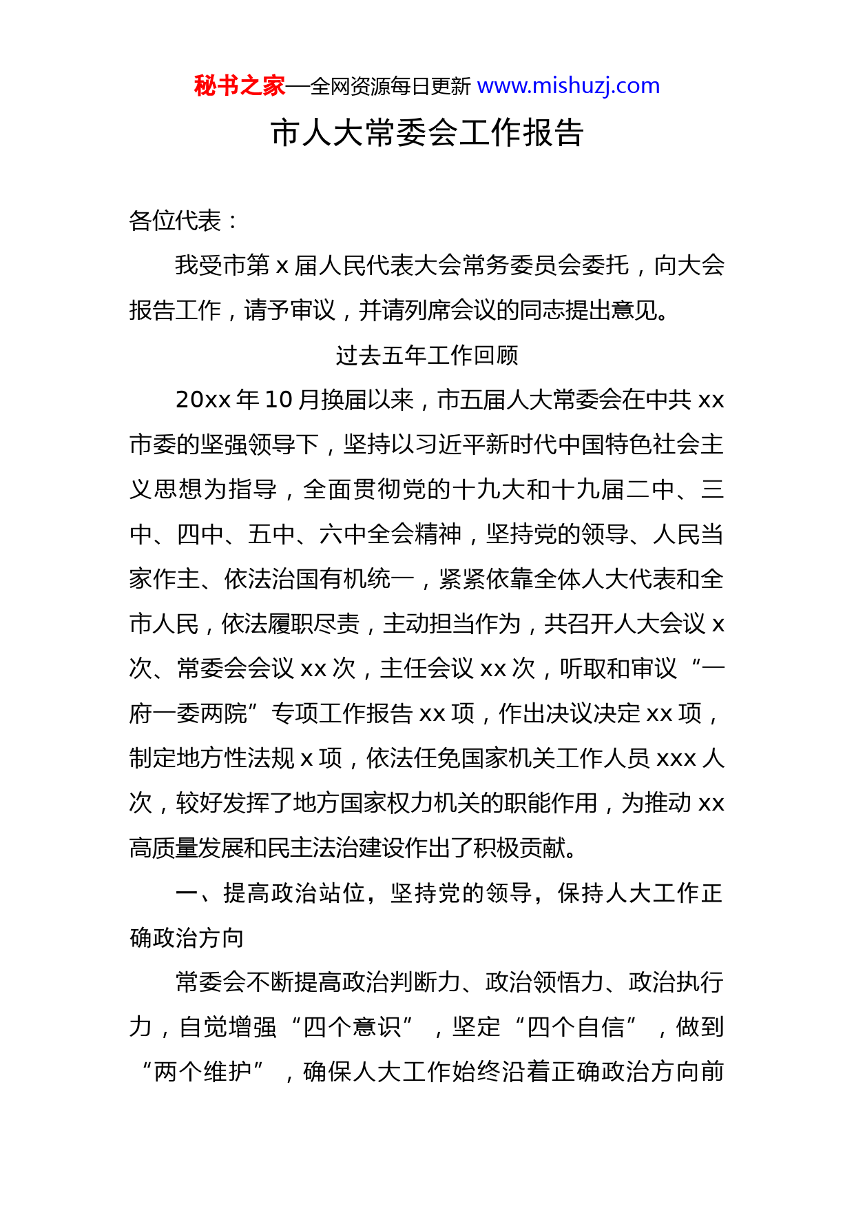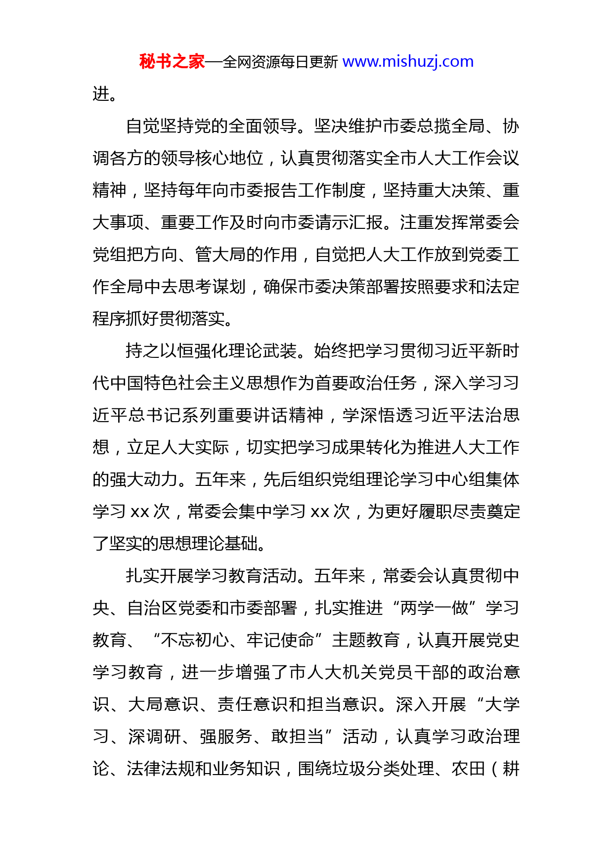 秘书之家—全网资源每日更新www.mishuzj.com市人大常委会工作报告各位代表:我受市第x届人民代表大会常务委员会委托,向大会报告工作,请予审议,并请列席会议的同志提出意见。过去五年工作回顾20xx年10月换届以来,市五届人大常委会在中共xx市委的坚强领导下,坚持以习近平新时代中国特色社会主义思想为指导,全面贯彻党的十九大和十九届二中、三中、四中、五中、六中全会精神,坚持党的领导、人民当家作主、依法治国有机统一,紧紧依靠全体人大代表和全市人民,依法履职尽责,主动担当作为,共召开人大会议x次、常委会会议xx次,主任会议xx次,听取和审议“一府一委两院”专项工作报告xx项,作出决议决定xx项,制定地方性法规x项,依法任免国家机关工作人员xxx人次,较好发挥了地方国家权力机关的职能作用,为推动xx高质量发展和民主法治建设作出了积极贡献。一、提高政治站位,坚持党的领导,保持人大工作正确政治方向常委会不断提高政治判断力、政治领悟力、政治执行力,自觉增强“四个意识”,坚定“四个自信”,做到“两个维护”,确保人大工作始终沿着正确政治方向前秘书之家—全网资源每日更新www.mishuzj.com进。自觉坚持党的全面领导。坚决维护市委总揽全局、协调各方的领导核心地位,认真贯彻落实全市人大工作会议精神,坚持每年向市委报告工作制度,坚持重大决策、重大事项、重要工作及时向市委请示汇报。注重发挥常委会党组把方向、管大局的作用,自觉把人大工作放到党委工作全局中去思考谋划,确保市委决策部署按照要求和法定程序抓好贯彻落实。持之以恒强化理论武装。始终把学习贯彻习近平新时代中国特色社会主义思想作为首要政治任务,深入学习习近平总书记系列重要讲话精神,学深悟透习近平法治思想,立足人大实际,切实把学习成果转化为推进人大工作的强大动力。五年来,先后组织党组理论学习中心组集体学习xx次,常委会集中学习xx次,为更好履职尽责奠定了坚实的思想理论基础。扎实开展学习教育活动。五年来,常委会认真贯彻中央、自治区党委和市委部署,扎实推进“两学一做”学习教育、“不忘初心、牢记使命”主题教育,认真开展党史学习教育,进一步增强了市人大机关党员干部的政治意识、大局意识、责任意识和担当意识。深入开展“大学习、深调研、强服务、敢担当”活动,认真学习政治理论、法律法规和业务知识,围绕垃圾分类处理、农田(耕秘书之家—全网资源每日更新www.mishuzj.com地)保护与粮食安全生产、农村最低生活保障、非遗保护、推动侨商回归等主题,深入调研,形成一批高质量的调研报告,为市委提供了有益的决策参考。二、发挥主导作用,推动地方立法,促进民主法治建设常委会重视发挥立法在经济社会发展中的引领和推动作用,坚持科学立法、民主立法、依法立法,以良法促发展、保善治。完善立法工作机制。坚持党对立法工作的领导,科学编制五年立法规划和年度立法计划,及时提请市委研究批准。搭建立法理论研究与实践创新平台,与xx师范学院合作建立立法研究评估与咨询服务基地,在全市设立xx个基层立法联系点,组建地方立法专家顾问库,聘请xx名立法专家顾问,制定出台《xx市人大常委会立法研究评估与咨询服务基地工作规定》等制度,为开门立法、民主立法、科学立法夯实了基础。坚持每年举办一期立法业务培训班,提高全市立法队伍的业务能力。制定《xx市人大常委会规范性文件备案审查制度》,对xx件规范性文件进行备案审查,切实维护国家法制统一。扎实推进立法工作。坚持“小切口、有特色、真管用”原则,扎实推进立法工作。重点加强生态环境保护立法,制定出台了《xx市xx江流域水质保护条例》《xx市秘书之家—全网资源每日更新www.mishuzj.comxx江流域水环境保护条例》《xx市禁止生产销售使用含磷洗涤用品条例》《xx市苏烟水库饮用水水源保护条例》《xx市销售燃放烟花爆竹管理条例》等x部地方性法规,用心用力用法守护一方碧水蓝天。同时,围绕城市建设管理、历史文化保护,制定出台《xx市城市市容和环境卫生管理条例》《xx市传统村落保护条例》,以法的力量推动城市人居环境改善、保护和延续乡村文脉。此外,《xx市秸秆露天禁烧和综合利用条例》《xx市城市绿化条例》x部地方性法规已进行一审。我市立法工作成绩显著,得到自治区人大常委会充分肯定,先后x次在全区立法工作会议上作经验介绍。依法开展执法检查。充分发挥人大执法检查的“法律巡视”利剑作用,对群众关注的《食品安全法》《环境保护法》等xx部法律法规的贯彻实施情况进行执法检查。积极支持配合全国人大、自治区人大开展了《产品质量法》等xx部法律法规的执法检查,确保法律法规在本行政区域内得到正确有效实施。加强法治宣传教育。作出了《关于开展第七个五年法治宣传教育的决议》,并每年听取和审议市人民政府情况报告。开展“宪法宣传周”、宪法知识竞赛、宪法宣传专题文艺演出等活动,组织宪法宣誓仪式,增强全民宪法意识,积极营造尊法、学法、守法、用法的良好氛围。加强秘书之家—全网资源每日更新www.mishuzj.com地方性法规落地宣传,为正确实施法规营造良好的社会环境。三、围绕中心工作,服务发展大局,助推xx高质量发展五年来,常委会聚焦“六稳”“六保”