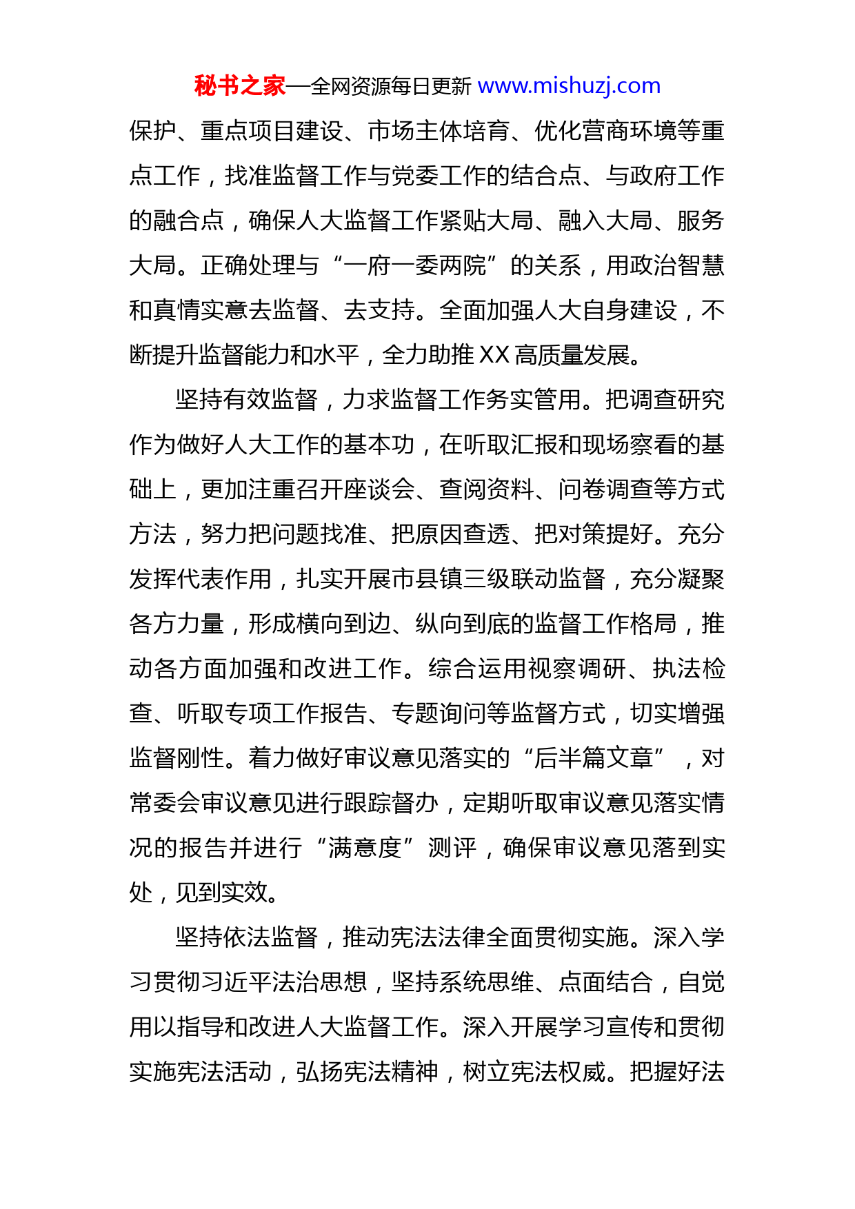 秘书之家—全网资源每日更新www.mishuzj.com市人大机关实施三个监督工作综述习近平总书记在中央人大工作会议上强调:“要用好宪法赋予人大的监督权,实行正确监督、有效监督、依法监督。各级人大及其常委会要聚焦党中央重大决策部署,聚焦人民群众所思所盼所愿,推动解决制约经济社会发展的突出矛盾和问题。要加强对法律法规实施情况的监督,完善人大监督制度。”这一科学论断,为我们做好新时代人大工作、推动人大工作高质量发展指明了方向,为我们做好人大监督工作提供了根本遵循。XX市人大常委会要深入学习中央人大工作会议精神,特别是习近平总书记重要讲话精神,扎实实施三个监督,着力推动人大工作守正创新。坚持正确监督,牢牢把握监督工作的原则和方向。认真学习贯彻习近平总书记关于坚持和完善人民代表大会制度的重要思想,进一步深化对“国之大者”的认识,切实增强“四个意识”,坚定“四个自信”,做到“两个维护”。坚持党的领导这一最高政治原则,认真落实重要会议、重大事项、重点工作向党委请示报告制度。主动接受党委领导,准确把握党委意,把对党负责和对人民负责有机结合起来,使党的主张通过法定程序成为人民意志。紧盯市委确定的“一都四区”目标定位,紧紧围绕生态环境秘书之家—全网资源每日更新www.mishuzj.com保护、重点项目建设、市场主体培育、优化营商环境等重点工作,找准监督工作与党委工作的结合点、与政府工作的融合点,确保人大监督工作紧贴大局、融入大局、服务大局。正确处理与“一府一委两院”的关系,用政治智慧和真情实意去监督、去支持。全面加强人大自身建设,不断提升监督能力和水平,全力助推XX高质量发展。坚持有效监督,力求监督工作务实管用。把调查研究作为做好人大工作的基本功,在听取汇报和现场察看的基础上,更加注重召开座谈会、查阅资料、问卷调查等方式方法,努力把问题找准、把原因查透、把对策提好。充分发挥代表作用,扎实开展市县镇三级联动监督,充分凝聚各方力量,形成横向到边、纵向到底的监督工作格局,推动各方面加强和改进工作。综合运用视察调研、执法检查、听取专项工作报告、专题询问等监督方式,切实增强监督刚性。着力做好审议意见落实的“后半篇文章”,对常委会审议意见进行跟踪督办,定期听取审议意见落实情况的报告并进行“满意度”测评,确保审议意见落到实处,见到实效。坚持依法监督,推动宪法法律全面贯彻实施。深入学习贯彻习近平法治思想,坚持系统思维、点面结合,自觉用以指导和改进人大监督工作。深入开展学习宣传和贯彻实施宪法活动,弘扬宪法精神,树立宪法权威。把握好法秘书之家—全网资源每日更新www.mishuzj.com律培训、组织实施、形成报告、会议审议、整改落实等重点环节,使执法检查工作更加规范。紧扣法律制度、法律规定,严格对照法律条文逐条落实法律责任。坚持问题导向,敢于指名道姓,以“执法检查报告+问题清单”形式及时反馈检查情况,推动问题解决落实。将行政执法工作情况监督作为常委会年度固定议题,努力实现法律监督从点到面的拓展,推动法律法规在XX市有效贯彻实施。