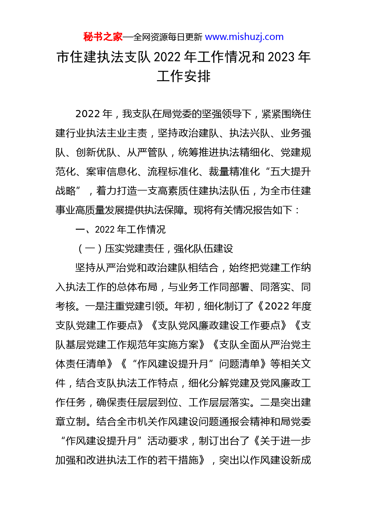 秘书之家—全网资源每日更新www.mishuzj.com市住建执法支队2022年工作情况和2023年工作安排2022年,我支队在局党委的坚强领导下,紧紧围绕住建行业执法主业主责,坚持政治建队、执法兴队、业务强队、创新优队、从严管队,统筹推进执法精细化、党建规范化、案审信息化、流程标准化、裁量精准化“五大提升战略”,着力打造一支高素质住建执法队伍,为全市住建事业高质量发展提供执法保障。现将有关情况报告如下:一、2022年工作情况(一)压实党建责任,强化队伍建设坚持从严治党和政治建队相结合,始终把党建工作纳入执法工作的总体布局,与业务工作同部署、同落实、同考核。一是注重党建引领。年初,细化制订了《2022年度支队党建工作要点》《支队党风廉政建设工作要点》《支队基层党建工作规范年实施方案》《支队全面从严治党主体责任清单》《“作风建设提升月”问题清单》等相关文件,结合支队执法工作特点,细化分解党建及党风廉政工作任务,确保责任层层到位、工作层层落实。二是突出建章立制。结合全市机关作风建设问题通报会精神和局党委“作风建设提升月”活动要求,制订出台了《关于进一步加强和改进执法工作的若干措施》,突出以作风建设新成秘书之家—全网资源每日更新www.mishuzj.com效提振干事创业热情,以更严标准净化执法环境,拓展丰富“住建执法、服务发展”党建品牌。三是丰富党内活动。今年以来,我支队召开专题党课X次、开展各类集中学习X批次,先后开展了“喜迎二十大阅·读颂辉煌”、“重温峥嵘岁月·弘扬廉政文化”510实境课堂教育活动、提升“住建执法服务发展”党建品牌动员暨夏季安康“三送”活动、“乐读书正品行”读书分享会等活动。(二)狠抓学习教育,提升履职能力坚持普法培训和依法行政相结合,深入推进执法队伍法治化、制度化和规范化建设。一是加强普法宣传。年初,制定了普法学习年度计划,把学习法规文件作为一项重要工作来抓,组织开展了一系列专题学习会议。围绕住建行业法律法规,开展了“依法提高行政水平,增强为民服务实效”行政执法普法月活动,通过开展送法进企业、进工地、进社区等现场宣传活动、行政执法培训、典型案例通报和新媒体宣传等方式,加强民众对住建行业法律法规理解,提升住建行政执法人员的法治素养和依法履职能力。二是规范执法程序。制订出台了《市住建局行政执法公示制度执法全过程记录制度重大执法决定法制审核制度》,对权力清单、执法主体、监管事项等进行动态管理。按照法律法规,梳理调整现有行政处罚工作程序、流程环节,形成我市住建系统执法文书示范文本,实现案件秘书之家—全网资源每日更新www.mishuzj.com办理全过程标准化。三是深入分析研判。印发首份《全市住房城乡建设行政执法年报》,对上年度行政执法工作进行总结通报,全面增强对行政处罚案件的大数据分析能力。扎实做好巡查整改,紧盯关键环节和潜在风险,定期组织廉情分析,重点排查廉政风险源,梳理修订了各项规章制度。(三)聚焦主责主业,保障执法实效坚持专项执法和监管联动相结合,全力构筑综合执法与业务检查常态化协作新模式。一是普及智慧执法。推广应用省住建执法平台并实现全市域全流程全覆盖,通过互联网+、执法大数据和信息赋能,助推“智慧执法”新模式,实现登记、初审受理、查办转办、催办督办、结案归档“全链条、一体化”办理,确保“办件都留痕、全程可回溯”。二是增强监管联动。先后牵头或协助局相关处室、单位开展各类执法检查7次,随机抽查在建工程XXX余个,出动执法人员XXX人次,排查安全隐患X处。共计处理上级部门交办、市12345平台转办、监管部门移转的投诉举报事项XX件,移转区级处理X件,累计立案查处违法案件XX件,收缴罚没款XXX余万元。三是提升工作效能。积极履职尽责,发挥执法“利剑”作用,围绕住建部门执法监督职责,联动全市住建行业安全生产百日攻坚行动,制订下发了《XX市住房城乡建设系统百日执法专项行秘书之家—全网资源每日更新www.mishuzj.com动方案》,重点围绕工程质量安全、消防设计审查验收等六方面工作内容持续加大专项执法力度,规范住建行业秩序。二、工作创新情况坚持系统思维和创新引领相结合,不断探索新形势下住建行政执法工作的新出路。一是深化课题研究。在全省住建系统率先启动《证据格式清单》课题研究,按照案件类型、性质、专业等特点分类梳理归集证据材料目录;报送的《行政执法机构和人员管理》项目入选省厅执法研究专项课题;巩固深化“执法主办人”制度成果,已申报省依法行政示范项目。二是转变执法理念。起草出台了《XX市住房和城乡建设局不予行政处罚事项清单》(第一批)和(第二批),对初创型企业和部分非主观过错导致的违法行为审慎监管、柔性执法,持续依法优化营商环境。推行行政处罚事前提醒、事中指导、事后回访制度,努力实现管理型执法向服务型执法转变。三、存在问题一年来,我支队工作取得了一些成绩,但与上级要求和群众期盼相比仍有一定差距。一是执法能力亟需提升。部分人员熟悉和掌握执法业务不够全面;对查处的复杂疑难案件研究不深,方法、措施不到位。二是平台应用亟需深化。执法平台虽然普及率比较高,但是活跃度较低,部秘书之家