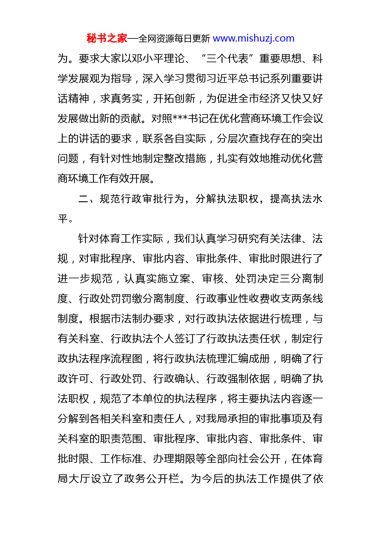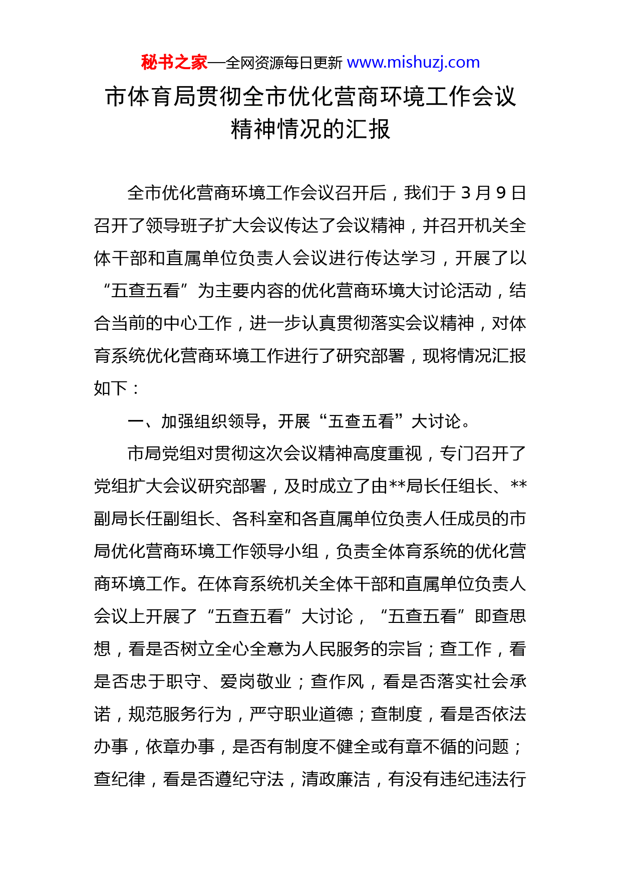 秘书之家—全网资源每日更新www.mishuzj.com市体育局贯彻全市优化营商环境工作会议精神情况的汇报全市优化营商环境工作会议召开后,我们于3月9日召开了领导班子扩大会议传达了会议精神,并召开机关全体干部和直属单位负责人会议进行传达学习,开展了以“五查五看”为主要内容的优化营商环境大讨论活动,结合当前的中心工作,进一步认真贯彻落实会议精神,对体育系统优化营商环境工作进行了研究部署,现将情况汇报如下:一、加强组织领导,开展“五查五看”大讨论。市局党组对贯彻这次会议精神高度重视,专门召开了党组扩大会议研究部署,及时成立了由局长任组长、副局长任副组长、各科室和各直属单位负责人任成员的市局优化营商环境工作领导小组,负责全体育系统的优化营商环境工作。在体育系统机关全体干部和直属单位负责人会议上开展了“五查五看”大讨论,“五查五看”即查思想,看是否树立全心全意为人民服务的宗旨;查工作,看是否忠于职守、爱岗敬业;查作风,看是否落实社会承诺,规范服务行为,严守职业道德;查制度,看是否依法办事,依章办事,是否有制度不健全或有章不循的问题;查纪律,看是否遵纪守法,清政廉洁,有没有违纪违法行秘书之家—全网资源每日更新www.mishuzj.com为。要求大家以邓小平理论、“三个代表”重要思想、科学发展观为指导,深入学习贯彻习近平总书记系列重要讲话精神,求真务实,开拓创新,为促进全市经济又快又好发展做出新的贡献。对照书记在优化营商环境工作会议上的讲话的要求,联系各自实际,分层次查找存在的突出问题,有针对性地制定整改措施,扎实有效地推动优化营商环境工作有效开展。二、规范行政审批行为,分解执法职权,提高执法水平。针对体育工作实际,我们认真学习研究有关法律、法规,对审批程序、审批内容、审批条件、审批时限进行了进一步规范,认真实施立案、审核、处罚决定三分离制度、行政处罚罚缴分离制度、行政事业性收费收支两条线制度。根据市法制办要求,对行政执法依据进行梳理,与有关科室、行政执法个人签订了行政执法责任状,制定行政执法程序流程图,将行政执法梳理汇编成册,明确了行政许可、行政处罚、行政确认、行政强制依据,明确了执法职权,规范了本单位的执法程序,将主要执法内容逐一分解到各相关科室和责任人,对我局承担的审批事项及有关科室的职责范围、审批程序、审批内容、审批条件、审批时限、工作标准、办理期限等全部向社会公开,在体育局大厅设立了政务公开栏。为今后的执法工作提供了依秘书之家—全网资源每日更新www.mishuzj.com据。为增强执法行为的准确性,我们还制定了《行政执法过错责任追究办法》、《行政执法评议考核办法》。三、完善制度、规范管理,提高服务水平。我们进一步完善了体育局工作规范,修订了《市局规章制度》,并开展“严真细实快”教作风大改进活动,让机关干部职工能随时对照检查规范自己的言行;全面推行首接责任制、一次告知制、限时办理制、AB角制度等,提高办事效率、优化服务水平,提高工作质量,积极赢得群众的满意。同时积极转变工作作风,在全系统倡扬“马上就办”精神,纠正纪律涣散、办事拖拉的不良作风,积极服务于社会和群众。四、积极推行政务公开,提高工作效能。我们强化群众观念,深化制度建设,按照“公开、平等、透明”的原则,把政务公开推向制度化、规范化。设立了政务公开栏,将各职能科室工作职责以及体育市场管理、审批等级运动员、审批等级裁判员等项目的工作程序、咨询电话、监督投诉电话等内容包括在内制作成刊板,挂放在体育局大厅醒目位置,确保各项工作真公开、敢公开、能公开,使政务公开成为群众看得见、摸得着的实实在在的公开。按照上级统一安排部署,5月14日上午我们还在人民广播电台,与广大市民进行了一次对话节目,把体育局的工作通过电波连线的方式传向千家万户,秘书之家—全网资源每日更新www.mishuzj.com密切了与人民群众的关系。同时,我们还加强了对市局网站的管理和建设,及时更新体育信息,发布体育消息,在网站上全面做好政务公开。五、加大体育公园开放力度。“五一”黄金周期间,我们对体育公园各场馆实施全面开放,取得了明显效果,实现了开好局、起好步的初步目标。节日期间,到体育公园参观游览、健身娱乐的市民络绎不绝、川流不息,累计总人数超过了16万人次,在免费和低收费的情况下,体育公园各场馆7天累计收益达5万余元。体育公园对外开放得到了广大市民和社会各界的广泛好评,普遍反映,通过体验和观看全国乃至亚洲一流的体育场馆,感受到了我市城市建设和社会事业发展的巨大变化,增强了热爱的激情和作为人的自豪感;免费参观和低廉消费,使广大参与者亲身享受了公共财政的阳光;浓厚的健身与休闲氛围吸引了市民进园活动,引领了生活的新时尚,倡导了文明健康的好风气。下一步我们要继续坚持体育公园对外开放先聚人气,再创名气、后拢财气的工作思路不动摇,在成功进行预热启动的基础上,总结经验,进入强力推动工作阶段,并为机制驱动阶段创造条件。近期仍然坚持免费和低收费的做法,采用“洼地”效应,继续聚集“人气”。具体措施:一是旅游拉动,与旅游部门进行联动,在吸引更多的市民前来参观体育