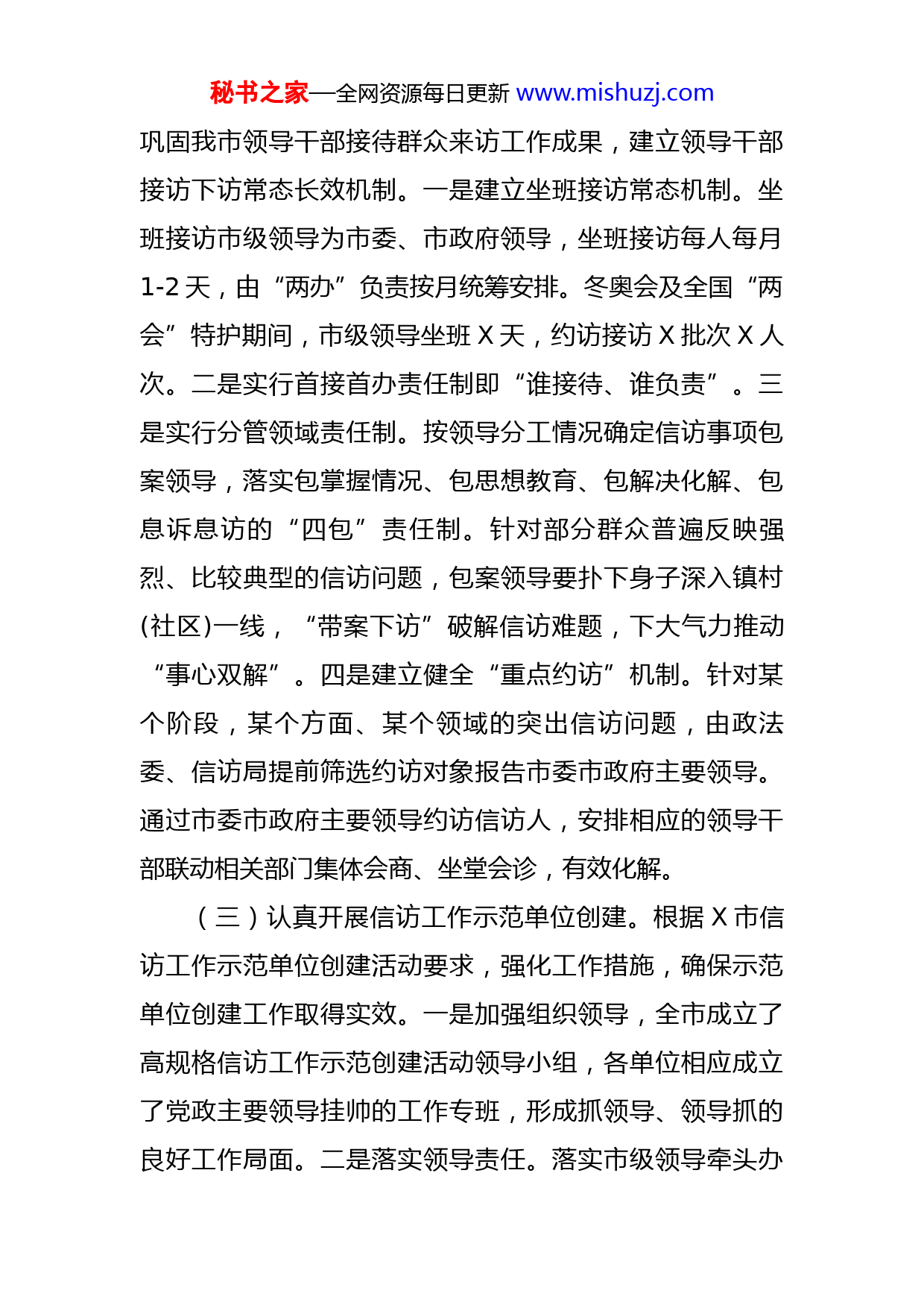 秘书之家—全网资源每日更新www.mishuzj.com市信访局重点工作汇报材料今年以来,我局在市委、市政府的正确领导下,坚决贯彻党中央、省、市决策部署,强化政治担当,夯实防控责任,细化防控措施,因时因势统筹推进疫情防控工作和信访维稳工作。深入学习贯彻习近平总书记关于加强和改进人民信访工作的重要思想,坚持以人民为中心,聚焦信访源头治理固本强基、信访事项办理提速提质、重点问题化解标本兼治,深化信访制度改革和长效机制建设,打造更高水平的阳光信访、责任信访、法治信访,全力服务生态文化活力X高质量发展,认真贯彻落实全省信访工作电视电话会议精神,围绕X市信访工作和《X市2022年度县市区信访工作责任目标管理考核办法》的要求扎实开展各项工作。现将各项工作汇报如下:一、信访工作开展情况(一)深入排查化解矛盾纠纷,及时就地解决信访问题。坚持和发展新时代“枫桥经验”,充分发挥基层群众工作平台和网格化管理作用,突出源头预防、多元化解,综合运用教育、调解、疏导等办法,切实把问题化解在基层和当地,做到“小事不出村、大事不出镇、矛盾不上交”。(二)严格落实领导干部接访下访常态长效制度。为秘书之家—全网资源每日更新www.mishuzj.com巩固我市领导干部接待群众来访工作成果,建立领导干部接访下访常态长效机制。一是建立坐班接访常态机制。坐班接访市级领导为市委、市政府领导,坐班接访每人每月1-2天,由“两办”负责按月统筹安排。冬奥会及全国“两会”特护期间,市级领导坐班X天,约访接访X批次X人次。二是实行首接首办责任制即“谁接待、谁负责”。三是实行分管领域责任制。按领导分工情况确定信访事项包案领导,落实包掌握情况、包思想教育、包解决化解、包息诉息访的“四包”责任制。针对部分群众普遍反映强烈、比较典型的信访问题,包案领导要扑下身子深入镇村(社区)一线,“带案下访”破解信访难题,下大气力推动“事心双解”。四是建立健全“重点约访”机制。针对某个阶段,某个方面、某个领域的突出信访问题,由政法委、信访局提前筛选约访对象报告市委市政府主要领导。通过市委市政府主要领导约访信访人,安排相应的领导干部联动相关部门集体会商、坐堂会诊,有效化解。(三)认真开展信访工作示范单位创建。根据X市信访工作示范单位创建活动要求,强化工作措施,确保示范单位创建工作取得实效。一是加强组织领导,全市成立了高规格信访工作示范创建活动领导小组,各单位相应成立了党政主要领导挂帅的工作专班,形成抓领导、领导抓的良好工作局面。二是落实领导责任。落实市级领导牵头办秘书之家—全网资源每日更新www.mishuzj.com理群众突出信访问题制度,加大信访事项包案领导约访走访推动信访事项化解力度,加大信访事项办理变上访为下访力度。三是打造优质窗口。通过设施再配套、制度再完善、素质再提升,打造人民满意的信访窗口。四是加大督查力度。将信访工作示范单位创建工作督查纳入市人民政府督查室督查范围,按照标准,采取多种途径、多种形式对示范单位创建工作进行督查,跟进通报工作进展情况。(四)深入推行来访群众“最多访一次”工作。根据国家信访局推行关于让群众“最多访一次”的工作要求,结合我市的实际情况,努力实现来访群众“最多访一次”,在全市推行“五个一”工作法。即:让信访渠道在一线打通;让工作责任在一线压实;让信访问题在一线解决;让工作成效在一线提升;让干部形象在一线树立。(五)创建人民满意窗口。紧紧围绕“业务更精、服务更优、环境更美、效果更好”工作目标,大力推进“人民满意窗口”创建活动。一是改善环境,在一楼接访大厅安装空调,摆放绿叶盆栽,免费提供药品、茶水、纸巾,免费发放信访宣传资料、网上信访手册,打造温馨舒适的群众候访环境。二是集中办公,将局机关业务股室全部集中在一楼办公,并严格实行市级领导到信访窗口轮流坐班接访制度,方便群众找得到想找的人,办得成想办的事。三是热忱接待,严格要求工作人员做到“六要”:一要暖秘书之家—全网资源每日更新www.mishuzj.com心问好,二要主动泡茶,三要细心问事,四要耐心交谈,五悉心解释,六笑脸相送。杜绝“门难进、脸难看、话难听、事难办”,以作风建设的新成效促进工作效率的新提升。(六)切实提升信访事项办理的时效性与一次性化解率。一是强化业务保障。二是细化业务流程,根据信访业务工作依法分类处理新任务、新要求,明确受理办理各个环节的时限要求,加大初次信访事项办理力度,提高信访工作效率。三是理顺分类机制。四是加强培训力度。五是严格督查督办,实行每周评查、每月通报、半年排名、年度考核。同时,对重大疑难复杂信访问题、上级交办督办重点信访问题、“三跨三分离”信访事项以及群众评价不满意的信访问题,市信访局将加强实地督查督办,不断提升按期办结率、群众满意率。六是开展回访核实。七是严格责任追究。二、后段工作建议与意见严格落实领导干部接访下访常态长效制度。实行坐班接访常态化。落实领导包案,合力攻坚积案,实行联点与分管领域责任制包案。聚焦重点领域,开展集中化解专项行动。创建人民满意窗口。健全重大事项社会稳定风险评估工作机制。健全信访突