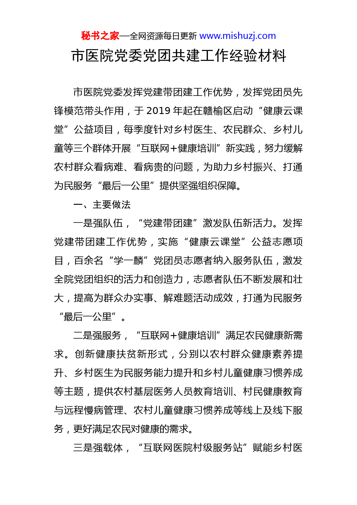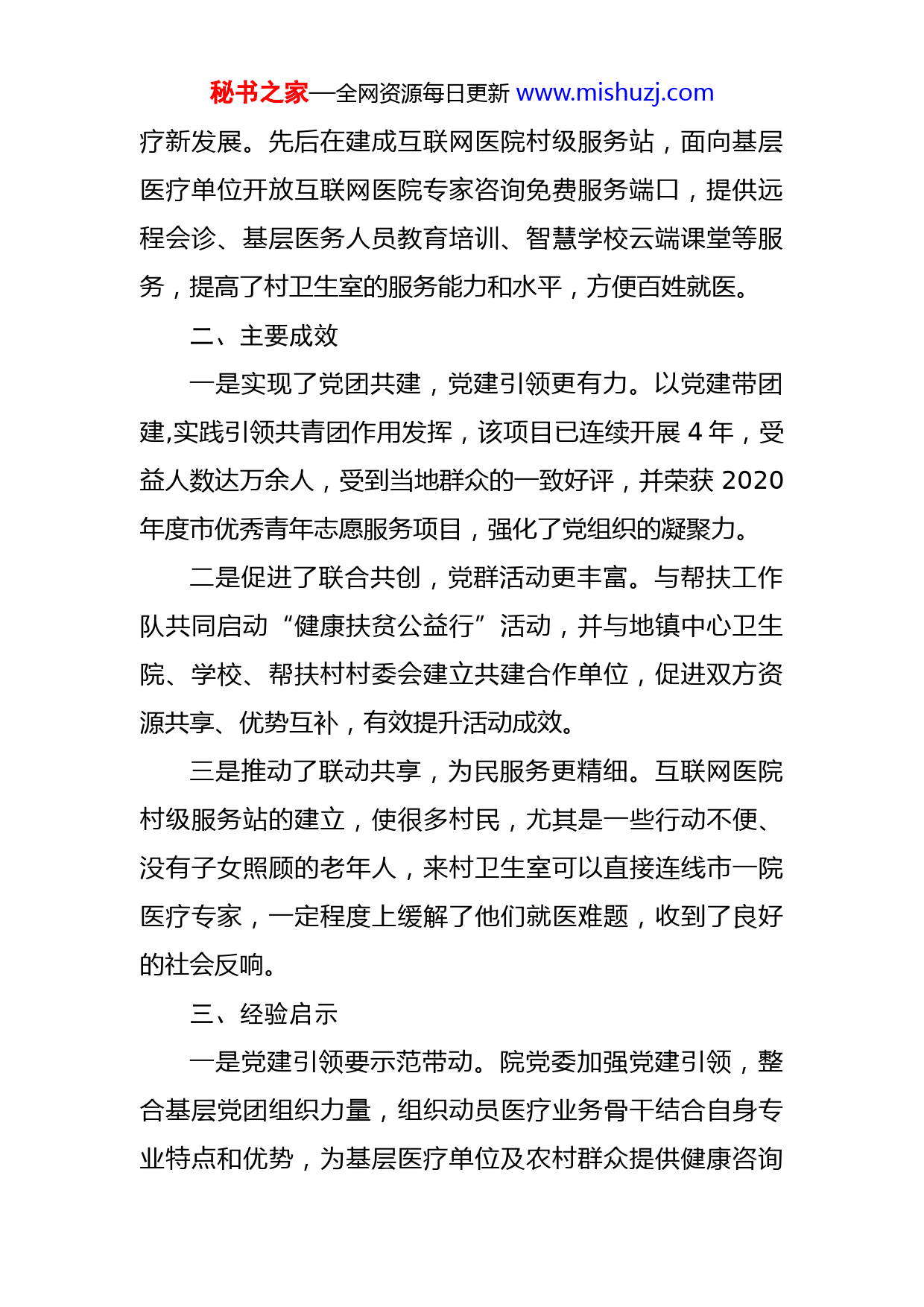 秘书之家—全网资源每日更新www.mishuzj.com市医院党委党团共建工作经验材料市医院党委发挥党建带团建工作优势,发挥党团员先锋模范带头作用,于2019年起在赣榆区启动“健康云课堂”公益项目,每季度针对乡村医生、农民群众、乡村儿童等三个群体开展“互联网+健康培训”新实践,努力缓解农村群众看病难、看病贵的问题,为助力乡村振兴、打通为民服务“最后一公里”提供坚强组织保障。一、主要做法一是强队伍,“党建带团建”激发队伍新活力。发挥党建带团建工作优势,实施“健康云课堂”公益志愿项目,百余名“学一麟”党团员志愿者纳入服务队伍,激发全院党团组织的活力和创造力,志愿者队伍不断发展和壮大,提高为群众办实事、解难题活动成效,打通为民服务“最后一公里”。二是强服务,“互联网+健康培训”满足农民健康新需求。创新健康扶贫新形式,分别以农村群众健康素养提升、乡村医生为民服务能力提升和乡村儿童健康习惯养成等主题,提供农村基层医务人员教育培训、村民健康教育与远程慢病管理、农村儿童健康习惯养成等线上及线下服务,更好满足农民对健康的需求。三是强载体,“互联网医院村级服务站”赋能乡村医秘书之家—全网资源每日更新www.mishuzj.com疗新发展。先后在建成互联网医院村级服务站,面向基层医疗单位开放互联网医院专家咨询免费服务端口,提供远程会诊、基层医务人员教育培训、智慧学校云端课堂等服务,提高了村卫生室的服务能力和水平,方便百姓就医。二、主要成效一是实现了党团共建,党建引领更有力。以党建带团建,实践引领共青团作用发挥,该项目已连续开展4年,受益人数达万余人,受到当地群众的一致好评,并荣获2020年度市优秀青年志愿服务项目,强化了党组织的凝聚力。二是促进了联合共创,党群活动更丰富。与帮扶工作队共同启动“健康扶贫公益行”活动,并与地镇中心卫生院、学校、帮扶村村委会建立共建合作单位,促进双方资源共享、优势互补,有效提升活动成效。三是推动了联动共享,为民服务更精细。互联网医院村级服务站的建立,使很多村民,尤其是一些行动不便、没有子女照顾的老年人,来村卫生室可以直接连线市一院医疗专家,一定程度上缓解了他们就医难题,收到了良好的社会反响。三、经验启示一是党建引领要示范带动。院党委加强党建引领,整合基层党团组织力量,组织动员医疗业务骨干结合自身专业特点和优势,为基层医疗单位及农村群众提供健康咨询秘书之家—全网资源每日更新www.mishuzj.com与专业指导,通过互联网+健康咨询、培训、教育模式,在为基层输送优质医疗资源外,做到“授人以渔”。二是党建工作要凝心聚力。院党委坚持把阵地建设和组织建设结合起来,把政治功能和服务功能贯通起来,凝聚党团员志愿者、选派驻村干部、镇村党员干部等多方力量,实现了“资源沉下去、党建强起来、民心聚起来”的良好效果。三是党建服务要深入群众。党团共建“健康云课堂”公益项目的实施,利用“互联网+”为乡村医疗赋能,提高农村基层医疗技术水平,将健康管理理念深入农村百姓生活,进一步缓解农村群众看病难、看病贵的问题。
