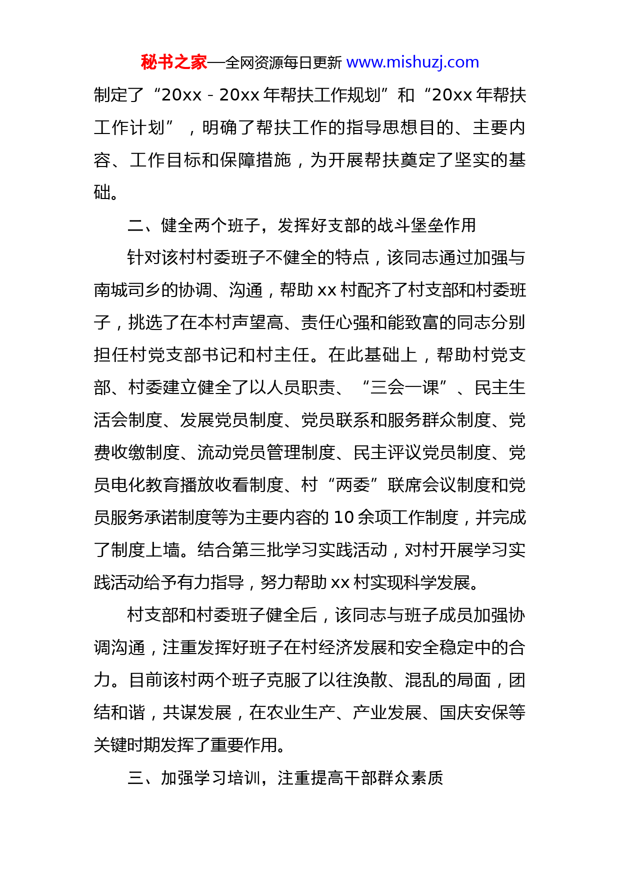 秘书之家—全网资源每日更新www.mishuzj.com市卫生监督所所长驻村扶贫攻坚事迹材料xx同志现任xx市卫生监督所所长职务。20xx年,扶贫工作在市委组织部、市扶贫办的领导和市卫健局的帮助指导下,认真贯彻落实省、市扶贫工作有关精神和文件要求,以“不忘初心、牢记使命”主题教育活动和“干部作风建设年”活动为契机,注重强化帮扶意识,健全工作机制,拓宽帮扶思路,落实帮扶项目,进一步加大了扶贫和调研工作力度,力所能及地为帮扶点-xx县xx乡xx村解决实际困难,深入一线对口帮扶,从帮建班子入手,健全了学习培训制度,帮助转变观念、用好政策、找准路子,扎实开展了产业开发等帮扶工作,扶贫工作取得了可喜成果。一、谋求领导支持,沉下身子扎根帮扶单位工作好不好,关键在领导。为做好帮扶工作,该同志一方面主动学习上级文件精神,深入了解掌握上级有关扶贫政策和精神,另一方面注重开发领导,提高单位领导对帮扶工作重要性的认识。20xx年来,党委书记xx、副书记xxx等同志先后7次深入扶贫点开展帮扶工作,党委先后3次召开专题会议,研究部署扶贫工作,并明确了责任科室、责任人和挂职驻村干部。该同志能够扎根扶贫村,扎实开展帮扶工作。结合单位和扶贫村的实际情况,组织秘书之家—全网资源每日更新www.mishuzj.com制定了“20xx-20xx年帮扶工作规划”和“20xx年帮扶工作计划”,明确了帮扶工作的指导思想目的、主要内容、工作目标和保障措施,为开展帮扶奠定了坚实的基础。二、健全两个班子,发挥好支部的战斗堡垒作用针对该村村委班子不健全的特点,该同志通过加强与南城司乡的协调、沟通,帮助xx村配齐了村支部和村委班子,挑选了在本村声望高、责任心强和能致富的同志分别担任村党支部书记和村主任。在此基础上,帮助村党支部、村委建立健全了以人员职责、“三会一课”、民主生活会制度、发展党员制度、党员联系和服务群众制度、党费收缴制度、流动党员管理制度、民主评议党员制度、党员电化教育播放收看制度、村“两委”联席会议制度和党员服务承诺制度等为主要内容的10余项工作制度,并完成了制度上墙。结合第三批学习实践活动,对村开展学习实践活动给予有力指导,努力帮助xx村实现科学发展。村支部和村委班子健全后,该同志与班子成员加强协调沟通,注重发挥好班子在村经济发展和安全稳定中的合力。目前该村两个班子克服了以往涣散、混乱的局面,团结和谐,共谋发展,在农业生产、产业发展、国庆安保等关键时期发挥了重要作用。三、加强学习培训,注重提高干部群众素质秘书之家—全网资源每日更新www.mishuzj.com为帮助村党支部和村委主要领导人转变观念,提高自身素质,今年来,该同志帮助xx村落实好理论学习活动,先后组织学习教育培训3次,带领干部群众外出学习参观20余人次,学习借鉴了兄弟村庄脱贫致富的好经验和好做法,为本村的发展注入了活动。同时,为村民发放预防疾病、健康饮食和正确就医宣传资料、明白纸等1000余份,引导群众健康生活,健康消费,有效预防了“手足口病”的暴发流行。在此基础上,宣传好党的方针政策和科学发展知识,在增强村民卫生安全意识的同时,也提高了他们的思想认识。四、找准帮扶路子,全面开展扶贫助困工作xx村的特点是“两多一少”,即人多、山多、地少,该村现有住户x户、村民x人,有果树x亩、板栗x亩、枣树x亩。该同志根据其特点,积极与村干部一起谋划扶贫工作,认为要想脱贫致富,仅靠发展林业和种植业不是够的,还应在劳动力输出上下功夫,以提高村民的经济收入。在板栗成熟期间,积极组织产品外销,同时介绍劳动力输出20余人次,提高了村民的经济收入。因我市疾控大楼项目建设投入较大,目前市疾控大楼尚有x余万元了资金缺口,市卫生监督所每年也要拿出x余万元的资金维持大楼运转,加上两个单位为全额拨款单位,办公经费有限,单位力所能及地从有限的资金中拿出秘书之家—全网资源每日更新www.mishuzj.com万余元,用于xx村发展经济。同时,注重关怀困难学生和弱势群体,先后拿出x元为特困学生购置了书包、本、笔等学习用品用具,拿出x元看望慰问了身体有病、经济困难的村民4户。部分扶贫资金全部用于浇灌基础设施建设,保证了水渠的畅通,基本解决了果树灌溉等问题。五、推进合作医疗,倾力为群众解决实际困难针对农村看病难等问题,积极帮助联系城乡合作医疗项目,目前全村x余户已加入城乡合作医疗,享受到了合作医疗带来的好处。另外,还积极帮助有病村民联系进城看病就医,先后推荐村民到市第一中心、第三中心和三医院等单位看病50余人次,最大限度地降低了村民看病费用。作为驻村帮扶干部,该同志克服家庭困难,正确处理好工作与扶贫间的关系,一心扎根基层,为村民排忧解难。农忙季节,与单位扶贫人员力所能及地帮助家庭劳动力少、生活困难和身体有病等家庭,帮助他们抢收、抢种庄稼,照顾鳏寡、有病老人的饮食起居。同时积极为村干部排忧解难,协调、解决了村民纠纷x起,为保证全村安全稳定做出了积极的贡献。70周年国庆期间,xx村总体形势安全稳定,无一人越级上访和进京上访。下一步,将继续围绕市委组织部和市扶贫办的扶贫工作要求,进一步加大对xx村的帮扶力度,继续开展夯基秘书之家—全网资源每日更新www.mishuzj.com础、解民忧