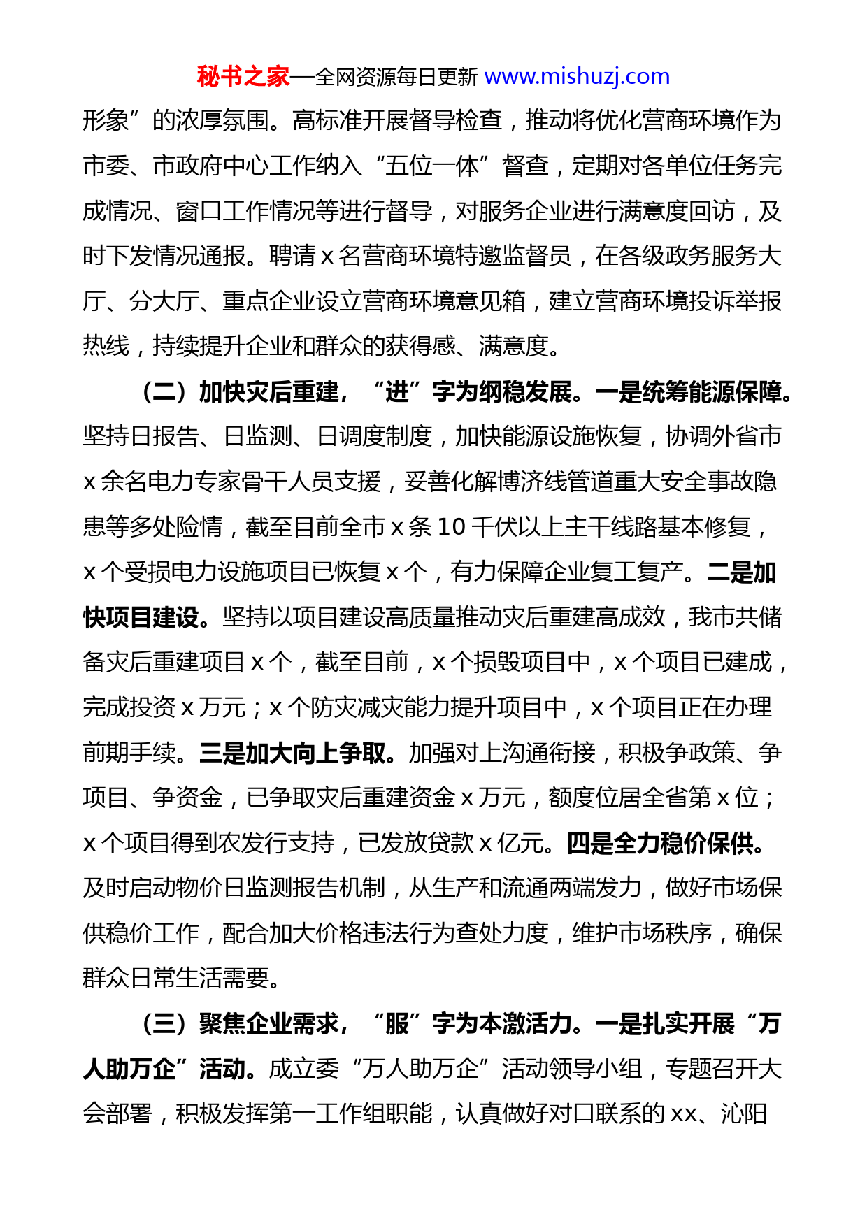 秘书之家—全网资源每日更新www.mishuzj.com市发展和改革委员会优化营商环境工作开展情况报告范文去年以来,市发展改革委认真贯彻落实市委、市政府决策部署,始终坚持“定好位、干好事、出好彩”,积极发挥全市优化营商环境牵头部门作用,以打造国内一流营商环境目标,以市场主体需求为导向,以深刻转变职能为核心,建机制、抓改革、促创新、求实效,重大规划编制、重点项目谋划、政策性资金争取、清洁取暖试点市建设等工作走在全省前列,创新推出的“首席服务员”、投资项目“容缺办理”“多评合一”、“信易贷”等品牌叫响全省,有效激发了市场主体活力和社会创造力,为“十四五”开局起步奠定了坚实基础。一、主要工作及成绩(一)抬高政治站位,“统”字当头抓谋划。高规格强化组织引领,重新调整市优化营商环境工作领导小组,建立书记、市长任组长的“双组长”制,成员单位拓展到x个,并成立x个专项领导小组,建立了市领导分包优化营商环境重点领域机制,召开全市深入实施高标准营商环境优化行动大会,为营商环境建设提供了强有力的政治保证和组织保障。高站位擘画工作蓝图,对标国际国内一流标准,构建“1+21”指标体系,并细化任务清单共计x项内容,组织x个相关市直单位共梳理短板弱项x处,制定整改措施x条,全力打造xx优化营商环境2.0版本。高质量推进宣传报道,建立营商环境宣传积分制度,定期进行排名通报。连续召开x场新闻发布会,累计在省级及以上媒体报道x余篇,推动形成“人人参与营商环境、人人提升xx秘书之家—全网资源每日更新www.mishuzj.com形象”的浓厚氛围。高标准开展督导检查,推动将优化营商环境作为市委、市政府中心工作纳入“五位一体”督查,定期对各单位任务完成情况、窗口工作情况等进行督导,对服务企业进行满意度回访,及时下发情况通报。聘请x名营商环境特邀监督员,在各级政务服务大厅、分大厅、重点企业设立营商环境意见箱,建立营商环境投诉举报热线,持续提升企业和群众的获得感、满意度。(二)加快灾后重建,“进”字为纲稳发展。一是统筹能源保障。坚持日报告、日监测、日调度制度,加快能源设施恢复,协调外省市x余名电力专家骨干人员支援,妥善化解博济线管道重大安全事故隐患等多处险情,截至目前全市x条10千伏以上主干线路基本修复,x个受损电力设施项目已恢复x个,有力保障企业复工复产。二是加快项目建设。坚持以项目建设高质量推动灾后重建高成效,我市共储备灾后重建项目x个,截至目前,x个损毁项目中,x个项目已建成,完成投资x万元;x个防灾减灾能力提升项目中,x个项目正在办理前期手续。三是加大向上争取。加强对上沟通衔接,积极争政策、争项目、争资金,已争取灾后重建资金x万元,额度位居全省第x位;x个项目得到农发行支持,已发放贷款x亿元。四是全力稳价保供。及时启动物价日监测报告机制,从生产和流通两端发力,做好市场保供稳价工作,配合加大价格违法行为查处力度,维护市场秩序,确保群众日常生活需要。(三)聚焦企业需求,“服”字为本激活力。一是扎实开展“万人助万企”活动。成立委“万人助万企”活动领导小组,专题召开大会部署,积极发挥第一工作组职能,认真做好对口联系的xx、沁阳秘书之家—全网资源每日更新www.mishuzj.com及包联企业走访,建立企业情况、项目建设、存在问题等三本工作台账,截至目前共收集问题x个,已解决x个,其余正按程序协调解决。二是全面做好项目服务保障。坚持项目为王,强化要素保障,大力推进投资项目“申报端集成化管理链”“审批端一站式服务链”,形成贯穿项目投资决策期、施工准备期、施工期、运营期四个阶段的全生命周期服务完整闭环,全面构建起“两端两链一闭环”的高效项目服务体系。三是持续降低企业成本。研究制定《关于做好20xx年xx市降成本重点工作的通知》,全面清理规范城镇水电气暖行业收费,大力推进阶段性降低企业用气成本,实现城区非居民用管道天然气销售价格低于全省平均水平,有效为市场主体纾困解难,提振企业发展信心。(四)紧盯关键重点,“干”字为要促实效。一是着力提升审批效能。纵深推进“放管服效”改革,制定政务服务事项办理服务指南、办理规程,全面推广“容缺办理”“多评合一”,积极探索“告知承诺+信易批”“并联办理+多评合一”等创新型审批模式,制作完成全市首家且唯一的批文类电子证照,全流程审批时间由x个工作日压缩至x个工作日。二是深化价格领域改革。加快推进农业水价综合改革,全面清理规范城镇水电气暖行业不合理收费,落实差别化电价政策、城镇非居民用水超定额累进加价制度、差别化污水处理费收费机制,推动绿色价格政策落地签见效。三是加快信用体系建设。充分发挥信用体系建设牵头部门职能,着力构建以信用为基础的新型监管机制,信用信息归集数据突破x亿条,x个信用案例入选xx省十大典型案例,荣获省标准化平台网站称号。积极探索“信易+”应用场景,秘书之家—全网资源每日更新www.mishuzj.com我市“信易贷”平台在全省观摩评比中获一等奖,并将代表xx省参加全国比赛。四是提升依法行政水平。深化法治机关建设科学统筹,认真落实行政执法“三项制度”,积极推进服务型行政执法,全面加强标准化建设。建立重大事项集体决策、合法