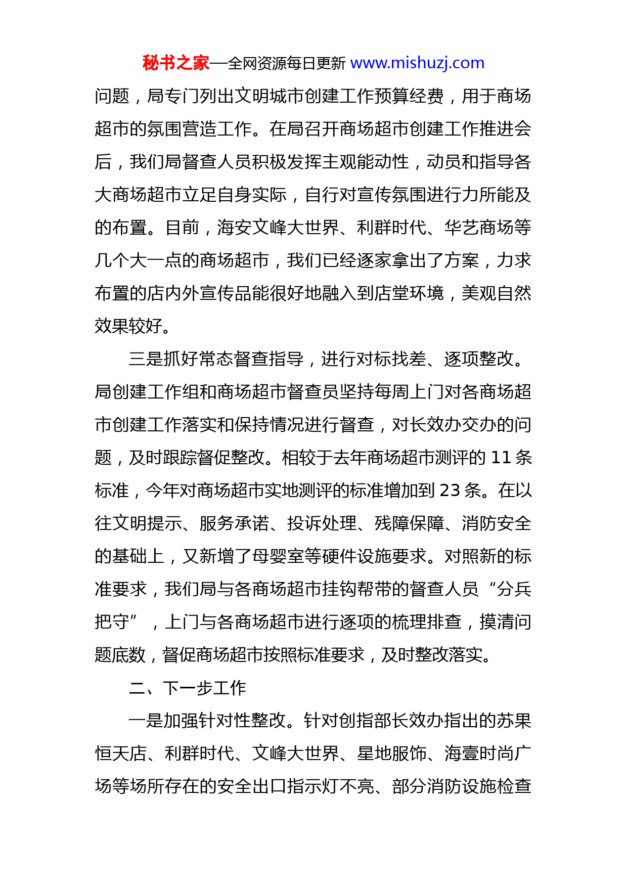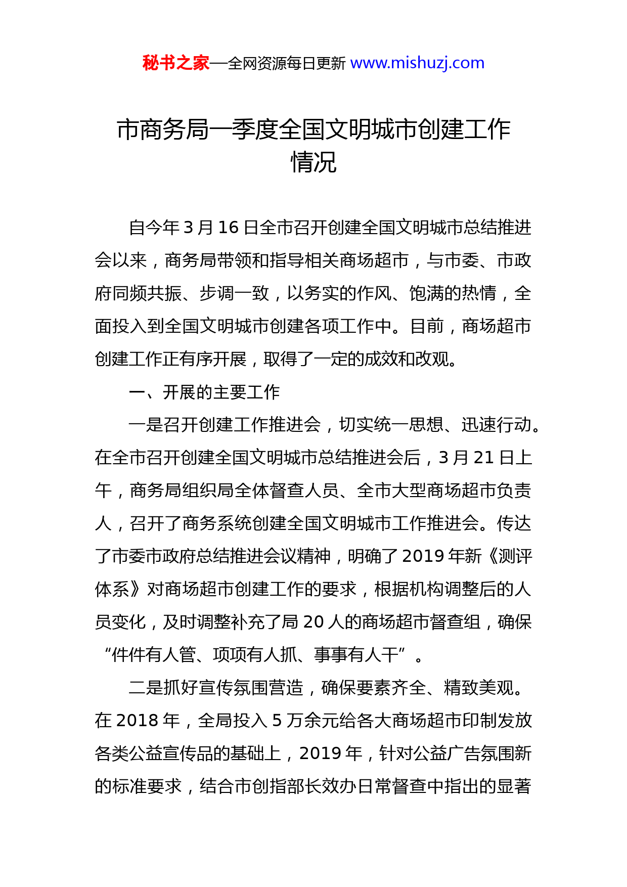 秘书之家—全网资源每日更新www.mishuzj.com市商务局一季度全国文明城市创建工作情况自今年3月16日全市召开创建全国文明城市总结推进会以来,商务局带领和指导相关商场超市,与市委、市政府同频共振、步调一致,以务实的作风、饱满的热情,全面投入到全国文明城市创建各项工作中。目前,商场超市创建工作正有序开展,取得了一定的成效和改观。一、开展的主要工作一是召开创建工作推进会,切实统一思想、迅速行动。在全市召开创建全国文明城市总结推进会后,3月21日上午,商务局组织局全体督查人员、全市大型商场超市负责人,召开了商务系统创建全国文明城市工作推进会。传达了市委市政府总结推进会议精神,明确了2019年新《测评体系》对商场超市创建工作的要求,根据机构调整后的人员变化,及时调整补充了局20人的商场超市督查组,确保“件件有人管、项项有人抓、事事有人干”。二是抓好宣传氛围营造,确保要素齐全、精致美观。在2018年,全局投入5万余元给各大商场超市印制发放各类公益宣传品的基础上,2019年,针对公益广告氛围新的标准要求,结合市创指部长效办日常督查中指出的显著秘书之家—全网资源每日更新www.mishuzj.com问题,局专门列出文明城市创建工作预算经费,用于商场超市的氛围营造工作。在局召开商场超市创建工作推进会后,我们局督查人员积极发挥主观能动性,动员和指导各大商场超市立足自身实际,自行对宣传氛围进行力所能及的布置。目前,海安文峰大世界、利群时代、华艺商场等几个大一点的商场超市,我们已经逐家拿出了方案,力求布置的店内外宣传品能很好地融入到店堂环境,美观自然效果较好。三是抓好常态督查指导,进行对标找差、逐项整改。局创建工作组和商场超市督查员坚持每周上门对各商场超市创建工作落实和保持情况进行督查,对长效办交办的问题,及时跟踪督促整改。相较于去年商场超市测评的11条标准,今年对商场超市实地测评的标准增加到23条。在以往文明提示、服务承诺、投诉处理、残障保障、消防安全的基础上,又新增了母婴室等硬件设施要求。对照新的标准要求,我们局与各商场超市挂钩帮带的督查人员“分兵把守”,上门与各商场超市进行逐项的梳理排查,摸清问题底数,督促商场超市按照标准要求,及时整改落实。二、下一步工作一是加强针对性整改。针对创指部长效办指出的苏果恒天店、利群时代、文峰大世界、星地服饰、海壹时尚广场等场所存在的安全出口指示灯不亮、部分消防设施检查秘书之家—全网资源每日更新www.mishuzj.com不及时、消防通道不通畅、熟食柜工作人员未按卫生要求规范着装等问题,督促这些商场超市,逐条对照、逐条落实,实行消号管理。二是一店一策抓提高。针对创指部长效办指出的商场超市公益广告内容混搭、电梯口无文明提示、尺寸偏小、氛围不浓、不融入店堂内氛围等涉及到公益宣传问题,4月下旬我们请广告设计公司的设计员,对苏果、文峰、利群永辉等7家大型商场超市进行专门的公益宣传策划。确保位置显著、精致美观、尺寸合适、内容色调与店堂相融合目前,我们已经拿出了初步的布置方案,后面请宣传部把关后,我们就着手开始对上述商场超市进行布置。三是强化常态督查。我们将继续加强对商场超市创建全国文明城市工作的督查检查,对照创建工作的23条标准,认真对标找差,及时发现问题、及时落实整改、逐企业落实到位。我们将5月份作为创建全国文明城市工作的“提升月”,确保上半年创建全国文明城市工作商场超市不失分、拿足分。