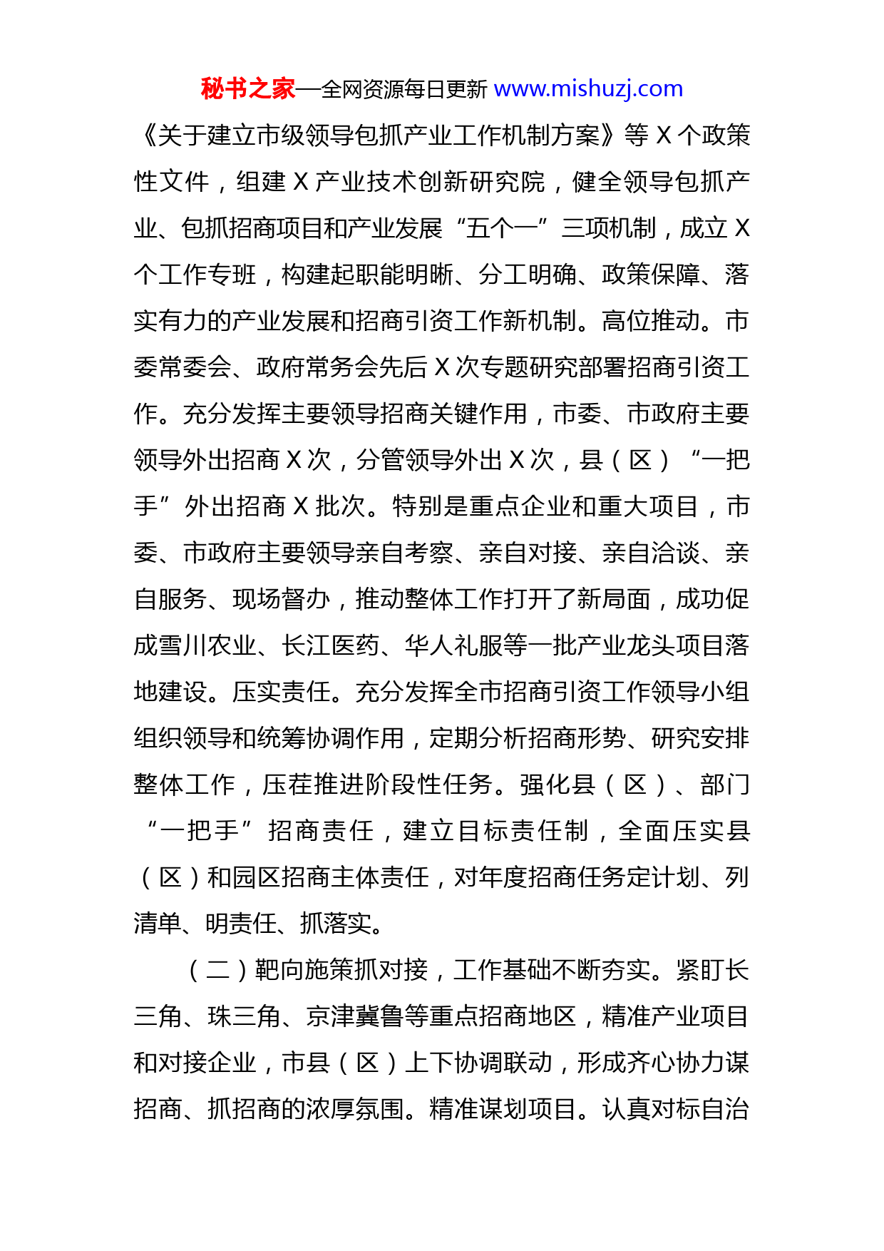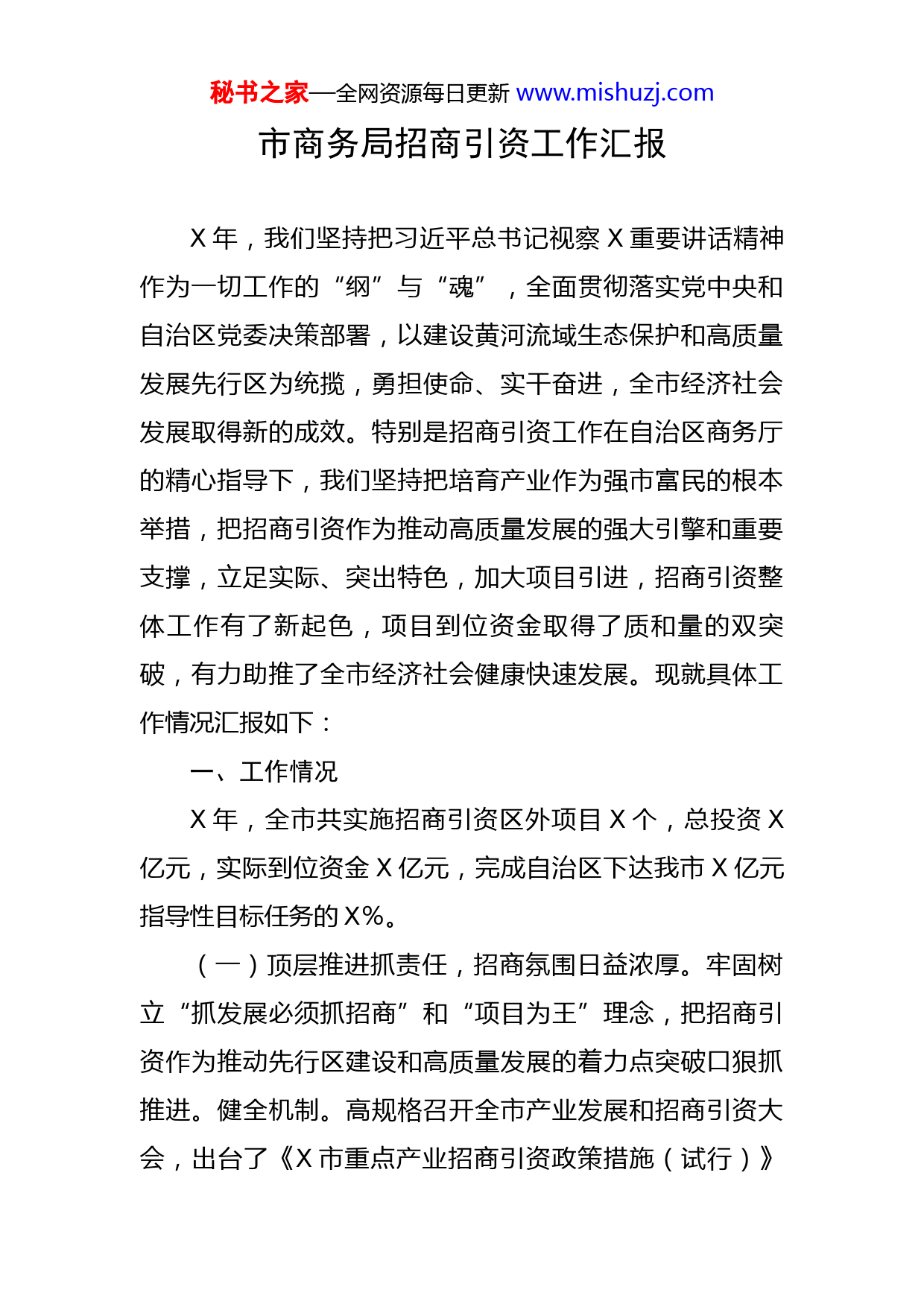 秘书之家—全网资源每日更新www.mishuzj.com市商务局招商引资工作汇报X年,我们坚持把习近平总书记视察X重要讲话精神作为一切工作的“纲”与“魂”,全面贯彻落实党中央和自治区党委决策部署,以建设黄河流域生态保护和高质量发展先行区为统揽,勇担使命、实干奋进,全市经济社会发展取得新的成效。特别是招商引资工作在自治区商务厅的精心指导下,我们坚持把培育产业作为强市富民的根本举措,把招商引资作为推动高质量发展的强大引擎和重要支撑,立足实际、突出特色,加大项目引进,招商引资整体工作有了新起色,项目到位资金取得了质和量的双突破,有力助推了全市经济社会健康快速发展。现就具体工作情况汇报如下:一、工作情况X年,全市共实施招商引资区外项目X个,总投资X亿元,实际到位资金X亿元,完成自治区下达我市X亿元指导性目标任务的X%。(一)顶层推进抓责任,招商氛围日益浓厚。牢固树立“抓发展必须抓招商”和“项目为王”理念,把招商引资作为推动先行区建设和高质量发展的着力点突破口狠抓推进。健全机制。高规格召开全市产业发展和招商引资大会,出台了《X市重点产业招商引资政策措施(试行)》秘书之家—全网资源每日更新www.mishuzj.com《关于建立市级领导包抓产业工作机制方案》等X个政策性文件,组建X产业技术创新研究院,健全领导包抓产业、包抓招商项目和产业发展“五个一”三项机制,成立X个工作专班,构建起职能明晰、分工明确、政策保障、落实有力的产业发展和招商引资工作新机制。高位推动。市委常委会、政府常务会先后X次专题研究部署招商引资工作。充分发挥主要领导招商关键作用,市委、市政府主要领导外出招商X次,分管领导外出X次,县(区)“一把手”外出招商X批次。特别是重点企业和重大项目,市委、市政府主要领导亲自考察、亲自对接、亲自洽谈、亲自服务、现场督办,推动整体工作打开了新局面,成功促成雪川农业、长江医药、华人礼服等一批产业龙头项目落地建设。压实责任。充分发挥全市招商引资工作领导小组组织领导和统筹协调作用,定期分析招商形势、研究安排整体工作,压茬推进阶段性任务。强化县(区)、部门“一把手”招商责任,建立目标责任制,全面压实县(区)和园区招商主体责任,对年度招商任务定计划、列清单、明责任、抓落实。(二)靶向施策抓对接,工作基础不断夯实。紧盯长三角、珠三角、京津冀鲁等重点招商地区,精准产业项目和对接企业,市县(区)上下协调联动,形成齐心协力谋招商、抓招商的浓厚氛围。精准谋划项目。认真对标自治秘书之家—全网资源每日更新www.mishuzj.com区X大产业,围绕“红色X、绿色发展”定位,因地制宜重点发展肉牛、绿色食品、文化旅游、生态经济、纺织服装X大产业,培育发展新材料、新能源、中药材、电子信息X个产业,构建起“X+X”产业发展格局,研究制定X个产业发展专项规划,出台《X市产业发展指导目录(X年本)》。市场化开展招商项目策划、包装、储备、评估,论证重点招商项目X个X亿元,建链延链补链项目X个X亿元,项目均达到预可研深度。同时,制作图文并茂视频、招商手册、移动电子杂志等宣传推介资料,提高招商精准性。充分利用平台招商。深入落实闽宁联席会议精神,不断加大产业协作力度,积极参加自治区商务厅福建泉州、漳州产业专题招商活动,精准推介对接绿色食品、文化旅游、纺织服装产业项目,第X次联席会签约项目X个,落地X个,落地率X%。主动融入“一带一路”和X内陆开放型经济试验区建设,借助中阿博览会平台签约项目X个,落地X个,落地率X%。推行市场化招商。落实市场化招商工作机制,与全国X多个市县工商联、X多家商协会和中介机构开展务实合作,充分发挥X名招商顾问桥梁作用,扎实开展以商招商、中介招商,构建起招商大格局、大网络,畅通长三角、珠三角、环渤海、粤港澳大湾区招商信息网络渠道。(三)压茬推进抓实施,招商成效明显提升。紧盯X秘书之家—全网资源每日更新www.mishuzj.com年全市“产业精准招商百日行动”期间X个在谈项目抓签约和X个签约项目抓落地,今年X—X月份接续开展了“推进招商签约项目落地建设百日行动”,先后召开签约项目现场推进会X次,逐个项目进场督办,下发专报催办X次,成功促成X万吨马铃薯大颗粒淀粉提质增效及汁水回收蛋白环保技术应用、国家储备林建设等一批大项目、好项目落地。截至目前,X个在谈项目签约X个,签约率X%;X个签约项目落地X个,落地率X%。紧盯重点产业集中攻坚,从X月份开始,又安排开展“五大重点产业精准招商专项行动”,再掀招商新热潮,期间全市共外出小分队招商X批次,邀请X多家大企业大集团和重点产业企业来固实地考察,洽谈对接项目X多个。量身定做专班服务。成立重大项目服务工作专班,各县(区)、园区要素保障和招商部门协作,进驻项目现场蹲点服务,确保企业诉求和项目难题第一时间有人管、有人盯、专人办,先后召开项目协调推进会X场次,解决涉企困难问题X多项,对保障和推动项目建设起到了至关重要作用。从严督查考评。强化督查考核导向作用,突出县区、园区、招商部门主责主业、产业和要素部门服务保障,重新修订了《X市县(区)及经济开发区招商引资目标管理考核办法》和《X市直部门(单位)招商引资工作考核办法》。落实半月通报、每