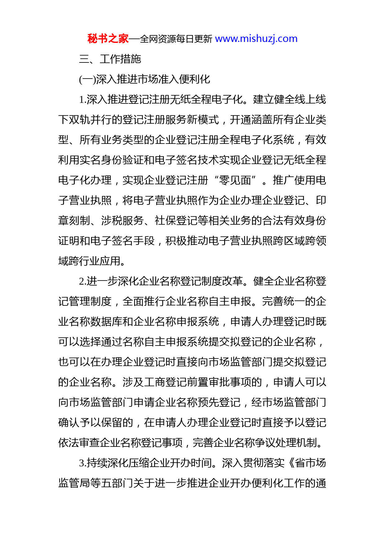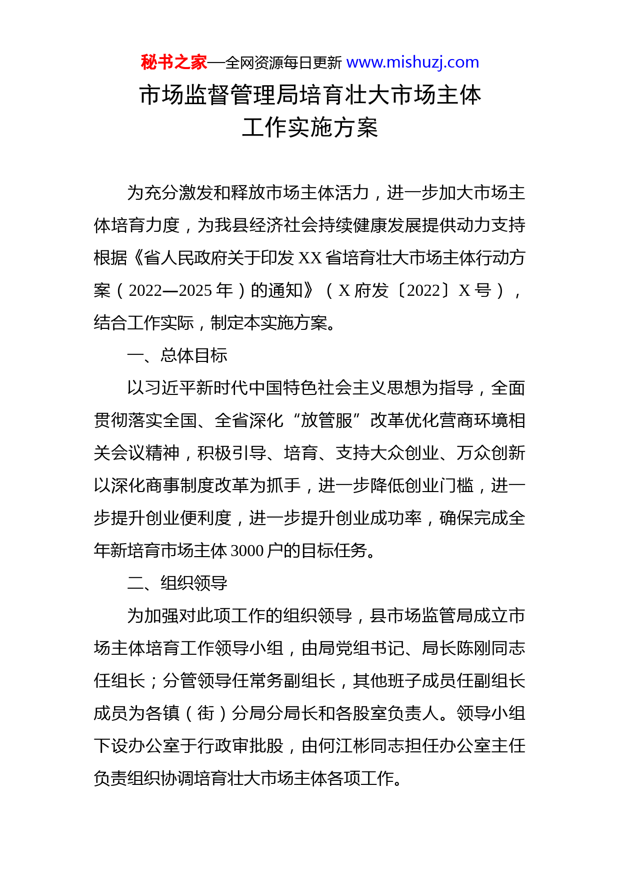 秘书之家—全网资源每日更新www.mishuzj.com市场监督管理局培育壮大市场主体工作实施方案为充分激发和释放市场主体活力,进一步加大市场主体培育力度,为我县经济社会持续健康发展提供动力支持根据《省人民政府关于印发XX省培育壮大市场主体行动方案(2022—2025年)的通知》(X府发〔2022〕X号),结合工作实际,制定本实施方案。一、总体目标以习近平新时代中国特色社会主义思想为指导,全面贯彻落实全国、全省深化“放管服”改革优化营商环境相关会议精神,积极引导、培育、支持大众创业、万众创新以深化商事制度改革为抓手,进一步降低创业门槛,进一步提升创业便利度,进一步提升创业成功率,确保完成全年新培育市场主体3000户的目标任务。二、组织领导为加强对此项工作的组织领导,县市场监管局成立市场主体培育工作领导小组,由局党组书记、局长陈刚同志任组长;分管领导任常务副组长,其他班子成员任副组长成员为各镇(街)分局分局长和各股室负责人。领导小组下设办公室于行政审批股,由何江彬同志担任办公室主任负责组织协调培育壮大市场主体各项工作。秘书之家—全网资源每日更新www.mishuzj.com三、工作措施(一)深入推进市场准入便利化1.深入推进登记注册无纸全程电子化。建立健全线上线下双轨并行的登记注册服务新模式,开通涵盖所有企业类型、所有业务类型的企业登记注册全程电子化系统,有效利用实名身份验证和电子签名技术实现企业登记无纸全程电子化办理,实现企业登记注册“零见面”。推广使用电子营业执照,将电子营业执照作为企业办理企业登记、印章刻制、涉税服务、社保登记等相关业务的合法有效身份证明和电子签名手段,积极推动电子营业执照跨区域跨领域跨行业应用。2.进一步深化企业名称登记制度改革。健全企业名称登记管理制度,全面推行企业名称自主申报。完善统一的企业名称数据库和企业名称申报系统,申请人办理登记时既可以选择通过名称自主申报系统提交拟登记的企业名称,也可以在办理企业登记时直接向市场监管部门提交拟登记的企业名称。涉及工商登记前置审批事项的,申请人可以向市场监管部门申请企业名称预先登记,经市场监管部门确认予以保留的,在申请人办理企业登记时直接予以登记依法审查企业名称登记事项,完善企业名称争议处理机制。3.持续深化压缩企业开办时间。深入贯彻落实《省市场监管局等五部门关于进一步推进企业开办便利化工作的通秘书之家—全网资源每日更新www.mishuzj.com知》精神,进一步加强与公安、税务、人社等部门的协调联动,依托XX政务服务网企业开办“一网通办”平台,推动落实企业开办“一网通办、一窗通办”,实现企业开办申请“一次提交、信息共享、同步办理、限时办结”,确保将企业开办时间持续压缩在1个工作日内,进一步压时限、减环节、优服务、惠民生。4.支持个体工商户发展。简化个体工商户登记程序,放宽个体工商户住所(经营场所)登记条件,个体工商户从事电子商务经营的,允许其将网络经营场所作为经营场所进行登记。以规模以下工业企业发展为重点,扎实推进“个转企”市场主体培育,个体工商户申请转型为企业的,在符合企业名称管理规定的情况下,可以继续使用原字号(商号);已取得审批的许可经营项目,可以继续使用在有效期内的原许可证明文件;申请登记的住所(经营场所)仍为原住所(经营场所)的,不再提交住所(经营场所)证明文件。5.支持农民专业合作社发展。支持农民以土地经营权或林权出资设立农民专业合作社。支持已迁入城镇居住但仍然保留土地承包经营权的居民申请设立农民专业合作社。支持3个以上的农民专业合作社组建农民专业合作社联合社。鼓励农民专业合作社跨地域、跨所有制、跨行业经营。6.建立多元化的市场主体退出制度。优化普通注销制度,强化部门协同联动,完善企业注销网上服务专区功能,实秘书之家—全网资源每日更新www.mishuzj.com现企业注销业务“一网”服务,围绕企业注销中的“难点”、“痛点”、“堵点”,进一步推进注销登记便利化提高行政服务效率,增强企业办事透明度和可预期性。继续推进企业简易注销登记改革,进一步压缩简易注销公告时间、拓展简易注销适用范围、优化简易注销登记流程,为市场主体退出市场提供更加方便快捷的通道。(二)持续推进行政审批、许可改革1.有序推进“证照分离”改革全覆盖。对涉企经营许可事项实行清单管理,推动“照后减证”和简化审批。对市场监管领域所有涉企经营许可事项实施分类改革,逐项细化具体改革举措和加强事中事后监管措施。推进经营范围规范化登记,明确涉企经营许可事项对应的经营范围规范表述,做好企业登记注册和许可审批的衔接。2.深化工业产品许可证改革。推进落实压减工业产品生产许可种类,承接工业产品生产许可县级审批事项,优化审查审批模式,推动“一企一证”“告知承诺”落地落实。3.深化知识产权服务便利化改革。引导企业强化知识产权保护和运用,为市场主体和群众办理知识产权(含商标、专利、地理标志)的申请注册、保护维权提供便利。4.进一步深化食品许可审批改革。推广食品经营许可“告知承诺”,按照国家市场监管总局、省政府统一部署和要求,积极配合推进许可电子证书管理。不