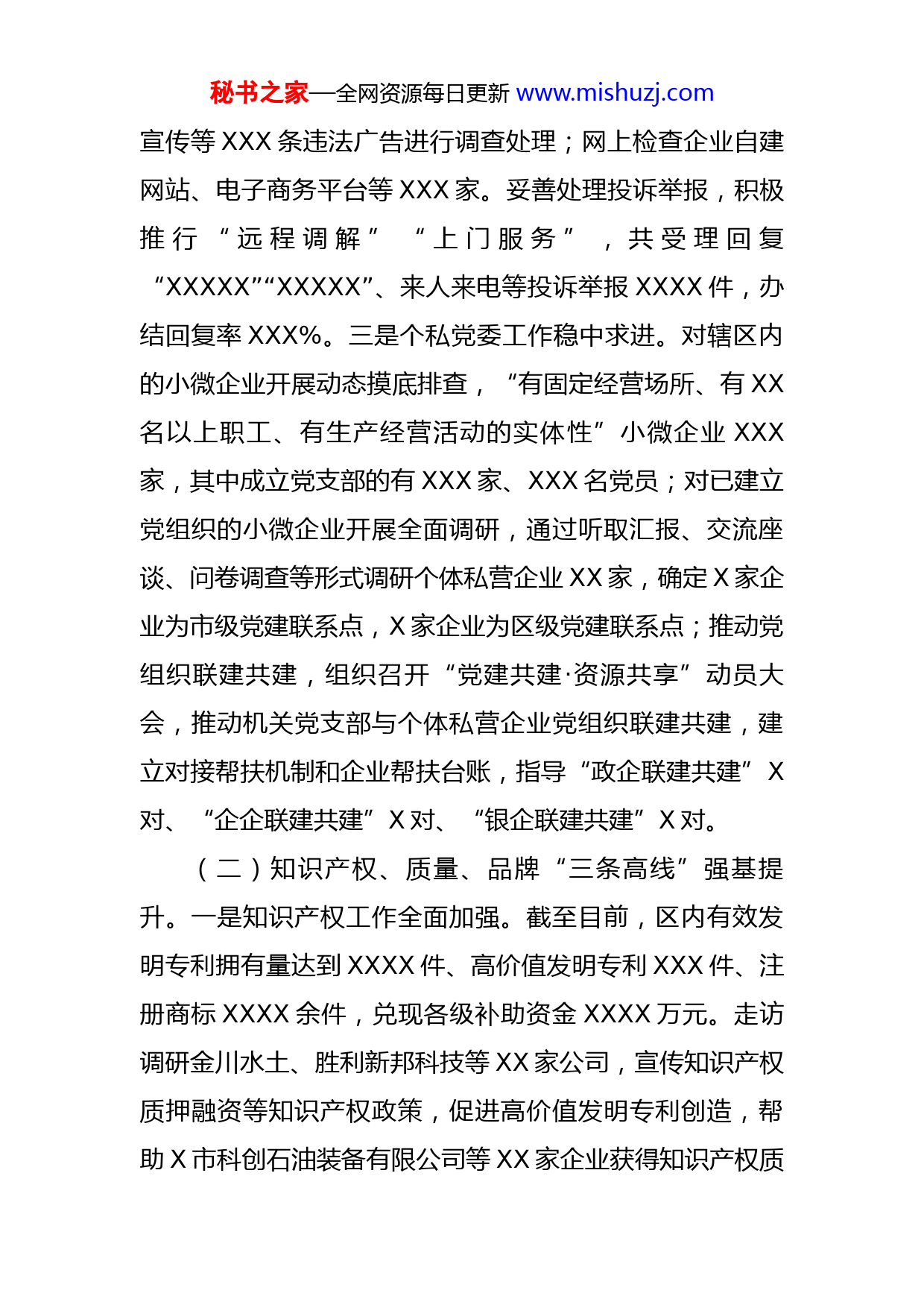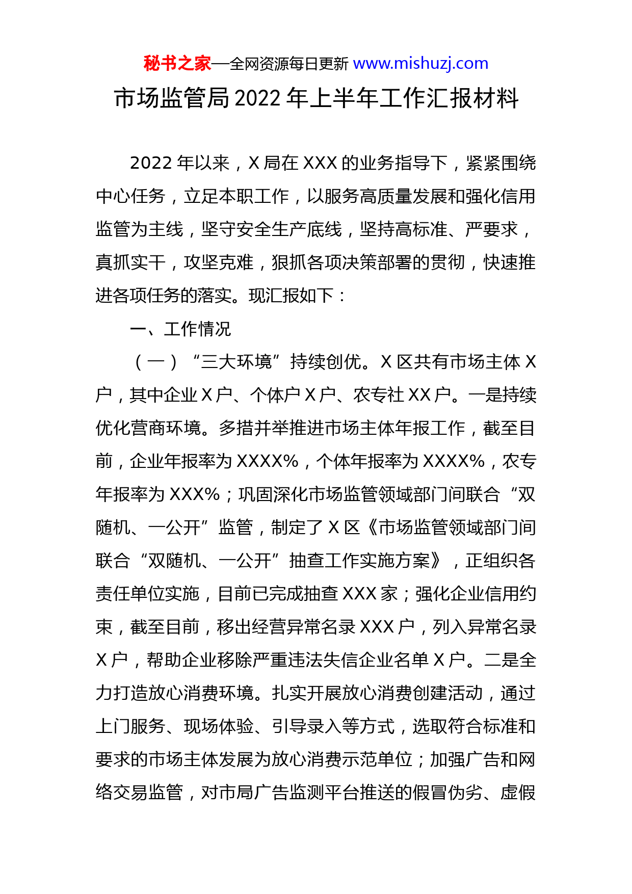 秘书之家—全网资源每日更新www.mishuzj.com市场监管局2022年上半年工作汇报材料2022年以来,X局在XXX的业务指导下,紧紧围绕中心任务,立足本职工作,以服务高质量发展和强化信用监管为主线,坚守安全生产底线,坚持高标准、严要求,真抓实干,攻坚克难,狠抓各项决策部署的贯彻,快速推进各项任务的落实。现汇报如下:一、工作情况(一)“三大环境”持续创优。X区共有市场主体X户,其中企业X户、个体户X户、农专社XX户。一是持续优化营商环境。多措并举推进市场主体年报工作,截至目前,企业年报率为XXXX%,个体年报率为XXXX%,农专年报率为XXX%;巩固深化市场监管领域部门间联合“双随机、一公开”监管,制定了X区《市场监管领域部门间联合“双随机、一公开”抽查工作实施方案》,正组织各责任单位实施,目前已完成抽查XXX家;强化企业信用约束,截至目前,移出经营异常名录XXX户,列入异常名录X户,帮助企业移除严重违法失信企业名单X户。二是全力打造放心消费环境。扎实开展放心消费创建活动,通过上门服务、现场体验、引导录入等方式,选取符合标准和要求的市场主体发展为放心消费示范单位;加强广告和网络交易监管,对市局广告监测平台推送的假冒伪劣、虚假秘书之家—全网资源每日更新www.mishuzj.com宣传等XXX条违法广告进行调查处理;网上检查企业自建网站、电子商务平台等XXX家。妥善处理投诉举报,积极推行“远程调解”“上门服务”,共受理回复“XXXXX”“XXXXX”、来人来电等投诉举报XXXX件,办结回复率XXX%。三是个私党委工作稳中求进。对辖区内的小微企业开展动态摸底排查,“有固定经营场所、有XX名以上职工、有生产经营活动的实体性”小微企业XXX家,其中成立党支部的有XXX家、XXX名党员;对已建立党组织的小微企业开展全面调研,通过听取汇报、交流座谈、问卷调查等形式调研个体私营企业XX家,确定X家企业为市级党建联系点,X家企业为区级党建联系点;推动党组织联建共建,组织召开“党建共建·资源共享”动员大会,推动机关党支部与个体私营企业党组织联建共建,建立对接帮扶机制和企业帮扶台账,指导“政企联建共建”X对、“企企联建共建”X对、“银企联建共建”X对。(二)知识产权、质量、品牌“三条高线”强基提升。一是知识产权工作全面加强。截至目前,区内有效发明专利拥有量达到XXXX件、高价值发明专利XXX件、注册商标XXXX余件,兑现各级补助资金XXXX万元。走访调研金川水土、胜利新邦科技等XX家公司,宣传知识产权质押融资等知识产权政策,促进高价值发明专利创造,帮助X市科创石油装备有限公司等XX家企业获得知识产权质秘书之家—全网资源每日更新www.mishuzj.com押融资XX亿元。X海科创新研究院等X家主体单位获批X省专利技术转移转化专项计划试点单位项目;二是质量提升行动扎实推进。联系对接X家市长质量奖获奖单位及X家省长质量奖获奖单位,开展政府质量奖经济社会效益影响调研,正在进行网上填报工作;组织X股份有限公司XX股份有限公司申报了X省标准化战略性重点项目,组织X股份有限公司申报了中国标准创新贡献奖;加强计量器具监督检查,制定实施XXXX年度计量“双随机、一公开”监督检查计划,配合市局、市计量所开展“XXX”世界计量日活动,深入集贸市场、学校开展免费计量器具检定工作。三是“好品X”建设取得新成果。X区X家企业X个产品成功入选第一批“好品X”品牌名单,组织X家“好品X”品牌获奖企业参加X月XX日“中国品牌日”网上宣传活动。(三)食品、药品、特种设备、产品质量“四条底线”更加坚实。坚持把守牢安全底线作为首选项,强化底线思维,落实最严举措,守土有责、担当有责。一是食品安全监管提档升级。聚焦重点领域,制定年度食品抽检计划并组织实施,目前抽检食品XXX批次,不合格XX批次,不合格食品后处置率达XXX%;加快食品安全快检建设,已快检XXXXX批次,发现不合格食品XXX批次,全部销毁处理。积极推进食品安全专项行动,校园及周边食秘书之家—全网资源每日更新www.mishuzj.com品安全综合治理、“互联网+明厨亮灶”智慧监管、“X食链”注册使用、全国文明城市及省级食品安全城市“双创”等方面取得较好成效,XX家学校食堂季度检查覆盖率达X%;摸排建档校园周边食品经营业户XXX家;“互联网+明厨亮灶”智慧监管实现学校食堂全覆盖;食品生产企业“X食链”注册率达X%,餐饮流通户完成注册XXXX家;出动XXXX人次检查食品经营单位XXXX家次,发现问题XXX个,现已整改完成,发放宣传资料X万余份,实现“双创”全域创建。二是药品安全监管扎实有效。强化药械化日常监督检查,药品经营单位检查覆盖率XXX%;药品使用单位检查覆盖率XXX%;三级、二级、一级监管的医疗器械经营企业检查覆盖率分别达到XXX%、XXX%和XXX%;摸排建立化妆品经营单位监管台账XXX家。三是特种设备安全监管进一步加强。深入开展特种设备安全大检查行动,排查并督促整改各类隐患XXX项;组织开展全区市场监管领域安全“大学习、大培训、大考试”专项行动,已将实施方案发各相关企业,督促制定本企业的学习培训计划,建立规模以上、规模以下特种设备使用单位台账;强化信息化监管,狠抓特种设备定期检验,区内在用特种设备XXXXX台(套)全部录入省监管平台,定检率达XXX%;突出抓好城镇燃气安全专项整治,X华润燃气有限公司高压次