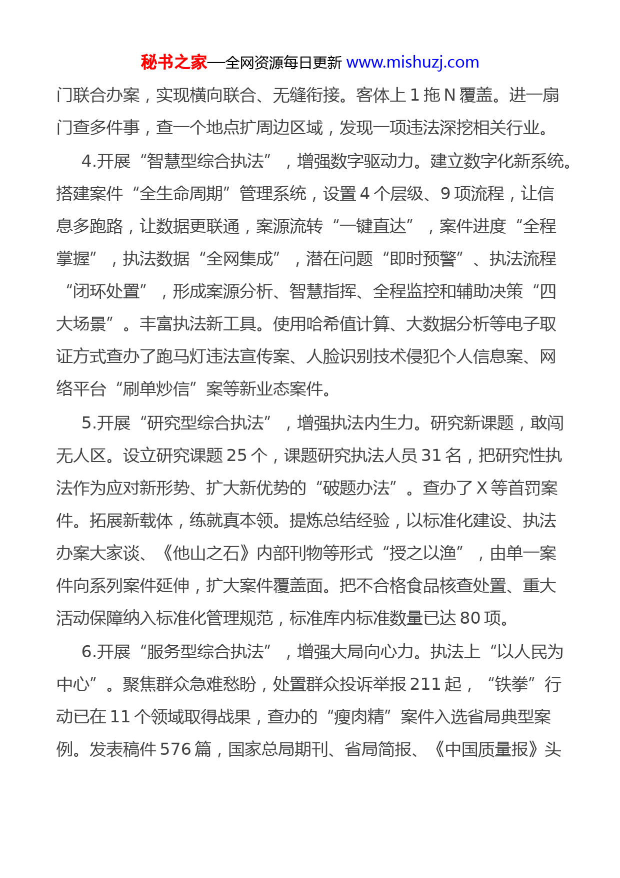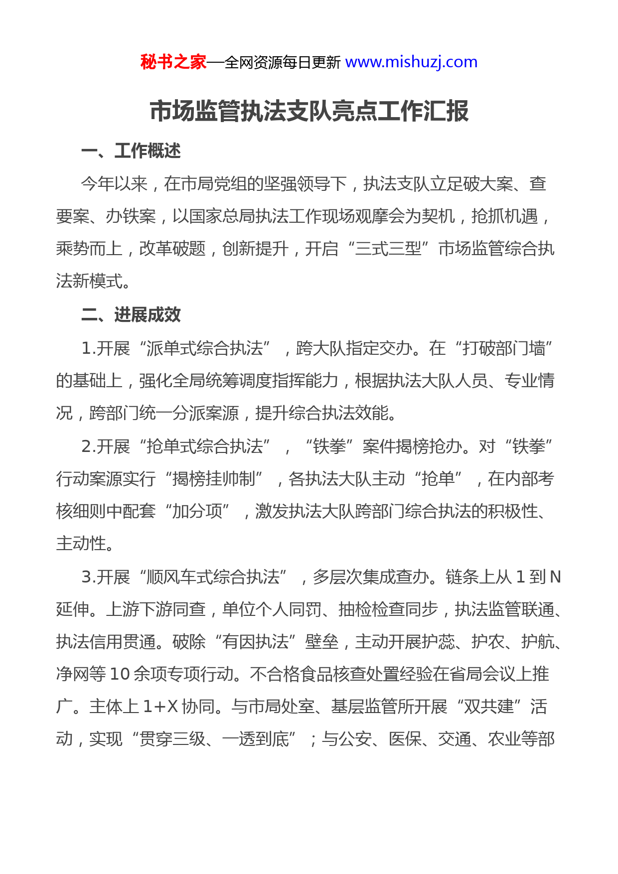 秘书之家—全网资源每日更新www.mishuzj.com市场监管执法支队亮点工作汇报一、工作概述今年以来,在市局党组的坚强领导下,执法支队立足破大案、查要案、办铁案,以国家总局执法工作现场观摩会为契机,抢抓机遇,乘势而上,改革破题,创新提升,开启“三式三型”市场监管综合执法新模式。二、进展成效1.开展“派单式综合执法”,跨大队指定交办。在“打破部门墙”的基础上,强化全局统筹调度指挥能力,根据执法大队人员、专业情况,跨部门统一分派案源,提升综合执法效能。2.开展“抢单式综合执法”,“铁拳”案件揭榜抢办。对“铁拳”行动案源实行“揭榜挂帅制”,各执法大队主动“抢单”,在内部考核细则中配套“加分项”,激发执法大队跨部门综合执法的积极性、主动性。3.开展“顺风车式综合执法”,多层次集成查办。链条上从1到N延伸。上游下游同查,单位个人同罚、抽检检查同步,执法监管联通、执法信用贯通。破除“有因执法”壁垒,主动开展护蕊、护农、护航、净网等10余项专项行动。不合格食品核查处置经验在省局会议上推广。主体上1+X协同。与市局处室、基层监管所开展“双共建”活动,实现“贯穿三级、一透到底”;与公安、医保、交通、农业等部秘书之家—全网资源每日更新www.mishuzj.com门联合办案,实现横向联合、无缝衔接。客体上1拖N覆盖。进一扇门查多件事,查一个地点扩周边区域,发现一项违法深挖相关行业。4.开展“智慧型综合执法”,增强数字驱动力。建立数字化新系统。搭建案件“全生命周期”管理系统,设置4个层级、9项流程,让信息多跑路,让数据更联通,案源流转“一键直达”,案件进度“全程掌握”,执法数据“全网集成”,潜在问题“即时预警”、执法流程“闭环处置”,形成案源分析、智慧指挥、全程监控和辅助决策“四大场景”。丰富执法新工具。使用哈希值计算、大数据分析等电子取证方式查办了跑马灯违法宣传案、人脸识别技术侵犯个人信息案、网络平台“刷单炒信”案等新业态案件。5.开展“研究型综合执法”,增强执法内生力。研究新课题,敢闯无人区。设立研究课题25个,课题研究执法人员31名,把研究性执法作为应对新形势、扩大新优势的“破题办法”。查办了X等首罚案件。拓展新载体,练就真本领。提炼总结经验,以标准化建设、执法办案大家谈、《他山之石》内部刊物等形式“授之以渔”,由单一案件向系列案件延伸,扩大案件覆盖面。把不合格食品核查处置、重大活动保障纳入标准化管理规范,标准库内标准数量已达80项。6.开展“服务型综合执法”,增强大局向心力。执法上“以人民为中心”。聚焦群众急难愁盼,处置群众投诉举报211起,“铁拳”行动已在11个领域取得战果,查办的“瘦肉精”案件入选省局典型案例。发表稿件576篇,国家总局期刊、省局简报、《中国质量报》头秘书之家—全网资源每日更新www.mishuzj.com版刊发支队经验做法5篇。理念上“想到穷尽、干到极致”。努力落实市局安排的每一项部署、交办的每一项工作。行动上“向最好者学习、与最强者比拼、跟最快者赛跑”。紧盯全国、全省典型案例、典型做法,深化改革、锐意创新,确保执法工作始终处于时代前沿。营商环境建设上“没有最好,只有更好”。加强“双打”工作,督促转供电等惠企政策落地,完成重大活动保障19次,发放《风险预警告知单》51份,对54家轻微违法单位不予处罚。三、下步举措一是在“铁拳”行动上提升“领先度”。案件数量、大要案数量全省领先、全国前列。二是在典型宣传上拓展“辐射度”。加强提炼总结、举一反三和宣传推广。三是在综合执法上跑出“加速度”。大幅度提升“打破部门墙”案件比重,提高执法效率。四是在社会影响上增强“标识度”。让群众认可、社会关注、上级肯定,打出执法声威,打出敬畏感。五是在服务大局上提高“有效度”。围绕市局中心工作,以优异成绩献礼建党100周年。