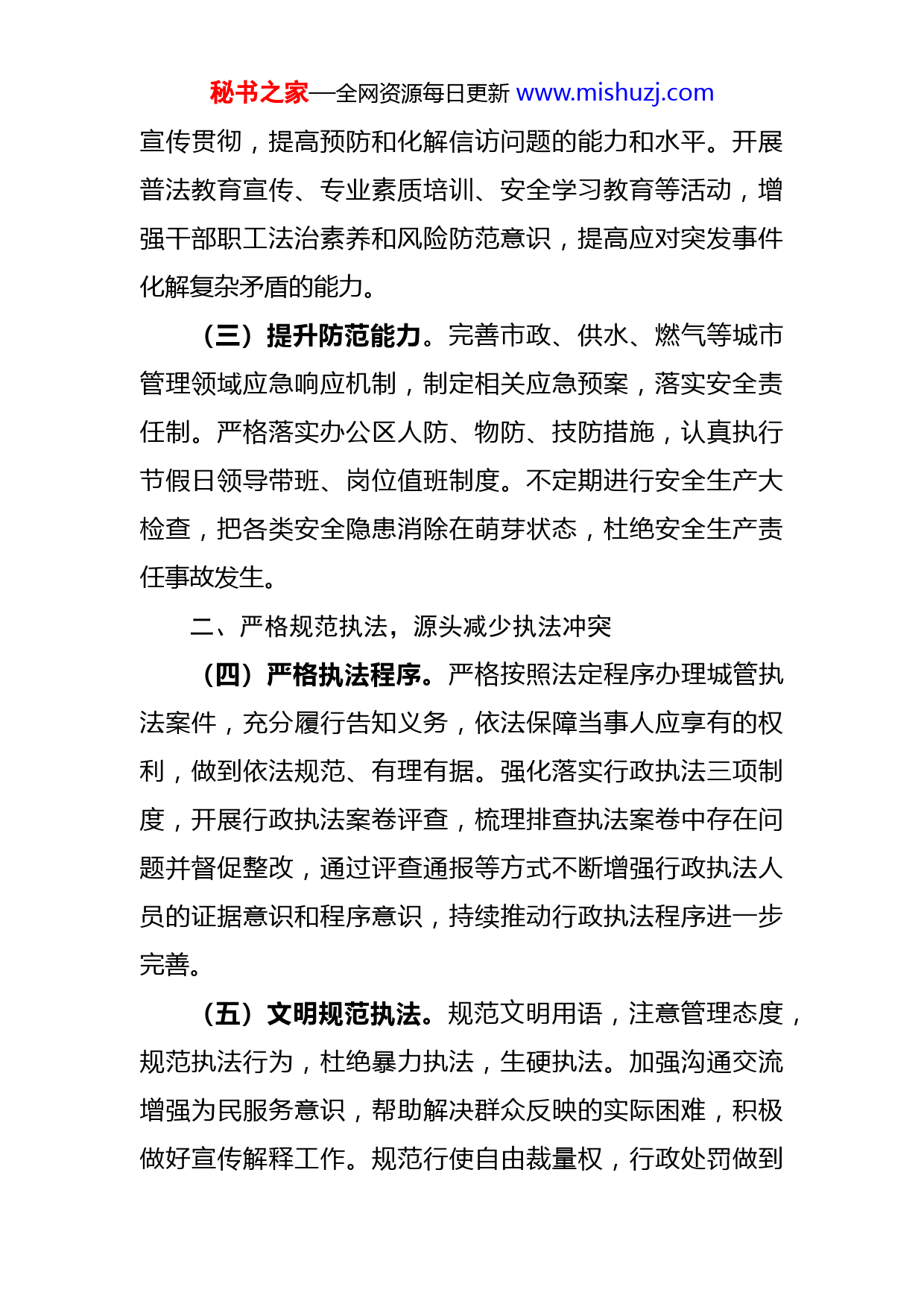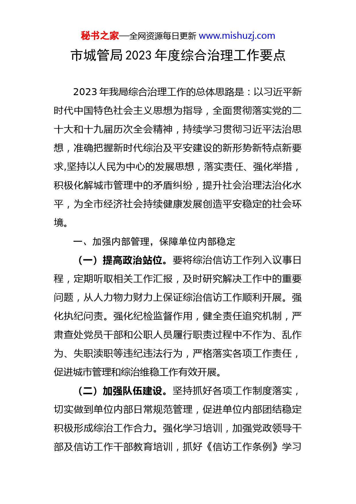 秘书之家—全网资源每日更新www.mishuzj.com市城管局2023年度综合治理工作要点2023年我局综合治理工作的总体思路是:以习近平新时代中国特色社会主义思想为指导,全面贯彻落实党的二十大和十九届历次全会精神,持续学习贯彻习近平法治思想,准确把握新时代综治及平安建设的新形势新特点新要求,坚持以人民为中心的发展思想,落实责任、强化举措,积极化解城市管理中的矛盾纠纷,提升社会治理法治化水平,为全市经济社会持续健康发展创造平安稳定的社会环境。一、加强内部管理,保障单位内部稳定(一)提高政治站位。要将综治信访工作列入议事日程,定期听取相关工作汇报,及时研究解决工作中的重要问题,从人力物力财力上保证综治信访工作顺利开展。强化执纪问责。强化纪检监督作用,健全责任追究机制,严肃查处党员干部和公职人员履行职责过程中不作为、乱作为、失职渎职等违纪违法行为,严格落实各项工作责任,促进城市管理和综治维稳工作有效开展。(二)加强队伍建设。坚持抓好各项工作制度落实,切实做到单位内部日常规范管理,促进单位内部团结稳定积极形成综治工作合力。强化学习培训,加强党政领导干部及信访工作干部教育培训,抓好《信访工作条例》学习秘书之家—全网资源每日更新www.mishuzj.com宣传贯彻,提高预防和化解信访问题的能力和水平。开展普法教育宣传、专业素质培训、安全学习教育等活动,增强干部职工法治素养和风险防范意识,提高应对突发事件化解复杂矛盾的能力。(三)提升防范能力。完善市政、供水、燃气等城市管理领域应急响应机制,制定相关应急预案,落实安全责任制。严格落实办公区人防、物防、技防措施,认真执行节假日领导带班、岗位值班制度。不定期进行安全生产大检查,把各类安全隐患消除在萌芽状态,杜绝安全生产责任事故发生。二、严格规范执法,源头减少执法冲突(四)严格执法程序。严格按照法定程序办理城管执法案件,充分履行告知义务,依法保障当事人应享有的权利,做到依法规范、有理有据。强化落实行政执法三项制度,开展行政执法案卷评查,梳理排查执法案卷中存在问题并督促整改,通过评查通报等方式不断增强行政执法人员的证据意识和程序意识,持续推动行政执法程序进一步完善。(五)文明规范执法。规范文明用语,注意管理态度,规范执法行为,杜绝暴力执法,生硬执法。加强沟通交流增强为民服务意识,帮助解决群众反映的实际困难,积极做好宣传解释工作。规范行使自由裁量权,行政处罚做到秘书之家—全网资源每日更新www.mishuzj.com裁量适当、客观公正,杜绝随意执法,选择执法,切实防止裁量畸轻畸重。(六)推进免罚制度。根据《XX省住房城乡建设轻微违法行为免予行政处罚清单》,结合我市城市管理工作实际,制定《XX市城管执法轻微违法违规行为免罚清单》,积极探索拓宽轻微违法违规行为免罚领域,充分运用于日常城市管理和执法过程中,促进公平公正执法,减少执法矛盾冲突。三、抓好信访工作,依法化解矛盾纠纷(七)落实信访机制。加大领导干部联动接访力度,制定落实《市城管局进一步规范和加强市及其以上交办信访事项办理工作实施细则》,完善领导干部接访下访和阅批群众来信制度;主动接受社会监督,依法规范公众参与城市治理的范围、权利和途径,开拓信访信息归集渠道,不断完善“信、访、电、网、端”五位一体举报受理平台最大限度减少重复信访,扩大党务精品QQ群824703735为党务工作者提供大量资料,每天更新50多篇,请加QQ:962665491进行咨询!手机信访、微信信访等“掌上信访”覆盖面,推进更高水平的阳光信访。用好群众满意度评价结果,对评价不满意事项加大督查督办力度,倒逼改进工作。(八)强化纠纷排查。排查社会风险盲区,认真梳理秘书之家—全网资源每日更新www.mishuzj.com排查各类矛盾纠纷,建立工作台账,做到“底数清、情况明、有分析、有对策”;对排查掌握的重点人员,坚持包保责任制,加强掌控、安抚和化解工作;对排查出的问题落实信访责任和化解措施,加强跟踪督办,及时发现和化解不稳定因素,做好矛盾纠纷排查调处工作,积极破解社会矛盾隐患。(九)多元化解纠纷。推深做实“重诺言、畅两信、决诉求”工作,紧盯群众诉求,畅通群众信访、投诉渠道引导群众按照法定途径和程序,理性反映诉求;综合运用政策、经济、行政等手段,以及协商、调解、疏导等措施解决群众急难愁盼问题;推进诉访分离,引导信访人员通过行政复议、诉讼等法定途径解决问题,做好涉法涉诉事项终结后的教育疏导、帮扶救助、矛盾化解和落实稳控等工作,扎实推动问题解决。四、深入联系基层,促进基层和谐稳定(十)加强联系基层。加强与综治联系点霍邱县岔路镇联系,定期开展走访调研,深入了解联系点综治建设情况与工作开展中遇到的实际困难,加强实地督导,指导制定改进措施,切实帮助联系点开展平安建设工作,帮助解决实际困难。加强乡村振兴和结对共建工作,落实各项政策措施,加强地方平安建设,促进当地和谐稳定。坚持常态化扫黑除恶,构建良好社会风气。秘书之家—全网资源每日更新www.mishuzj.com(十一)突出专项整治。坚持打击、宣传、普法同频共振,切实加强对城管重点领域涉黑涉恶情况的线索收集和流转报送工作;及时总结分析城管领域涉黑涉恶情况