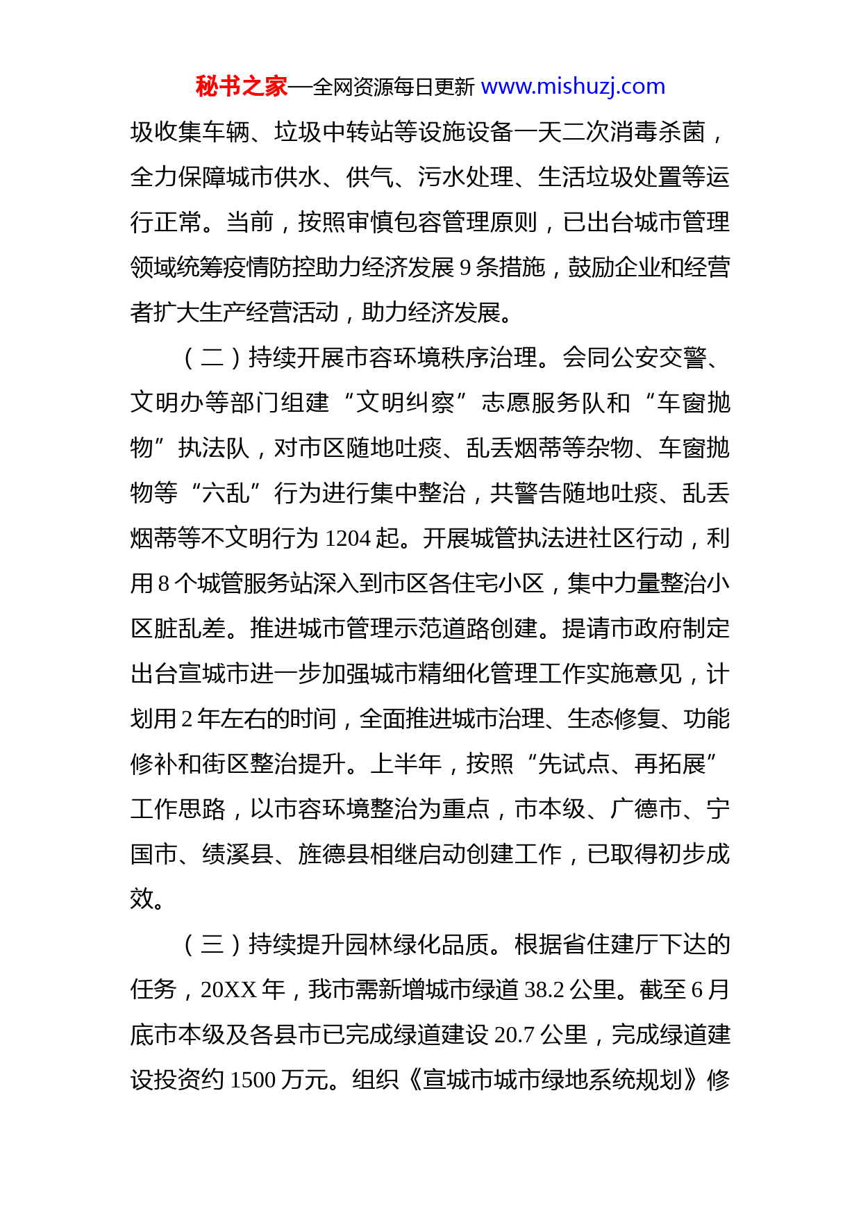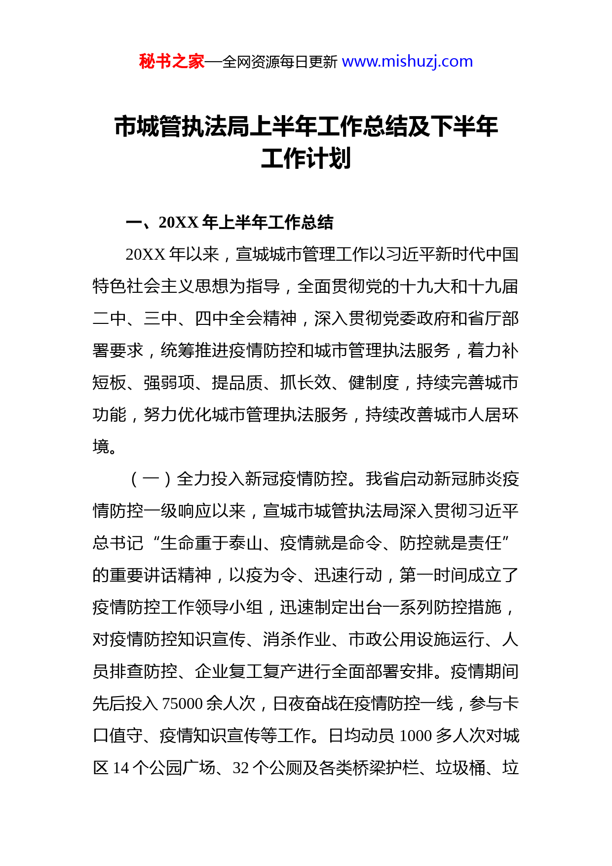 秘书之家—全网资源每日更新www.mishuzj.com市城管执法局上半年工作总结及下半年工作计划一、20XX年上半年工作总结20XX年以来,宣城城市管理工作以习近平新时代中国特色社会主义思想为指导,全面贯彻党的十九大和十九届二中、三中、四中全会精神,深入贯彻党委政府和省厅部署要求,统筹推进疫情防控和城市管理执法服务,着力补短板、强弱项、提品质、抓长效、健制度,持续完善城市功能,努力优化城市管理执法服务,持续改善城市人居环境。(一)全力投入新冠疫情防控。我省启动新冠肺炎疫情防控一级响应以来,宣城市城管执法局深入贯彻习近平总书记“生命重于泰山、疫情就是命令、防控就是责任”的重要讲话精神,以疫为令、迅速行动,第一时间成立了疫情防控工作领导小组,迅速制定出台一系列防控措施,对疫情防控知识宣传、消杀作业、市政公用设施运行、人员排查防控、企业复工复产进行全面部署安排。疫情期间先后投入75000余人次,日夜奋战在疫情防控一线,参与卡口值守、疫情知识宣传等工作。日均动员1000多人次对城区14个公园广场、32个公厕及各类桥梁护栏、垃圾桶、垃秘书之家—全网资源每日更新www.mishuzj.com圾收集车辆、垃圾中转站等设施设备一天二次消毒杀菌,全力保障城市供水、供气、污水处理、生活垃圾处置等运行正常。当前,按照审慎包容管理原则,已出台城市管理领域统筹疫情防控助力经济发展9条措施,鼓励企业和经营者扩大生产经营活动,助力经济发展。(二)持续开展市容环境秩序治理。会同公安交警、文明办等部门组建“文明纠察”志愿服务队和“车窗抛物”执法队,对市区随地吐痰、乱丢烟蒂等杂物、车窗抛物等“六乱”行为进行集中整治,共警告随地吐痰、乱丢烟蒂等不文明行为1204起。开展城管执法进社区行动,利用8个城管服务站深入到市区各住宅小区,集中力量整治小区脏乱差。推进城市管理示范道路创建。提请市政府制定出台宣城市进一步加强城市精细化管理工作实施意见,计划用2年左右的时间,全面推进城市治理、生态修复、功能修补和街区整治提升。上半年,按照“先试点、再拓展”工作思路,以市容环境整治为重点,市本级、广德市、宁国市、绩溪县、旌德县相继启动创建工作,已取得初步成效。(三)持续提升园林绿化品质。根据省住建厅下达的任务,20XX年,我市需新增城市绿道38.2公里。截至6月底市本级及各县市已完成绿道建设20.7公里,完成绿道建设投资约1500万元。组织《宣城市城市绿地系统规划》修秘书之家—全网资源每日更新www.mishuzj.com编,修订《宣城市城市园林绿化导则》,从园林绿地规划设计、绿化施工、绿化养护三大方面对城市园林绿化工作提供技术指导。上半年以来,共实施草坪补播面积120万平方米,完成乔木修剪18万株、色块苗木达131万平方米。宣城高速东、北出入口区域绿化改造提升工程正有序推进。(四)加快推进地下管网地理信息系统和安全运行监测系统建设。市本级市本级投资5000万元,完成了地下管线探测普查和复核等工作,城市地下管网地理信息系统和安全运行监测系统已基本建成,正在调试完善。各县(市)已相继启动实施了城市地下管网地理信息系统和安全在线监测系统建设。其中,泾县城市地下管网地理信息系统已建成,正在加快建设安全运行监测系统。旌德县已完成管网普查。(五)稳步推进城镇污水提质增效行动。20XX年全市污水配套管网改造整治目标任务45公里,其中雨污分流管网改造年度任务17公里,截至到目前,累计管网改造16.7公里,其中雨污分流管网改造8.65公里。郎溪污水处理厂二期项目立项、选址意见书审批、可行性研究等前期工作已基本完成。宁国城北污水处理厂已开工建设,正在进行高效沉淀池、二沉池、反硝化深床滤池、综合楼、改良生物池等12座构筑物施工。(六)加快推进生活垃圾处理设施建设。宣城市生活秘书之家—全网资源每日更新www.mishuzj.com垃圾焚烧发电二期项目两条生产线建成运行,日均焚烧生活垃圾1000余吨。上半年,广德市生活垃圾焚烧发电项目、宁国市生活垃圾焚烧发电项目加快推进,已完成工程量的90%。泾县-旌德-绩溪综合生活垃圾焚烧发电项目完成前期选址。截至5月底,全市已建成运行生活垃圾无害化处置设施8个,日均无害化处置能力2227吨,其中生活垃圾焚烧能力1700吨/日。(七)稳步推开生活垃圾分类。《宣城市生活垃圾分类管理办法》以市政府令公布,已于20XX年5月1日起正式施行。联合市发改委等10部门出台《宣城市推进城市生活垃圾分类工作实施意见》,明确任务,明确要求,坚持党建引领,以社区为着力点,充分发动人民群众,积极培育垃圾分类新时尚。目前,市本级已分别在党政机关、窗口单位、学校开展生活垃圾强制分类。(八)稳步推进城镇公厕提升行动。制定出台宣城市城镇公厕提升行动三年计划,按照二类以上标准新建改建城市公厕,引导城市各类公厕开放。20XX年省厅下达新建、改建以及引导开放公厕135座工作任务,实现时间过半、工作任务完成过半。(九)有序推进停车场建设行动。按照省厅等八部门印发的《安徽省城市停车场建设行动方案》(建成【2019】120号部署,提请市政府制定出台《宣城市城市停秘书之家—全网资源每日更新www.mishuzj.com车场建设实施方案》,计划三年全市新增公共停车泊位7700个,持续