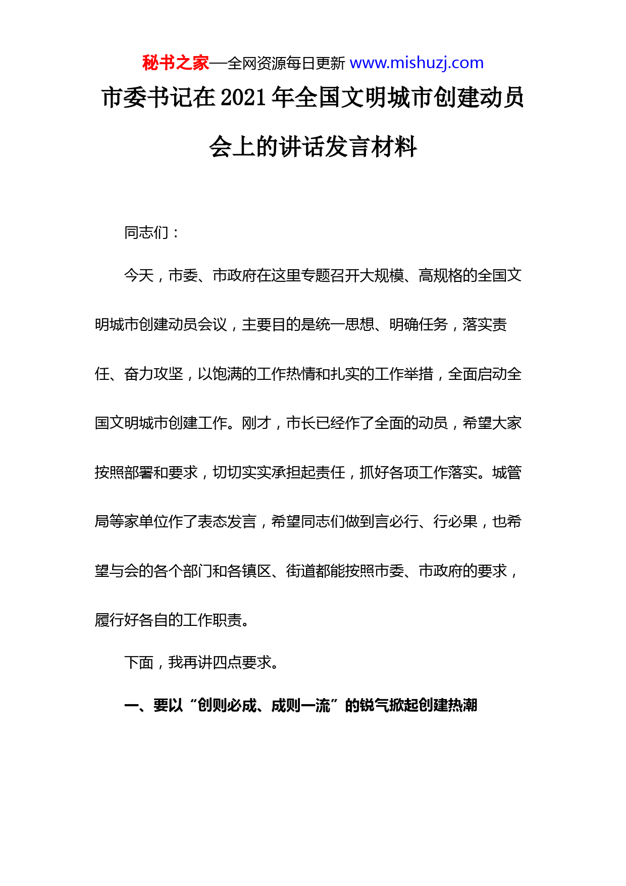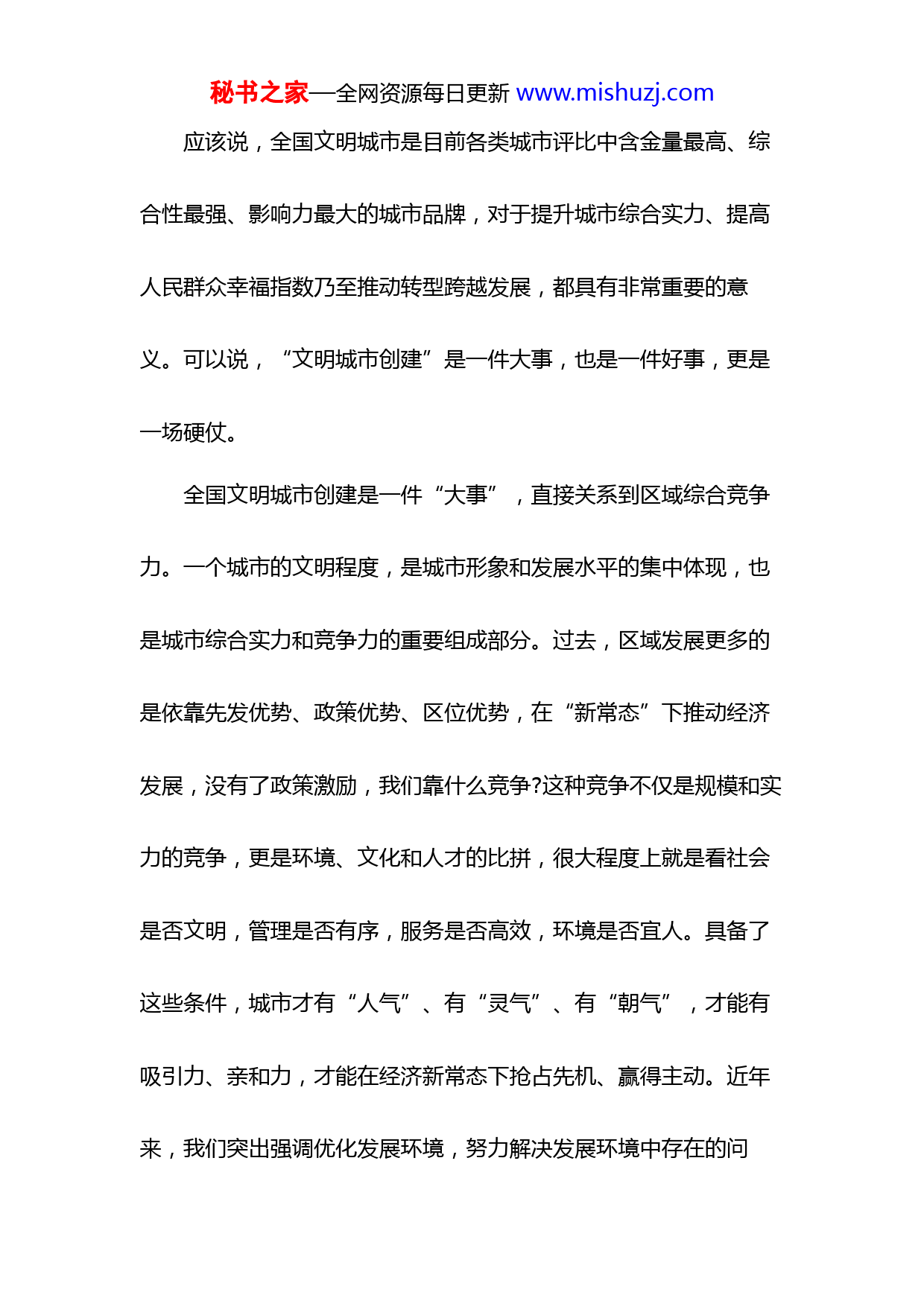 秘书之家—全网资源每日更新www.mishuzj.com市委书记在2021年全国文明城市创建动员会上的讲话发言材料同志们:今天,市委、市政府在这里专题召开大规模、高规格的全国文明城市创建动员会议,主要目的是统一思想、明确任务,落实责任、奋力攻坚,以饱满的工作热情和扎实的工作举措,全面启动全国文明城市创建工作。刚才,市长已经作了全面的动员,希望大家按照部署和要求,切切实实承担起责任,抓好各项工作落实。城管局等家单位作了表态发言,希望同志们做到言必行、行必果,也希望与会的各个部门和各镇区、街道都能按照市委、市政府的要求,履行好各自的工作职责。下面,我再讲四点要求。一、要以“创则必成、成则一流”的锐气掀起创建热潮秘书之家—全网资源每日更新www.mishuzj.com应该说,全国文明城市是目前各类城市评比中含金量最高、综合性最强、影响力最大的城市品牌,对于提升城市综合实力、提高人民群众幸福指数乃至推动转型跨越发展,都具有非常重要的意义。可以说,“文明城市创建”是一件大事,也是一件好事,更是一场硬仗。全国文明城市创建是一件“大事”,直接关系到区域综合竞争力。一个城市的文明程度,是城市形象和发展水平的集中体现,也是城市综合实力和竞争力的重要组成部分。过去,区域发展更多的是依靠先发优势、政策优势、区位优势,在“新常态”下推动经济发展,没有了政策激励,我们靠什么竞争?这种竞争不仅是规模和实力的竞争,更是环境、文化和人才的比拼,很大程度上就是看社会是否文明,管理是否有序,服务是否高效,环境是否宜人。具备了这些条件,城市才有“人气”、有“灵气”、有“朝气”,才能有吸引力、亲和力,才能在经济新常态下抢占先机、赢得主动。近年来,我们突出强调优化发展环境,努力解决发展环境中存在的问秘书之家—全网资源每日更新www.mishuzj.com题,这也正是创建文明城市的重要内容。从这个意义上说,文明城市创建决不是临时性任务,而是长远发展的需要;决不是一项孤立的活动,而是涵盖各方面工作的系统工程;决不仅仅是为了争一项荣誉、夺一块牌子,而是提升区域综合竞争力的基础性工作。全国文明城市创建也是一件“好事”,直接影响到人民群众的“幸福指数”。人以城为“家”,城以人为“本”。随着经济的发展和生活水平的提高,群众对生活环境和生活质量提出了更高的要求。老百姓不仅要吃好穿好住好,还要求出行方便、社会安全、环境舒心,还希望文化丰富、精神充实、人际和谐。从我市的情况看,虽然城市建设和城市面貌近年来有了较大改善,但离群众的期望还有不小差距,城市功能不完善、设施不配套、环境不整洁、管理不到位等问题还比较突出。从市民反映的情况看,大家不满意的问题,很多与城市建设和管理有关系。群众的一大期盼,就是希望生活的城市尽快美起来、亮起来。作为城市的管理者,群众的愿望和呼声,就是我们努力的方向和重点。文明城市创建涉及的指标,秘书之家—全网资源每日更新www.mishuzj.com突出了群众生活质量和民生水平。我们创建文明城市,就是要从群众普遍关心的具体问题着手,从群众不满意的事情抓起,改善生活环境、创造文明生活,使我们的城市更加宜业、宜商、宜学、宜游、宜居。可以说,创建文明城市是不折不扣的惠民利民之举,是一件让群众舒心、满意、高兴的实事好事。全国文明城市创建更是一场“硬仗”,直接检验我们的干部作风和能力。作为一座历史文化名城,已经连续获得了省文明城市,在这轮全国文明城市评选活动中,我市获得了提名资格,这为在更高层次上开展创建工作积累了经验、奠定了基础。但同时必须看到,与以往相比,创建文明城市的指标体系有了很大调整,重点突出了培育和践行社会主义核心价值观、诚信建设制度化、志愿服务制度化,并坚持把未成年人工作作为文明城市考核的前置条件。对照新指标,我们还有很多地方达不到要求,存在较大差距和很多薄弱环节。刚刚市长列举了很多薄弱环节,有城市环境建设方面,也有社区文明创建方面,这些薄弱点都要在创建的过程中逐一消除。秘书之家—全网资源每日更新www.mishuzj.com特别要看到,这一轮创建工作竞争十分激烈,兄弟城市创建工作力度很大、势头很猛。全国多个县中,目前只有家获得全国文明城市的荣誉。经过了年获得提名资格,前后经过年的努力才取得成功。地区县级市的城市建设水平领先于我们,的县级市由于所在地级市较早创成,已经开展了一轮甚至两轮全国文明城市创建,形成了十分完善的创建机制。应该讲,我们从现在开始全面推进全国文明城市创建工作,要突围而出,面对的压力和挑战很大。可以说,全国文明城市创建工作是一场大仗硬仗。能不能实现创建目标,是对我们整体工作水平的一次严峻考验,也是对各级干部执行能力、工作作风的一个现实检验。全市上下务必增强责任感,以百无一疏的精神、分秒必争的干劲,全力以赴投入到创建工作中去。二、要以“严谨细致、常抓长效”的作风提高创建成效文明城市创建是一个日积月累的过程,是一年一年的提高。只有持之以恒、常抓不懈,才能实现由量的积累向质的飞跃。我们创建迎检的最终目标,就是从现在起到年,用年的时间夺得“国家文秘书之家—全网资源每日更新www.mishuzj.com明