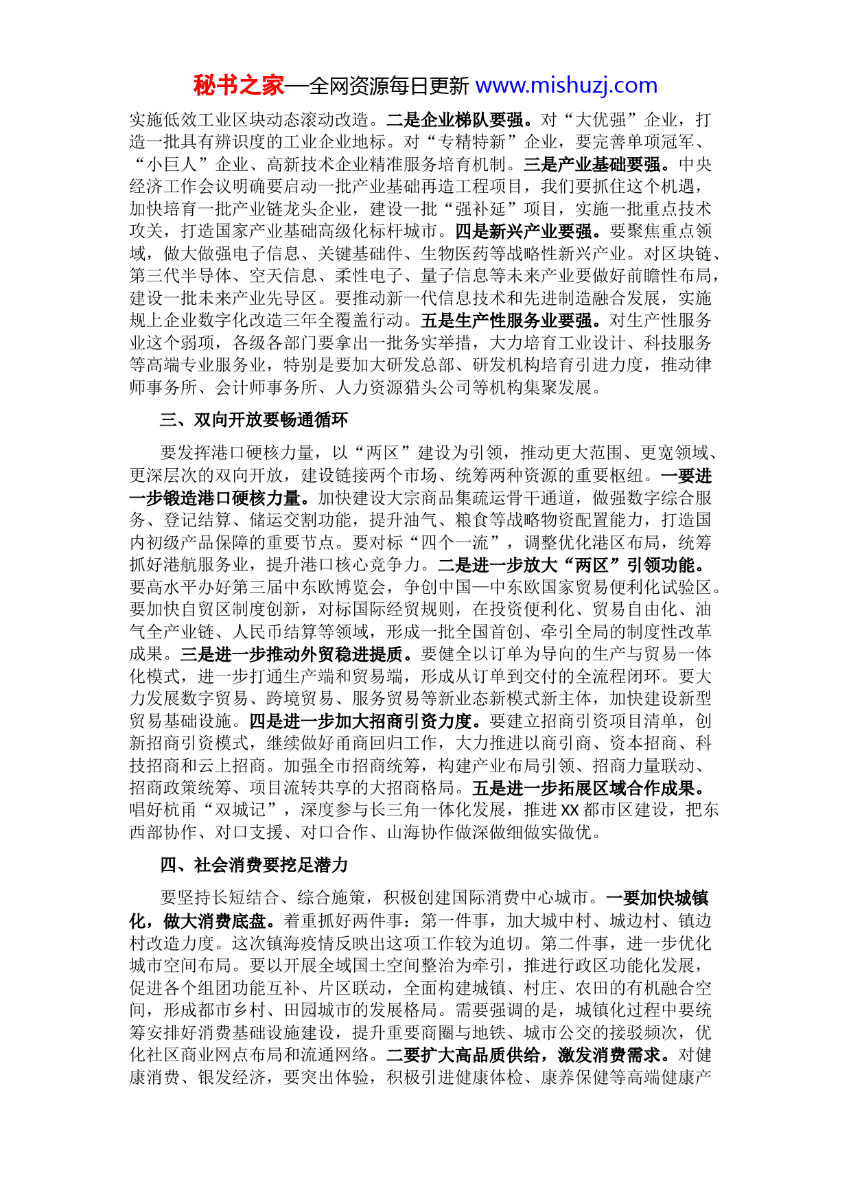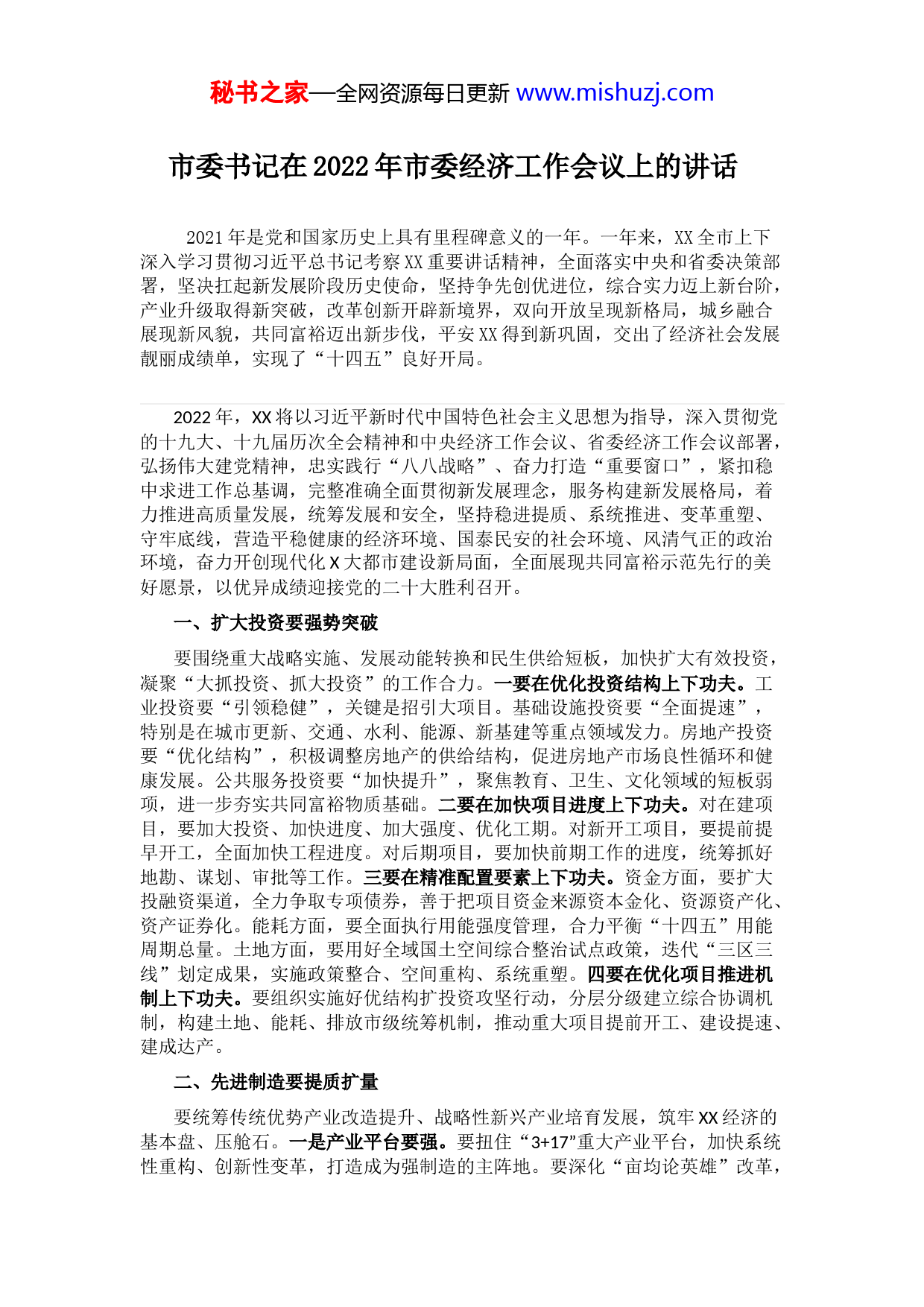 秘书之家—全网资源每日更新www.mishuzj.com市委书记在2022年市委经济工作会议上的讲话2021年是党和国家历史上具有里程碑意义的一年。一年来,XX全市上下深入学习贯彻习近平总书记考察XX重要讲话精神,全面落实中央和省委决策部署,坚决扛起新发展阶段历史使命,坚持争先创优进位,综合实力迈上新台阶,产业升级取得新突破,改革创新开辟新境界,双向开放呈现新格局,城乡融合展现新风貌,共同富裕迈出新步伐,平安XX得到新巩固,交出了经济社会发展靓丽成绩单,实现了“十四五”良好开局。2022年,XX将以习近平新时代中国特色社会主义思想为指导,深入贯彻党的十九大、十九届历次全会精神和中央经济工作会议、省委经济工作会议部署,弘扬伟大建党精神,忠实践行“八八战略”、奋力打造“重要窗口”,紧扣稳中求进工作总基调,完整准确全面贯彻新发展理念,服务构建新发展格局,着力推进高质量发展,统筹发展和安全,坚持稳进提质、系统推进、变革重塑、守牢底线,营造平稳健康的经济环境、国泰民安的社会环境、风清气正的政治环境,奋力开创现代化X大都市建设新局面,全面展现共同富裕示范先行的美好愿景,以优异成绩迎接党的二十大胜利召开。一、扩大投资要强势突破要围绕重大战略实施、发展动能转换和民生供给短板,加快扩大有效投资,凝聚“大抓投资、抓大投资”的工作合力。一要在优化投资结构上下功夫。工业投资要“引领稳健”,关键是招引大项目。基础设施投资要“全面提速”,特别是在城市更新、交通、水利、能源、新基建等重点领域发力。房地产投资要“优化结构”,积极调整房地产的供给结构,促进房地产市场良性循环和健康发展。公共服务投资要“加快提升”,聚焦教育、卫生、文化领域的短板弱项,进一步夯实共同富裕物质基础。二要在加快项目进度上下功夫。对在建项目,要加大投资、加快进度、加大强度、优化工期。对新开工项目,要提前提早开工,全面加快工程进度。对后期项目,要加快前期工作的进度,统筹抓好地勘、谋划、审批等工作。三要在精准配置要素上下功夫。资金方面,要扩大投融资渠道,全力争取专项债券,善于把项目资金来源资本金化、资源资产化、资产证券化。能耗方面,要全面执行用能强度管理,合力平衡“十四五”用能周期总量。土地方面,要用好全域国土空间综合整治试点政策,迭代“三区三线”划定成果,实施政策整合、空间重构、系统重塑。四要在优化项目推进机制上下功夫。要组织实施好优结构扩投资攻坚行动,分层分级建立综合协调机制,构建土地、能耗、排放市级统筹机制,推动重大项目提前开工、建设提速、建成达产。二、先进制造要提质扩量要统筹传统优势产业改造提升、战略性新兴产业培育发展,筑牢XX经济的基本盘、压舱石。一是产业平台要强。要扭住“3+17”重大产业平台,加快系统性重构、创新性变革,打造成为强制造的主阵地。要深化“亩均论英雄”改革,秘书之家—全网资源每日更新www.mishuzj.com实施低效工业区块动态滚动改造。二是企业梯队要强。对“大优强”企业,打造一批具有辨识度的工业企业地标。对“专精特新”企业,要完善单项冠军、“小巨人”企业、高新技术企业精准服务培育机制。三是产业基础要强。中央经济工作会议明确要启动一批产业基础再造工程项目,我们要抓住这个机遇,加快培育一批产业链龙头企业,建设一批“强补延”项目,实施一批重点技术攻关,打造国家产业基础高级化标杆城市。四是新兴产业要强。要聚焦重点领域,做大做强电子信息、关键基础件、生物医药等战略性新兴产业。对区块链、第三代半导体、空天信息、柔性电子、量子信息等未来产业要做好前瞻性布局,建设一批未来产业先导区。要推动新一代信息技术和先进制造融合发展,实施规上企业数字化改造三年全覆盖行动。五是生产性服务业要强。对生产性服务业这个弱项,各级各部门要拿出一批务实举措,大力培育工业设计、科技服务等高端专业服务业,特别是要加大研发总部、研发机构培育引进力度,推动律师事务所、会计师事务所、人力资源猎头公司等机构集聚发展。三、双向开放要畅通循环要发挥港口硬核力量,以“两区”建设为引领,推动更大范围、更宽领域、更深层次的双向开放,建设链接两个市场、统筹两种资源的重要枢纽。一要进一步锻造港口硬核力量。加快建设大宗商品集疏运骨干通道,做强数字综合服务、登记结算、储运交割功能,提升油气、粮食等战略物资配置能力,打造国内初级产品保障的重要节点。要对标“四个一流”,调整优化港区布局,统筹抓好港航服务业,提升港口核心竞争力。二是进一步放大“两区”引领功能。要高水平办好第三届中东欧博览会,争创中国—中东欧国家贸易便利化试验区。要加快自贸区制度创新,对标国际经贸规则,在投资便利化、贸易自由化、油气全产业链、人民币结算等领域,形成一批全国首创、牵引全局的制度性改革成果。三是进一步推动外贸稳进提质。要健全以订单为导向的生产与贸易一体化模式,进一步打通生产端和贸易端,形成从订单到交付的全流程闭环。要大力发展数字贸易、跨境贸易、服务贸易等新业态新模式新主体,加快建设新型贸易基础设施。四是进一步加大招商引资力度。要建立招商引资项