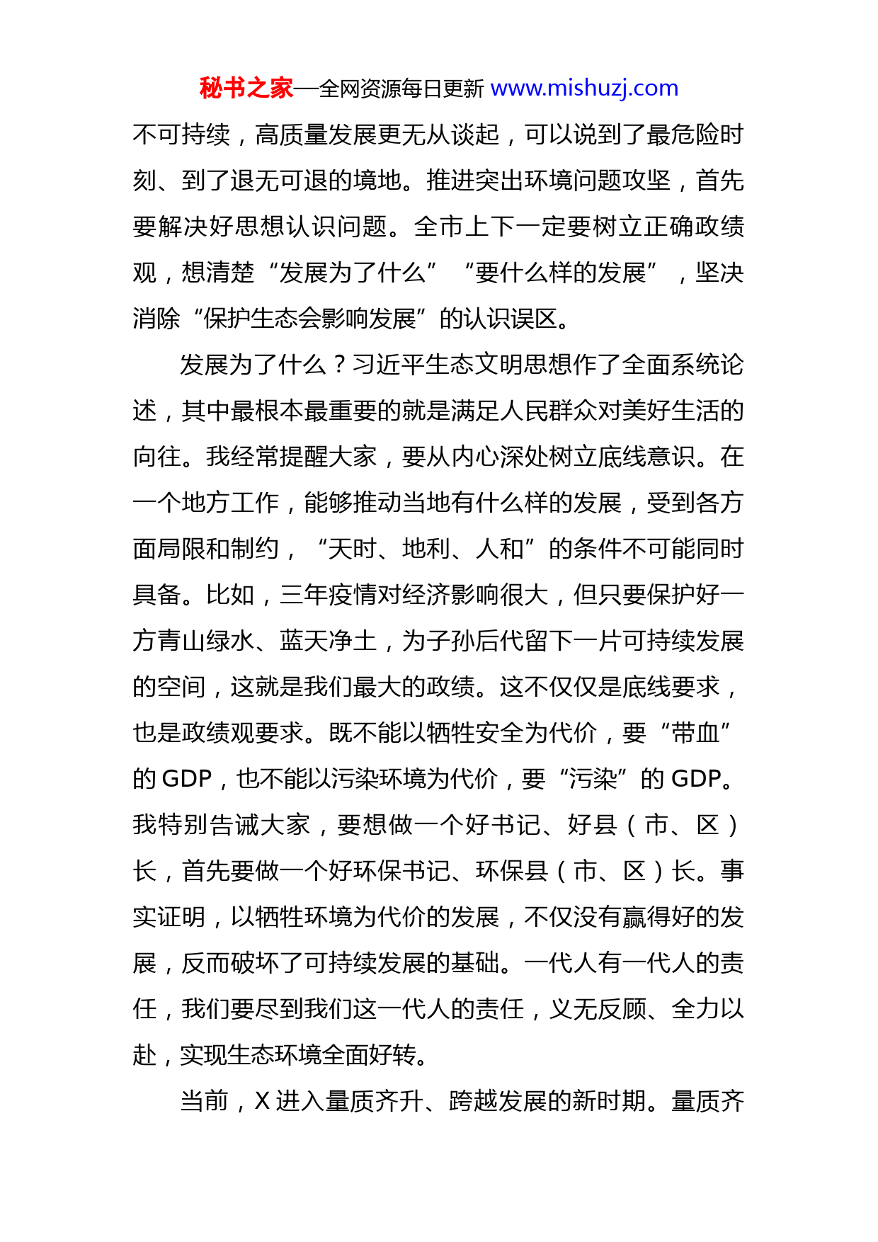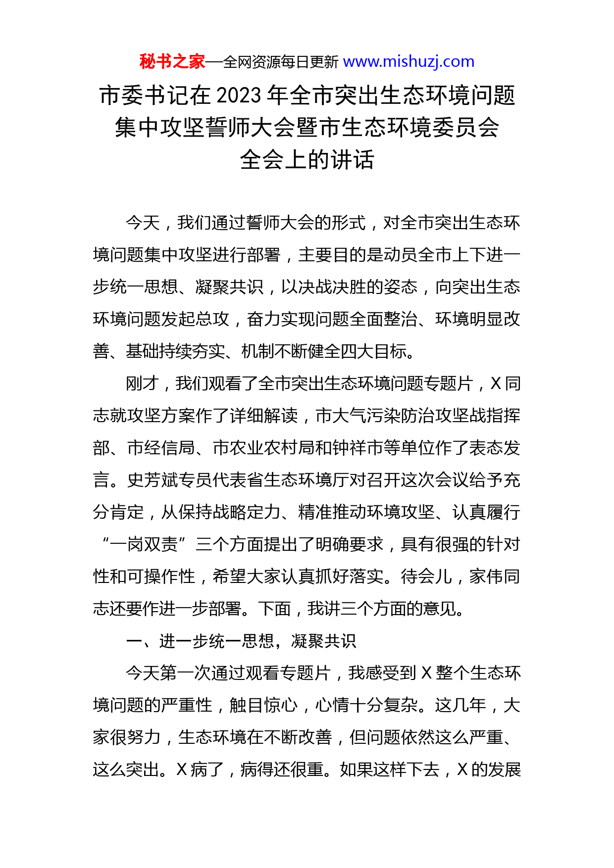 秘书之家—全网资源每日更新www.mishuzj.com市委书记在2023年全市突出生态环境问题集中攻坚誓师大会暨市生态环境委员会全会上的讲话今天,我们通过誓师大会的形式,对全市突出生态环境问题集中攻坚进行部署,主要目的是动员全市上下进一步统一思想、凝聚共识,以决战决胜的姿态,向突出生态环境问题发起总攻,奋力实现问题全面整治、环境明显改善、基础持续夯实、机制不断健全四大目标。刚才,我们观看了全市突出生态环境问题专题片,X同志就攻坚方案作了详细解读,市大气污染防治攻坚战指挥部、市经信局、市农业农村局和钟祥市等单位作了表态发言。史芳斌专员代表省生态环境厅对召开这次会议给予充分肯定,从保持战略定力、精准推动环境攻坚、认真履行“一岗双责”三个方面提出了明确要求,具有很强的针对性和可操作性,希望大家认真抓好落实。待会儿,家伟同志还要作进一步部署。下面,我讲三个方面的意见。一、进一步统一思想,凝聚共识今天第一次通过观看专题片,我感受到X整个生态环境问题的严重性,触目惊心,心情十分复杂。这几年,大家很努力,生态环境在不断改善,但问题依然这么严重、这么突出。X病了,病得还很重。如果这样下去,X的发展秘书之家—全网资源每日更新www.mishuzj.com不可持续,高质量发展更无从谈起,可以说到了最危险时刻、到了退无可退的境地。推进突出环境问题攻坚,首先要解决好思想认识问题。全市上下一定要树立正确政绩观,想清楚“发展为了什么”“要什么样的发展”,坚决消除“保护生态会影响发展”的认识误区。发展为了什么?习近平生态文明思想作了全面系统论述,其中最根本最重要的就是满足人民群众对美好生活的向往。我经常提醒大家,要从内心深处树立底线意识。在一个地方工作,能够推动当地有什么样的发展,受到各方面局限和制约,“天时、地利、人和”的条件不可能同时具备。比如,三年疫情对经济影响很大,但只要保护好一方青山绿水、蓝天净土,为子孙后代留下一片可持续发展的空间,这就是我们最大的政绩。这不仅仅是底线要求,也是政绩观要求。既不能以牺牲安全为代价,要“带血”的GDP,也不能以污染环境为代价,要“污染”的GDP。我特别告诫大家,要想做一个好书记、好县(市、区)长,首先要做一个好环保书记、环保县(市、区)长。事实证明,以牺牲环境为代价的发展,不仅没有赢得好的发展,反而破坏了可持续发展的基础。一代人有一代人的责任,我们要尽到我们这一代人的责任,义无反顾、全力以赴,实现生态环境全面好转。当前,X进入量质齐升、跨越发展的新时期。量质齐秘书之家—全网资源每日更新www.mishuzj.com升,就是不仅要追求量的较快发展,更要追求质的全面提升,没有质的量,没有任何意义和价值。这个要求既是对目前发展阶段的描述,也是这个阶段发展特征和本质要求。这几年,疫情对经济影响很大,全球经济形势都不景气,很多企业、行业遭受了重创,还处在一个恢复期。在这种情况下,推进环境攻坚会不会影响经济发展?我明确告诉大家,不但不会影响,从更长远角度来看,还会全面促进高质量发展。刚才,X同志讲得很好,过去的发展是牺牲环境、消耗资源、无序排放的发展,这种发展不可持续。现在必须淘汰低端落后的产能和业态,为高质量发展打牢基础、腾出空间。X这么好的区位优势、这么好的资源禀赋,上的却是高污染、高排放、高耗能的项目,好企业自然就会避之不及。山是光秃秃的,水是黑乎乎的,天是灰蒙蒙的,路上“狼烟四起”,到处是一幅衰败景象。好企业、高科技成长型企业,谁愿意到这里来,最后只能形成恶性循环。的确,这些企业中有一些纳税大户、就业大户。我们就是要倒逼这些企业要么整改、要么关停。阵痛肯定是有的,一旦治好了这个病,迎来的是更加健康的发展、高质量的发展。这些道理,大家一定要明白。如果因为整治生态环境,影响到一点经济增速,我完全支持。在这个问题上,希望同志们保持战略定力,坚定不移推动生态环境问题整治。秘书之家—全网资源每日更新www.mishuzj.com(一)开展突出生态环境问题集中攻坚,是践行习近平生态文明思想的政治之责。党的十八大以来,习近平总书记站在推动中华民族永续发展的高度,以前所未有的力度抓生态文明建设,生态环境保护发生了历史性转折性全局性变化。党的二十大从加快发展方式绿色转型、深入推进环境污染防治等方面作出总体部署。省委蒙徽书记高度重视流域综合治理,强调要以流域综合治理明确并守住水环境安全、生态安全等底线,推动流域生态文明建设水平整体提升。这些都表明党中央、省委推进生态文明建设的坚强决心。开展突出生态环境问题集中攻坚,就是忠实践行习近平生态文明思想、贯彻落实省委工作要求的政治自觉、行动自觉。(二)开展突出生态环境问题集中攻坚,是推动转型升级、跨越发展的题中之义。X作为传统工业城市,工业底色厚重,产业中低级、产品中低端、企业中低效特征明显,资源能源消耗高、污染排放强度大,发展方式不可持续,已经走到死胡同。我第一次去钟祥,感觉就是“散、小、污,脏、乱、差”。这和X年前X区的城乡面貌、业态非常像,农田种意杨,到处都是木芯板厂、小水泥制管厂、砂石料厂。春节前去柴湖,还看到沿街屠宰牛羊。放眼全国,凡是