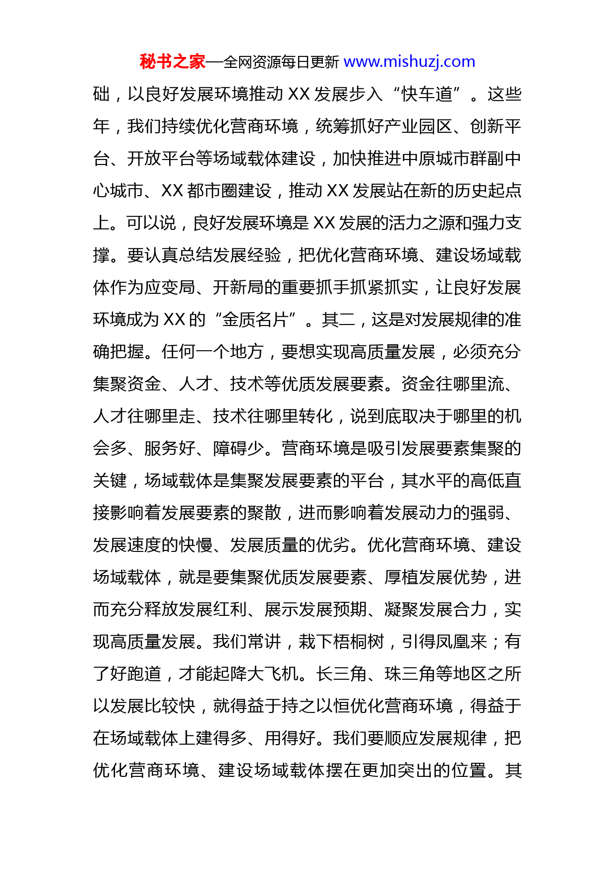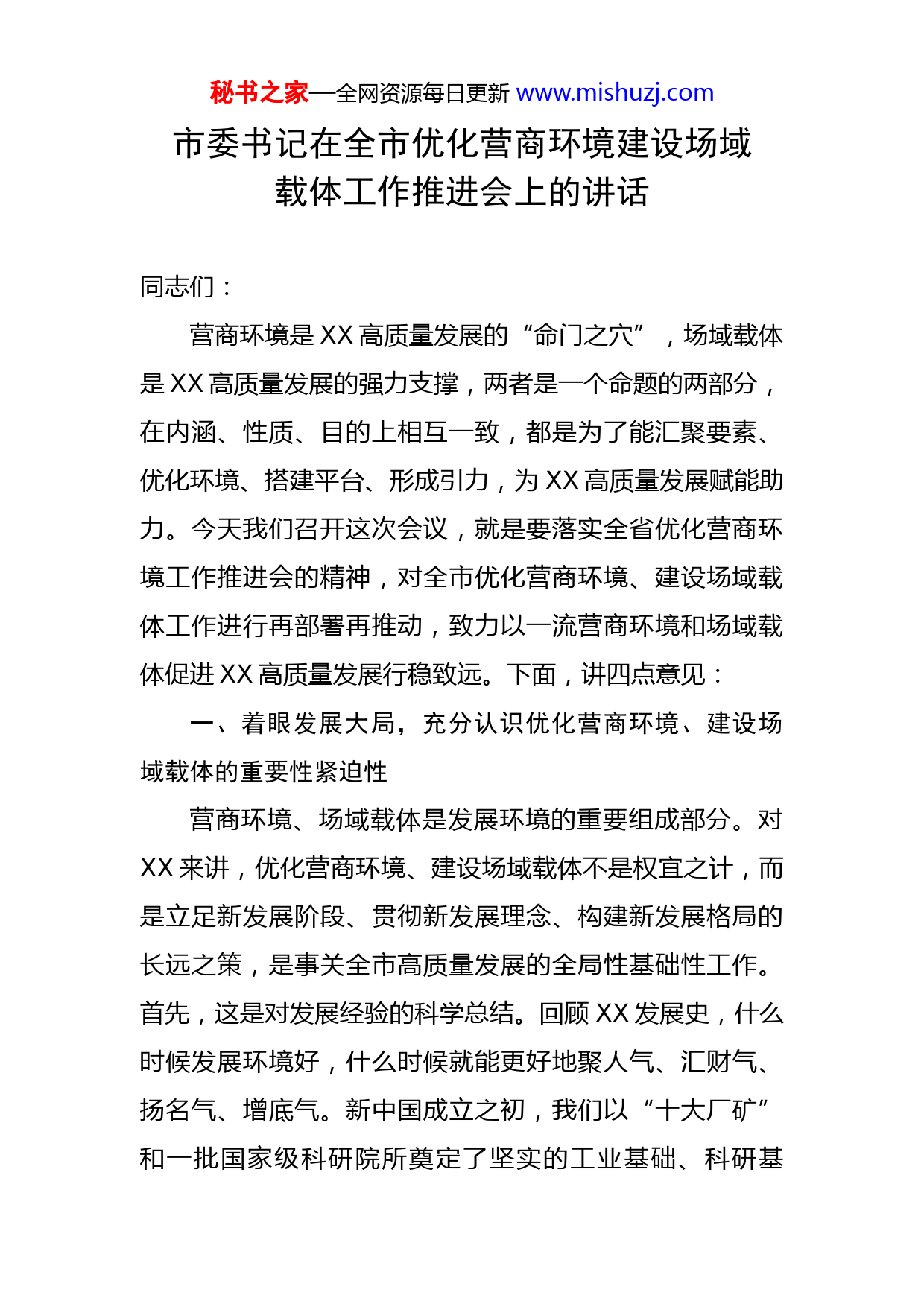 秘书之家—全网资源每日更新www.mishuzj.com市委书记在全市优化营商环境建设场域载体工作推进会上的讲话同志们:营商环境是XX高质量发展的“命门之穴”,场域载体是XX高质量发展的强力支撑,两者是一个命题的两部分,在内涵、性质、目的上相互一致,都是为了能汇聚要素、优化环境、搭建平台、形成引力,为XX高质量发展赋能助力。今天我们召开这次会议,就是要落实全省优化营商环境工作推进会的精神,对全市优化营商环境、建设场域载体工作进行再部署再推动,致力以一流营商环境和场域载体促进XX高质量发展行稳致远。下面,讲四点意见:一、着眼发展大局,充分认识优化营商环境、建设场域载体的重要性紧迫性营商环境、场域载体是发展环境的重要组成部分。对XX来讲,优化营商环境、建设场域载体不是权宜之计,而是立足新发展阶段、贯彻新发展理念、构建新发展格局的长远之策,是事关全市高质量发展的全局性基础性工作。首先,这是对发展经验的科学总结。回顾XX发展史,什么时候发展环境好,什么时候就能更好地聚人气、汇财气、扬名气、增底气。新中国成立之初,我们以“十大厂矿”和一批国家级科研院所奠定了坚实的工业基础、科研基秘书之家—全网资源每日更新www.mishuzj.com础,以良好发展环境推动XX发展步入“快车道”。这些年,我们持续优化营商环境,统筹抓好产业园区、创新平台、开放平台等场域载体建设,加快推进中原城市群副中心城市、XX都市圈建设,推动XX发展站在新的历史起点上。可以说,良好发展环境是XX发展的活力之源和强力支撑。要认真总结发展经验,把优化营商环境、建设场域载体作为应变局、开新局的重要抓手抓紧抓实,让良好发展环境成为XX的“金质名片”。其二,这是对发展规律的准确把握。任何一个地方,要想实现高质量发展,必须充分集聚资金、人才、技术等优质发展要素。资金往哪里流、人才往哪里走、技术往哪里转化,说到底取决于哪里的机会多、服务好、障碍少。营商环境是吸引发展要素集聚的关键,场域载体是集聚发展要素的平台,其水平的高低直接影响着发展要素的聚散,进而影响着发展动力的强弱、发展速度的快慢、发展质量的优劣。优化营商环境、建设场域载体,就是要集聚优质发展要素、厚植发展优势,进而充分释放发展红利、展示发展预期、凝聚发展合力,实现高质量发展。我们常讲,栽下梧桐树,引得凤凰来;有了好跑道,才能起降大飞机。长三角、珠三角等地区之所以发展比较快,就得益于持之以恒优化营商环境,得益于在场域载体上建得多、用得好。我们要顺应发展规律,把优化营商环境、建设场域载体摆在更加突出的位置。其秘书之家—全网资源每日更新www.mishuzj.com三,这是对发展需要的精准应对。当前,XX已经进入高质量发展新阶段,尤为需要通过优化营商环境、建设场域载体来集聚优质发展要素,为实现持续健康发展提供有力支撑。特别是我们要保持经济运行在合理区间,必须通过优化营商环境、建设场域载体来激发市场活力和社会创造力,不能搞“大水漫灌”式强刺激;我们要推动转型发展,必须通过优化营商环境、建设场域载体来深化改革开放创新“三力联动”,不断为经济发展注入新动力、增添新活力、拓展新空间;我们要建设副中心、都市圈,也必须通过优化营商环境、建设场域载体来增强XX聚人聚财聚智慧的“城市拉力”,不断提升发展能级,更好发挥辐射带动作用,促进区域协调发展。要站在推动高质量发展、落实新发展定位的高度,加快打造一流的营商环境和场域载体。近年来,我们把优化营商环境、建设场域载体作为事关全局的大事要事,着力健全工作机制、完善政策体系、创新工作举措,市场化法治化国际化营商环境正在加快构建,在全省营商环境评价中我市连续两年排名第二,场域载体“强磁场”效应初步形成。特别是政务服务水平持续提升,市场发展环境不断改善,监管效能有效提高,场域载体更加优化。通过优化营商环境、建设场域载体,提高了XX的综合竞争力和辐射带动力,XX在全国全省大局中秘书之家—全网资源每日更新www.mishuzj.com的地位更加凸显、优势愈加彰显,越来越多的市场主体看好XX、愿意投资XX。近年来,一大批高端人才、知名企业来洛投资兴业,就体现验证了这一点。同时也要看到,我市在优化营商环境、建设场域载体上还存在很多问题和不足,与城市发展定位、企业和群众期盼还有较大差距。从具体工作看,突出表现为简政放权还不到位,建筑许可、人才落户等审批事项还存在程序多、时间长、效率低等问题,一些领域企业和群众办事尚未真正实现“最多跑一次”;一些行业市场准入限制还比较多,不同程度存在“卷帘门”“玻璃门”“旋转门”现象,民间资本进入仍有障碍;信用体系不够健全,公共信用信息平台建设滞后;基本公共服务体系不完善,医疗卫生、公共文化服务等方面存在不平衡和薄弱环节;不少企业反映税费负担、生产要素成本依然较高,企业融资难融资贵问题依然存在;有的地方甚至还存在欺行霸市、强买强卖、强揽工程等现象。在去年全省营商环境评价中,虽然XX整体排名靠前,但是我市政务服务便利度排名全省第14位,信用环境排名全省第17位;市工商联组织的“千家民营企业评议营商环境”反馈显示,28.6%的企业家认为我市构建“