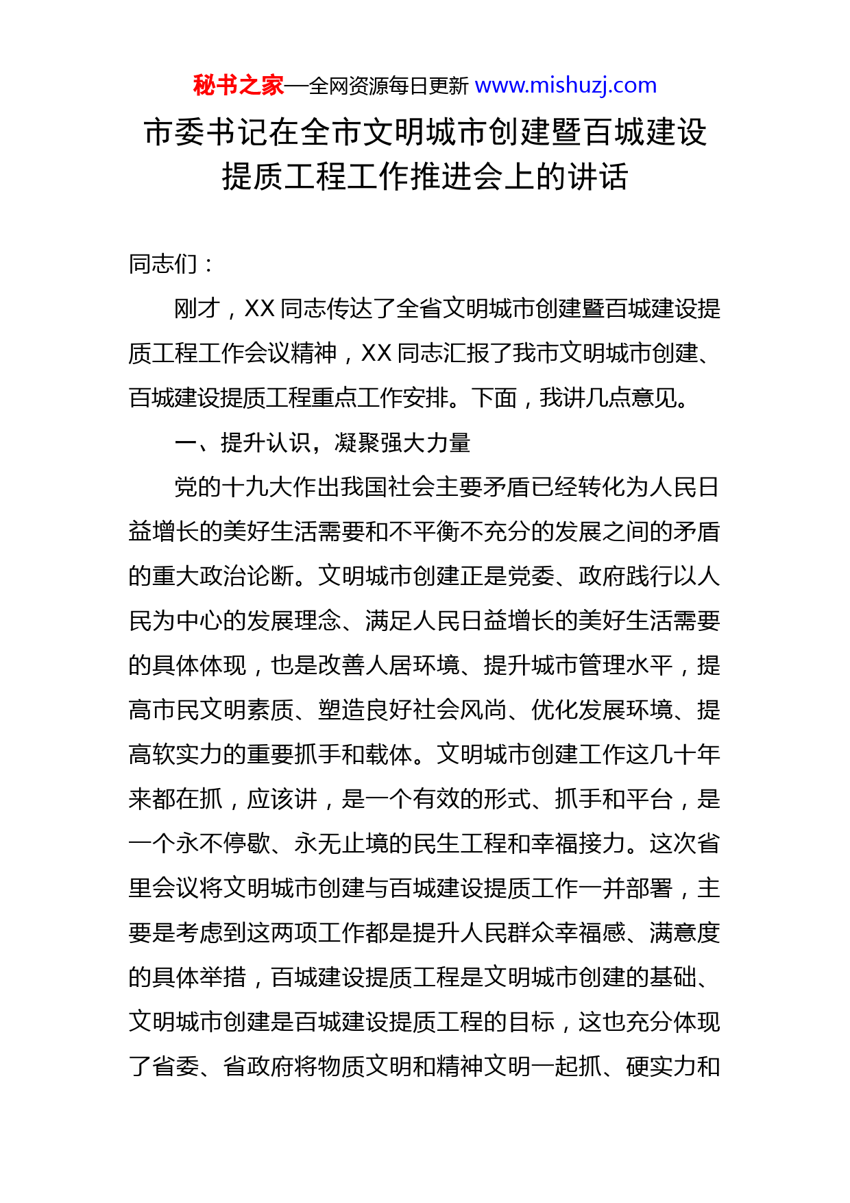 秘书之家—全网资源每日更新www.mishuzj.com市委书记在全市文明城市创建暨百城建设提质工程工作推进会上的讲话同志们:刚才,XX同志传达了全省文明城市创建暨百城建设提质工程工作会议精神,XX同志汇报了我市文明城市创建、百城建设提质工程重点工作安排。下面,我讲几点意见。一、提升认识,凝聚强大力量党的十九大作出我国社会主要矛盾已经转化为人民日益增长的美好生活需要和不平衡不充分的发展之间的矛盾的重大政治论断。文明城市创建正是党委、政府践行以人民为中心的发展理念、满足人民日益增长的美好生活需要的具体体现,也是改善人居环境、提升城市管理水平,提高市民文明素质、塑造良好社会风尚、优化发展环境、提高软实力的重要抓手和载体。文明城市创建工作这几十年来都在抓,应该讲,是一个有效的形式、抓手和平台,是一个永不停歇、永无止境的民生工程和幸福接力。这次省里会议将文明城市创建与百城建设提质工作一并部署,主要是考虑到这两项工作都是提升人民群众幸福感、满意度的具体举措,百城建设提质工程是文明城市创建的基础、文明城市创建是百城建设提质工程的目标,这也充分体现了省委、省政府将物质文明和精神文明一起抓、硬实力和秘书之家—全网资源每日更新www.mishuzj.com软实力一起提升的坚定决心。对此,我们要充分认识到文明城市创建的重要地位和作用,把思想和行动统一到习近平总书记关于文明城市创建工作一系列重要论述上来,统一到省委、省政府和市委、市政府的决策部署上来,立足文明创建抓创建,围绕百城提质抓创建,使XX真正成为创业之城、宜居之地、幸福之家,不断满足广大人民群众对美好生活的向往。二、突出重点,抓住关键环节文明城市创建,量大面宽,任务艰巨繁重,既要坚持统筹兼顾打好总体战,又要聚焦重点难点打好攻坚战。结合XX实际,要凸显三个方面重点。一要以创建惠民生,有效增进群众福祉。人民日益增长的美好生活需要和不平衡不充分的发展之间的矛盾是当前社会发展的主要矛盾,人民群众反对什么、痛恨什么,我们就要坚决防范和纠正什么;人民群众需要什么、希望什么,我们就要谋划和开展什么,做到群众有所呼,党委政府就要有所应;群众有所需,党委政府就要有所为。从文明城市创建开展的“四整治三提升”情况看,有些差距还很大,户外广告专项整治还没有彻底、没有根治;背街小巷专项整治还没有全面开展,也没有统一的示范和标准;交通秩序虽然有了好转,但是违规违章问题依然存在;农贸市场专项整治还没有一个标准化、示范化的、能秘书之家—全网资源每日更新www.mishuzj.com够代表XX水平的农贸市场;书香XX刚起步,声势和力度还不够;城乡共建差距甚远。文明城市创建不仅仅是一个城市的建设管理问题,也是一个居民的权益保障问题,涉及到人民的利益、社会的公平。对此,文明城市创建要坚持以人民为中心的发展思想,紧扣群众需要,顺应群众期盼,全面加强城市绿化、美化、亮化工作,全力加快城市道路、停车场、市民健身场所等基础设施规划和建设,全方位做好市民水、电、讯、气等生活保障,持续开展城区户外广告、老旧小区与背街小巷、交通秩序、农贸市场等四个专项整治和城乡共建、书香XX、精细化管理示范路等三个专项提升工程,不断增加人民群众的满意度和获得感,增强人民群众对XX这座城市的热爱。二要以创建促发展,增强城市综合实力。文明城市创建以物质文明建设作为基础和条件,经济发展是考核的重要内容。在创建过程中,一定要结合党的十九大精神,结合省委、省政府关于加快建设副中心、打造全省增长极的要求,结合市委推进“9+2”工作布局、实现“四高一强一率先”奋斗目标的部署,抓住XX发展的重要战略机遇期,围绕统筹推进“五位一体”总体布局和协调推进“四个全面”战略布局,结合实际践行五大发展理念,以提高发展质量和效益为中心,以供给侧结构性改革为主线,以打好脱贫攻坚战为重点,着力集聚发展优势,着力扩大有效需秘书之家—全网资源每日更新www.mishuzj.com求,着力提升产业水平,着力培育新的发展动能,切实做好稳增长、促改革、调结构、惠民生、防风险各项工作,力争主要经济指标继续赶超进位,为文明城市创建奠定坚实的物质基础。物质文明和精神文明是相辅相成、相得益彰的,物质条件提升了,对精神文明的需求自然会提升。但也有像漯河临颍这样经济实力一般的县区,照样把城市装扮的干干净净、漂漂亮亮。所以,各县(市、区)不要拿经济实力不强当借口。三要以创建强基础,做好城市“四篇文章”。习近平总书记强调,城市是我国经济、政治、文化、社会等方面活动的中心,在党和国家工作全局中具有举足轻重的地位。要把握以城市为重点的创建要求,重点做好规划、建设、管理、经营“四篇文章”。第一、城市规划要提升品位。牢固树立“规划先行”“规划引领”的意识,坚持高起点规划、高标准设计,强化城市风貌,彰显文化内涵,多出精品,不留遗憾。陈润儿省长讲到,许昌市的规划建设管理工作全面系统,做到了一张蓝图绘到底。这是为什么呢?因为如果规划科学合理,就会一任接着一任干;如果规划不科学不合理,那么后任就会改动。一张蓝图绘到底,一方面要求后任坚持过去正确的决策,不另搞一套,