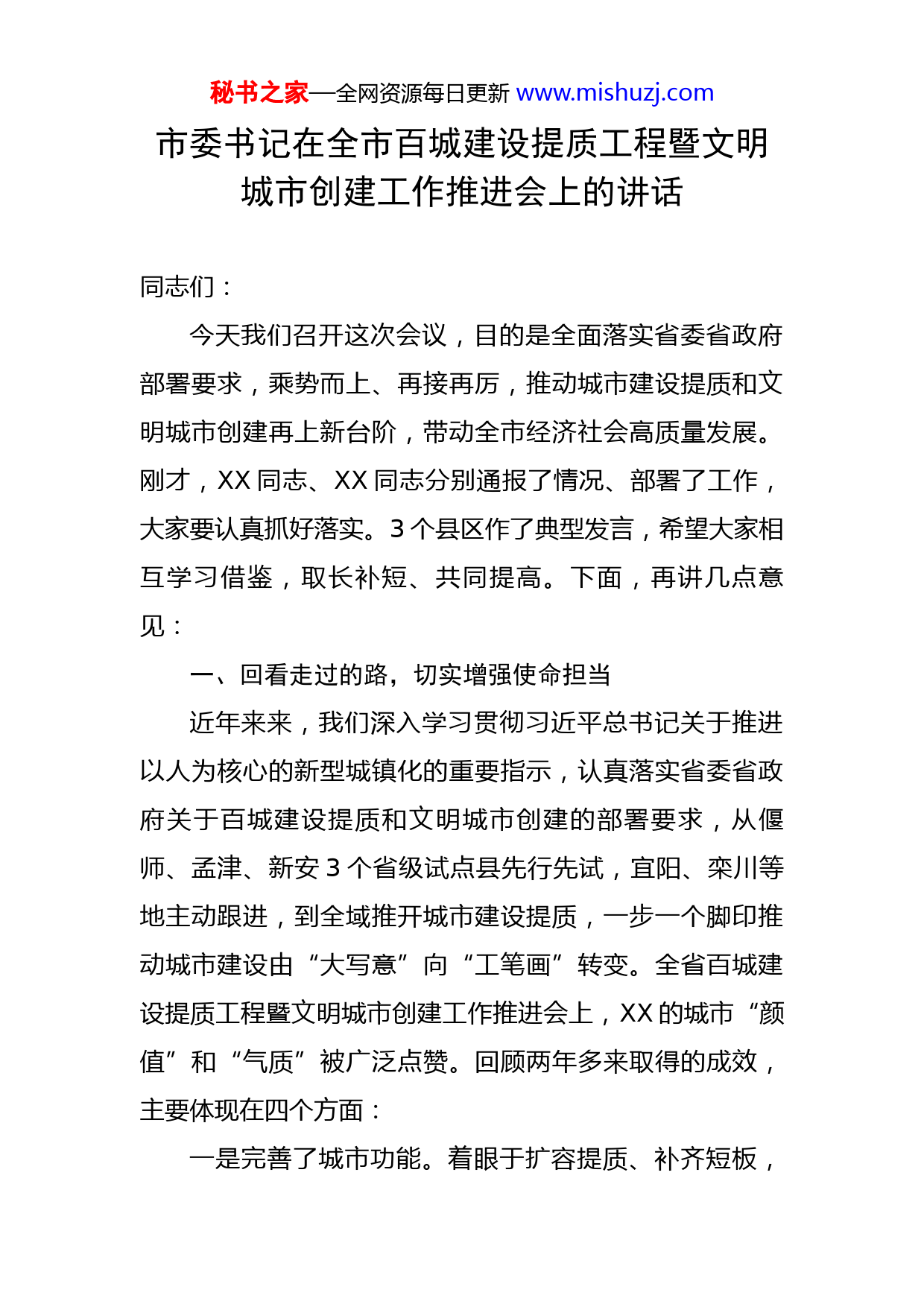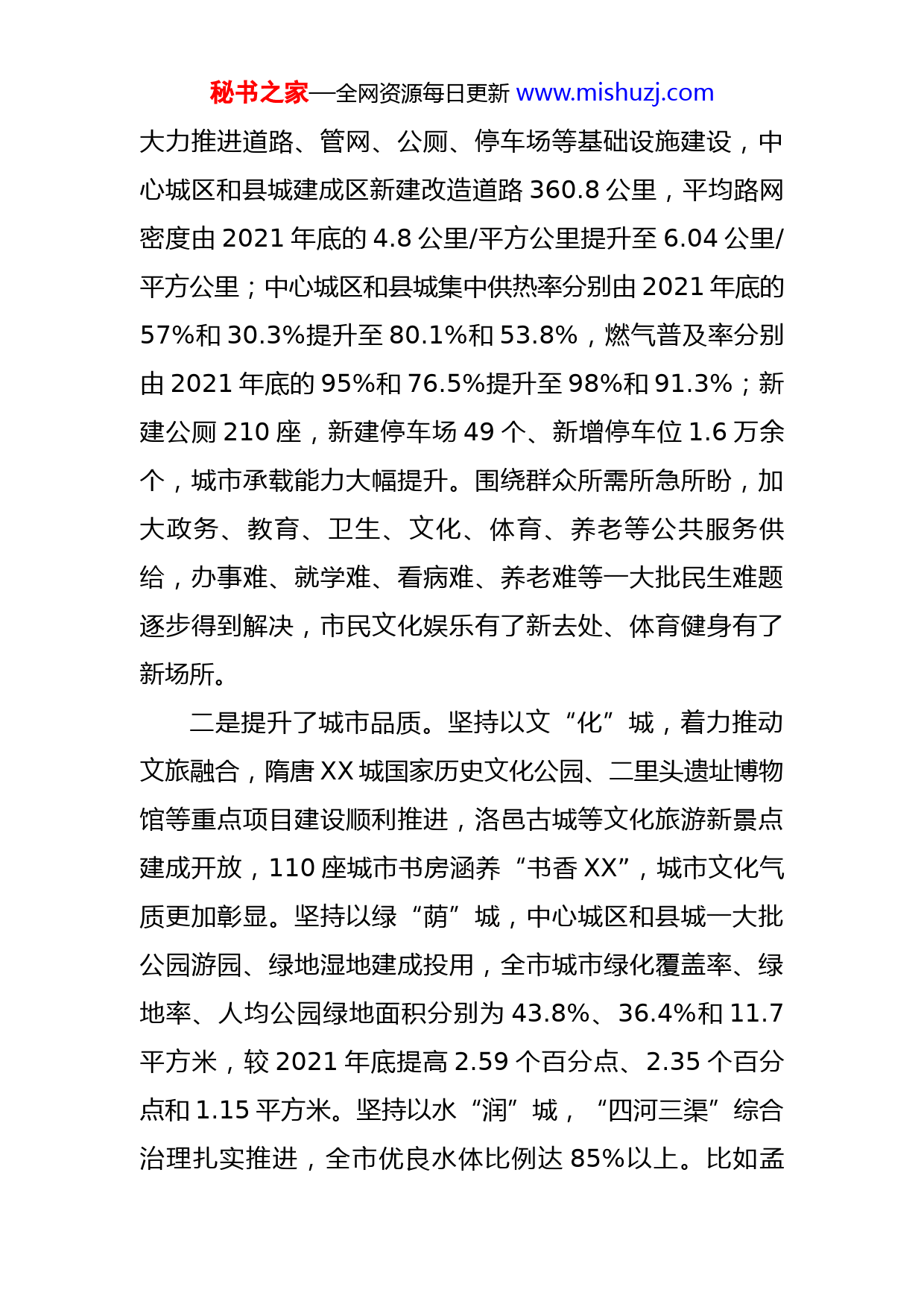 秘书之家—全网资源每日更新www.mishuzj.com市委书记在全市百城建设提质工程暨文明城市创建工作推进会上的讲话同志们:今天我们召开这次会议,目的是全面落实省委省政府部署要求,乘势而上、再接再厉,推动城市建设提质和文明城市创建再上新台阶,带动全市经济社会高质量发展。刚才,XX同志、XX同志分别通报了情况、部署了工作,大家要认真抓好落实。3个县区作了典型发言,希望大家相互学习借鉴,取长补短、共同提高。下面,再讲几点意见:一、回看走过的路,切实增强使命担当近年来来,我们深入学习贯彻习近平总书记关于推进以人为核心的新型城镇化的重要指示,认真落实省委省政府关于百城建设提质和文明城市创建的部署要求,从偃师、孟津、新安3个省级试点县先行先试,宜阳、栾川等地主动跟进,到全域推开城市建设提质,一步一个脚印推动城市建设由“大写意”向“工笔画”转变。全省百城建设提质工程暨文明城市创建工作推进会上,XX的城市“颜值”和“气质”被广泛点赞。回顾两年多来取得的成效,主要体现在四个方面:一是完善了城市功能。着眼于扩容提质、补齐短板,秘书之家—全网资源每日更新www.mishuzj.com大力推进道路、管网、公厕、停车场等基础设施建设,中心城区和县城建成区新建改造道路360.8公里,平均路网密度由2021年底的4.8公里/平方公里提升至6.04公里/平方公里;中心城区和县城集中供热率分别由2021年底的57%和30.3%提升至80.1%和53.8%,燃气普及率分别由2021年底的95%和76.5%提升至98%和91.3%;新建公厕210座,新建停车场49个、新增停车位1.6万余个,城市承载能力大幅提升。围绕群众所需所急所盼,加大政务、教育、卫生、文化、体育、养老等公共服务供给,办事难、就学难、看病难、养老难等一大批民生难题逐步得到解决,市民文化娱乐有了新去处、体育健身有了新场所。二是提升了城市品质。坚持以文“化”城,着力推动文旅融合,隋唐XX城国家历史文化公园、二里头遗址博物馆等重点项目建设顺利推进,洛邑古城等文化旅游新景点建成开放,110座城市书房涵养“书香XX”,城市文化气质更加彰显。坚持以绿“荫”城,中心城区和县城一大批公园游园、绿地湿地建成投用,全市城市绿化覆盖率、绿地率、人均公园绿地面积分别为43.8%、36.4%和11.7平方米,较2021年底提高2.59个百分点、2.35个百分点和1.15平方米。坚持以水“润”城,“四河三渠”综合治理扎实推进,全市优良水体比例达85%以上。比如孟秘书之家—全网资源每日更新www.mishuzj.com津,通过瀍河治理、引黄入城,让“一泓清水绕县城”的愿景变成了现实,增添了县城的灵气。坚持精细管理,文明城市创建“五项治理”持续推进,“脏乱差”问题得到有效整治,一大批老旧小区、背街小巷旧貌换新颜,城市形象更加靓丽,市民文明素质有了很大提升。三是促进了经济发展。两年多来,各县(市、区)围绕城市建设提质谋划实施了一大批项目,其中2021年中心城区和各县市共实施城建项目803项,总投资2927亿元,年度完成投资901亿元。既拉动了投资,为经济平稳增长提供了有力支撑,又加快了城市转型,促进了优质要素资源集聚,带动了产业转型和动能转换,加快推进了转型发展、高质量发展。四是锤炼了干部队伍。通过城市建设提质和文明城市创建,各级干部的城市意识普遍增强了,对城市规划建设管理的认识更到位了、理解更深刻了、行动更自觉了。尤其在项目推进中、困难矛盾面前,各地各部门抢抓机遇、强力攻坚,广大干部展现了奋发进取、踏实肯干的务实作风。习近平总书记在调研指导河南工作时提出的打好“四张牌”,其中之一就是以人为核心推进新型城镇化;中央和省委省政府赋予XX发展新的战略定位,明确要求XX打造全国区域性中心城市和中原城市群副中心城市;市委市政府提出的推动转型发展、高质量发展,也包含城市转型秘书之家—全网资源每日更新www.mishuzj.com和城市高质量发展。实践证明,抓好城市建设提质和文明城市创建,对我们打好“四张牌”、落实发展新定位、推动转型发展高质量发展,尤为重要和迫切。第一,这是城市发展之需。当前,城市发展已经由片面追求人口、空间增加的规模扩张转向质量提升阶段。XX要建设的副中心和增长极,必须是高质量的副中心和增长极,不能片面追求城市人口和空间规模。我市城镇化率虽然达到57.6%,但仍低于全国2个百分点,同时还不同程度地存在功能不完善、公共服务水平不高、生态环境较差、特色品质不明显等问题,既有发展不充分的问题,又有发展不平衡的问题,城市面临着转型发展的迫切需要。抓好城市建设提质和文明城市创建,有利于转变城市发展方式,促进城市内涵式发展,更好地提高城市发展质量。第二,这是经济转型之需。产业层次低、增长方式粗放是制约洛阳发展的突出问题,加快转型发展是必由之路。城市既是经济增长的动力所在,也是转型发展的活力之源。通过城市建设提质和文明城市创建,既能有效改善城市环境,吸引带动人流、物流、信息流、资金流等优质资源集聚,促进生产力合理布局,提高资源要素配置效率,推动动能转型;又能带动供需动态变化、平衡转换,培育高品质的生活,催生新业态新模式新产品,促进产业转型。当前,经济已由高速增长阶段转向高秘书之家—全网资源每日更新www.mishuzj.com质量发展阶段,城