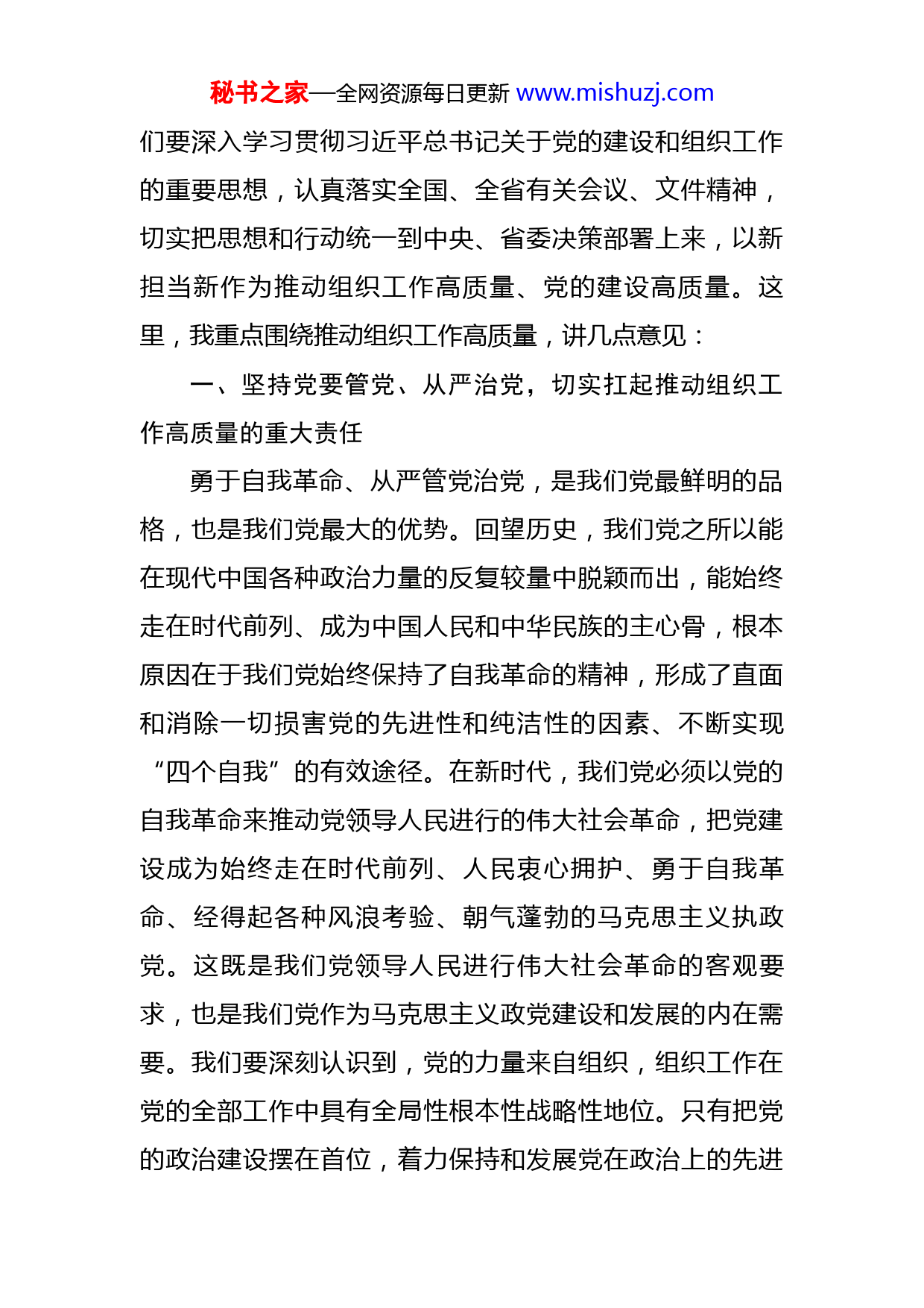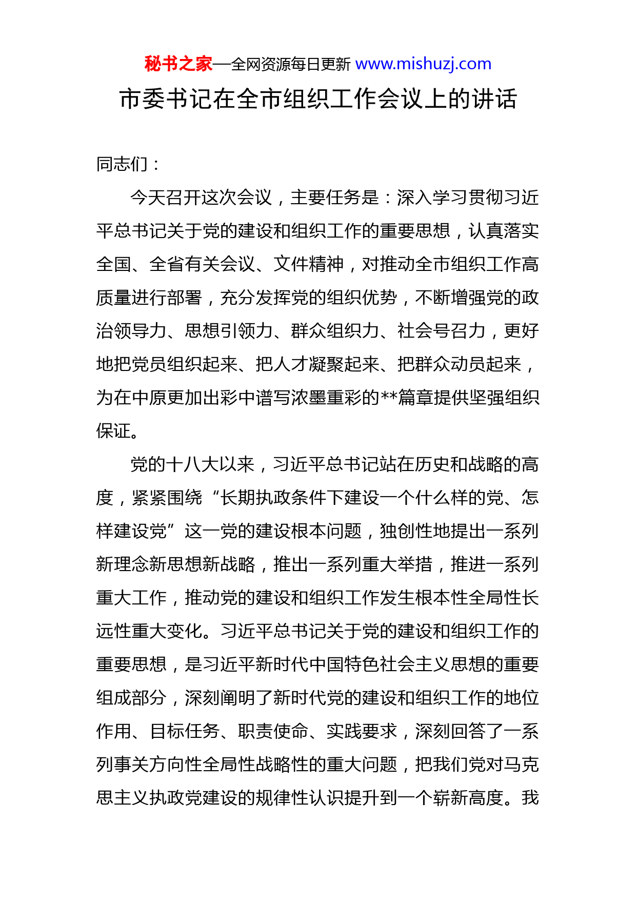 秘书之家—全网资源每日更新www.mishuzj.com市委书记在全市组织工作会议上的讲话同志们:今天召开这次会议,主要任务是:深入学习贯彻习近平总书记关于党的建设和组织工作的重要思想,认真落实全国、全省有关会议、文件精神,对推动全市组织工作高质量进行部署,充分发挥党的组织优势,不断增强党的政治领导力、思想引领力、群众组织力、社会号召力,更好地把党员组织起来、把人才凝聚起来、把群众动员起来,为在中原更加出彩中谱写浓墨重彩的篇章提供坚强组织保证。党的十八大以来,习近平总书记站在历史和战略的高度,紧紧围绕“长期执政条件下建设一个什么样的党、怎样建设党”这一党的建设根本问题,独创性地提出一系列新理念新思想新战略,推出一系列重大举措,推进一系列重大工作,推动党的建设和组织工作发生根本性全局性长远性重大变化。习近平总书记关于党的建设和组织工作的重要思想,是习近平新时代中国特色社会主义思想的重要组成部分,深刻阐明了新时代党的建设和组织工作的地位作用、目标任务、职责使命、实践要求,深刻回答了一系列事关方向性全局性战略性的重大问题,把我们党对马克思主义执政党建设的规律性认识提升到一个崭新高度。我秘书之家—全网资源每日更新www.mishuzj.com们要深入学习贯彻习近平总书记关于党的建设和组织工作的重要思想,认真落实全国、全省有关会议、文件精神,切实把思想和行动统一到中央、省委决策部署上来,以新担当新作为推动组织工作高质量、党的建设高质量。这里,我重点围绕推动组织工作高质量,讲几点意见:一、坚持党要管党、从严治党,切实扛起推动组织工作高质量的重大责任勇于自我革命、从严管党治党,是我们党最鲜明的品格,也是我们党最大的优势。回望历史,我们党之所以能在现代中国各种政治力量的反复较量中脱颖而出,能始终走在时代前列、成为中国人民和中华民族的主心骨,根本原因在于我们党始终保持了自我革命的精神,形成了直面和消除一切损害党的先进性和纯洁性的因素、不断实现“四个自我”的有效途径。在新时代,我们党必须以党的自我革命来推动党领导人民进行的伟大社会革命,把党建设成为始终走在时代前列、人民衷心拥护、勇于自我革命、经得起各种风浪考验、朝气蓬勃的马克思主义执政党。这既是我们党领导人民进行伟大社会革命的客观要求,也是我们党作为马克思主义政党建设和发展的内在需要。我们要深刻认识到,党的力量来自组织,组织工作在党的全部工作中具有全局性根本性战略性地位。只有把党的政治建设摆在首位,着力保持和发展党在政治上的先进秘书之家—全网资源每日更新www.mishuzj.com性,才能确保党的建设的正确方向和效果;只有以党的组织体系建设为重点,坚决维护党中央定于一尊、一锤定音的权威,切实建强各级党组织,才能确保政令畅通、令行禁止;只有树立正确的选人用人导向,着力建设忠诚干净担当的高素质干部队伍,才能确保党的事业薪火相传;只有着力集聚爱国奉献的各方面优秀人才,才能为党和国家发展提供强大智力支撑。要推动党的建设高质量,必须着力推动组织工作高质量。我们还要深刻认识到,党的工作最坚实的力量支撑在基层,最突出的矛盾问题也在基层。只有把抓基层打基础作为长远之计和固本之举,着力推动全面从严治党向基层延伸,切实建强基层组织、夯实基础工作、提升基本能力,确保党的组织和党的工作在基层全面有效覆盖,才能不断巩固党的执政基础,把广大党员干部群众紧紧凝聚在党的周围,统一意志、统一行动、步调一致向前进。要推动党的建设高质量、组织工作高质量,必须着力推动基层党组织建设全面进步、全面过硬。可以说,推动组织工作高质量,是推动全面从严治党向纵深发展、以党的建设高质量推动经济发展高质量的重要要求和必由路径。近年来,市委深入学习贯彻习近平总书记关于党的建设和组织工作的重要思想,牢固树立“抓好党建是最大政绩”的理念,一以贯之推进党的建设新的伟大工程,推动秘书之家—全网资源每日更新www.mishuzj.com全市党的建设和组织工作取得了显著成效。特别是我们认真落实关于维护党中央集中统一领导的规定、关于加强党的政治建设的意见,深入学习贯彻习近平新时代中国特色社会主义思想,严明党的政治纪律和政治规矩,进一步增强“四个意识”、坚定“四个自信”、做到“两个维护”,确保了党中央决策部署和总书记指示要求在落地生根;认真落实地方党委、党组、党支部工作条例和农村基层组织工作条例,着力加强党的组织体系建设特别是基层党组织建设,扎实推进“河洛党建计划”,全市各级党组织的创造力凝聚力战斗力进一步增强,以党的建设为核心的基层基础工作进一步夯实;认真落实新时期好干部标准,严格执行党政领导干部选拔任用工作条例,突出政治标准,坚持因事择人、人岗相适,匡正选人用人风气,科学推进市县乡村领导班子换届,积极发现培养选拔优秀年轻干部,各级领导班子和干部队伍结构不断优化,干事创业的氛围日益浓厚;认真落实人才强国战略,深化人才发展体制机制改革,出台人才工作“1+4”政策体系,深入实施“河洛英才计划”等招才引智计划,为各项事业发展提供了强有力的人才支撑。总的来看,全市组