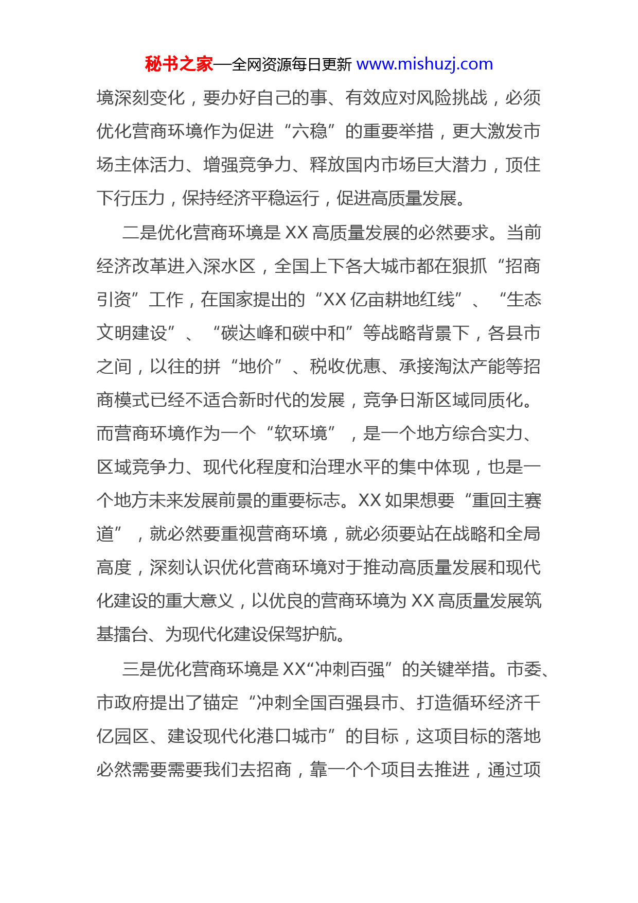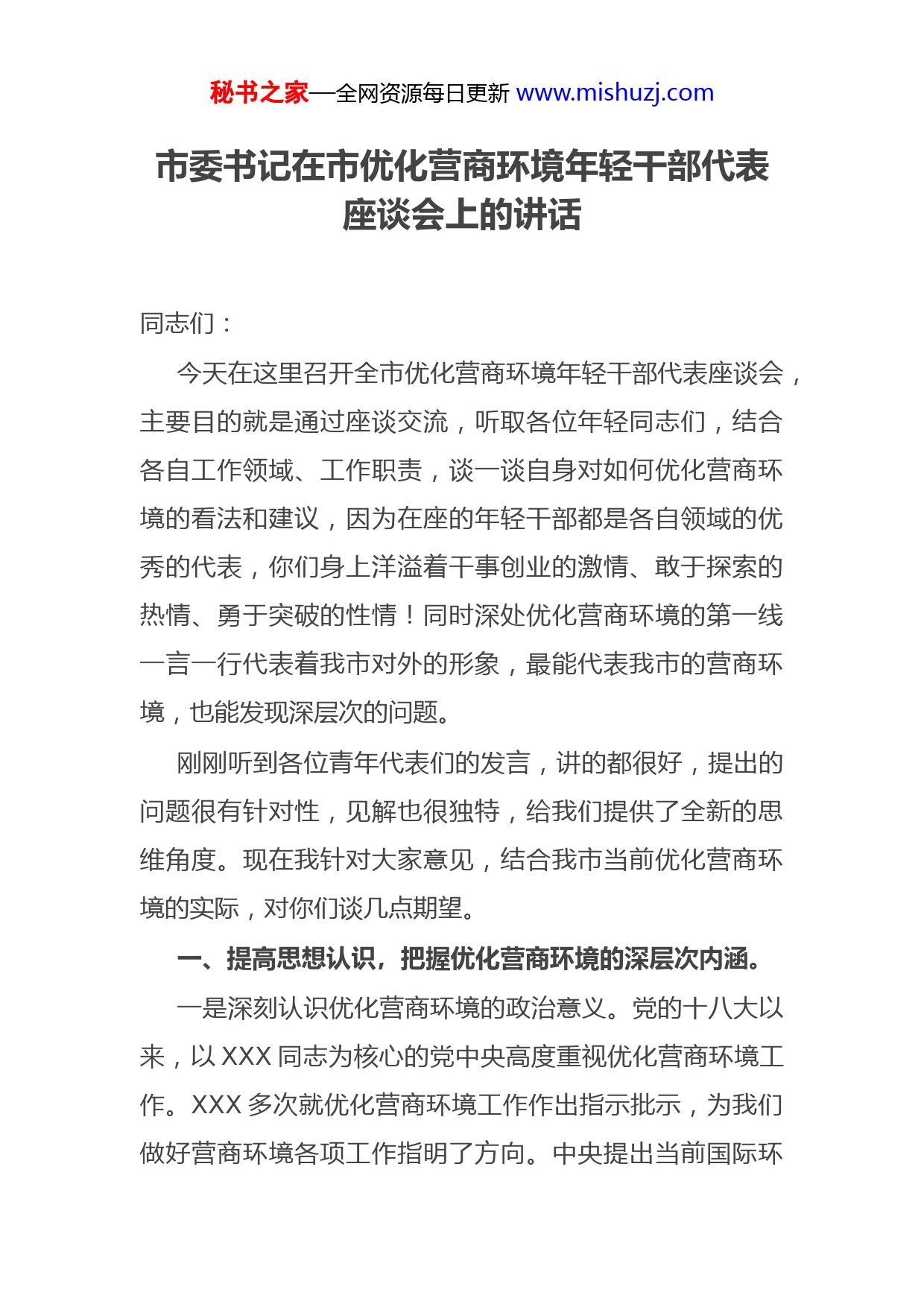 秘书之家—全网资源每日更新www.mishuzj.com市委书记在市优化营商环境年轻干部代表座谈会上的讲话同志们:今天在这里召开全市优化营商环境年轻干部代表座谈会,主要目的就是通过座谈交流,听取各位年轻同志们,结合各自工作领域、工作职责,谈一谈自身对如何优化营商环境的看法和建议,因为在座的年轻干部都是各自领域的优秀的代表,你们身上洋溢着干事创业的激情、敢于探索的热情、勇于突破的性情!同时深处优化营商环境的第一线一言一行代表着我市对外的形象,最能代表我市的营商环境,也能发现深层次的问题。刚刚听到各位青年代表们的发言,讲的都很好,提出的问题很有针对性,见解也很独特,给我们提供了全新的思维角度。现在我针对大家意见,结合我市当前优化营商环境的实际,对你们谈几点期望。一、提高思想认识,把握优化营商环境的深层次内涵。一是深刻认识优化营商环境的政治意义。党的十八大以来,以XXX同志为核心的党中央高度重视优化营商环境工作。XXX多次就优化营商环境工作作出指示批示,为我们做好营商环境各项工作指明了方向。中央提出当前国际环秘书之家—全网资源每日更新www.mishuzj.com境深刻变化,要办好自己的事、有效应对风险挑战,必须优化营商环境作为促进“六稳”的重要举措,更大激发市场主体活力、增强竞争力、释放国内市场巨大潜力,顶住下行压力,保持经济平稳运行,促进高质量发展。二是优化营商环境是XX高质量发展的必然要求。当前经济改革进入深水区,全国上下各大城市都在狠抓“招商引资”工作,在国家提出的“XX亿亩耕地红线”、“生态文明建设”、“碳达峰和碳中和”等战略背景下,各县市之间,以往的拼“地价”、税收优惠、承接淘汰产能等招商模式已经不适合新时代的发展,竞争日渐区域同质化。而营商环境作为一个“软环境”,是一个地方综合实力、区域竞争力、现代化程度和治理水平的集中体现,也是一个地方未来发展前景的重要标志。XX如果想要“重回主赛道”,就必然要重视营商环境,就必须要站在战略和全局高度,深刻认识优化营商环境对于推动高质量发展和现代化建设的重大意义,以优良的营商环境为XX高质量发展筑基擂台、为现代化建设保驾护航。三是优化营商环境是XX“冲刺百强”的关键举措。市委、市政府提出了锚定“冲刺全国百强县市、打造循环经济千亿园区、建设现代化港口城市”的目标,这项目标的落地必然需要需要我们去招商,靠一个个项目去推进,通过项秘书之家—全网资源每日更新www.mishuzj.com目的落地、建设、投产,来转化为时时在在的经济效益。但是说实话,我市的营商环境在全市上下的共同努力下,虽然有着长足的进步,但是跳出XX、展望XX、对标百强,我们还有很大的差距,我们的“一门全进”、“一网通办”、“一窗受理”、“一体考核”等还有待进一步提质高效。一个地区营商环境好不好,要看市场主体的反映、听市场主体的评价,他们的感知最敏感,会用真金白银“投票”。如果我们的招商队伍,花了大的心血,把企业引进来,但营商环境不好,企业办个证照都需要过五关斩六将、等上七八天,更不用说遇到问题会被各个办事部门“踢皮球”,那么企业对我们XX是“敬而远之”的。XX市公布的最新一季度的重要经济指标数据,我们XX的数据不容乐观,如果我们因循守旧,差距只会越来越远,我们只有持续优化营商环境,提高这个经济建设的“核心竞争力”,才能转化为我们高质量发展的推动力。二、立足职责定位,全力为优化营商环境保驾护航一是用“专”提供精准服务。在做的各位大部分来自镇(街道)、市直部门,要牢记每个部门、每个人都是营商环境,都要为全市营商环境作贡献,都要做本行业、本部门、本领域的行家里手,持续深入学政策、学业务,缺什么补什么,充分发挥业务专长,提升专业能力和水平,为秘书之家—全网资源每日更新www.mishuzj.com办事企业和群众提供精准服务,展现激扬向上的精神风貌二是用“能”提升服务质量。一个企业落地涉及征地、拆迁、建设、投产等各个环节,每一个环节都是曲折的,都需要考验我们项目服务专班的智慧,年轻干部所在的单位或多或少都参与了我市各个服务重点项目工作专班,你们要在专班中加强学习,提高本领,提高创新能力,主动作为,扎扎实实的为解决实际问题。在此我向你们提出一个小要求,就是遇到问题和困难,不要说“不知道”、“不是我的事”,而且站在企业的角度去帮助他们一起解决问题。三是用“心”营造优质环境。工作中要主动服务,用“心”用“情”去服务,不仅做好全力做好有呼必应、无事不饶的“店小二”,也要积极热情的对待办事群众,你们要坚信,你们的言行举止、工作作风、就是“营商环境”,代表着我市对外的“窗口”和形象。在疫情防控中认真摸排宣传政策;在城管会战中,认真在所在社区做好每一件力所能及的事情;在驻村工作中,热情与群众交流了解他们的生活状况;在信访维稳工作中,耐心细致的聆听他们的诉求……这些都是优化营商环境的具体表现,你们秘书之家—全网资源每日更新www.mishuzj.com的微小力量,汇聚起来就是推动XX经济社会发展的磅礴力量!三、强化自身建设,融入优化营商环境大局一是加强自身政治建设。优秀的政治素质是青年干部成长的重要保证,是党组织