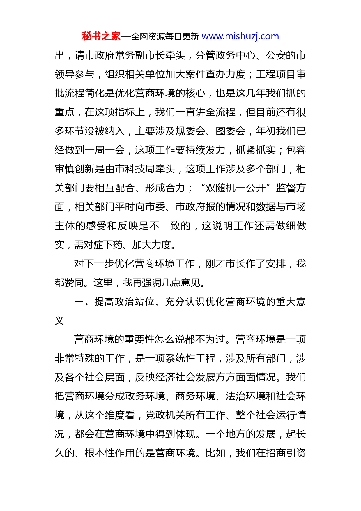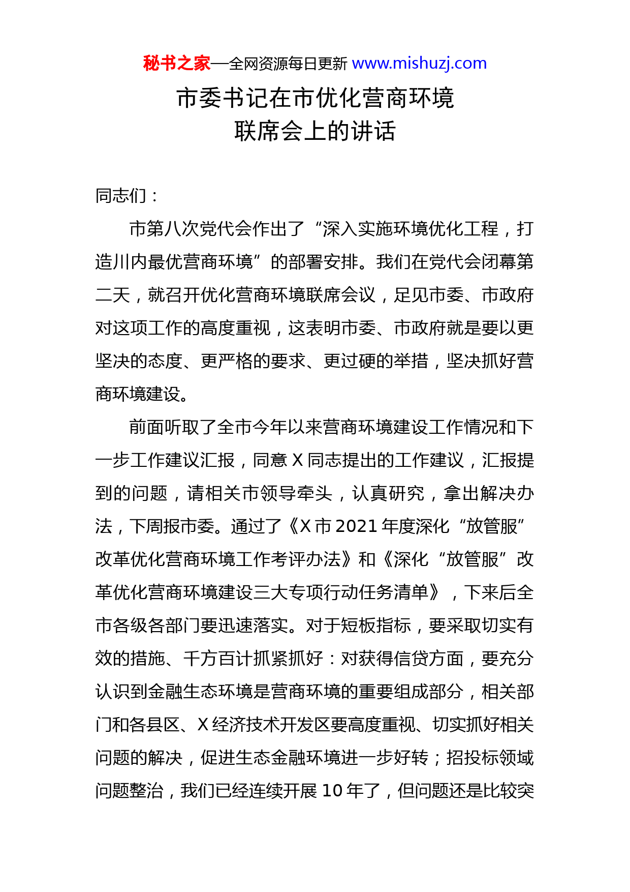 秘书之家—全网资源每日更新www.mishuzj.com市委书记在市优化营商环境联席会上的讲话同志们:市第八次党代会作出了“深入实施环境优化工程,打造川内最优营商环境”的部署安排。我们在党代会闭幕第二天,就召开优化营商环境联席会议,足见市委、市政府对这项工作的高度重视,这表明市委、市政府就是要以更坚决的态度、更严格的要求、更过硬的举措,坚决抓好营商环境建设。前面听取了全市今年以来营商环境建设工作情况和下一步工作建议汇报,同意X同志提出的工作建议,汇报提到的问题,请相关市领导牵头,认真研究,拿出解决办法,下周报市委。通过了《X市2021年度深化“放管服”改革优化营商环境工作考评办法》和《深化“放管服”改革优化营商环境建设三大专项行动任务清单》,下来后全市各级各部门要迅速落实。对于短板指标,要采取切实有效的措施、千方百计抓紧抓好:对获得信贷方面,要充分认识到金融生态环境是营商环境的重要组成部分,相关部门和各县区、X经济技术开发区要高度重视、切实抓好相关问题的解决,促进生态金融环境进一步好转;招投标领域问题整治,我们已经连续开展10年了,但问题还是比较突秘书之家—全网资源每日更新www.mishuzj.com出,请市政府常务副市长牵头,分管政务中心、公安的市领导参与,组织相关单位加大案件查办力度;工程项目审批流程简化是优化营商环境的核心,也是这几年我们抓的重点,在这项指标上,我们一直讲全流程,但目前还有很多环节没被纳入,主要涉及规委会、图委会,年初我们已经做到一周一会,这项工作要持续发力,抓紧抓实;包容审慎创新是由市科技局牵头,这项工作涉及多个部门,相关部门要相互配合、形成合力;“双随机一公开”监督方面,相关部门平时向市委、市政府报的情况和数据与市场主体的感受和反映是不一致的,这说明工作还需做细做实,需对症下药、加大力度。对下一步优化营商环境工作,刚才市长作了安排,我都赞同。这里,我再强调几点意见。一、提高政治站位,充分认识优化营商环境的重大意义营商环境的重要性怎么说都不为过。营商环境是一项非常特殊的工作,是一项系统性工程,涉及所有部门,涉及各个社会层面,反映经济社会发展方方面面情况。我们把营商环境分成政务环境、商务环境、法治环境和社会环境,从这个维度看,党政机关所有工作、整个社会运行情况,都会在营商环境中得到体现。一个地方的发展,起长久的、根本性作用的是营商环境。比如,我们在招商引资秘书之家—全网资源每日更新www.mishuzj.com中给予客商特殊优惠政策,这对项目落地很重要,但企业长久生存主要靠的不是这些,关键是营商环境;在招商引资过程中,你会发现,企业非常重视营商环境,甚至比税收优惠、土地优惠更重视,他们更关心的是,长期在这里生存,发展环境怎么样,政府服务怎么样。所以对于这个问题,大家一定要高度重视。优化营商环境是克服经济发展不利因素的根本选择。从客观条件来看,X经济发展面临的主要是不利因素:我们地处山区,虽然现在交通发达,但山区高速公路收费高,物流成本自然比别人高;我们远离大城市,远离原材料市场,远离消费市场,经济发展水平、就业充分度、工资水平、其他社会条件成熟度对吸引人才、集聚人才都有影响,企业需要的各类人才在X难以得到很好的满足;刚才市长说我们的一些县区,打疫苗比率较低,与省上要求相差十多个百分点,其主要原因是很多人外出务工了,那么多劳动力为什么不在家乡就业呢?过去在家乡就业是没有岗位,现在X的企业也面临用工荒、用工难,但他们为什么不在家乡就业?主要是你务工报酬给得不高,连最基本的工人都招不够,技术人员、研发人员、营销人才、高端的管理人才更缺。不利条件这么多,我们要在区域竞争中取胜,靠什么来克服?靠软环境建设,靠优化营商环境。对此,我们要充分认识到,这是极为重要的。秘书之家—全网资源每日更新www.mishuzj.com保持优化营商环境的政治敏锐性。党中央、国务院高度重视营商环境,习近平总书记多次强调营商环境的重要性,国务院常务会每次都有营商环境议题,李克强总理每年政府工作报告,营商环境都是重头戏。市第八次党代会把优化营商环境提到了新的高度,围绕打造全省最优营商环境,从多个方面作出了安排部署。从中可以看出,优化营商环境关系到党代会确立的加快建设川陕甘结合部现代化中心城市和成为区域经济发展高地目标的实现:营商环境是经济发展的重要动力保证;X要做川陕甘结合部的中心城市,在一定范围有辐射力、影响力,就要求我们在区域内各个方面都要当标杆,但实现这一目标的基础和前提是具有最优的营商环境。大家想一想,要是营商环境不好,各种发展要素都不到你这里来,你叫什么中心?对这项工作,各级各部门要高度重视。这里要求,所有的市级部门和县区、X经济技术开发区,回去后要抓紧召开党组会、党委会,专题研究本单位所承担的营商环境建设任务。从今天开始,至少每季度研究1次。二、聚焦重点关键发力,打造川内最优营商环境这次党代会提出建设“川内最优营商环境”目标,这是比较高的,对标的是全国营商环境最好的城市。这些年,来X投资的大多是广东、浙江企业,他们看的不是我们在四川营商环境是否最好,他们是拿我们与是广东、浙秘书之家