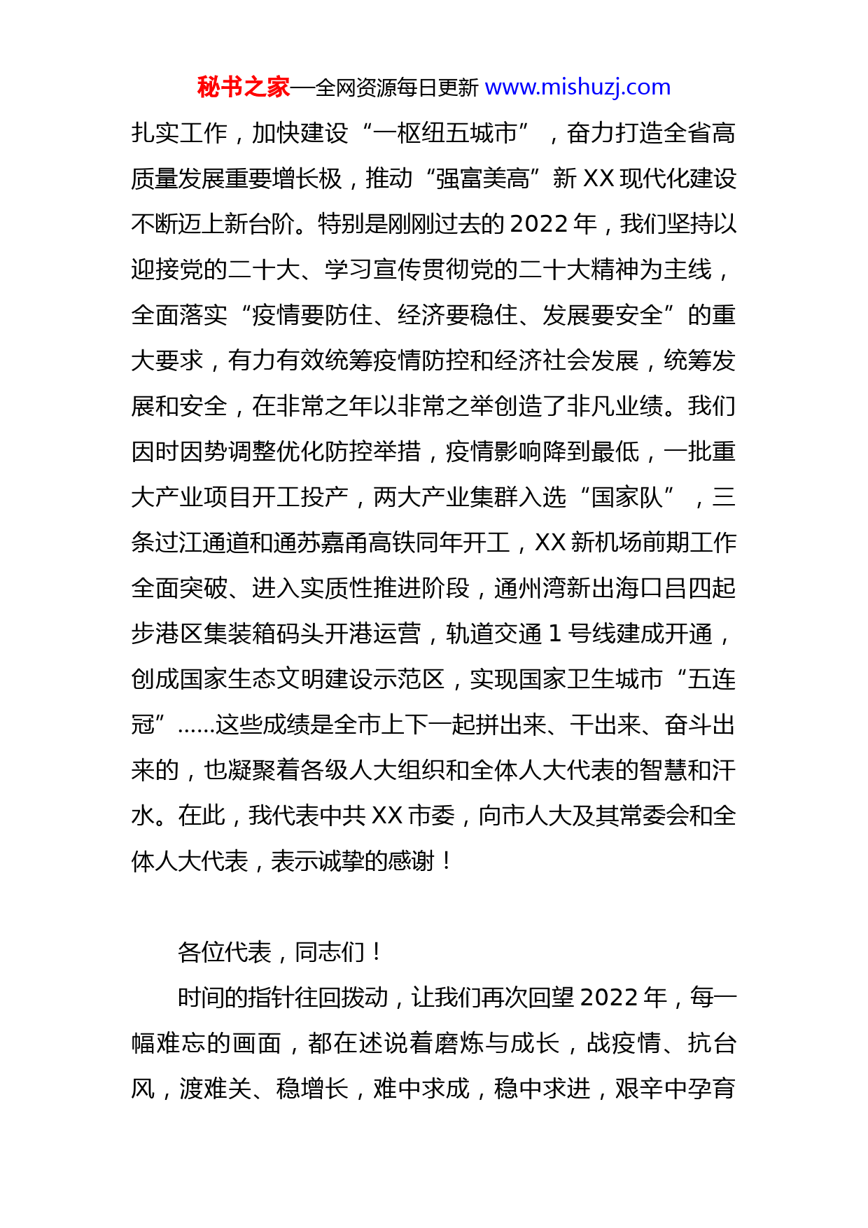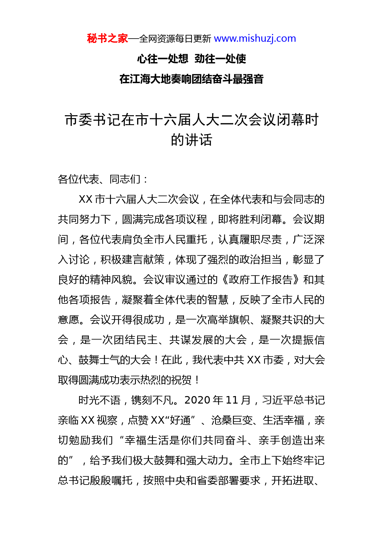 秘书之家—全网资源每日更新www.mishuzj.com心往一处想劲往一处使在江海大地奏响团结奋斗最强音市委书记在市十六届人大二次会议闭幕时的讲话各位代表、同志们:XX市十六届人大二次会议,在全体代表和与会同志的共同努力下,圆满完成各项议程,即将胜利闭幕。会议期间,各位代表肩负全市人民重托,认真履职尽责,广泛深入讨论,积极建言献策,体现了强烈的政治担当,彰显了良好的精神风貌。会议审议通过的《政府工作报告》和其他各项报告,凝聚着全体代表的智慧,反映了全市人民的意愿。会议开得很成功,是一次高举旗帜、凝聚共识的大会,是一次团结民主、共谋发展的大会,是一次提振信心、鼓舞士气的大会!在此,我代表中共XX市委,对大会取得圆满成功表示热烈的祝贺!时光不语,镌刻不凡。2020年11月,习近平总书记亲临XX视察,点赞XX“好通”、沧桑巨变、生活幸福,亲切勉励我们“幸福生活是你们共同奋斗、亲手创造出来的”,给予我们极大鼓舞和强大动力。全市上下始终牢记总书记殷殷嘱托,按照中央和省委部署要求,开拓进取、秘书之家—全网资源每日更新www.mishuzj.com扎实工作,加快建设“一枢纽五城市”,奋力打造全省高质量发展重要增长极,推动“强富美高”新XX现代化建设不断迈上新台阶。特别是刚刚过去的2022年,我们坚持以迎接党的二十大、学习宣传贯彻党的二十大精神为主线,全面落实“疫情要防住、经济要稳住、发展要安全”的重大要求,有力有效统筹疫情防控和经济社会发展,统筹发展和安全,在非常之年以非常之举创造了非凡业绩。我们因时因势调整优化防控举措,疫情影响降到最低,一批重大产业项目开工投产,两大产业集群入选“国家队”,三条过江通道和通苏嘉甬高铁同年开工,XX新机场前期工作全面突破、进入实质性推进阶段,通州湾新出海口吕四起步港区集装箱码头开港运营,轨道交通1号线建成开通,创成国家生态文明建设示范区,实现国家卫生城市“五连冠”……这些成绩是全市上下一起拼出来、干出来、奋斗出来的,也凝聚着各级人大组织和全体人大代表的智慧和汗水。在此,我代表中共XX市委,向市人大及其常委会和全体人大代表,表示诚挚的感谢!各位代表,同志们!时间的指针往回拨动,让我们再次回望2022年,每一幅难忘的画面,都在述说着磨炼与成长,战疫情、抗台风,渡难关、稳增长,难中求成,稳中求进,艰辛中孕育秘书之家—全网资源每日更新www.mishuzj.com坚韧、不易中创造不凡,每个人都很了不起!从逆行出征的医护人员,到坚守一线的基层干部;从负重前行的企业家,到无私奉献的志愿者;从守护一方平安的公安干警,到坚持线上教学的人民教师;从跋涉奔波的货车司机,到走街串巷的快递小哥……天使白、守护蓝、保障橘、志愿红,绘就了城市最靓丽的底色;党旗扬、干群亲、邻里暖、人心齐,凝成了城市最坚强的力量。770万江海儿女,在勇毅前行中成就了一个奋进的XX,在艰难承压中展现出一个坚韧的XX,在守望相助中托举起一个温暖的XX。我们用行动证明:上下同欲者胜,携手共进者强,同舟共济者赢!让我们向为XX这座城市努力打拼的每一位劳动者致敬!各位代表、同志们!历史画卷,总在团结拼搏中绘就;时代华章,必在接续奋斗中书写。党的二十大报告通篇贯穿着团结奋斗的时代要求,习近平总书记强调“团结奋斗是中国人民创造历史伟业的必由之路”,号召“为全面建设社会主义现代化国家、全面推进中华民族伟大复兴而团结奋斗”。全市上下要坚决响应习近平总书记的伟大号召,在党的旗帜下团结成“一块坚硬的钢铁”,心往一处想、劲往一处使,全面推进中国式现代化XX新实践,在江海大地奏响团结奋斗秘书之家—全网资源每日更新www.mishuzj.com最强音。团结奋斗就要坚定政治信仰,紧跟核心走。万山磅礴看主峰,沧海茫茫望灯塔。进入新时代,党和国家事业取得历史性成就、发生历史性变革,最根本在于有习近平总书记作为党中央的核心、全党的核心掌舵领航,在于有习近平新时代中国特色社会主义思想科学指引。我们要深刻领悟“两个确立”的决定性意义,深刻理解其历史逻辑、理论逻辑、实践逻辑,切实增进政治认同、思想认同、理论认同、情感认同,不断提高政治判断力、政治领悟力、政治执行力,矢志不渝忠诚核心、信赖核心、追随核心、维护核心,紧跟习近平总书记走好新的赶考之路。要坚持不懈用习近平新时代中国特色社会主义思想凝心铸魂,深刻领会其核心要义、丰富内涵、实践要求,切实把“学思用”连成一线、“知信行”融为一体,不断提高工作的科学性、预见性、主动性,以理论的清醒把握历史的主动,以思想的力量昂扬奋进的激情。坚持把学习宣传贯彻党的二十大精神作为首要政治任务,在全面学习、全面把握、全面落实上下功夫,切实用二十大精神统一思想、统一意志、统一行动,胸怀“两个大局”、牢记“国之大者”,更加自觉地把XX现代化建设放到党和国家事业全局中审视、放到区域重大战略中谋划、放到全省大局中推进,以实际行动和过硬成果推动党的二十大精神在江海大地落地秘书之家—全网资源每日更新www.mishuzj.com生根、开花结果。团结奋斗就要保持战略定力,锚定目标干。最牢固的团结,是围绕明确目标形成的团结;最有力的奋斗,是依靠紧密团结进行的奋斗。这些年来,我们正是因