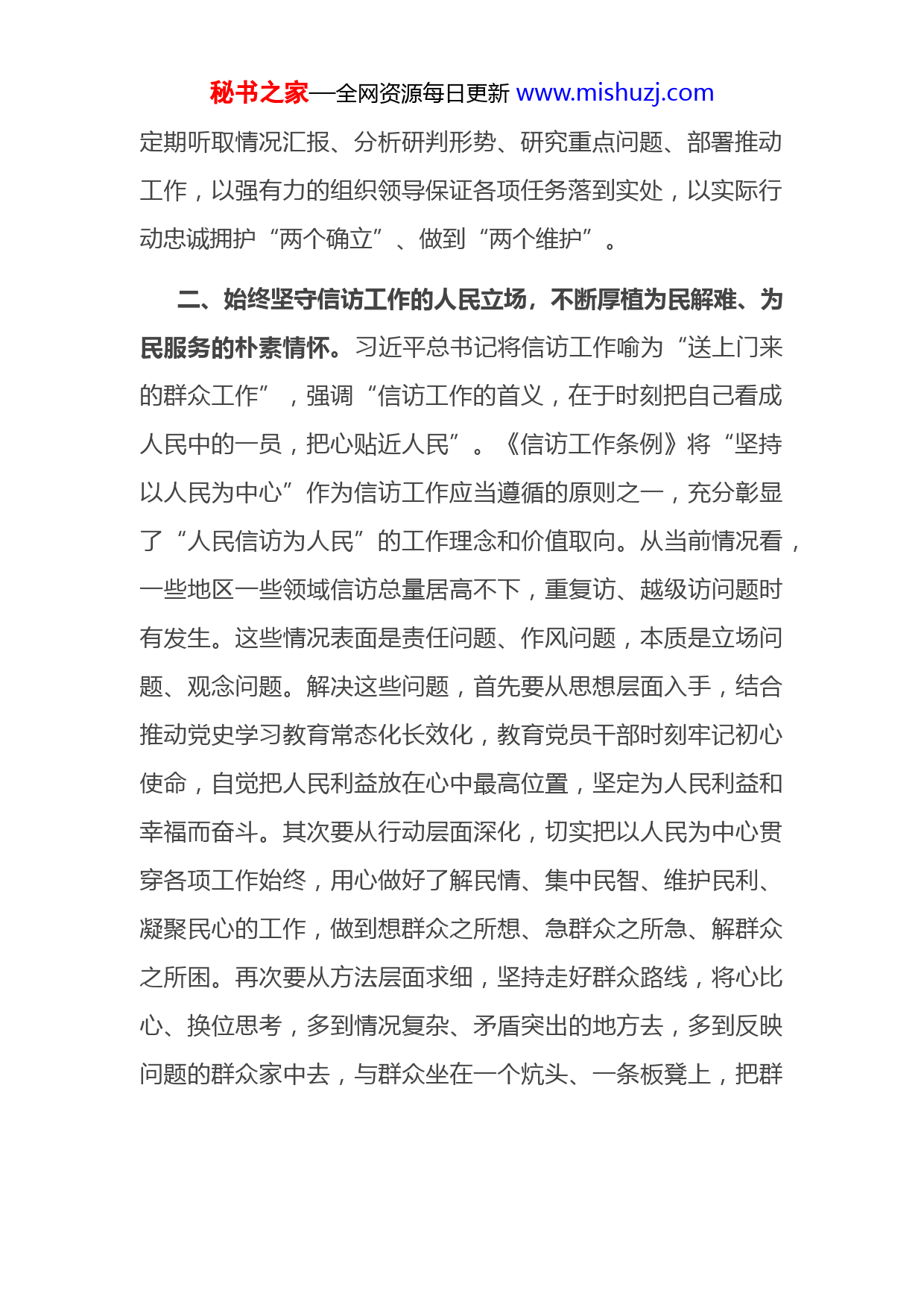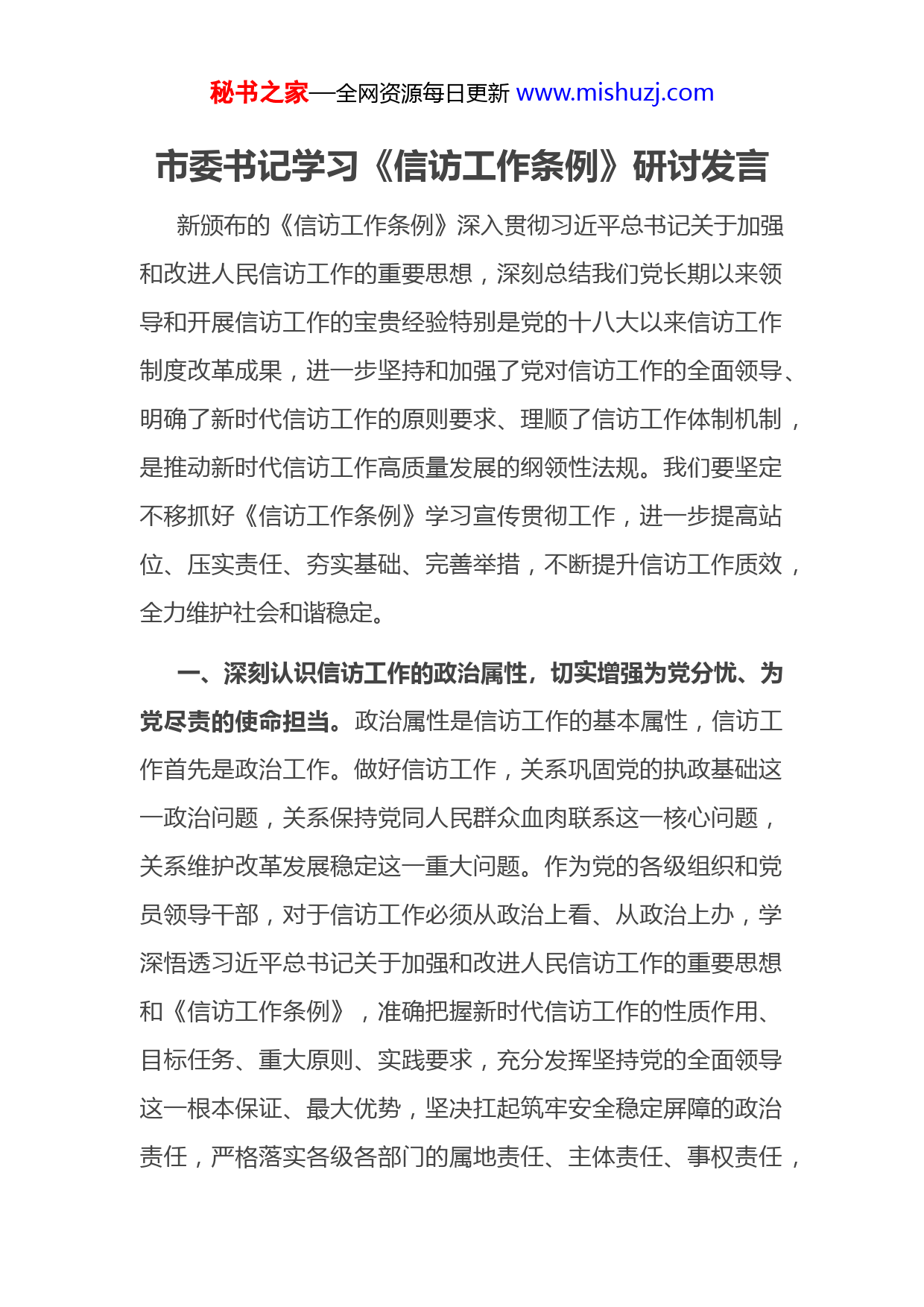 秘书之家—全网资源每日更新www.mishuzj.com市委书记学习《信访工作条例》研讨发言新颁布的《信访工作条例》深入贯彻习近平总书记关于加强和改进人民信访工作的重要思想,深刻总结我们党长期以来领导和开展信访工作的宝贵经验特别是党的十八大以来信访工作制度改革成果,进一步坚持和加强了党对信访工作的全面领导、明确了新时代信访工作的原则要求、理顺了信访工作体制机制,是推动新时代信访工作高质量发展的纲领性法规。我们要坚定不移抓好《信访工作条例》学习宣传贯彻工作,进一步提高站位、压实责任、夯实基础、完善举措,不断提升信访工作质效,全力维护社会和谐稳定。一、深刻认识信访工作的政治属性,切实增强为党分忧、为党尽责的使命担当。政治属性是信访工作的基本属性,信访工作首先是政治工作。做好信访工作,关系巩固党的执政基础这一政治问题,关系保持党同人民群众血肉联系这一核心问题,关系维护改革发展稳定这一重大问题。作为党的各级组织和党员领导干部,对于信访工作必须从政治上看、从政治上办,学深悟透习近平总书记关于加强和改进人民信访工作的重要思想和《信访工作条例》,准确把握新时代信访工作的性质作用、目标任务、重大原则、实践要求,充分发挥坚持党的全面领导这一根本保证、最大优势,坚决扛起筑牢安全稳定屏障的政治责任,严格落实各级各部门的属地责任、主体责任、事权责任,秘书之家—全网资源每日更新www.mishuzj.com定期听取情况汇报、分析研判形势、研究重点问题、部署推动工作,以强有力的组织领导保证各项任务落到实处,以实际行动忠诚拥护“两个确立”、做到“两个维护”。二、始终坚守信访工作的人民立场,不断厚植为民解难、为民服务的朴素情怀。习近平总书记将信访工作喻为“送上门来的群众工作”,强调“信访工作的首义,在于时刻把自己看成人民中的一员,把心贴近人民”。《信访工作条例》将“坚持以人民为中心”作为信访工作应当遵循的原则之一,充分彰显了“人民信访为人民”的工作理念和价值取向。从当前情况看,一些地区一些领域信访总量居高不下,重复访、越级访问题时有发生。这些情况表面是责任问题、作风问题,本质是立场问题、观念问题。解决这些问题,首先要从思想层面入手,结合推动党史学习教育常态化长效化,教育党员干部时刻牢记初心使命,自觉把人民利益放在心中最高位置,坚定为人民利益和幸福而奋斗。其次要从行动层面深化,切实把以人民为中心贯穿各项工作始终,用心做好了解民情、集中民智、维护民利、凝聚民心的工作,做到想群众之所想、急群众之所急、解群众之所困。再次要从方法层面求细,坚持走好群众路线,将心比心、换位思考,多到情况复杂、矛盾突出的地方去,多到反映问题的群众家中去,与群众坐在一个炕头、一条板凳上,把群秘书之家—全网资源每日更新www.mishuzj.com众的操心事、烦心事、揪心事当作自家事来办,以解决急难愁盼问题的实际成果赢得群众的信任支持。三、准确把握信访工作的实践要求,全力做好问题化解、源头治理的各项工作。做好新时代的信访工作,必须把《信访工作条例》作为基本遵循,既要抓末端、治已病、去存量,也要抓前端、防未病、遏增量。一方面,要坚决贯彻“三到位一处理”的重要要求,严格落实领导干部接访、下访、约访、包案等制度,深入推进治理重复访、化解信访积案专项行动,综合运用法律、政策、经济、行政等多种手段,集中推动存量问题“案结事了”,决不能把责任推给上面、踢给下面、留给后面。另一方面,要坚持和发展新时代“枫桥经验”,结合推进市域社会治理现代化、构建基层社会治理新格局,健全常态化制度化推进矛盾纠纷排查化解机制,严格落实首接首办责任制,加快推进“最多访一次”改革,着力推行重要决策、重大项目社会风险评估,最大限度把矛盾纠纷发现在早、化解在小,切实夯实基层社会稳定的基础,掌握信访工作的主动权。
