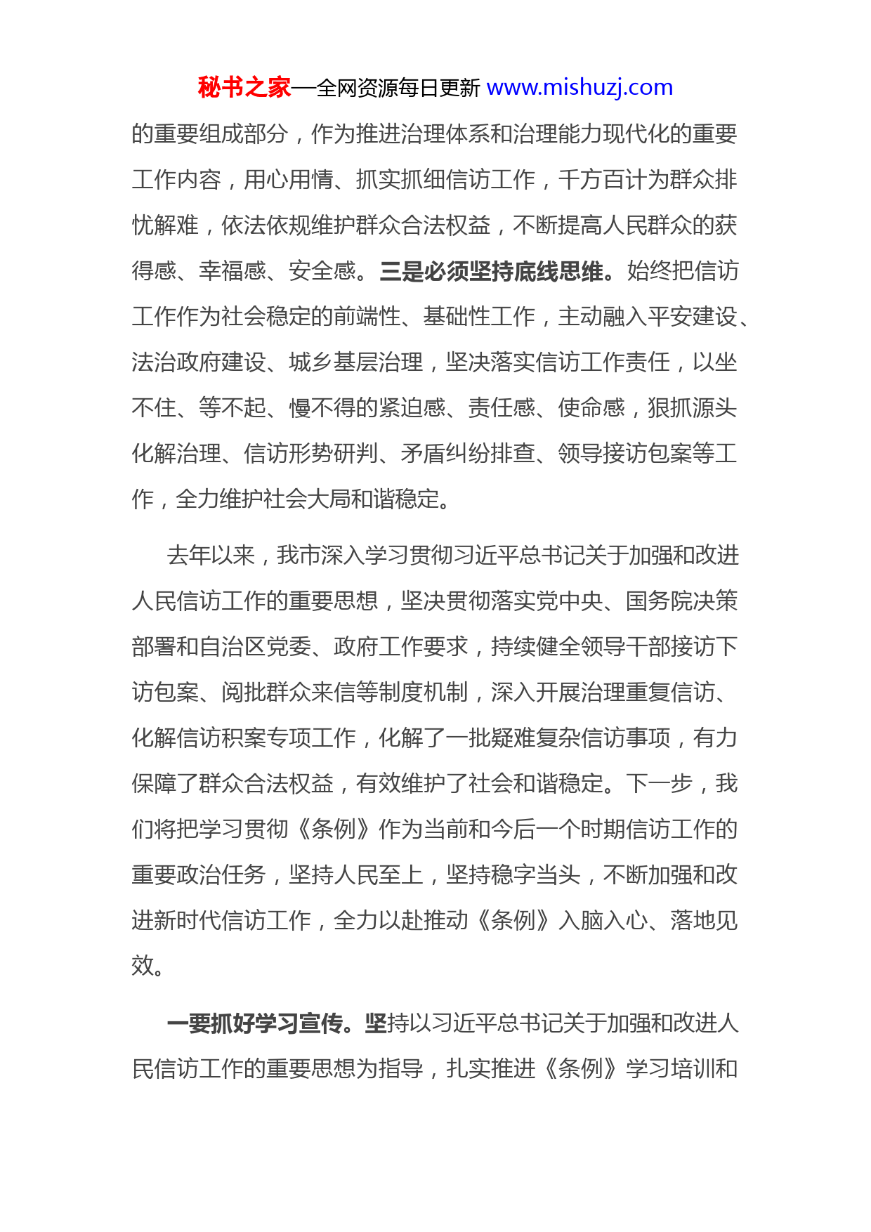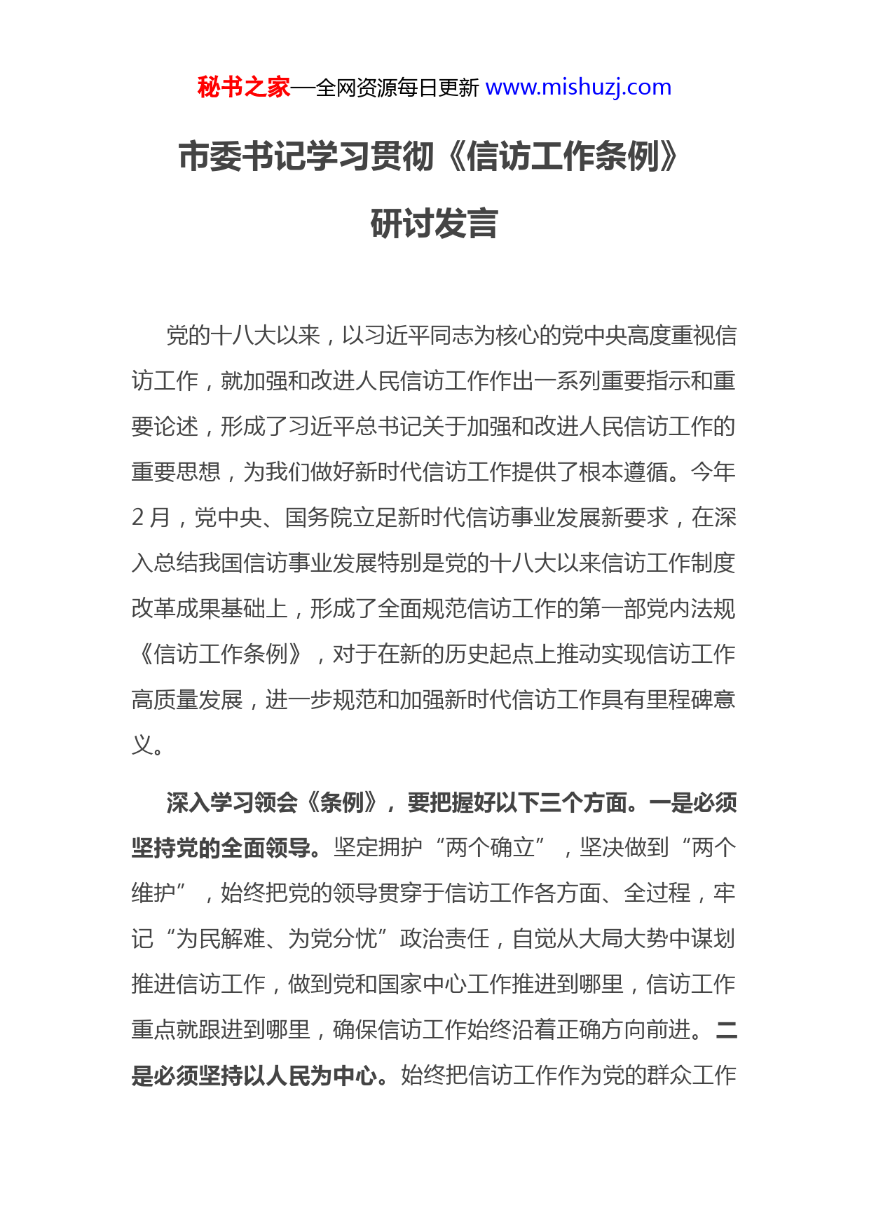 秘书之家—全网资源每日更新www.mishuzj.com市委书记学习贯彻《信访工作条例》研讨发言党的十八大以来,以习近平同志为核心的党中央高度重视信访工作,就加强和改进人民信访工作作出一系列重要指示和重要论述,形成了习近平总书记关于加强和改进人民信访工作的重要思想,为我们做好新时代信访工作提供了根本遵循。今年2月,党中央、国务院立足新时代信访事业发展新要求,在深入总结我国信访事业发展特别是党的十八大以来信访工作制度改革成果基础上,形成了全面规范信访工作的第一部党内法规《信访工作条例》,对于在新的历史起点上推动实现信访工作高质量发展,进一步规范和加强新时代信访工作具有里程碑意义。深入学习领会《条例》,要把握好以下三个方面。一是必须坚持党的全面领导。坚定拥护“两个确立”,坚决做到“两个维护”,始终把党的领导贯穿于信访工作各方面、全过程,牢记“为民解难、为党分忧”政治责任,自觉从大局大势中谋划推进信访工作,做到党和国家中心工作推进到哪里,信访工作重点就跟进到哪里,确保信访工作始终沿着正确方向前进。二是必须坚持以人民为中心。始终把信访工作作为党的群众工作秘书之家—全网资源每日更新www.mishuzj.com的重要组成部分,作为推进治理体系和治理能力现代化的重要工作内容,用心用情、抓实抓细信访工作,千方百计为群众排忧解难,依法依规维护群众合法权益,不断提高人民群众的获得感、幸福感、安全感。三是必须坚持底线思维。始终把信访工作作为社会稳定的前端性、基础性工作,主动融入平安建设、法治政府建设、城乡基层治理,坚决落实信访工作责任,以坐不住、等不起、慢不得的紧迫感、责任感、使命感,狠抓源头化解治理、信访形势研判、矛盾纠纷排查、领导接访包案等工作,全力维护社会大局和谐稳定。去年以来,我市深入学习贯彻习近平总书记关于加强和改进人民信访工作的重要思想,坚决贯彻落实党中央、国务院决策部署和自治区党委、政府工作要求,持续健全领导干部接访下访包案、阅批群众来信等制度机制,深入开展治理重复信访、化解信访积案专项工作,化解了一批疑难复杂信访事项,有力保障了群众合法权益,有效维护了社会和谐稳定。下一步,我们将把学习贯彻《条例》作为当前和今后一个时期信访工作的重要政治任务,坚持人民至上,坚持稳字当头,不断加强和改进新时代信访工作,全力以赴推动《条例》入脑入心、落地见效。一要抓好学习宣传。坚持以习近平总书记关于加强和改进人民信访工作的重要思想为指导,扎实推进《条例》学习培训和秘书之家—全网资源每日更新www.mishuzj.com宣传解读工作,将《条例》纳入各级党委(党组)理论学习中心组学习内容、纳入党校(行政学院)教学计划,组织开展多种形式的专题学习培训,不断提升各级各部门信访干部掌握《条例》、运用《条例》、落实《条例》的能力和水平。同时,把《条例》作为“八五”普法重要内容,组织开展好集中宣传活动,推动条例进乡村、进社区、进学校、进企业、进单位,引导群众依法理性表达诉求,着力营造办事依法、遇事找法、解决问题用法、化解矛盾靠法的良好环境。二要提升工作效能。要以《条例》实施为契机,加快制定出台相关配套措施,统筹做好信访领域规范性文件废改立工作,确保顺畅衔接、平稳过渡。着力加强网上信访工作,充分发挥网上信访主渠道作用,牢牢把握网上信访主导权。深入开展“诉源治理”,加强初信初访案件办理,从源头上减少信访问题的产生和积累。进一步夯实信访工作基层基础,扎实做好风险隐患排查防控,及时就地化解信访矛盾。持续加强干部队伍建设,不断提升信访干部政治业务素养、政策理论水平和群众工作能力,为做好新时代信访工作提供坚强保障。三要凝聚工作合力。压实工作责任,坚持党政主要领导亲自抓、分管领导重点抓,以上率下、强力推动,切实解决好各类信访问题。强化统筹协调,牢固树立全市“一盘棋”思想,完善协调联动机制,着力构建党委统一领导、政府组织落实、信秘书之家—全网资源每日更新www.mishuzj.com访工作联席会议协调、信访部门推动、各方齐抓共管的信访工作格局。严格督导检查,完善监督考核评价机制,确保《条例》各项要求不折不扣贯彻执行,推动全市信访工作再上新台阶,为党的二十大胜利召开营造和谐稳定的社会环境。