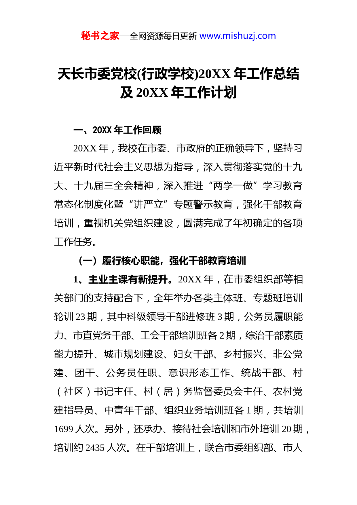 秘书之家—全网资源每日更新www.mishuzj.com天长市委党校(行政学校)20XX年工作总结及20XX年工作计划一、20XX年工作回顾20XX年,我校在市委、市政府的正确领导下,坚持习近平新时代社会主义思想为指导,深入贯彻落实党的十九大、十九届三全会精神,深入推进“两学一做”学习教育常态化制度化暨“讲严立”专题警示教育,强化干部教育培训,重视机关党组织建设,圆满完成了年初确定的各项工作任务。(一)履行核心职能,强化干部教育培训1、主业主课有新提升。20XX年,在市委组织部等相关部门的支持配合下,全年举办各类主体班、专题班培训轮训23期,其中科级领导干部进修班3期,公务员履职能力、市直党务干部、工会干部培训班各2期,综治干部素质能力提升、城市规划建设、妇女干部、乡村振兴、非公党建、团干、公务员任职、意识形态工作、统战干部、村(社区)书记主任、村(居)务监督委员会主任、农村党建指导员、中青年干部、组织业务培训班各1期,共培训1699人次。另外,还承办、接待社会培训和市外培训20期,培训约2435人次。在干部培训上,联合市委组织部、市人秘书之家—全网资源每日更新www.mishuzj.com社局制定了《20XX-2020年天长市行政机关公务员培训方案》,并认真组织实施,确保每位公务员每年达到上级规定的培训学时。在教学内容上,把马克思主义理论教育和党性教育作为党校的主课,这两类课在主体班教学安排中达到总课时的70%。在课题开发上,开设了马列经典著作导读课,打造了龙岗党性教育基地。在教学管理上,推进工作创新,按照《天长市干部培训量化考核暂行办法》,采取百分制方式,从出勤考核、培训成效、考试成绩三个方面,对学员培训进行量化考核,严格学员管理。2、课研咨政有新突破。我校教科研工作牢牢坚持为市委市政府决策服务、为教学服务、为社会服务的方向,紧密围绕我市经济社会发展情况开展调研。今年,我校科研工作重点围绕乡村振兴、农村文化建设、菜蓝子工程等进行调研,共形成调研文章、理论文章、咨政报告20篇。其中1篇咨政文章获市政府主要领导批示肯定,2篇咨政文章获市委分管领导批示肯定。3、学历教育有新扩展。今年,我校合工大成人教育函授站共有专本科注册学员近500名。一方面,我们加强教学过程管理,从办学开始,就分专业分班级建立学员个人的学习档案,指派专人任班主任全程服务,每学期记录好学生的考勤、考试情况,做到准确清楚、备查方便。18年上半年,183名学员通过合工大组织的论文答辩,拿到毕业证秘书之家—全网资源每日更新www.mishuzj.com书。另一方面通过媒体广告、网络宣传等方式,加强宣传努力扩大招生规模,促进函授站稳步发展。下半年,有199名学员到我校函授站报考。(二)狠抓机关党建,推动机关作风转变1、深入推进“两学一做”学习教育常态化制度化和“讲严立”专题警示教育。按照“两学一做”学习教育常态化制度化要求,认真学习习近平总书记关于全面从严治党系列重要讲话精神和有关讲忠诚、严纪律、立政德方面的重要论述;学习党的十九大精神和有关法律法规及新修订的纪律处分条例。开展了“不忘初心忘没忘?牢记使命牢不牢?”和“三问三查”集中研讨。组织全体党员观看警示教育片《权》,到天长看守所接受警示教育我市反腐倡廉警示教育。召开“讲严立”警示教育专题民主生活会会后对校委班子查摆出了16个突出问题、班子成员查出的28个问题都制定了整改清单,分清责任,研究落实了整改措施。2、扎实做好机关党建工作。一是夯实党校党组织基础党校总支及所属支部严格按照程完成换届。各支部按要求做好党费收缴,及时组织人员参加党务干部培训,规范入党积极分子的教育培。二是灵活多样开展主题教育活动。“七一”期间,组织全体在职党员赴淮海战役烈士纪念馆周恩来纪念馆开展祭奠、参观、重温入党誓词等活动;组秘书之家—全网资源每日更新www.mishuzj.com织党员集中观看一场《建党伟业》、《开天辟地》等红色影视片;参加市直工委开展的以“不忘初心、牢记使命”为主题的党建知识竞赛,并获总分第二。推进了基层党组织党建结对活动,支持秦栏镇新民村建设1.5万元,深入联合党委所在的千秋社区和结对共建村(社区),对生活困难党员开展慰问活动。三是认真落实党建工作责任制。定期召开党建会议,对党建工作进行安排部署,明确全年党建工作的目标和任务,真正把党建工作纳入重要议事日程认真落实党内政治生活,坚持民主生活会、组织生活会、“三课一会”制度,全年召开总支支委会4次、全体党员学习会40次、上党课4次,开展民主评议党员、党性分析活动。3、强化机关作风建设。出台了《中共天长市委党校作风建设“三治三提”活动行动方案》《中共天长市委党校专兼职教师教学科研工作量考核办法(试行)》《中共天长市委党校主体班班主任工作规定》等,着力解决不想担当、标准不高、作风散漫等问题。(三)加强队伍建设,提升履行职责能力1、加强教职工思想教育。坚持“党校姓党”原则,强化理论教育,引导全体党员牢固树立“四个意识”,时刻保持高度的政治觉悟、坚定的政治立场、严明的政治纪律敏锐的政治鉴别力和政治敏感性,在思想上政治上行动上秘书之家—全网资源每日更新www.mishuzj.com做到“两个维护”。选派