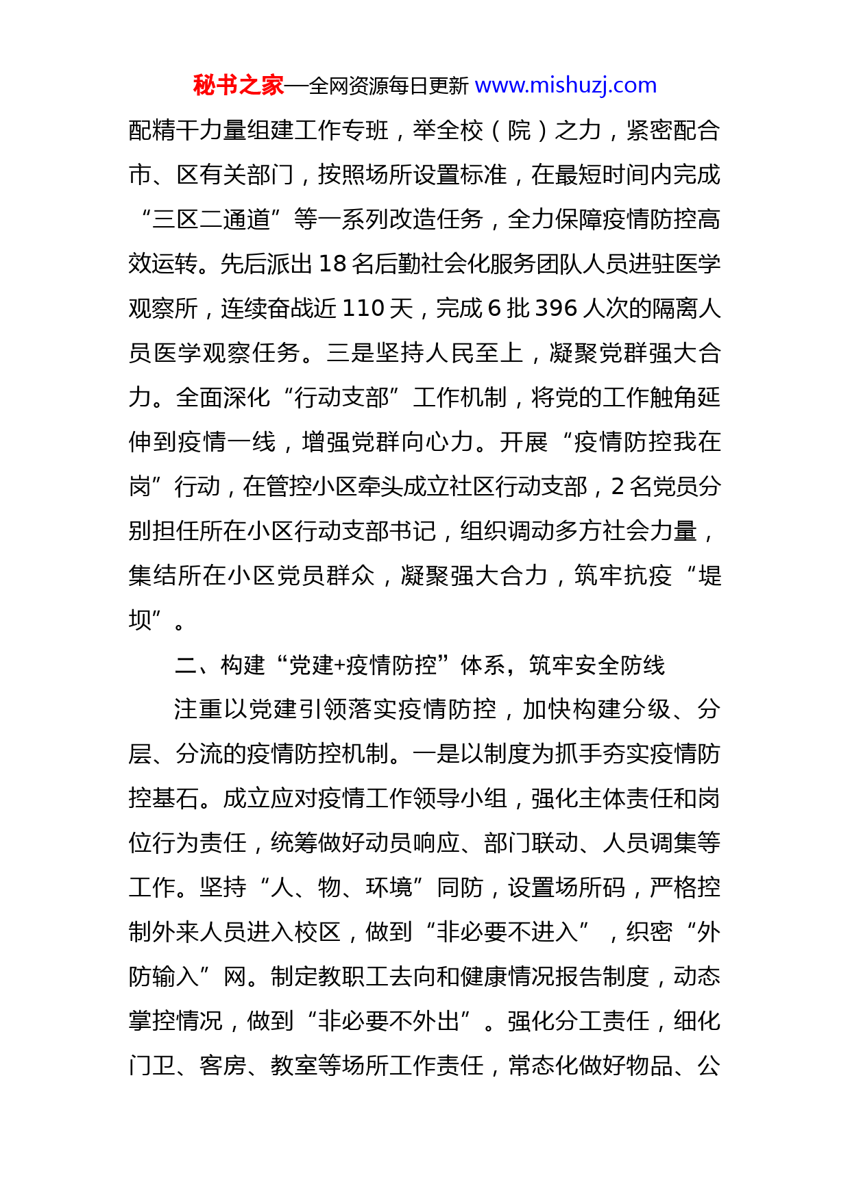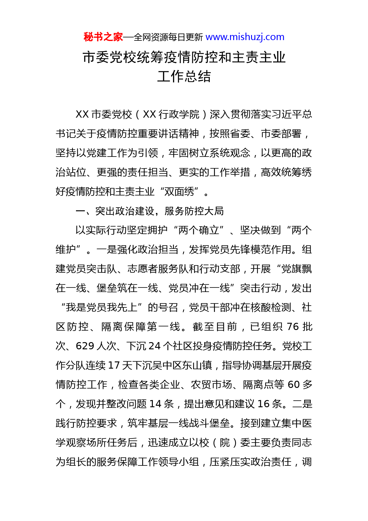 秘书之家—全网资源每日更新www.mishuzj.com市委党校统筹疫情防控和主责主业工作总结XX市委党校(XX行政学院)深入贯彻落实习近平总书记关于疫情防控重要讲话精神,按照省委、市委部署,坚持以党建工作为引领,牢固树立系统观念,以更高的政治站位、更强的责任担当、更实的工作举措,高效统筹绣好疫情防控和主责主业“双面绣”。一、突出政治建设,服务防控大局以实际行动坚定拥护“两个确立”、坚决做到“两个维护”。一是强化政治担当,发挥党员先锋模范作用。组建党员突击队、志愿者服务队和行动支部,开展“党旗飘在一线、堡垒筑在一线、党员冲在一线”突击行动,发出“我是党员我先上”的号召,党员干部冲在核酸检测、社区防控、隔离保障第一线。截至目前,已组织76批次、629人次、下沉24个社区投身疫情防控任务。党校工作分队连续17天下沉吴中区东山镇,指导协调基层开展疫情防控工作,检查各类企业、农贸市场、隔离点等60多个,发现并整改问题14条,提出意见和建议16条。二是践行防控要求,筑牢基层一线战斗堡垒。接到建立集中医学观察场所任务后,迅速成立以校(院)委主要负责同志为组长的服务保障工作领导小组,压紧压实政治责任,调秘书之家—全网资源每日更新www.mishuzj.com配精干力量组建工作专班,举全校(院)之力,紧密配合市、区有关部门,按照场所设置标准,在最短时间内完成“三区二通道”等一系列改造任务,全力保障疫情防控高效运转。先后派出18名后勤社会化服务团队人员进驻医学观察所,连续奋战近110天,完成6批396人次的隔离人员医学观察任务。三是坚持人民至上,凝聚党群强大合力。全面深化“行动支部”工作机制,将党的工作触角延伸到疫情一线,增强党群向心力。开展“疫情防控我在岗”行动,在管控小区牵头成立社区行动支部,2名党员分别担任所在小区行动支部书记,组织调动多方社会力量,集结所在小区党员群众,凝聚强大合力,筑牢抗疫“堤坝”。二、构建“党建+疫情防控”体系,筑牢安全防线注重以党建引领落实疫情防控,加快构建分级、分层、分流的疫情防控机制。一是以制度为抓手夯实疫情防控基石。成立应对疫情工作领导小组,强化主体责任和岗位行为责任,统筹做好动员响应、部门联动、人员调集等工作。坚持“人、物、环境”同防,设置场所码,严格控制外来人员进入校区,做到“非必要不进入”,织密“外防输入”网。制定教职工去向和健康情况报告制度,动态掌控情况,做到“非必要不外出”。强化分工责任,细化门卫、客房、教室等场所工作责任,常态化做好物品、公秘书之家—全网资源每日更新www.mishuzj.com共场所等灭菌消毒工作。二是建立正向激励机制。出台《专业技术人员奖励性绩效工资实施办法》《教学工作量考核办法》等,修订《关于科研项目资助补贴的实施标准》《关于个人专著出版资助及补贴的若干规定》等。将“考场”搬到抗疫一线,坚持在疫情防控一线考察识别干部,将在抗疫中的表现与绩效考核挂钩,通过“听、看、查、评”等方式,动态了解党员干部在疫情防控工作中履职尽责等情况,引导教职工勇担当善作为。三是推进教研咨一体化建设。积极推进教学、科研与决策咨询相互促进、协同发展,实施课题、智库、精品三项工程。制定出台《校学术委员会工作规则》《XX市党校系统协作(专项)课题管理办法》等。建设特色鲜明的教学培训体系、学术研究体系和决策咨询体系一体化系统,下发《关于修订〈中共XX市委党校深入推进“用学术讲政治”教学改革实施方案〉的通知》。创新推行领导干部上讲台制度,完成96门领导干部上讲台新课题申报工作,从“我讲你听”到“你讲我听”和“你讲我也讲”,实现教学相长、学学相长。全面实施精品课行动计划,组织参加XX省党校系统第六届精品课和第十届优秀教学组织奖工作,4门优秀课程通过评审。举办全市党校系统教学竞赛,编写相关教材,完成3门报送中组部的基层干部培训网络课程视频录制编辑工作。近年来,累计组织完成国家社科基金课题1项、秘书之家—全网资源每日更新www.mishuzj.com省社科规划基金课题1项、省社科联精品应用工程课题7项、市社科联应用对策类课题13项和决策咨询类课题2项、书记圈定重大课题19项、环太湖发展研究中心课题27项等课题申报工作。三、聚焦中心工作,坚持党校姓党建设模范机关坚持党校姓党,在高效统筹疫情防控和主责主业中找准工作重点,坚定拥护“两个确立”、坚决做到“两个维护”,建设模范机关,把党校姓党的底色擦得更亮。一是搭建线上教学平台。把教学培训从线下讲堂“搬”到网络空间,完成4期1851人线上培训,配合市委组织部做好线上培训组织工作,做到“停课不停教、停课不停学”。统筹开展课程录制,根据不同班级提供差异化课程教学,先后围绕XX市服务业相关领域纾困和恢复发展政策意见,为22家单位录制27门课程。二是明确决策咨询主攻方向。紧贴市委、市政府中心工作,加强与政策研究部门联系合作,服务教研咨一体化发展。2名同志到市委、市政府相关部门挂职锻炼,启动全市党校系统“马克思主义青年学者”人才培养工程,开展“青年学术沙龙”交流活动,打造本领过硬的决策咨询队伍。突出党校特色,围绕提升教师课题申报和决策咨询水平,邀请市社科联领导