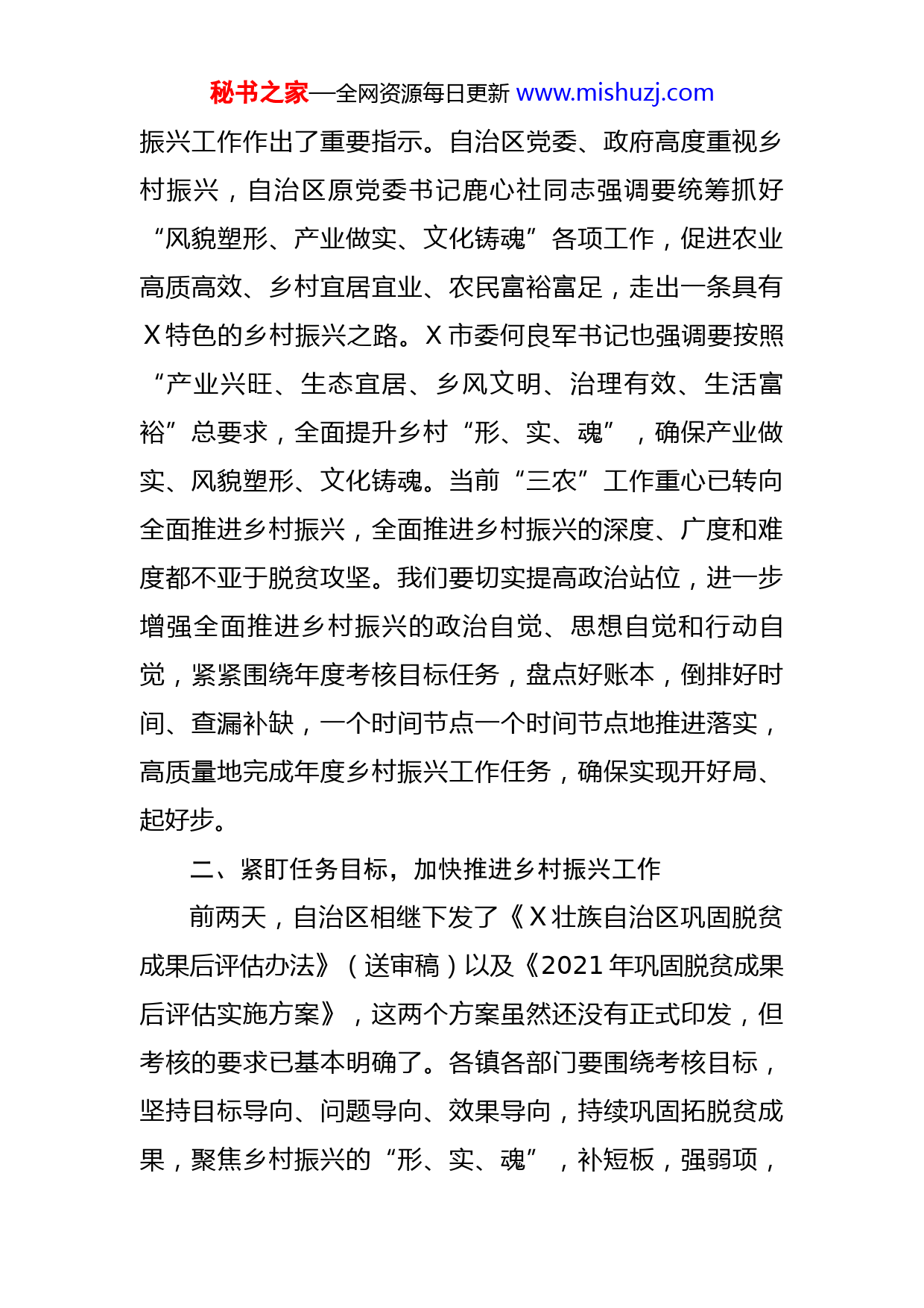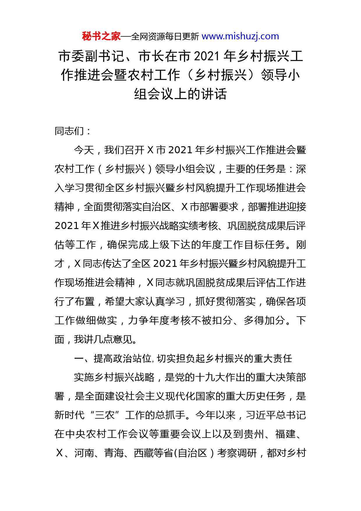 秘书之家—全网资源每日更新www.mishuzj.com市委副书记、市长在市2021年乡村振兴工作推进会暨农村工作(乡村振兴)领导小组会议上的讲话同志们:今天,我们召开X市2021年乡村振兴工作推进会暨农村工作(乡村振兴)领导小组会议,主要的任务是:深入学习贯彻全区乡村振兴暨乡村风貌提升工作现场推进会精神,全面贯彻落实自治区、X市部署要求,部署推进迎接2021年X推进乡村振兴战略实绩考核、巩固脱贫成果后评估等工作,确保完成上级下达的年度工作目标任务。刚才,X同志传达了全区2021年乡村振兴暨乡村风貌提升工作现场推进会精神,X同志就巩固脱贫成果后评估工作进行了布置,希望大家认真学习,抓好贯彻落实,确保各项工作做细做实,力争年度考核不被扣分、多得加分。下面,我讲几点意见。一、提高政治站位,切实担负起乡村振兴的重大责任实施乡村振兴战略,是党的十九大作出的重大决策部署,是全面建设社会主义现代化国家的重大历史任务,是新时代“三农”工作的总抓手。今年以来,习近平总书记在中央农村工作会议等重要会议上以及到贵州、福建、X、河南、青海、西藏等省(自治区)考察调研,都对乡村秘书之家—全网资源每日更新www.mishuzj.com振兴工作作出了重要指示。自治区党委、政府高度重视乡村振兴,自治区原党委书记鹿心社同志强调要统筹抓好“风貌塑形、产业做实、文化铸魂”各项工作,促进农业高质高效、乡村宜居宜业、农民富裕富足,走出一条具有X特色的乡村振兴之路。X市委何良军书记也强调要按照“产业兴旺、生态宜居、乡风文明、治理有效、生活富裕”总要求,全面提升乡村“形、实、魂”,确保产业做实、风貌塑形、文化铸魂。当前“三农”工作重心已转向全面推进乡村振兴,全面推进乡村振兴的深度、广度和难度都不亚于脱贫攻坚。我们要切实提高政治站位,进一步增强全面推进乡村振兴的政治自觉、思想自觉和行动自觉,紧紧围绕年度考核目标任务,盘点好账本,倒排好时间、查漏补缺,一个时间节点一个时间节点地推进落实,高质量地完成年度乡村振兴工作任务,确保实现开好局、起好步。二、紧盯任务目标,加快推进乡村振兴工作前两天,自治区相继下发了《X壮族自治区巩固脱贫成果后评估办法》(送审稿)以及《2021年巩固脱贫成果后评估实施方案》,这两个方案虽然还没有正式印发,但考核的要求已基本明确了。各镇各部门要围绕考核目标,坚持目标导向、问题导向、效果导向,持续巩固拓脱贫成果,聚焦乡村振兴的“形、实、魂”,补短板,强弱项,秘书之家—全网资源每日更新www.mishuzj.com加快推进乡村振兴各项工作。(一)要巩固拓展脱贫攻坚成果。严格落实“四个不摘”要求,持续抓好防止返贫监测和帮扶工作,坚决守住不发生规模性返贫底线。一是要扎实做好防止返贫动态监测和帮扶工作,做到实时监测、精准帮扶、动态清零。二要持续巩固拓展“三保障”和饮水安全成果,确保义务教育保障、基本医疗保障、住房保障和饮水安全得到持续巩固不反弹。三要加快推进衔接资金使用和项目建设。截至X月X日,我市巩固脱贫成果和乡村振兴项目开工率为X%、完工率为X%,财政衔接资金支出率为X%,资金支出率没有达到自治区X月底完成X%以上的要求。各镇各部门要对照年度衔接资金绩效评价各项指标,加快项目建设进度,确保X月底前衔接资金支出率一定要达到X%以上。(二)扎实推进乡村振兴各项工作。一是推进乡村风貌改造提升。今年我市乡村风貌提升全域基本整治型村庄建设任务X个,已开工X个,竣工X个。南友高速(X段)沿线乡村风貌提升任务共X栋农房,其中第一批任务X栋,已全部开工并完工,开工率和完工率均为X%;第二批任务X栋,开工X栋,开工率X%,完工X栋,完工率X%,要加快推进力度,力争X月X日前完工。二是加快产业发展。产业兴旺是乡村振兴的重要基础,各镇要立足资源禀赋和产业基础,推动农业产业链延伸融合,实现一二三秘书之家—全网资源每日更新www.mishuzj.com产业融合发展,努力促进农民增收。三是深化乡风文明建设。乡村文化是乡村振兴的灵魂,要坚持物质文明和精神文明一起抓,加强和改善乡村治理,弘扬优秀传统乡土文化,加快构建治理有效、充满活力、和谐有序的乡村社会。四是推进数字乡村建设。数字乡村是乡村振兴的战略方向,也是提振乡村发展动力和效能的重要突破口。各镇各部门要因地制宜推进数字乡村建设,加快完善农村数字基础设施,建立乡村人员、产业、资源等信息数据库,推动农村千兆光网、XG、移动物联网建设,筑牢数字乡村的发展基础。推动农村电子商务发展,加强党建、政务、社会治理以及资源资产管理等方面数字化应用,推动乡村治理信息化、智能化和现代化,向群众提供优质智慧公共服务。(三)提前准备考核迎检工作。从下个月开始,国家和自治区即将启动乡村振兴战略实绩考核和巩固脱贫成果后评估工作。各镇各部门要尽快学习《2021年X推进乡村振兴战略实绩考核实施方案》和《2021年度巩固脱贫成果后评估实施方案》,研究吃透文件精神,抓紧工作部署,重点对防贫监测、帮扶政策落实等考核指标,逐项研究抓落实,确保完成较好的指标多加分,完成有困难的指标,争取不丢分。指标涉及的有关部门,要逐一对照考核标准,认真梳理工作短板弱项,查漏补缺,规范整理台账。秘书之家—