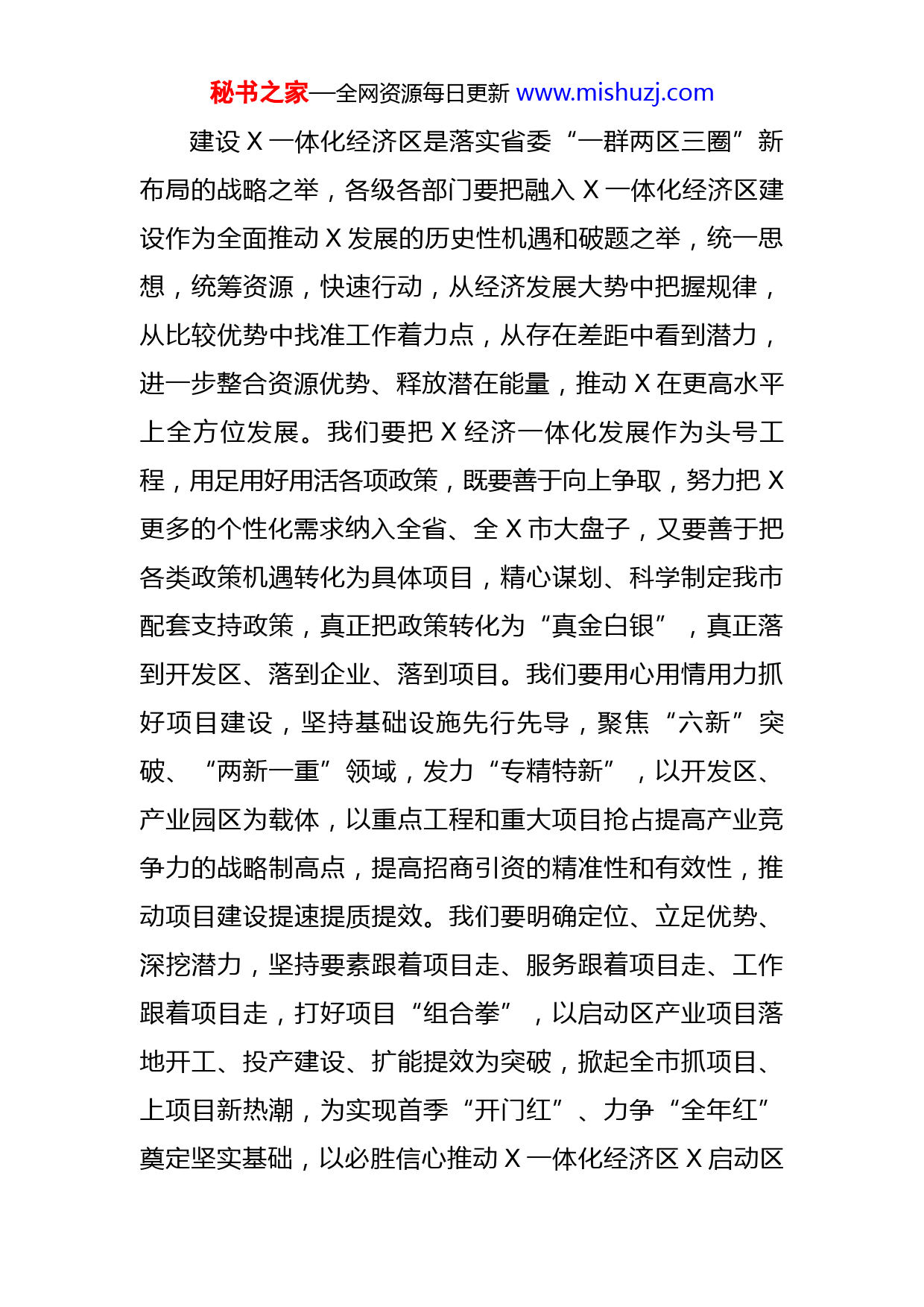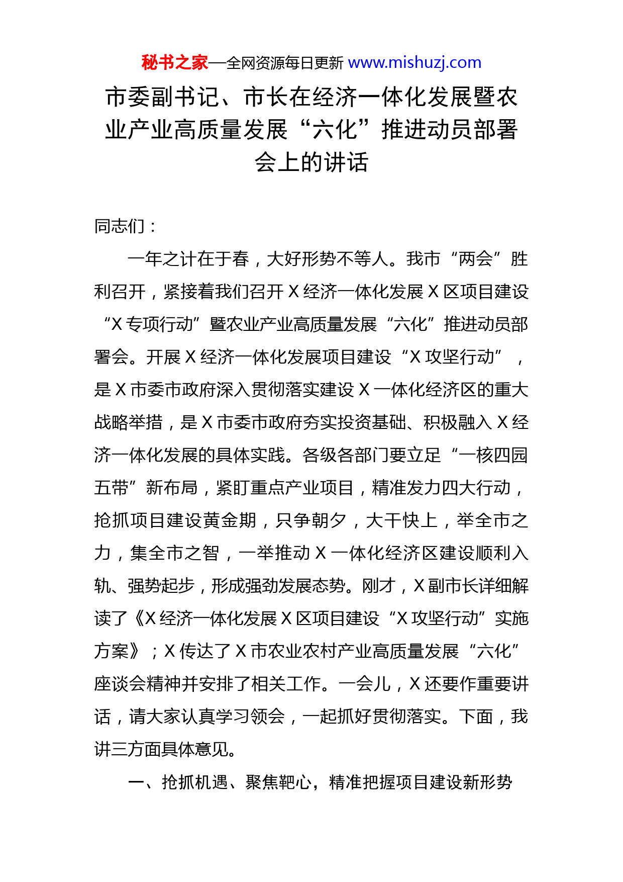 秘书之家—全网资源每日更新www.mishuzj.com市委副书记、市长在经济一体化发展暨农业产业高质量发展“六化”推进动员部署会上的讲话同志们:一年之计在于春,大好形势不等人。我市“两会”胜利召开,紧接着我们召开X经济一体化发展X区项目建设“X专项行动”暨农业产业高质量发展“六化”推进动员部署会。开展X经济一体化发展项目建设“X攻坚行动”,是X市委市政府深入贯彻落实建设X一体化经济区的重大战略举措,是X市委市政府夯实投资基础、积极融入X经济一体化发展的具体实践。各级各部门要立足“一核四园五带”新布局,紧盯重点产业项目,精准发力四大行动,抢抓项目建设黄金期,只争朝夕,大干快上,举全市之力,集全市之智,一举推动X一体化经济区建设顺利入轨、强势起步,形成强劲发展态势。刚才,X副市长详细解读了《X经济一体化发展X区项目建设“X攻坚行动”实施方案》;X传达了X市农业农村产业高质量发展“六化”座谈会精神并安排了相关工作。一会儿,X还要作重要讲话,请大家认真学习领会,一起抓好贯彻落实。下面,我讲三方面具体意见。一、抢抓机遇、聚焦靶心,精准把握项目建设新形势秘书之家—全网资源每日更新www.mishuzj.com建设X一体化经济区是落实省委“一群两区三圈”新布局的战略之举,各级各部门要把融入X一体化经济区建设作为全面推动X发展的历史性机遇和破题之举,统一思想,统筹资源,快速行动,从经济发展大势中把握规律,从比较优势中找准工作着力点,从存在差距中看到潜力,进一步整合资源优势、释放潜在能量,推动X在更高水平上全方位发展。我们要把X经济一体化发展作为头号工程,用足用好用活各项政策,既要善于向上争取,努力把X更多的个性化需求纳入全省、全X市大盘子,又要善于把各类政策机遇转化为具体项目,精心谋划、科学制定我市配套支持政策,真正把政策转化为“真金白银”,真正落到开发区、落到企业、落到项目。我们要用心用情用力抓好项目建设,坚持基础设施先行先导,聚焦“六新”突破、“两新一重”领域,发力“专精特新”,以开发区、产业园区为载体,以重点工程和重大项目抢占提高产业竞争力的战略制高点,提高招商引资的精准性和有效性,推动项目建设提速提质提效。我们要明确定位、立足优势、深挖潜力,坚持要素跟着项目走、服务跟着项目走、工作跟着项目走,打好项目“组合拳”,以启动区产业项目落地开工、投产建设、扩能提效为突破,掀起全市抓项目、上项目新热潮,为实现首季“开门红”、力争“全年红”奠定坚实基础,以必胜信心推动X一体化经济区X启动区秘书之家—全网资源每日更新www.mishuzj.com强势起步。二、夯实责任、凝聚合力,全面启动项目建设各项工作项目是经济发展的“牛鼻子”,今天的项目就是明天的发展,今天的投资结构就是明天的产业结构。X专项行动是实现“补考进位”的重要窗口期,是对广大党员干部素质能力、作风业绩的现实检验。大家要拿出真招、实招、管用的招,大抓招商、掀起热潮,做大盘子、提升规模,优化结构、提质增效,加强谋划、做实储备,加快进度、投产达效,抓紧前期,争取落地。一是高起点谋划储备项目。围绕国家、省、X市政策导向,抢抓“补短板”机遇,在铁路、公路、机场、城市建设、生态环保、社会民生等方面,谋划一批重大基础设施项目;要围绕转型要求,按照巩固培育壮大新兴产业、改造提升传统产业的总体思路和全产业链发展模式,谋划一批新兴产业项目。做实做细建设项目、重点工程项目、专项债券项目、中央预算内投资项目“四张清单”,加大项目资金争取力度,截至目前:续建项目X个,年度计划投资X亿元;新建项目共X个,总投资X亿元。大家要充分用好用足年初这一谋项目、争项目的关键期,紧抓续建项目建设进度,细抓新建项目开工准备,跑出项目建设“加速度”,为全年的项目开展抢占先机、赢得主动、打好基秘书之家—全网资源每日更新www.mishuzj.com础。二是全面梳理计划开工项目。对前期项目、招商引资项目、新开工项目和在建项目存在问题进行逐项分析,分类施策提出推进计划,列出时间表、任务书。相关部门要集中开展项目审批,倒排时限、限时办结,为建设项目提供闭环式链条审批服务,坚决打破“项目等手续、资金等开工”怪圈,集中力量破解项目前期滞后、项目储备不足等问题。对前期手续完备且符合审批条件的,加快手续办理,实施领导挂帅办、联审联批办、全程跟踪办,提高办事效率,限时办结;对前期手续不完备的督促项目单位制定详细前期工作时间进度表,尽快完成可研、立项、规划、环评、土地等项目前期相关手续。三是持续发力抓好招商引资。采取“走出去、引进来”的方式,围绕重点产业和重点项目,实施专业招商、小分队招商、以商招商,系统招商、定向招商、精准招商,进一步深化全员招商、全年招商、全民招商,真正引进一批补链、壮链、延链的优势产业项目,为我市加快转型发展提供强有力的项目支撑。同时,对于X年计划落地的项目,要明确项目领导,明确项目落地手续办理单位和部门,建立项目落地跟踪机制,对外来重大投资项目开展代办服务,加快推进重大招商引资项目的落地。四是谋划实施农业产业项目。深入贯彻落实X书记农秘书之家—全网资源每日更新www.mishuzj.com业产业发