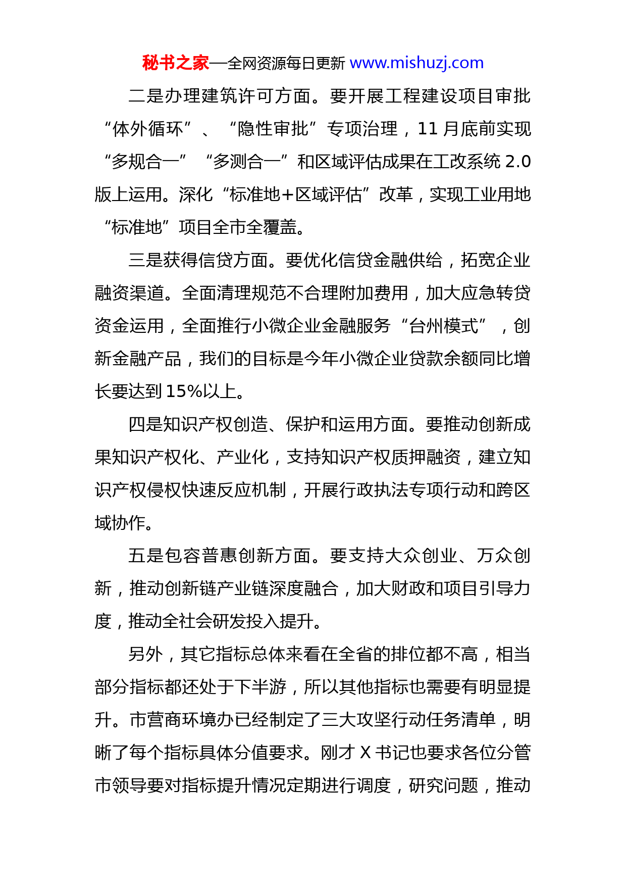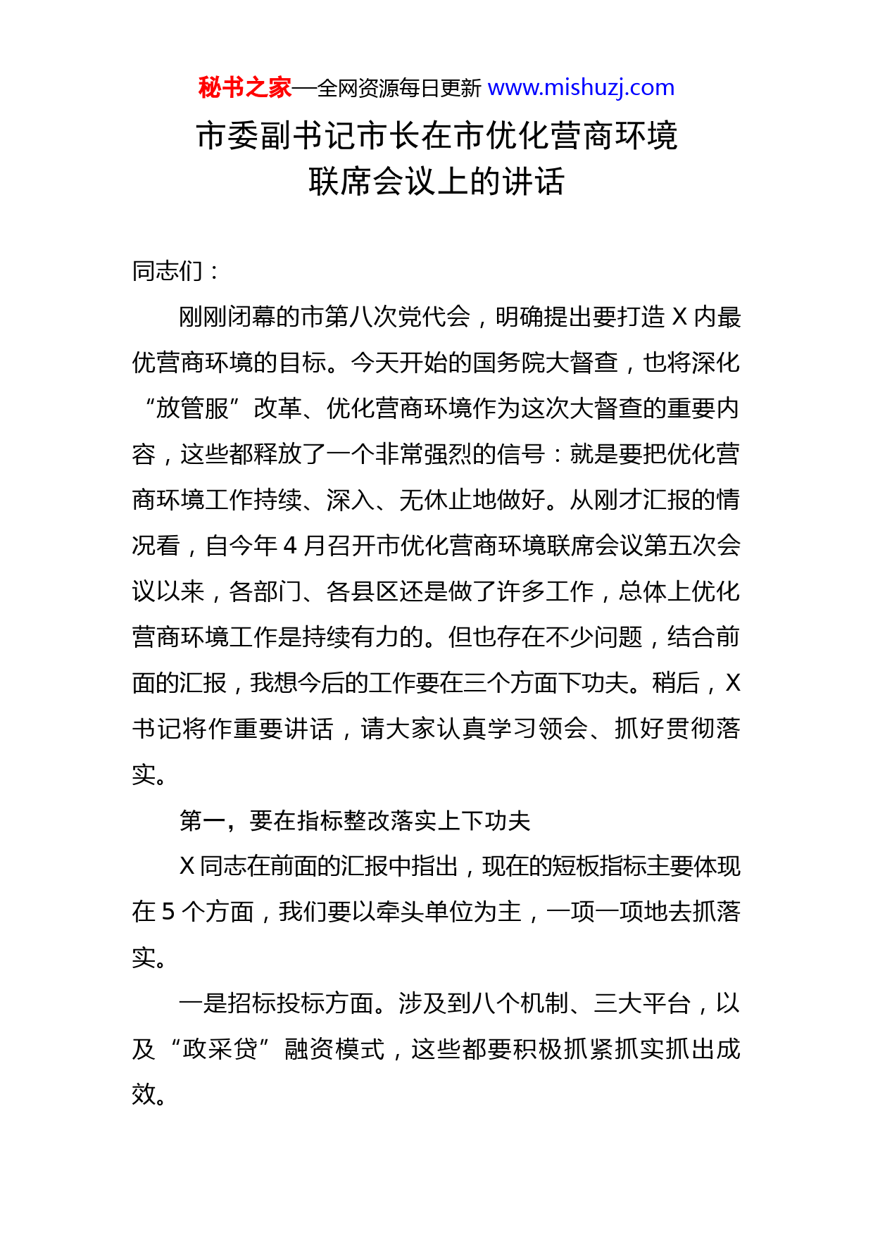 秘书之家—全网资源每日更新www.mishuzj.com市委副书记市长在市优化营商环境联席会议上的讲话同志们:刚刚闭幕的市第八次党代会,明确提出要打造X内最优营商环境的目标。今天开始的国务院大督查,也将深化“放管服”改革、优化营商环境作为这次大督查的重要内容,这些都释放了一个非常强烈的信号:就是要把优化营商环境工作持续、深入、无休止地做好。从刚才汇报的情况看,自今年4月召开市优化营商环境联席会议第五次会议以来,各部门、各县区还是做了许多工作,总体上优化营商环境工作是持续有力的。但也存在不少问题,结合前面的汇报,我想今后的工作要在三个方面下功夫。稍后,X书记将作重要讲话,请大家认真学习领会、抓好贯彻落实。第一,要在指标整改落实上下功夫X同志在前面的汇报中指出,现在的短板指标主要体现在5个方面,我们要以牵头单位为主,一项一项地去抓落实。一是招标投标方面。涉及到八个机制、三大平台,以及“政采贷”融资模式,这些都要积极抓紧抓实抓出成效。秘书之家—全网资源每日更新www.mishuzj.com二是办理建筑许可方面。要开展工程建设项目审批“体外循环”、“隐性审批”专项治理,11月底前实现“多规合一”“多测合一”和区域评估成果在工改系统2.0版上运用。深化“标准地+区域评估”改革,实现工业用地“标准地”项目全市全覆盖。三是获得信贷方面。要优化信贷金融供给,拓宽企业融资渠道。全面清理规范不合理附加费用,加大应急转贷资金运用,全面推行小微企业金融服务“台州模式”,创新金融产品,我们的目标是今年小微企业贷款余额同比增长要达到15%以上。四是知识产权创造、保护和运用方面。要推动创新成果知识产权化、产业化,支持知识产权质押融资,建立知识产权侵权快速反应机制,开展行政执法专项行动和跨区域协作。五是包容普惠创新方面。要支持大众创业、万众创新,推动创新链产业链深度融合,加大财政和项目引导力度,推动全社会研发投入提升。另外,其它指标总体来看在全省的排位都不高,相当部分指标都还处于下半游,所以其他指标也需要有明显提升。市营商环境办已经制定了三大攻坚行动任务清单,明晰了每个指标具体分值要求。刚才X书记也要求各位分管市领导要对指标提升情况定期进行调度,研究问题,推动秘书之家—全网资源每日更新www.mishuzj.com工作。同时也希望各县区、有关部门按照清单要求,进一步细化工作,落实专班,找准问题,集中攻坚,确保各项排位升级晋档。第二,在提升工作质效上下功夫《优化营商环境条例》中有三句话,是评价、衡量营商环境质效和优化营商环境的最好措施。这三句话就是:最大限度减少政府对资源的直接配置、最大限度减少政府对市场活动的直接干预、最大限度提高企业认可度和群众满意度。这“三个最大限度”,聚焦的是市场主体需求,改进的是政务服务水平,是我们在推进营商环境优化中必须紧盯的目标。一是“放”的力道要给够。全面加强权责清单管理,及时做好清单内容动态调整,形成纵向统一的行政权力清单。要清理部门之间职能交叉、职责重叠等事项,严防部门之间相互踢皮球、推诿扯皮。要深化商事制度改革,加大“证照分离”改革力度,实施涉企经营许可事项全覆盖清单管理,能取消的审批一律不审,能备案的一律备而不审,能压缩的审批一律压缩,实现“照后减证”,持续开展“减证便民”行动,全面推行证明事项告知承诺制。持续完善工程项目“六大中心”建设,加快推进2021年深化工程建设项目审批制度改革50项重点改革任务。二是“管”的成色要夯实。要在坚守法纪底线的前提秘书之家—全网资源每日更新www.mishuzj.com下,少说“这不行”“那不行”,多想一想“怎么才行”。要深化“双随机一公开”联合监管,将双随机与专项检查、节假日和重要时段检查相结合,持续规范涉企检查、参观、考察、调研,真正做到“有事必应”“无事不扰”。要严格落实包容审慎监管理念,探索“包容期”“沙盒监管”、触发式监管等创新手段,在不触碰安全底线、危害人民群众生命健康的情况下,对市场主体的轻微违法行为,不实施行政强制措施。持续推进“互联网+监管”,运用大数据增强政府分析判断和风险预警能力,提升监管执法规范性和透明度。三是“服”的质量要提升。要推进数字政府建设,坚持“联网是原则、孤网是例外”,加大自建业务系统整合力度,推倒数据“烟囱”,构建政务服务“一张网”。要完善提升标准化政务大厅建设,撤并乡镇便民服务中心全部保留。推进“一网通办”前提下“最多跑一次”改革,围绕企业和群众不动产、出生、户口迁移等高频办事需求,推动“一件事一次办”。建立完善异地受办机制,全面推进省内通办、X渝通办、跨省通办。继续完善问题会商、跟踪服务、决策参与、亲清交往、政企互评、督办考核等常态化政企沟通六大机制,用好12345政务服务便民热线、“服务民营企业市长直通车”等平台,走深走实“网上群众路线”,推动线上线下打好“组合拳”,真正秘书之家—全网资源每日更新www.mishuzj.com促进政企良性沟通互动。要尤为注重坚持用户思维,各县区、市级部门主要负责同志要定期亲身体验办事流程,找一找办事不方便、不快捷的问题症结,主动研究思考“怎么办、抓紧办”,
