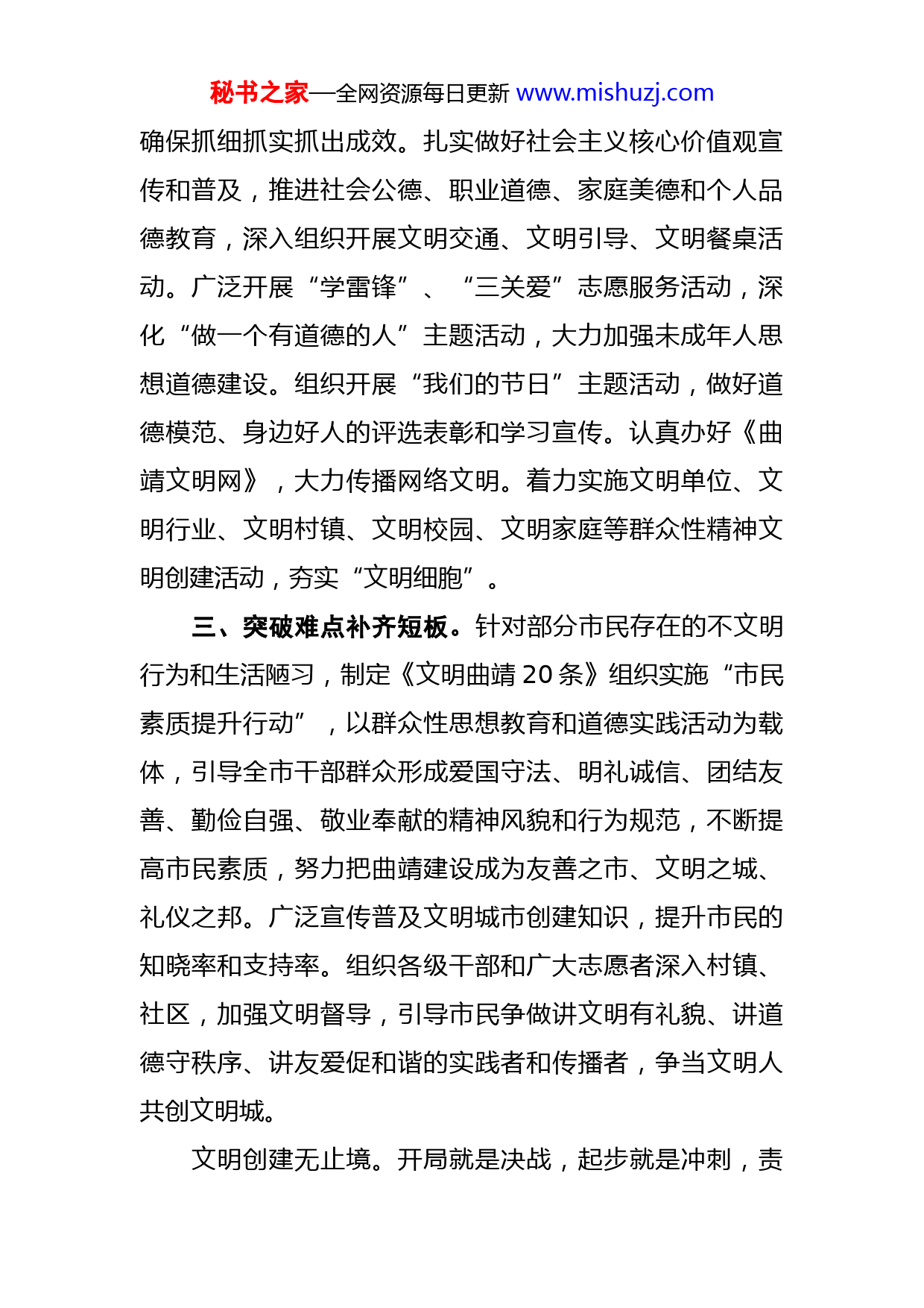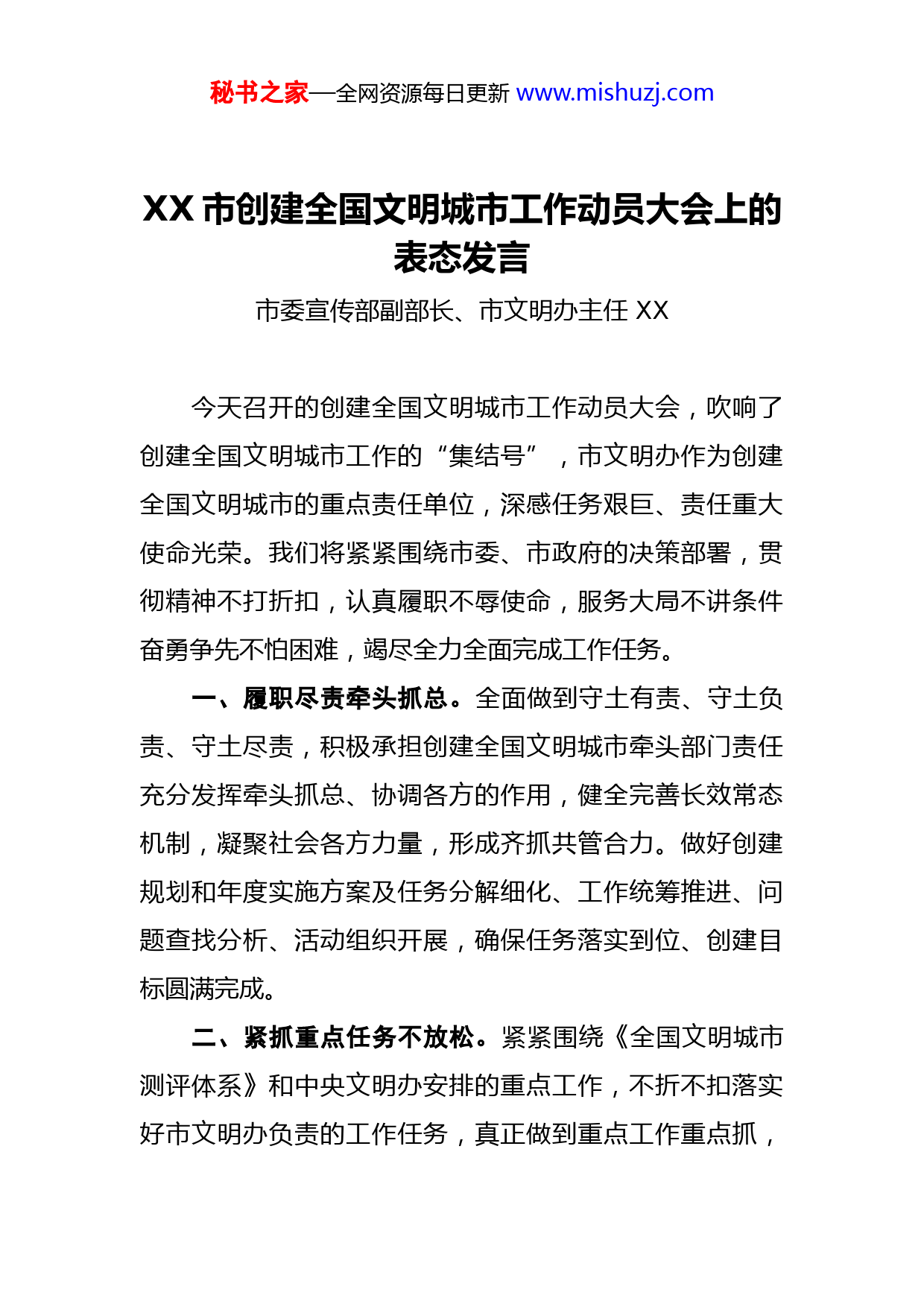 秘书之家—全网资源每日更新www.mishuzj.comXX市创建全国文明城市工作动员大会上的表态发言市委宣传部副部长、市文明办主任XX今天召开的创建全国文明城市工作动员大会,吹响了创建全国文明城市工作的“集结号”,市文明办作为创建全国文明城市的重点责任单位,深感任务艰巨、责任重大使命光荣。我们将紧紧围绕市委、市政府的决策部署,贯彻精神不打折扣,认真履职不辱使命,服务大局不讲条件奋勇争先不怕困难,竭尽全力全面完成工作任务。一、履职尽责牵头抓总。全面做到守土有责、守土负责、守土尽责,积极承担创建全国文明城市牵头部门责任充分发挥牵头抓总、协调各方的作用,健全完善长效常态机制,凝聚社会各方力量,形成齐抓共管合力。做好创建规划和年度实施方案及任务分解细化、工作统筹推进、问题查找分析、活动组织开展,确保任务落实到位、创建目标圆满完成。二、紧抓重点任务不放松。紧紧围绕《全国文明城市测评体系》和中央文明办安排的重点工作,不折不扣落实好市文明办负责的工作任务,真正做到重点工作重点抓,秘书之家—全网资源每日更新www.mishuzj.com确保抓细抓实抓出成效。扎实做好社会主义核心价值观宣传和普及,推进社会公德、职业道德、家庭美德和个人品德教育,深入组织开展文明交通、文明引导、文明餐桌活动。广泛开展“学雷锋”、“三关爱”志愿服务活动,深化“做一个有道德的人”主题活动,大力加强未成年人思想道德建设。组织开展“我们的节日”主题活动,做好道德模范、身边好人的评选表彰和学习宣传。认真办好《曲靖文明网》,大力传播网络文明。着力实施文明单位、文明行业、文明村镇、文明校园、文明家庭等群众性精神文明创建活动,夯实“文明细胞”。三、突破难点补齐短板。针对部分市民存在的不文明行为和生活陋习,制定《文明曲靖20条》组织实施“市民素质提升行动”,以群众性思想教育和道德实践活动为载体,引导全市干部群众形成爱国守法、明礼诚信、团结友善、勤俭自强、敬业奉献的精神风貌和行为规范,不断提高市民素质,努力把曲靖建设成为友善之市、文明之城、礼仪之邦。广泛宣传普及文明城市创建知识,提升市民的知晓率和支持率。组织各级干部和广大志愿者深入村镇、社区,加强文明督导,引导市民争做讲文明有礼貌、讲道德守秩序、讲友爱促和谐的实践者和传播者,争当文明人共创文明城。文明创建无止境。开局就是决战,起步就是冲刺,责秘书之家—全网资源每日更新www.mishuzj.com任就是担当、信任就是动力,我们将把创文重任紧紧扛在肩上,始终牢记在心上,全面落实到行动上,持续推动创建工作向更高目标、更高层次、更高水平迈进,为实现创建全国文明城市目标做出应有的贡献!