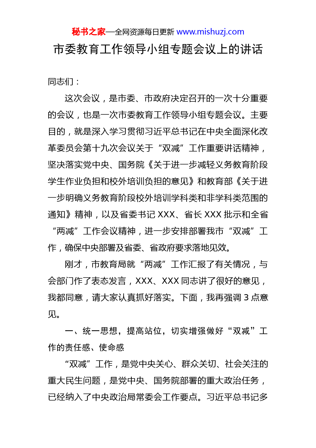 秘书之家—全网资源每日更新www.mishuzj.com市委教育工作领导小组专题会议上的讲话同志们:这次会议,是市委、市政府决定召开的一次十分重要的会议,也是一次市委教育工作领导小组专题会议。主要目的,就是深入学习贯彻习近平总书记在中央全面深化改革委员会第十九次会议关于“双减”工作重要讲话精神,坚决落实党中央、国务院《关于进一步减轻义务教育阶段学生作业负担和校外培训负担的意见》和教育部《关于进一步明确义务教育阶段校外培训学科类和非学科类范围的通知》精神,以及省委书记XXX、省长XXX批示和全省“两减”工作会议精神,进一步安排部署我市“双减”工作,确保中央部署及省委、省政府要求落地见效。刚才,市教育局就“两减”工作汇报了有关情况,与会部门作了表态发言,XXX、XXX同志讲了很好的意见,我都同意,请大家认真抓好落实。下面,我再强调3点意见。一、统一思想,提高站位,切实增强做好“双减”工作的责任感、使命感“双减”工作,是党中央关心、群众关切、社会关注的重大民生问题,是党中央、国务院部署的重大政治任务,已经纳入了中央政治局常委会工作要点。习近平总书记多秘书之家—全网资源每日更新www.mishuzj.com次作出重要指示批示,并亲自审定《关于进一步减轻义务教育阶段学生作业负担和校外培训负担的意见》。李克强总理、王沪宁同志也多次作出指示批示。各部门、单位要进一步统一思想、提高站位,从实现中华民族伟大复兴的战略高度,以对人民、对学生、对事业、对未来高度负责的态度,切实认清做好“双减”工作的重要意义。(一)“双减”是落实立德树人根本任务的重大举措。教育是国之大计、党之大计,基础教育事关国家发展、事关民族未来、事关每个家庭幸福。全面建设社会主义现代化强国,实现中华民族伟大复兴,归根到底要靠教育。推进“双减”工作就是遵循教育规律,坚持正确的办学方向,全力解决中小学生负担太重和短视化、功利化问题,坚决遏制校外培训机构无序发展,“校内减负、校外增负”现象,推动学校教育更优化、校外培训更规范,使教育回归育人本质。(二)“双减”是解决群众“急难愁盼”问题的实际行动。近年来,我市先后对择校热、大班额、入园难等问题实施专项治理,取得了初步成效。但一些校外培训机构抢先学、超纲教、反复练等问题十分突出,不仅加重了学生负担,更让很多家庭不堪重负。尤其是,一些学校教师与培训机构相互勾联、或者自己独立开展课外培训,出现了课堂不讲、课后讲,校内不补、校外补,学校不管、培秘书之家—全网资源每日更新www.mishuzj.com训机构管的现象,家长为了孩子进课后班、进补课班、进培训班,不得不勒紧裤腰带,校外培训越来越普遍,群众反应非常强烈,与我们的教育理念、教育出发点背道而驰。推进“双减”工作,就是要坚持问题导向,全力解决学生校内校外负担问题,办好人民满意的教育。(三)“双减”是深化教育领域综合改革的重要内容。一个时期以来,我市深入贯彻党的教育方针,积极探索教育理念和教育评价改革,收到了良好成效。但是我们也要清醒认识到,教育短视化、功利化问题还没有根本解决。尤其是,当前很多家长害怕孩子输在起跑线上,过度恐慌和焦虑,“没病乱投医”,造成补课班泛滥,校外培训机构无序发展。推进“双减”工作,就是要将改革进一步向纵深推进,通过理念更新、方式创新,推动教育高质量发展,切实解决好社会和家长普遍关心的教育质量、教育公平问题。二、抓住重点,抓住关键,全面完成“双减”工作任务对于“双减”工作,中央已经提出了明确目标,即:学生和家庭的负担1年内有效减轻,3年内成效显著。我们要围绕这一目标,坚持疏堵结合、坚持系统治理、综合施策,科学谋划,周密部署,强力推进,坚决完成任务,切实把这件民生实事办好办实,让老百姓看到实秘书之家—全网资源每日更新www.mishuzj.com实在在的变化。要重点抓好两件事:(一)要发挥学校教育的主阵地作用,做到“校内三提高”。各学校的校长、书记要肩负起第一责任人职责,全力提高教育教学质量,提高作业管理水平,提高课后服务水平,让学生“吃饱吃好”,做到应教尽教。市委教育工作领导小组,要进一步完善“两减”工作实施方案,广泛征求各方面意见,突出科学性、可操作性,细化举措,深入推进,抓好抓实。特别强调的是,教育部门与学校,要进一步研究细化师德师风教育培养的具体办法,加大在职教师从事课外补习培训的查处力度,严肃整治负面典型,绝不姑息迁就,保持高压态势,形成强力震慑,从源头整治杜绝课堂不讲、课下讲,学校不讲、校外讲的问题。(二)要强化校外培训机构管理,做到“校外三严格”。落实“双减”,校外是重中之重,必须加大力度,强力推进。——要严格审批。按照“提标准、控数量,保质量、促发展”原则,细化制定学科类机构设置条件标准,依法、依规审批校外培训机构,坚决杜绝多头审批、管理无序问题。——要严肃清理。对学科类校外培训机构进行全面排查梳理,迅速摸清底数,坚持依法依规进行整改,该停止秘书之家—全网资源每日更新www.mishuzj.com审批的立刻停止,该重新核查的立即核查,该变更登记的立即变更,该停业整改的立即停业,避免一停了之、一关了之的“一刀切”。对那些无证无照“黑