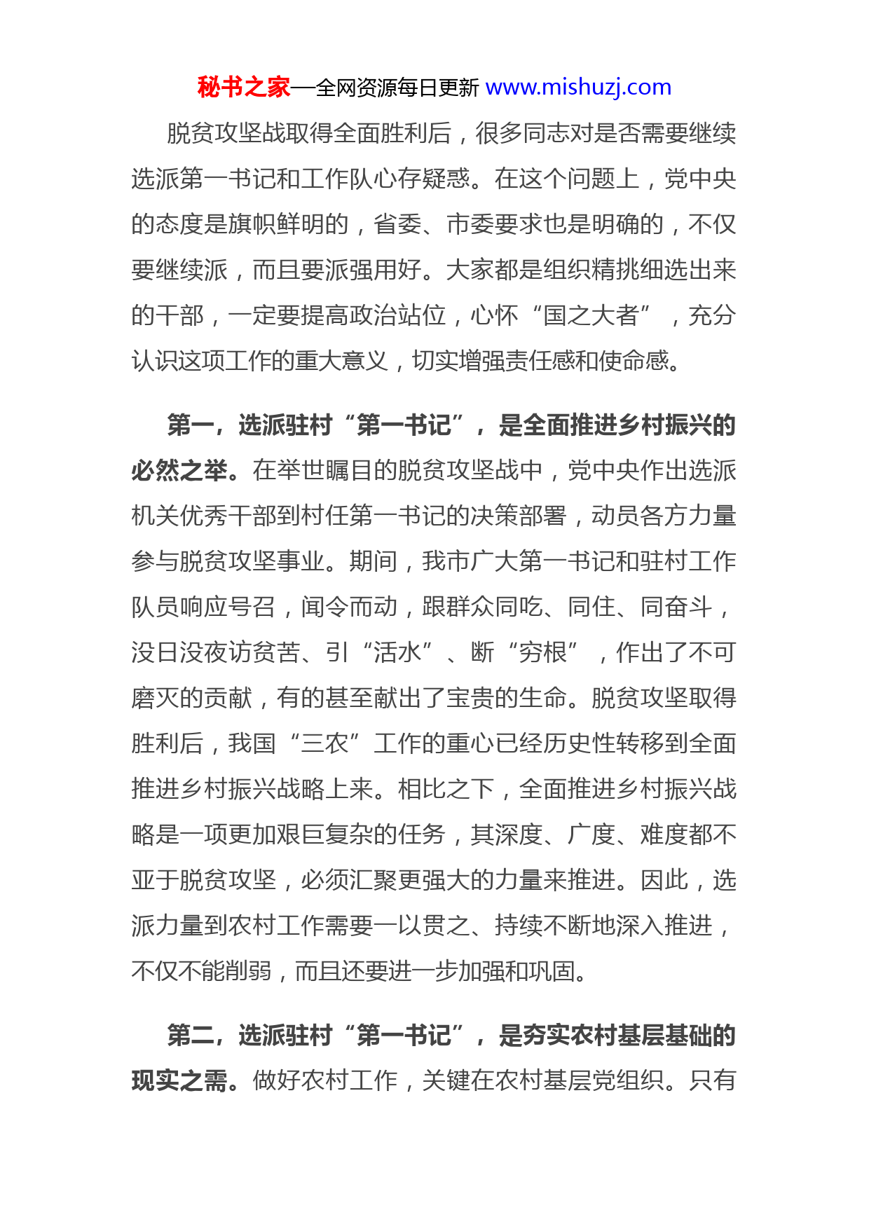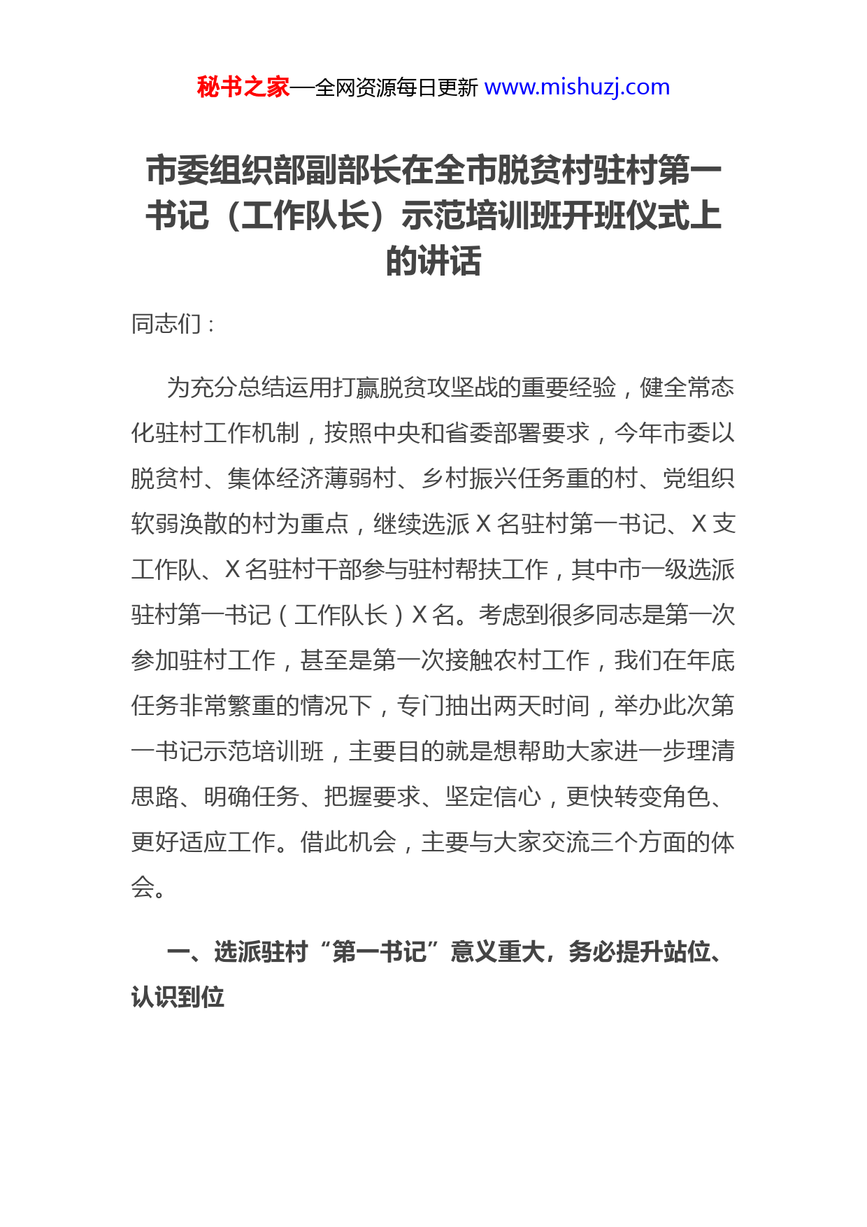 秘书之家—全网资源每日更新www.mishuzj.com市委组织部副部长在全市脱贫村驻村第一书记(工作队长)示范培训班开班仪式上的讲话同志们∶为充分总结运用打赢脱贫攻坚战的重要经验,健全常态化驻村工作机制,按照中央和省委部署要求,今年市委以脱贫村、集体经济薄弱村、乡村振兴任务重的村、党组织软弱涣散的村为重点,继续选派X名驻村第一书记、X支工作队、X名驻村干部参与驻村帮扶工作,其中市一级选派驻村第一书记(工作队长)X名。考虑到很多同志是第一次参加驻村工作,甚至是第一次接触农村工作,我们在年底任务非常繁重的情况下,专门抽出两天时间,举办此次第一书记示范培训班,主要目的就是想帮助大家进一步理清思路、明确任务、把握要求、坚定信心,更快转变角色、更好适应工作。借此机会,主要与大家交流三个方面的体会。一、选派驻村“第一书记”意义重大,务必提升站位、认识到位秘书之家—全网资源每日更新www.mishuzj.com脱贫攻坚战取得全面胜利后,很多同志对是否需要继续选派第一书记和工作队心存疑惑。在这个问题上,党中央的态度是旗帜鲜明的,省委、市委要求也是明确的,不仅要继续派,而且要派强用好。大家都是组织精挑细选出来的干部,一定要提高政治站位,心怀“国之大者”,充分认识这项工作的重大意义,切实增强责任感和使命感。第一,选派驻村“第一书记”,是全面推进乡村振兴的必然之举。在举世瞩目的脱贫攻坚战中,党中央作出选派机关优秀干部到村任第一书记的决策部署,动员各方力量参与脱贫攻坚事业。期间,我市广大第一书记和驻村工作队员响应号召,闻令而动,跟群众同吃、同住、同奋斗,没日没夜访贫苦、引“活水”、断“穷根”,作出了不可磨灭的贡献,有的甚至献出了宝贵的生命。脱贫攻坚取得胜利后,我国“三农”工作的重心已经历史性转移到全面推进乡村振兴战略上来。相比之下,全面推进乡村振兴战略是一项更加艰巨复杂的任务,其深度、广度、难度都不亚于脱贫攻坚,必须汇聚更强大的力量来推进。因此,选派力量到农村工作需要一以贯之、持续不断地深入推进,不仅不能削弱,而且还要进一步加强和巩固。第二,选派驻村“第一书记”,是夯实农村基层基础的现实之需。做好农村工作,关键在农村基层党组织。只有秘书之家—全网资源每日更新www.mishuzj.com农村基层党组织强起来,党在农村的全部工作才会有坚实基础。近年来,我们整合城乡资源抓农村基层党建,取得了积极成效,但少数村党组织战斗力不强,党组织书记不胜任、班子不团结、后备力量薄弱等问题仍然存在。中央和省委、市委都明确将建强农村党组织作为驻村第一书记的首要任务,根本目的就是要充分发挥大家有思路、有热情、有干劲的优势,补短板、强弱项、促提升,着力夯实党在农村的执政根基。第三,选派驻村“第一书记”,是接续培养锻炼干部的有效之路。扎扎实实的基层锻炼,是干部能力提升最重要、最直接、最有效的途径。习近平总书记谈及自己在大队当知青、任支书的经历时说∶“上山下乡的经历对我的影响是相当深的,使我形成了脚踏实地,自强不息的品格。”当前,全面建设社会主义现代化国家,实现中华民族伟大复兴,最艰巨最繁重的任务依然在农村。市委有计划地选派干部到农村工作,啃“最硬的骨干”,解决最难的问题,就是想让大家多当几次“热锅上的蚂蚁”,多经历一些“磕磕绊绊”,多面临一些“惶恐不安”的心理挑战,在风雨兼程中砥砺初心,在火热实践中增长才干,快速成长为党和人民需要的好干部。秘书之家—全网资源每日更新www.mishuzj.com二、担任驻村“第一书记”使命在肩,务必守土有责、履职尽责中央明确驻村第一书记和工作队的主要职责是建强村党组织、推进强村富民、提升治理水平、为民办事服务等“四大职责”。今年以来,我们探索了抓党建促乡村振兴“五化兴乡”路径,中组部充分肯定并向全国推广。大家担任驻村“第一书记”后,重点就是要结合本村实际,将抓好“五化兴乡”作为履行“四大职责”的具体实践。第一,着力推动支部标准化,建强战斗堡垒。抓党建筑堡垒是“第一书记”的首要职责、分内之责。去年,我们制定了党支部标准化规范化建设指导标准,各位驻村第一书记要精准对标,指导督促村党组织一项一项抓好落实。今年是换届之年,大家驻村之后,重中之重就是要全方位全过程参与村“两委”换届,为今后的工作打好基础。要协助选好头雁。紧盯人选标准和资格审查等关键环节,帮助派驻村选好带头人、配强新班子。在驻村期间,还要注意村党组织后备力量建设,帮助派驻村培养一批优秀年轻骨干,让党的事业能够薪火相传。要配合抓好班子。既做好离任、落选干部的思想工作,又加强对新任班子的传帮带,指导制定任期目标、办好“开门一件事”,帮助他们尽快在群众中树立威信,在工作中找准定位。要注重带好秘书之家—全网资源每日更新www.mishuzj.com队伍。着力把党员培养成致富能手,把致富能手培养成党员,加大在有文化、有一技之长、能带领群众共同致富的青年农民中发展党员力度,坚持成熟一个、发展一个,为党员队伍注入“源头活水”。第二,着力推动农民组织化,激活内生动力。无论是脱贫攻坚还是乡村振兴,农民的主体地位和内生动力都是一个值得高度