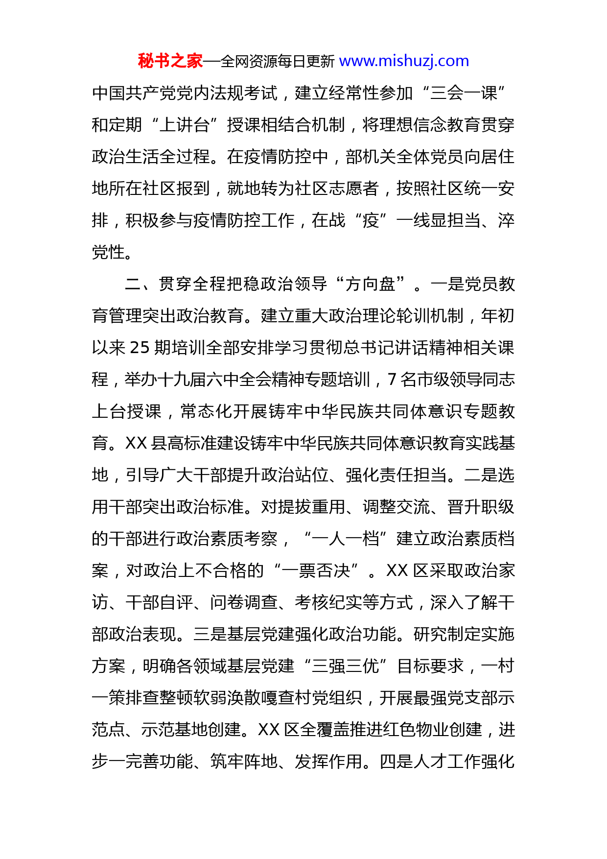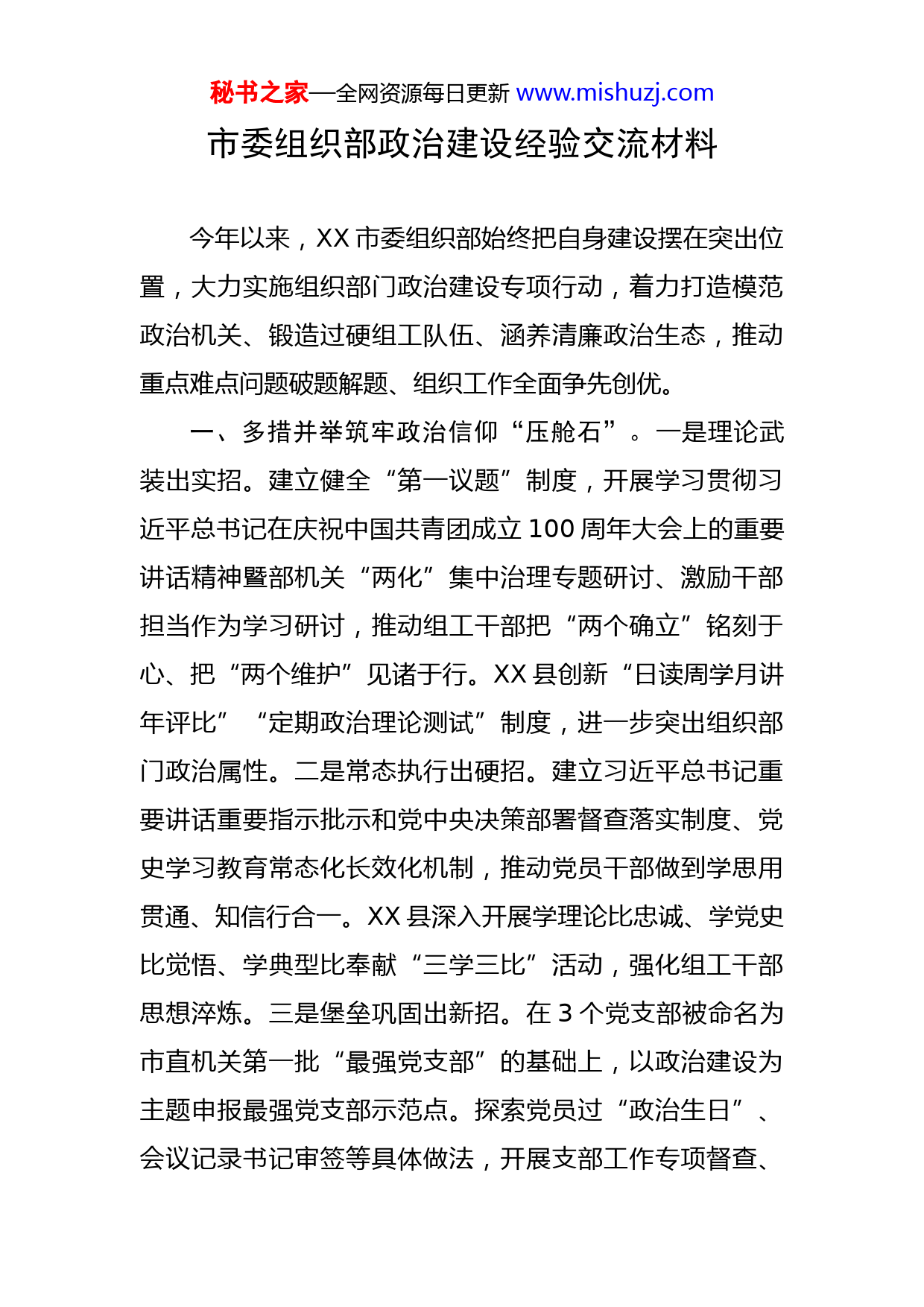 秘书之家—全网资源每日更新www.mishuzj.com市委组织部政治建设经验交流材料今年以来,XX市委组织部始终把自身建设摆在突出位置,大力实施组织部门政治建设专项行动,着力打造模范政治机关、锻造过硬组工队伍、涵养清廉政治生态,推动重点难点问题破题解题、组织工作全面争先创优。一、多措并举筑牢政治信仰“压舱石”。一是理论武装出实招。建立健全“第一议题”制度,开展学习贯彻习近平总书记在庆祝中国共青团成立100周年大会上的重要讲话精神暨部机关“两化”集中治理专题研讨、激励干部担当作为学习研讨,推动组工干部把“两个确立”铭刻于心、把“两个维护”见诸于行。XX县创新“日读周学月讲年评比”“定期政治理论测试”制度,进一步突出组织部门政治属性。二是常态执行出硬招。建立习近平总书记重要讲话重要指示批示和党中央决策部署督查落实制度、党史学习教育常态化长效化机制,推动党员干部做到学思用贯通、知信行合一。XX县深入开展学理论比忠诚、学党史比觉悟、学典型比奉献“三学三比”活动,强化组工干部思想淬炼。三是堡垒巩固出新招。在3个党支部被命名为市直机关第一批“最强党支部”的基础上,以政治建设为主题申报最强党支部示范点。探索党员过“政治生日”、会议记录书记审签等具体做法,开展支部工作专项督查、秘书之家—全网资源每日更新www.mishuzj.com中国共产党党内法规考试,建立经常性参加“三会一课”和定期“上讲台”授课相结合机制,将理想信念教育贯穿政治生活全过程。在疫情防控中,部机关全体党员向居住地所在社区报到,就地转为社区志愿者,按照社区统一安排,积极参与疫情防控工作,在战“疫”一线显担当、淬党性。二、贯穿全程把稳政治领导“方向盘”。一是党员教育管理突出政治教育。建立重大政治理论轮训机制,年初以来25期培训全部安排学习贯彻总书记讲话精神相关课程,举办十九届六中全会精神专题培训,7名市级领导同志上台授课,常态化开展铸牢中华民族共同体意识专题教育。XX县高标准建设铸牢中华民族共同体意识教育实践基地,引导广大干部提升政治站位、强化责任担当。二是选用干部突出政治标准。对提拔重用、调整交流、晋升职级的干部进行政治素质考察,“一人一档”建立政治素质档案,对政治上不合格的“一票否决”。XX区采取政治家访、干部自评、问卷调查、考核纪实等方式,深入了解干部政治表现。三是基层党建强化政治功能。研究制定实施方案,明确各领域基层党建“三强三优”目标要求,一村一策排查整顿软弱涣散嘎查村党组织,开展最强党支部示范点、示范基地创建。XX区全覆盖推进红色物业创建,进步一完善功能、筑牢阵地、发挥作用。四是人才工作强化秘书之家—全网资源每日更新www.mishuzj.com政治引领。建立健全人才工作领导小组及其办公室运行机制,研究制定中长期人才发展规划纲要,完善落实“1+13”人才引进政策,落实党委联系服务专家制度,推动形成“激励人才矢志爱国奉献”品牌。XX县实施“1+3乡村振兴人才培育工程”,52名优秀乡土人才入选嘎查村“两委”班子。三、综合施策打好提升政治能力“组合拳”。一是制度建设强保障。以实施部机关“制度规范建设年”为抓手,研究制定加强和改进组织部门政治建设《若干措施》。制定党建工作要点,确定五个方面14项具体工作。修订党务公开目录,明确129项具体内容。林西县对全面从严治党、意识形态、法治建设、统战、民族等重点工作进行系统梳理,形成规定动作计划清单,确保各项工作及时、规范、有效落实。二是能力训练提素质。组织全体干部参加全区“组工业务云讲堂”、全区干部能力持续提升工程“半月谈”,常态化举办组工业务大讲堂,科室负责人聚焦主责主业上台授课。XX县开展政治课、业务课、廉政课、实践课“每月四课”,常态化加强政治能力、业务能力培训。三是岗位练兵促担当。部机关选派1名干部到上级党委组织部跟班学习,1名干部参加组织系统业务骨干培训班,选调8名县区委组织部优秀组工干部到市委组织部跟班学习。XX区采取部内轮岗交流、下派驻村工作、下秘书之家—全网资源每日更新www.mishuzj.com沉结对帮带等方式,让组工干部不断积累政治经验、提高政治本领。四、多维发力织密政治生态“过滤网”。将组织部门政治建设专项行动与党内政治生活庸俗化交易化集中治理深度有机结合,着力打造忠诚、公道、专业、务实、清廉的过硬队伍。一是集中治理清顽疾。印发集中治理党内政治生活庸俗化交易化问题工作安排,明确6方面10项具体工作任务。建立对照“五个有的”常态化政治体检制度,督促组工干部把忠诚的灵魂铸得更牢、公平的秤杆端得更平、廉洁的底线绘得更好。对党员干部自查自纠问题清单进行系统研究,针对不同层级、不同领域、不同岗位列出风险点清单,作为组工干部新入部、新提拔、新调岗时谈心谈话的重要参考。二是清廉教育明纪律。全力支持派驻部纪检监察组工作,在全市组织系统开展清廉教育,派驻纪检监察组组长围绕“做清正廉洁的组工干部”讲授廉政党课。编印十九大以来组织系统违纪违法典型案例,开展党内政治生活庸俗化交易化问题警示教育,引导组工干部知敬畏、存戒惧、守底线。三是涵养